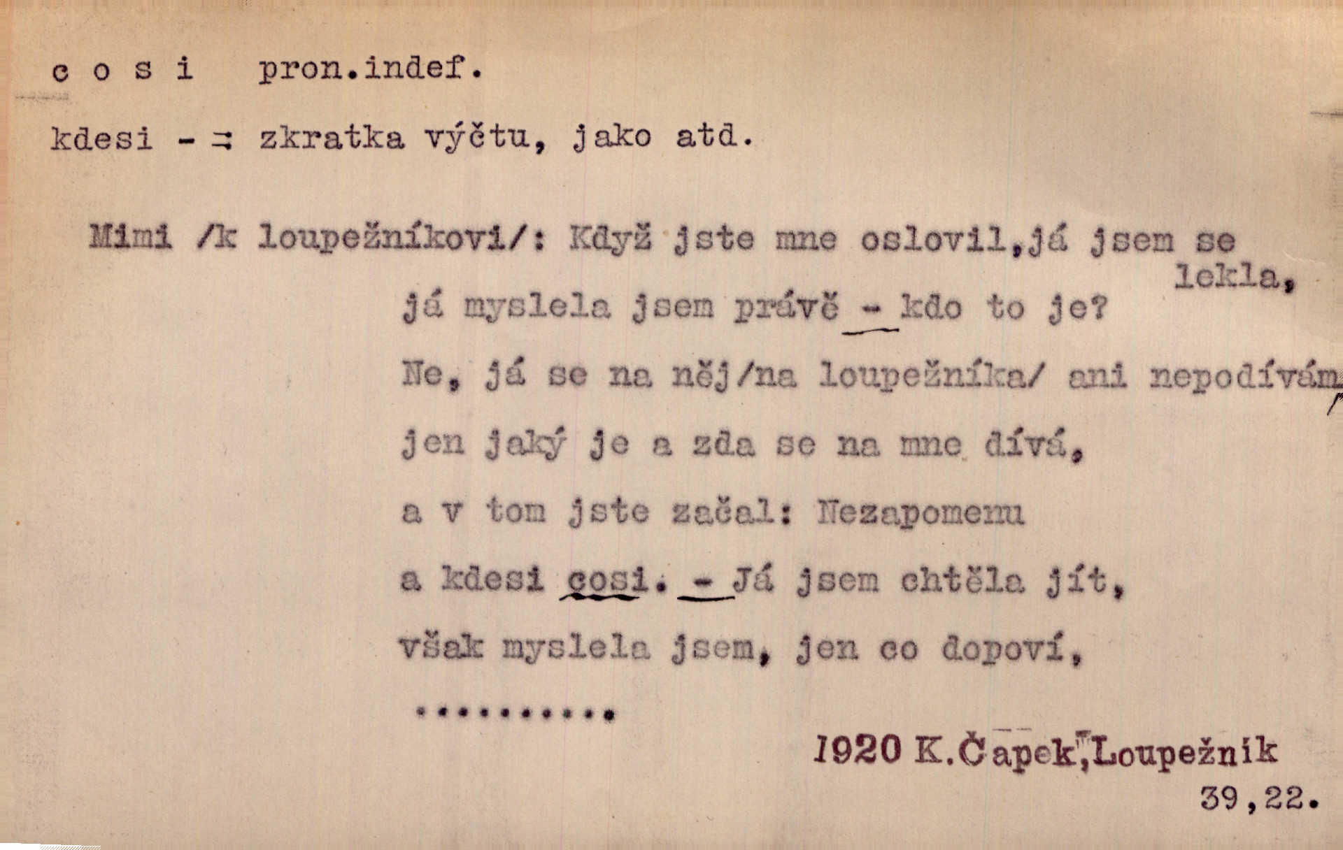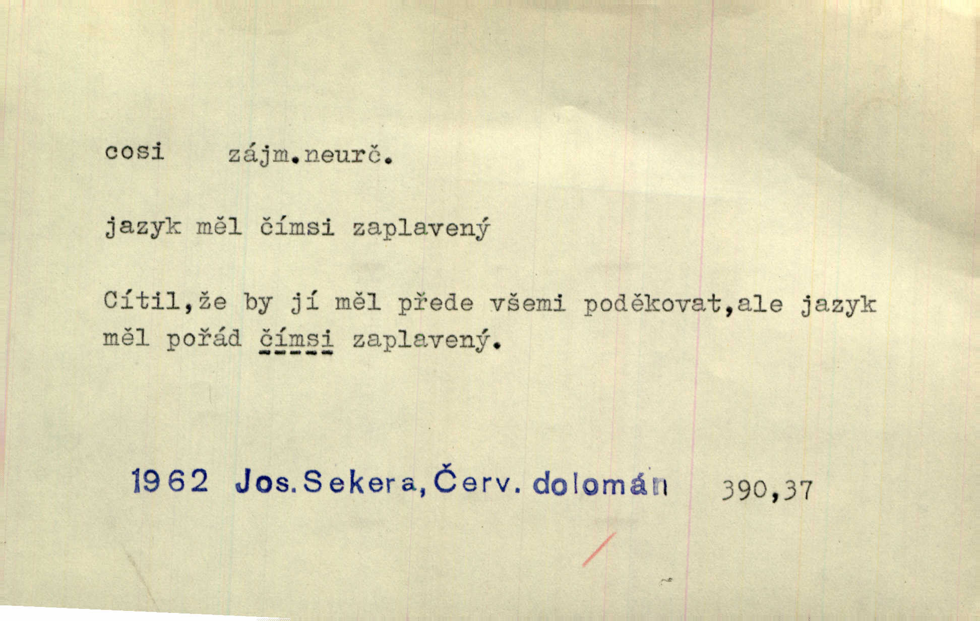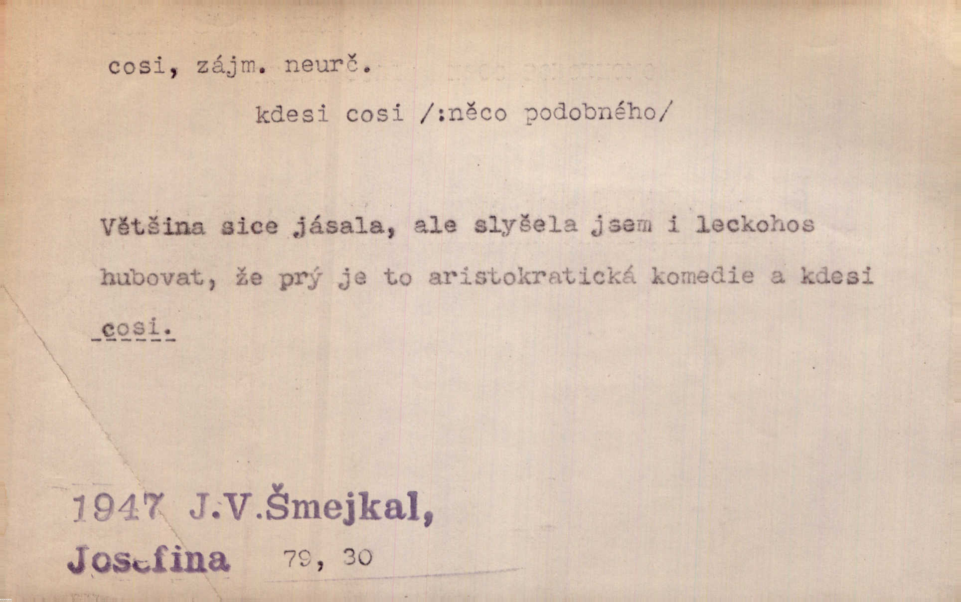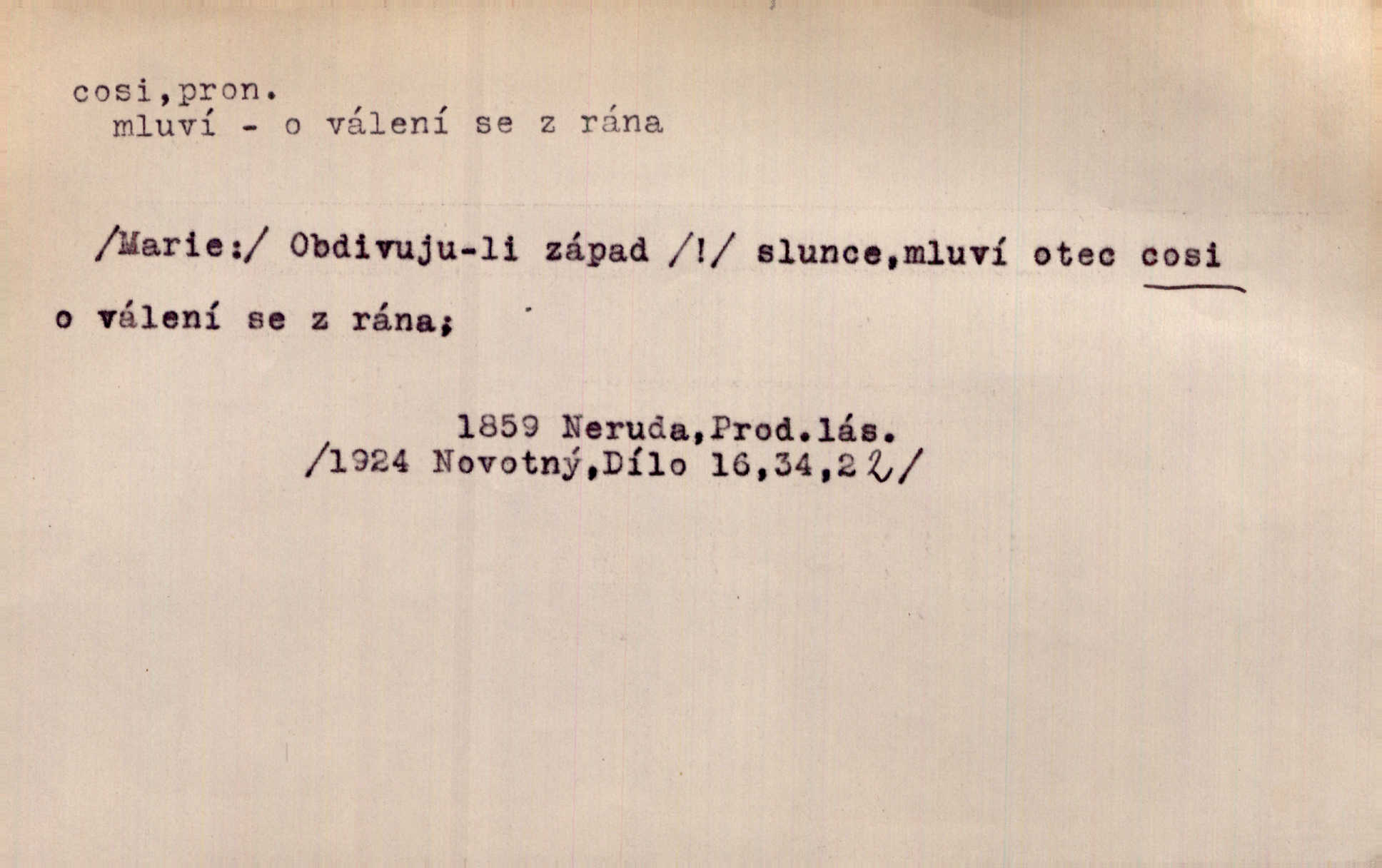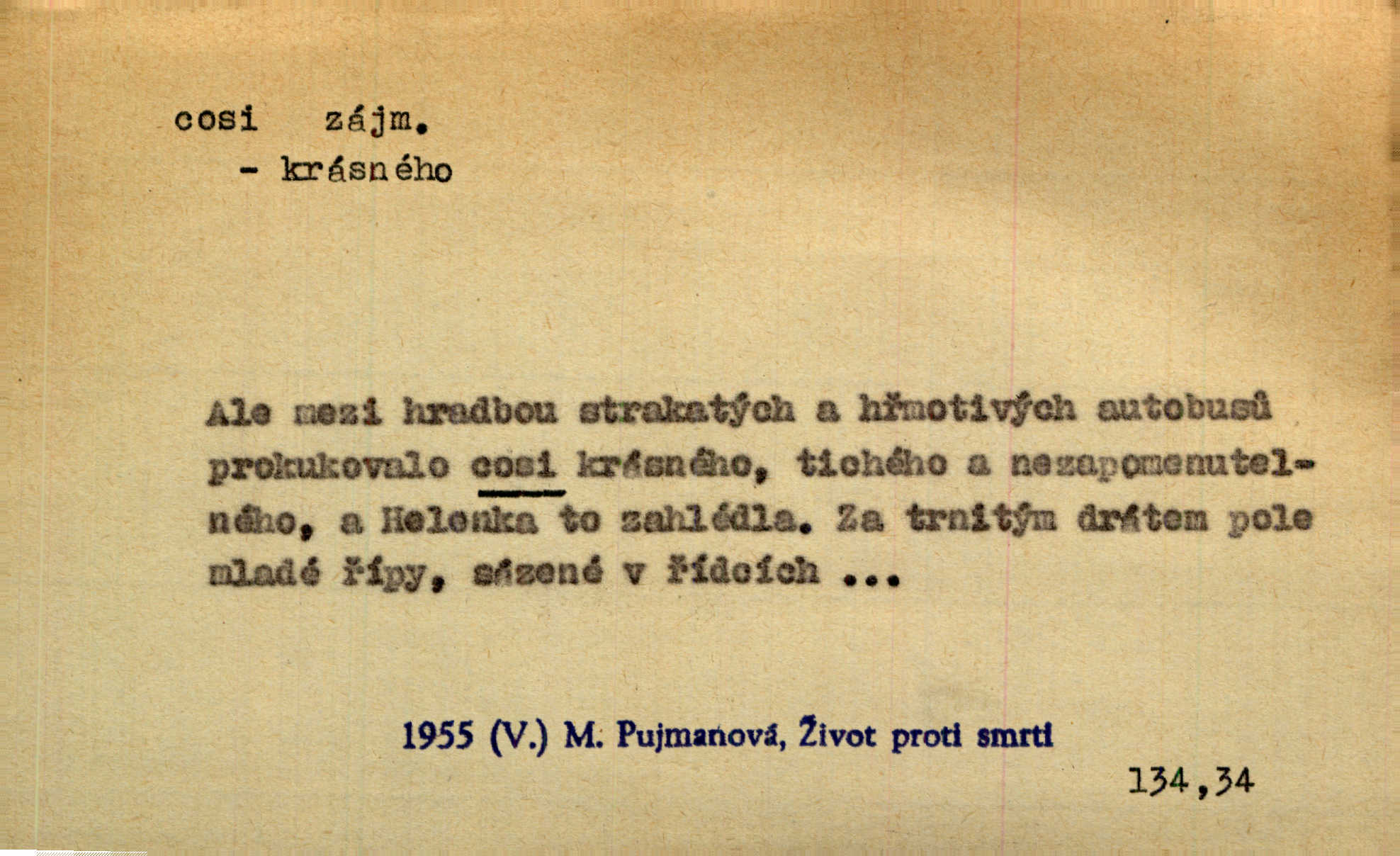 - cos, cosi n. zájm. neurč. označující předmět skutečný. K jezeru vždy ji cos pohání. Erb. V očích slzami zalitých svitlo cosi jako nadšení. Jir. D kdesi cosi všelicos, leccos. Pořád že jsme spolu chodili do školy a kdesi cosi všelijaké povídání. Rais. Arch. Cosi tosi leccos. Doufala, že v nádherném hlučném domě otcovském aspoň cosi tosi z těch myšlených věcí užije. Ondrák.