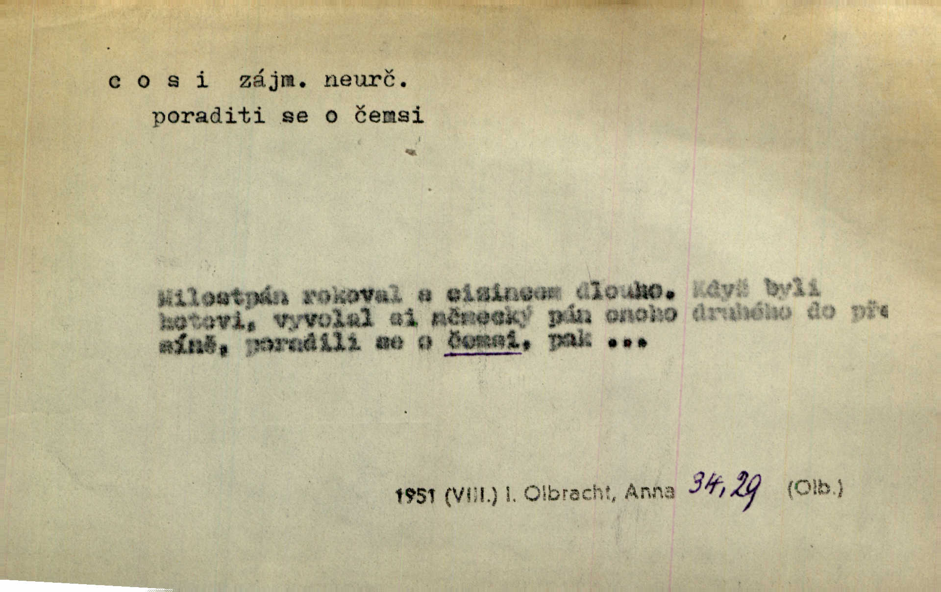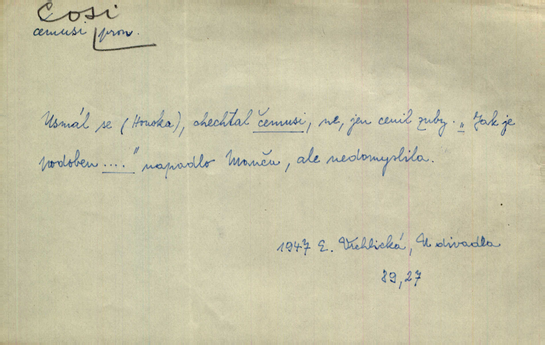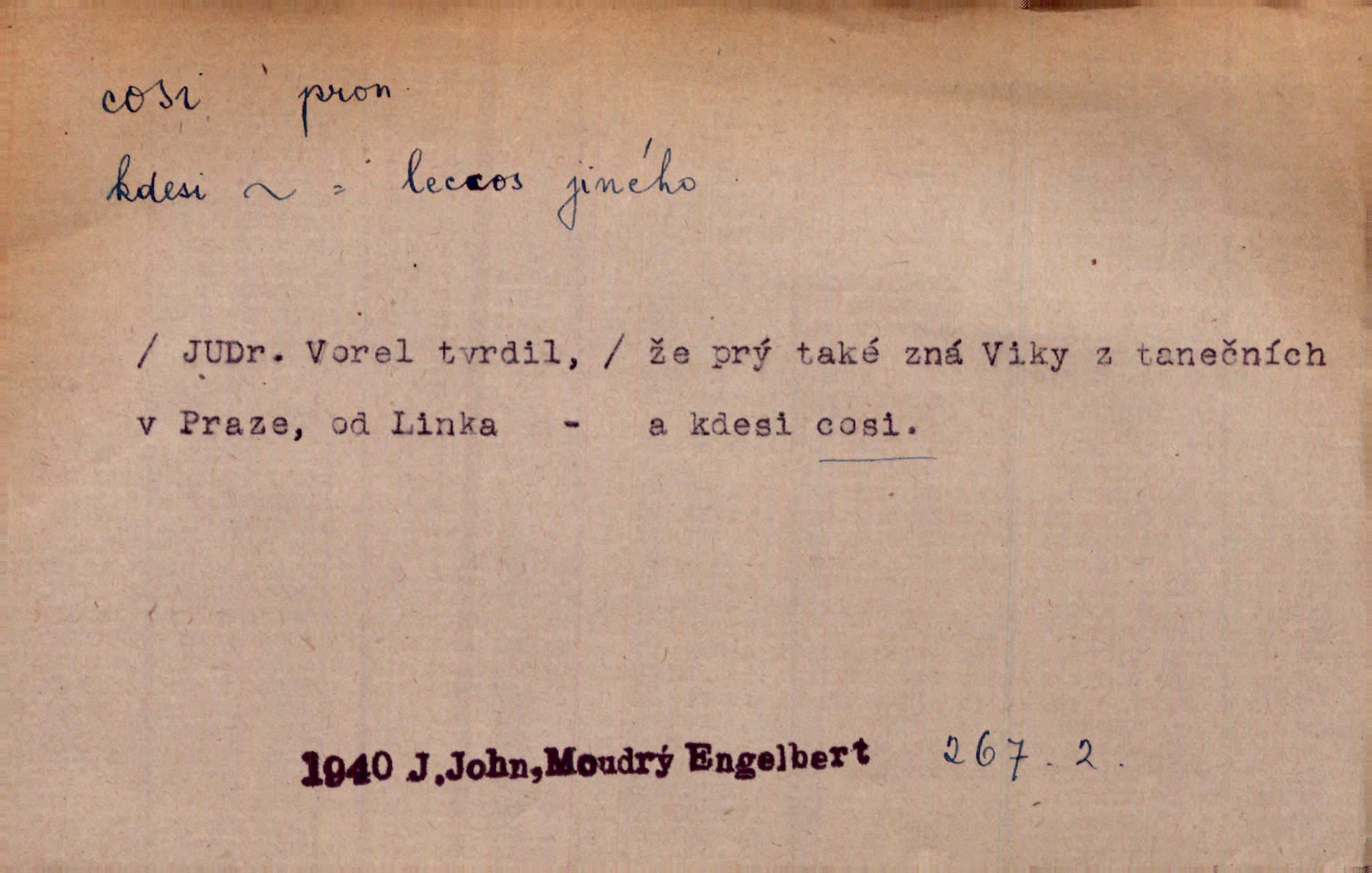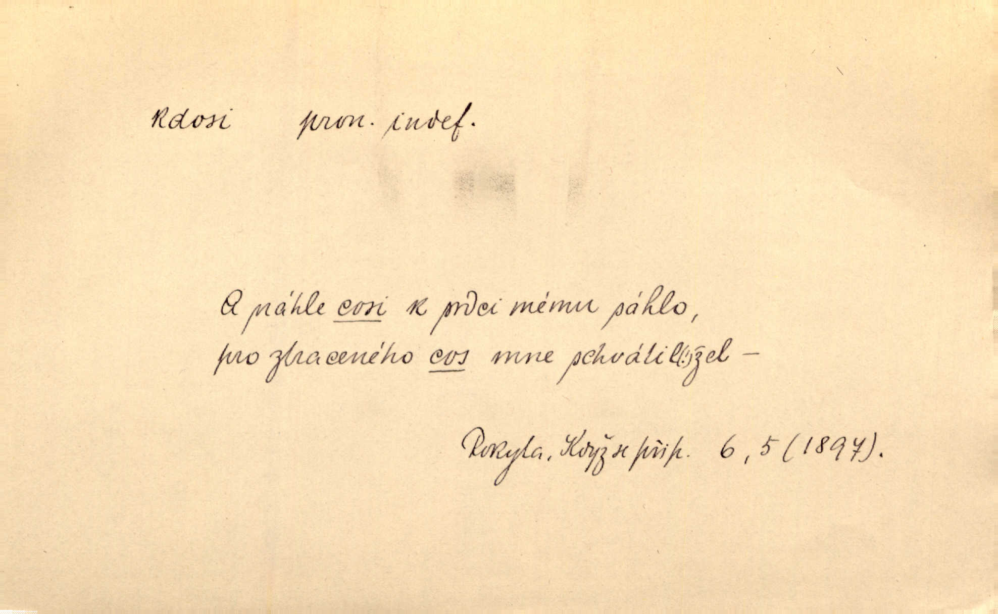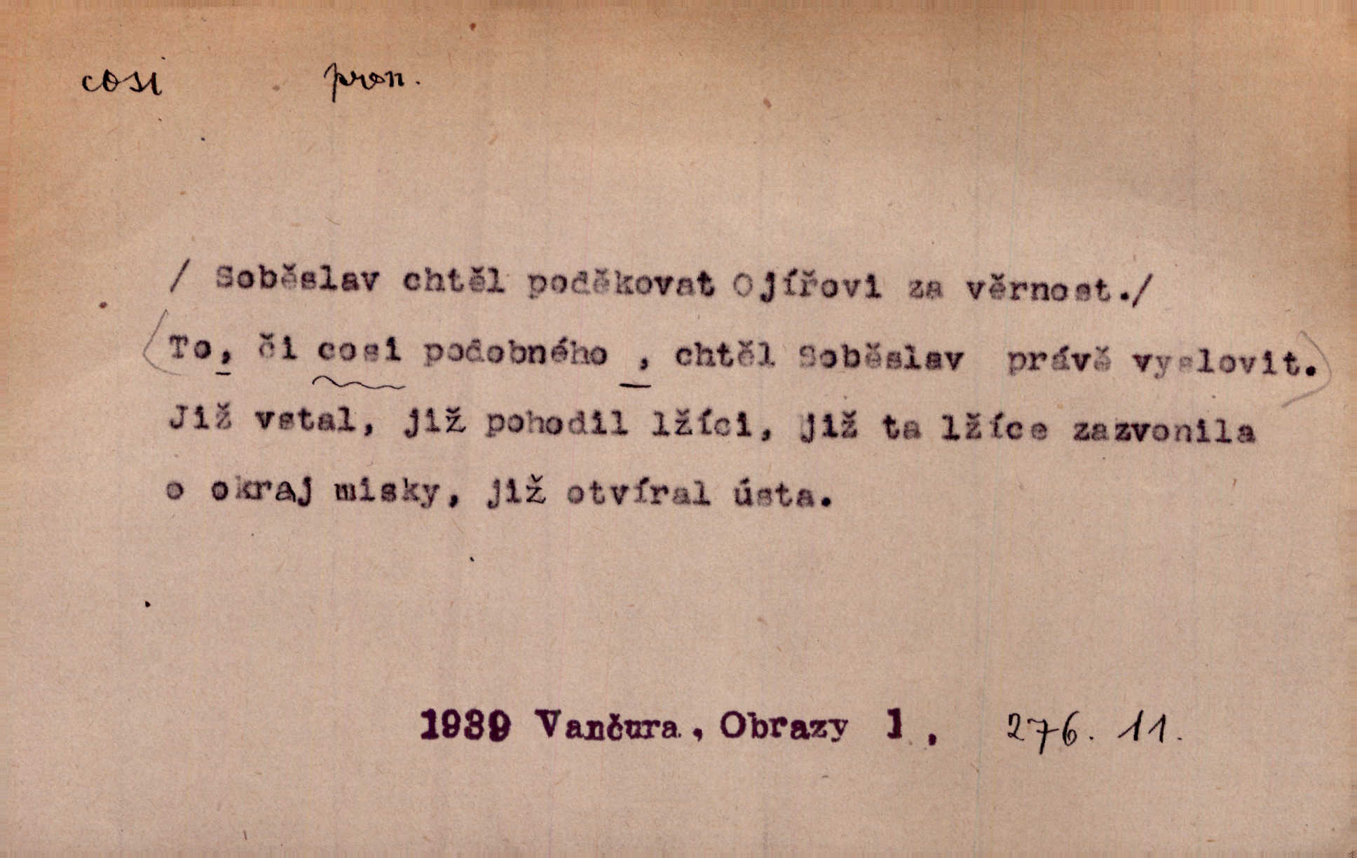- cos, cosi n. zájm. neurč. označující předmět skutečný. K jezeru vždy ji cos pohání. Erb. V očích slzami zalitých svitlo cosi jako nadšení. Jir. D kdesi cosi všelicos, leccos. Pořád že jsme spolu chodili do školy a kdesi cosi všelijaké povídání. Rais. Arch. Cosi tosi leccos. Doufala, že v nádherném hlučném domě otcovském aspoň cosi tosi z těch myšlených věcí užije. Ondrák.
