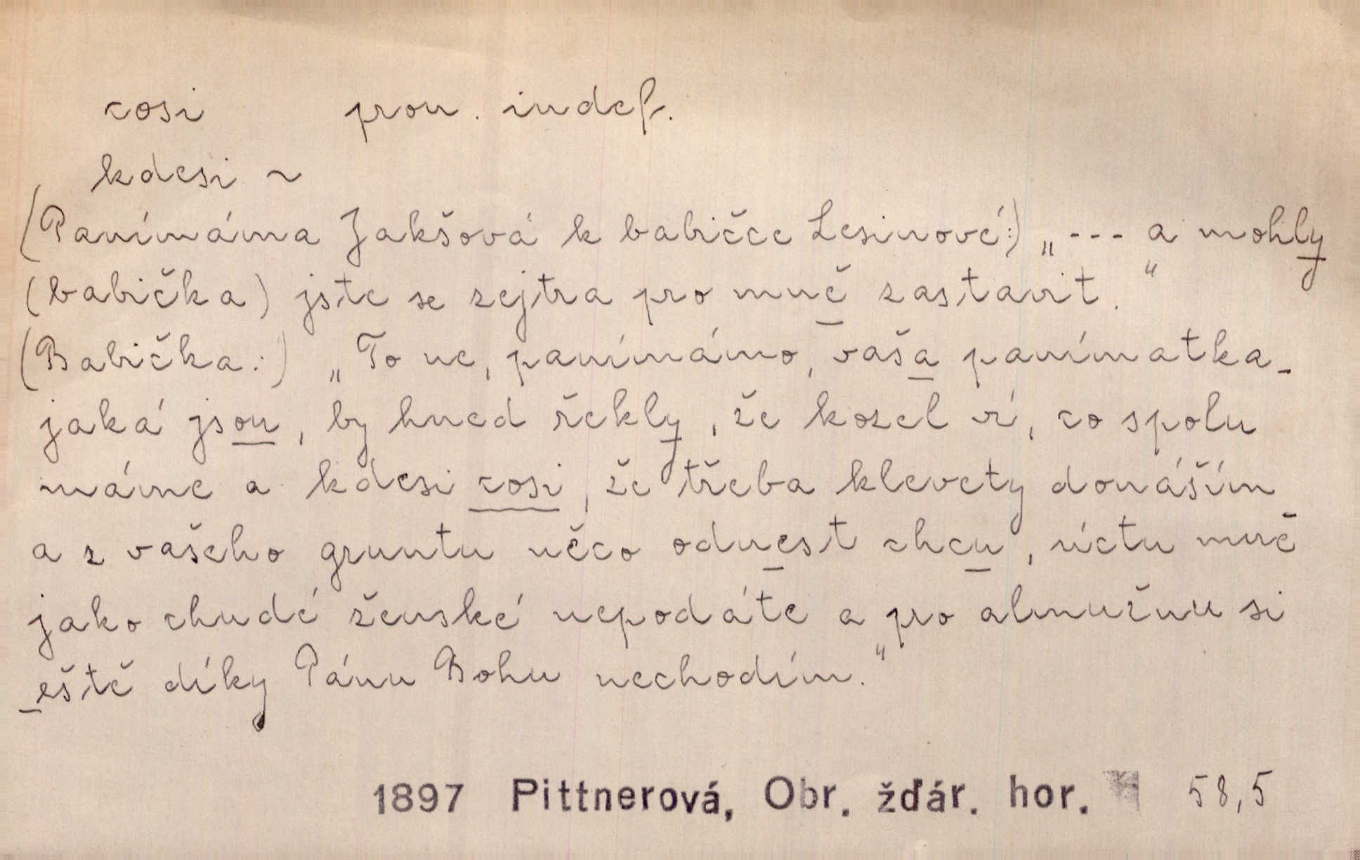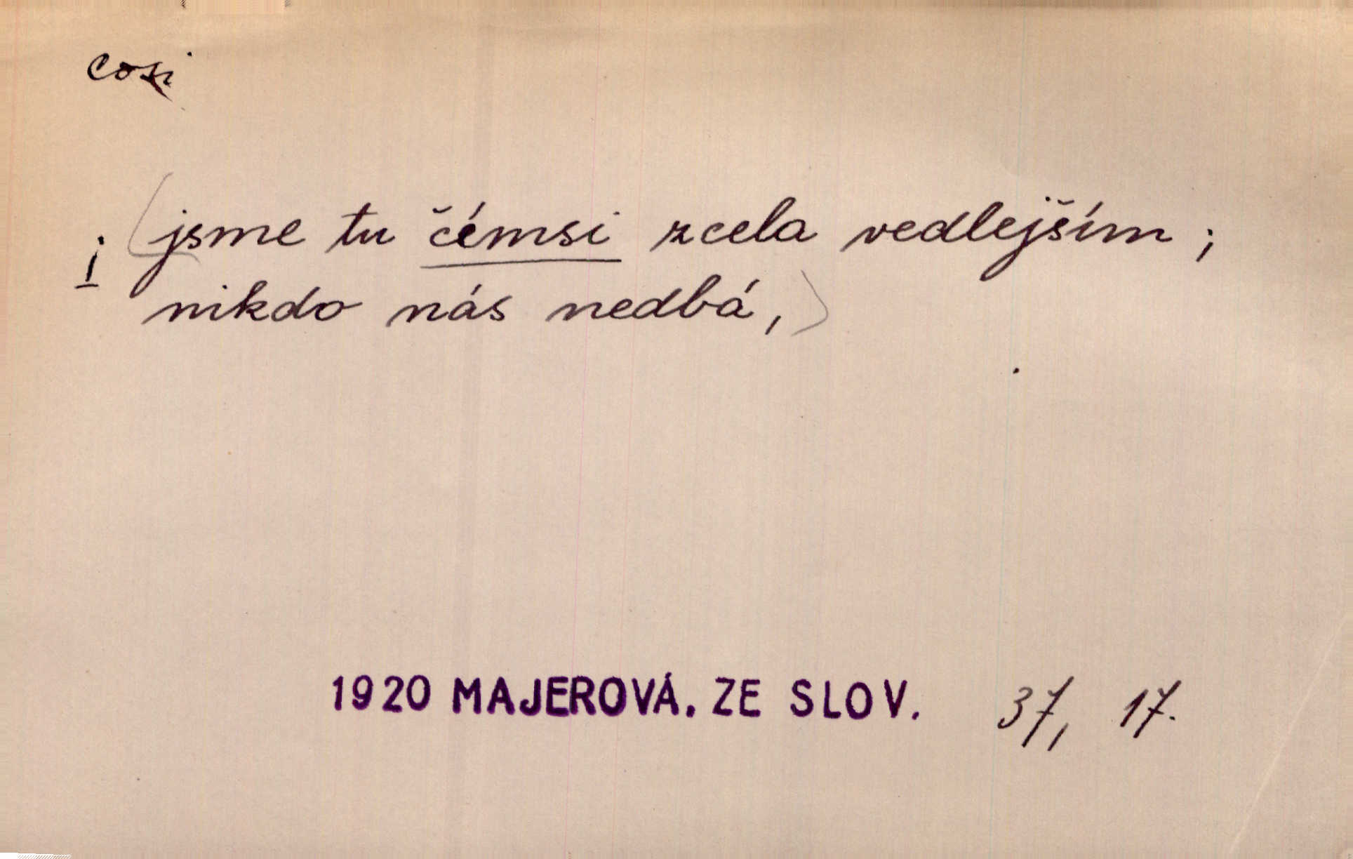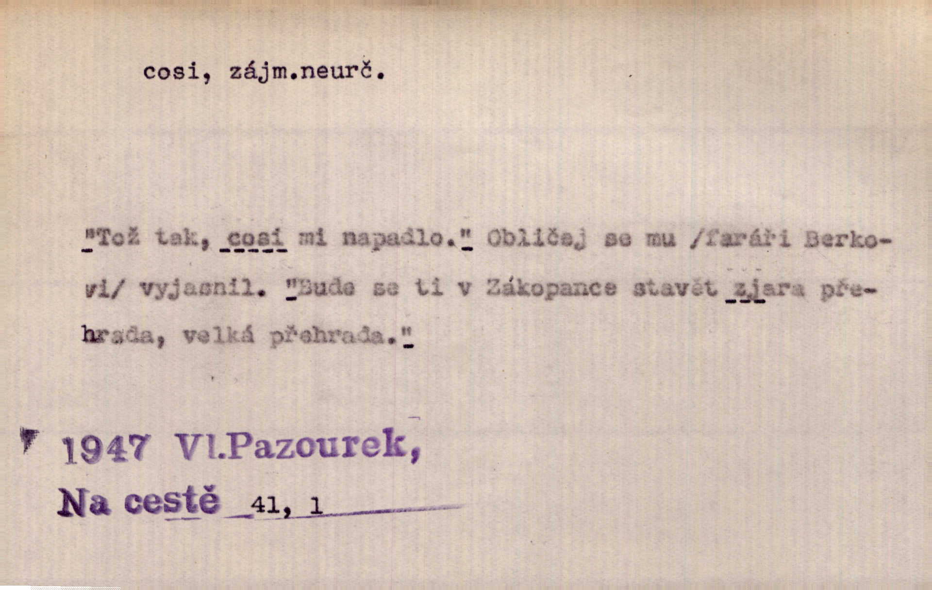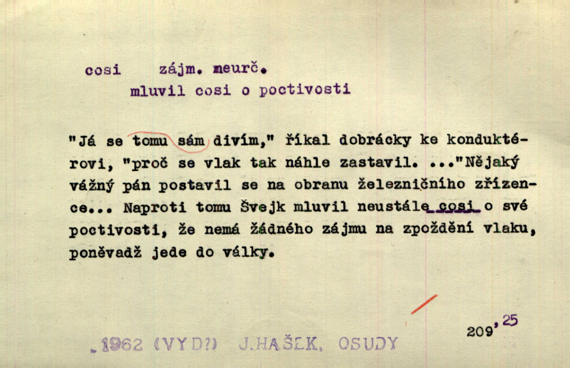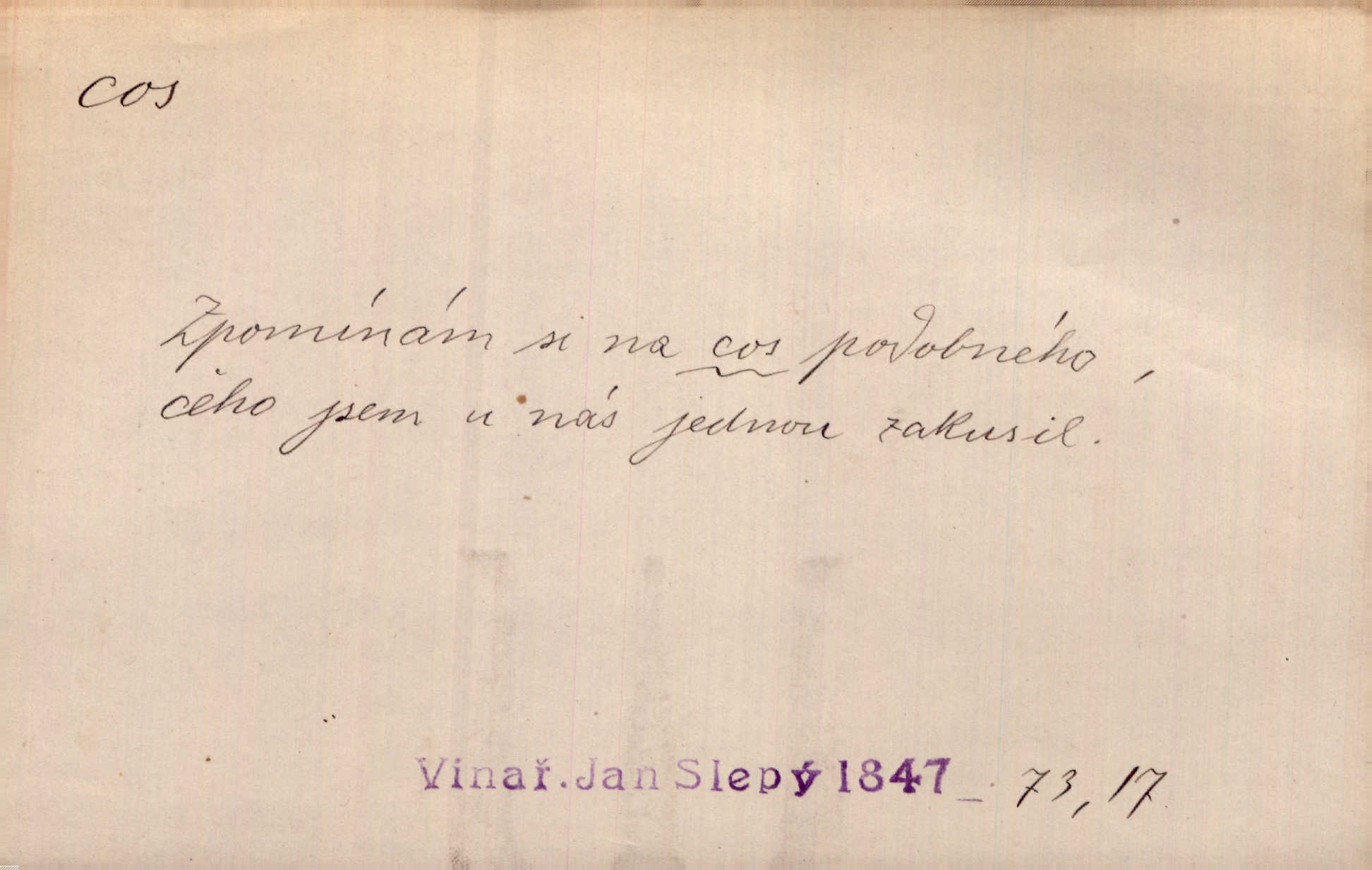 - cos, cosi n. zájm. neurč. označující předmět skutečný. K jezeru vždy ji cos pohání. Erb. V očích slzami zalitých svitlo cosi jako nadšení. Jir. D kdesi cosi všelicos, leccos. Pořád že jsme spolu chodili do školy a kdesi cosi všelijaké povídání. Rais. Arch. Cosi tosi leccos. Doufala, že v nádherném hlučném domě otcovském aspoň cosi tosi z těch myšlených věcí užije. Ondrák.