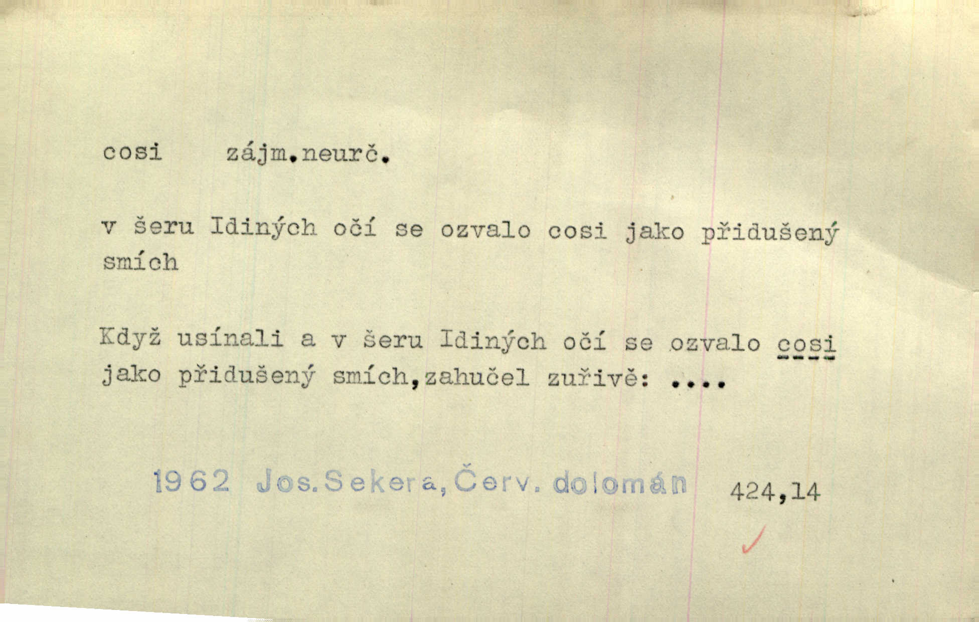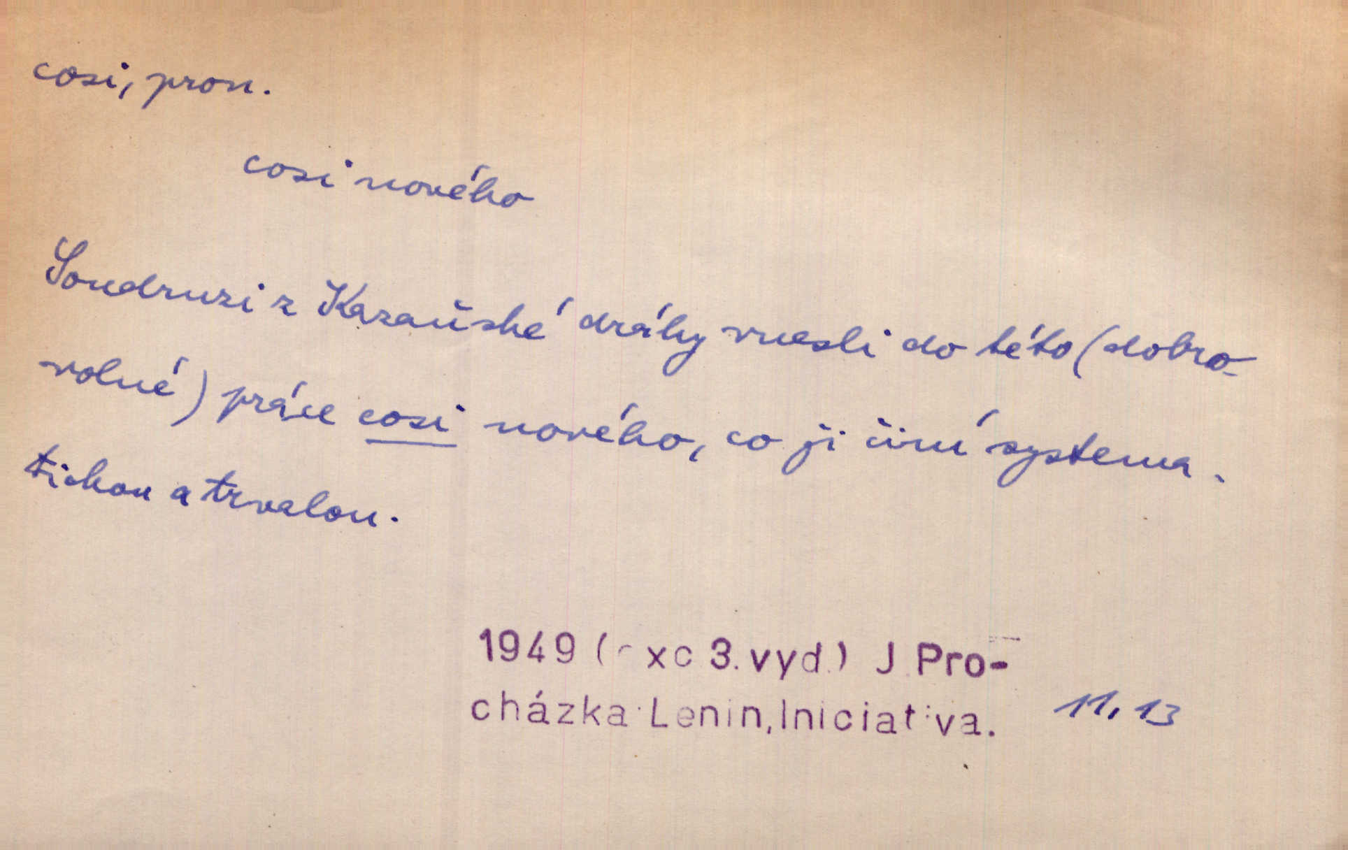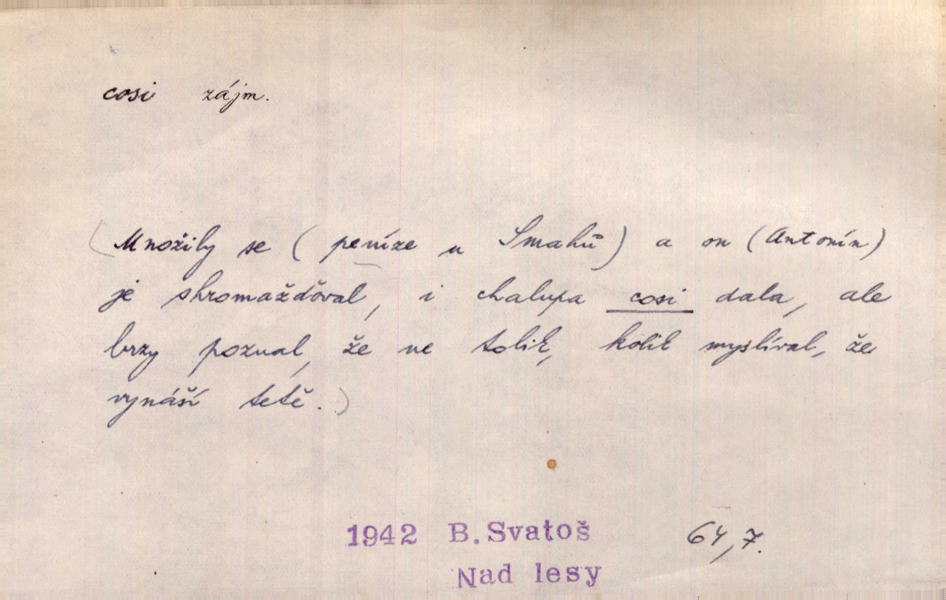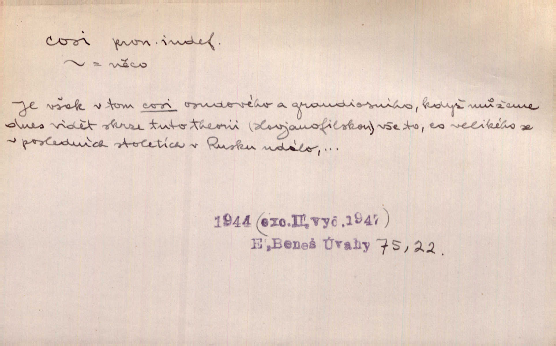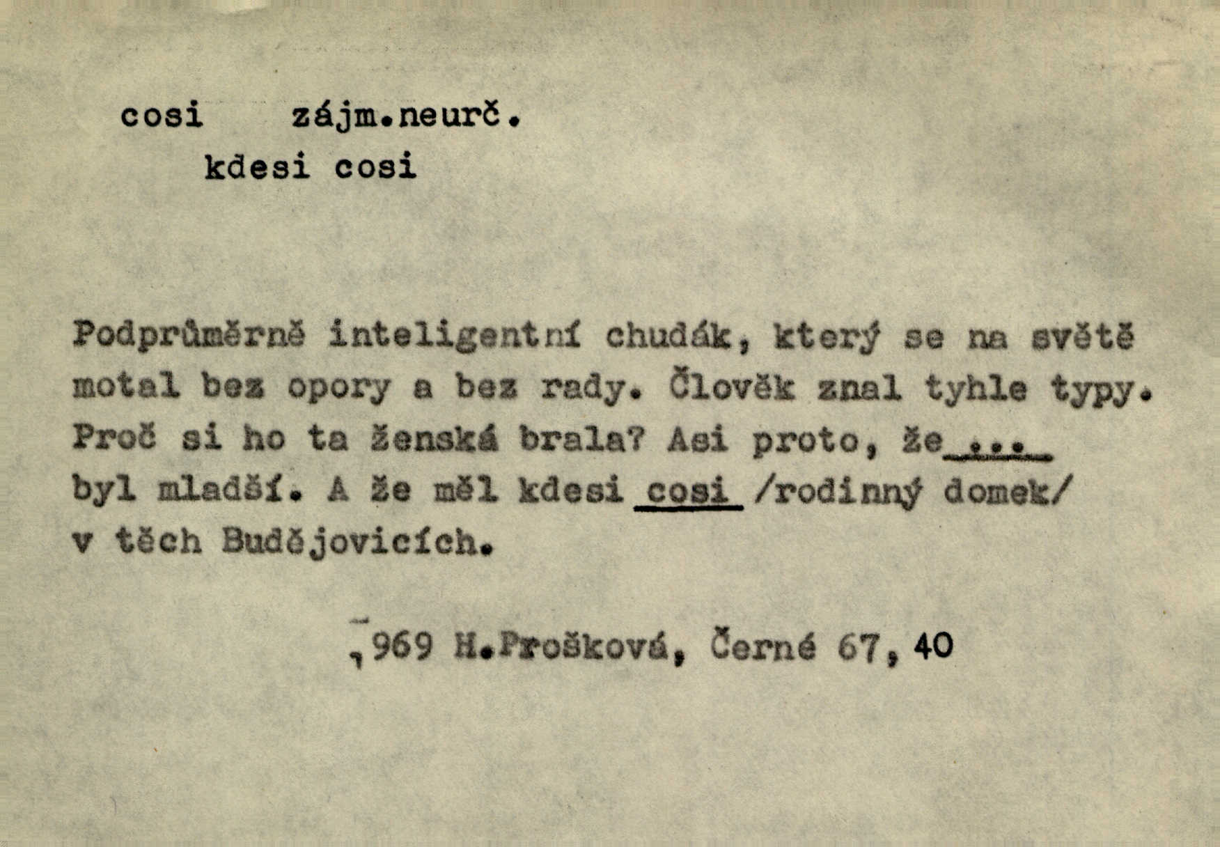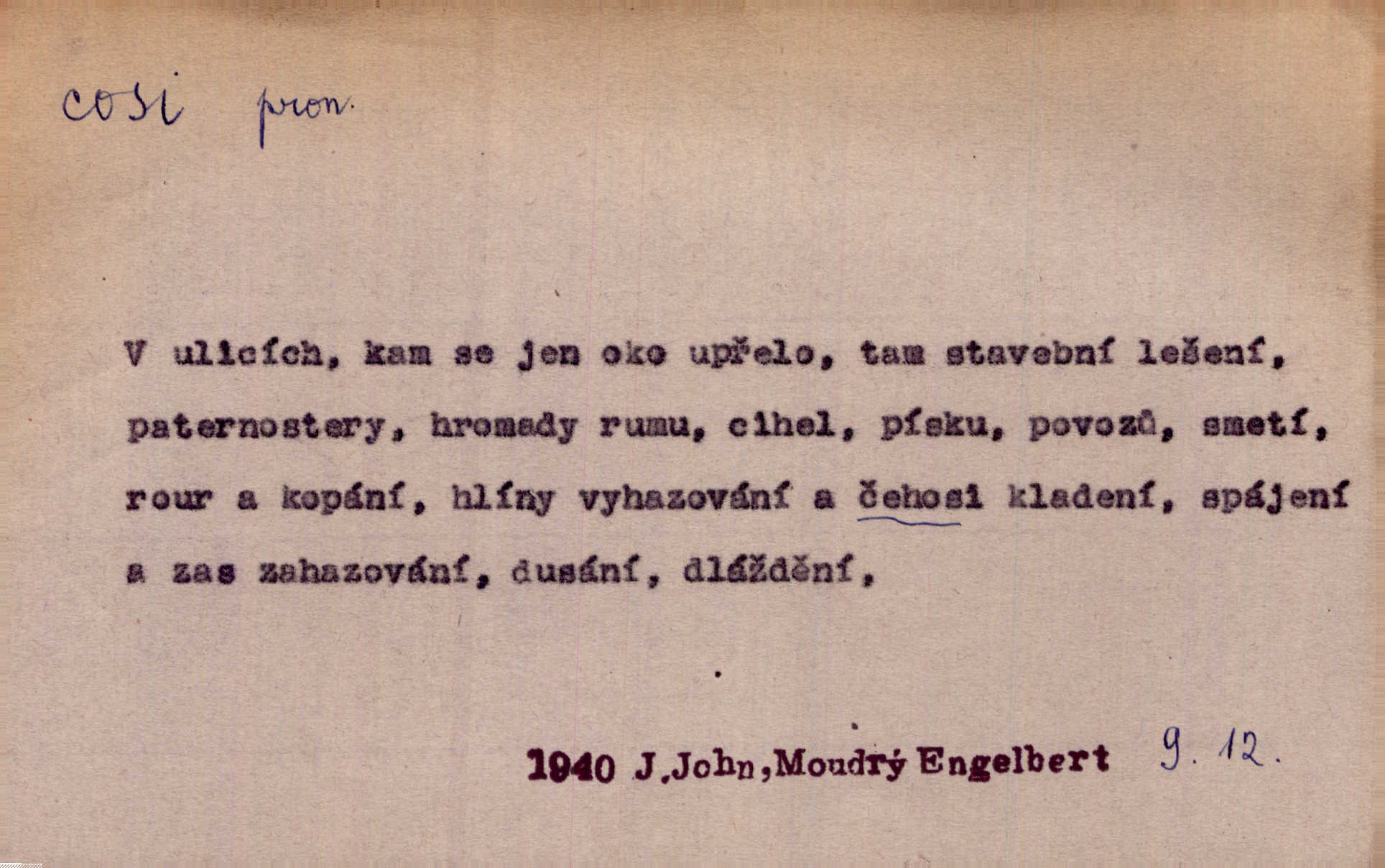 - cos, cosi n. zájm. neurč. označující předmět skutečný. K jezeru vždy ji cos pohání. Erb. V očích slzami zalitých svitlo cosi jako nadšení. Jir. D kdesi cosi všelicos, leccos. Pořád že jsme spolu chodili do školy a kdesi cosi všelijaké povídání. Rais. Arch. Cosi tosi leccos. Doufala, že v nádherném hlučném domě otcovském aspoň cosi tosi z těch myšlených věcí užije. Ondrák.