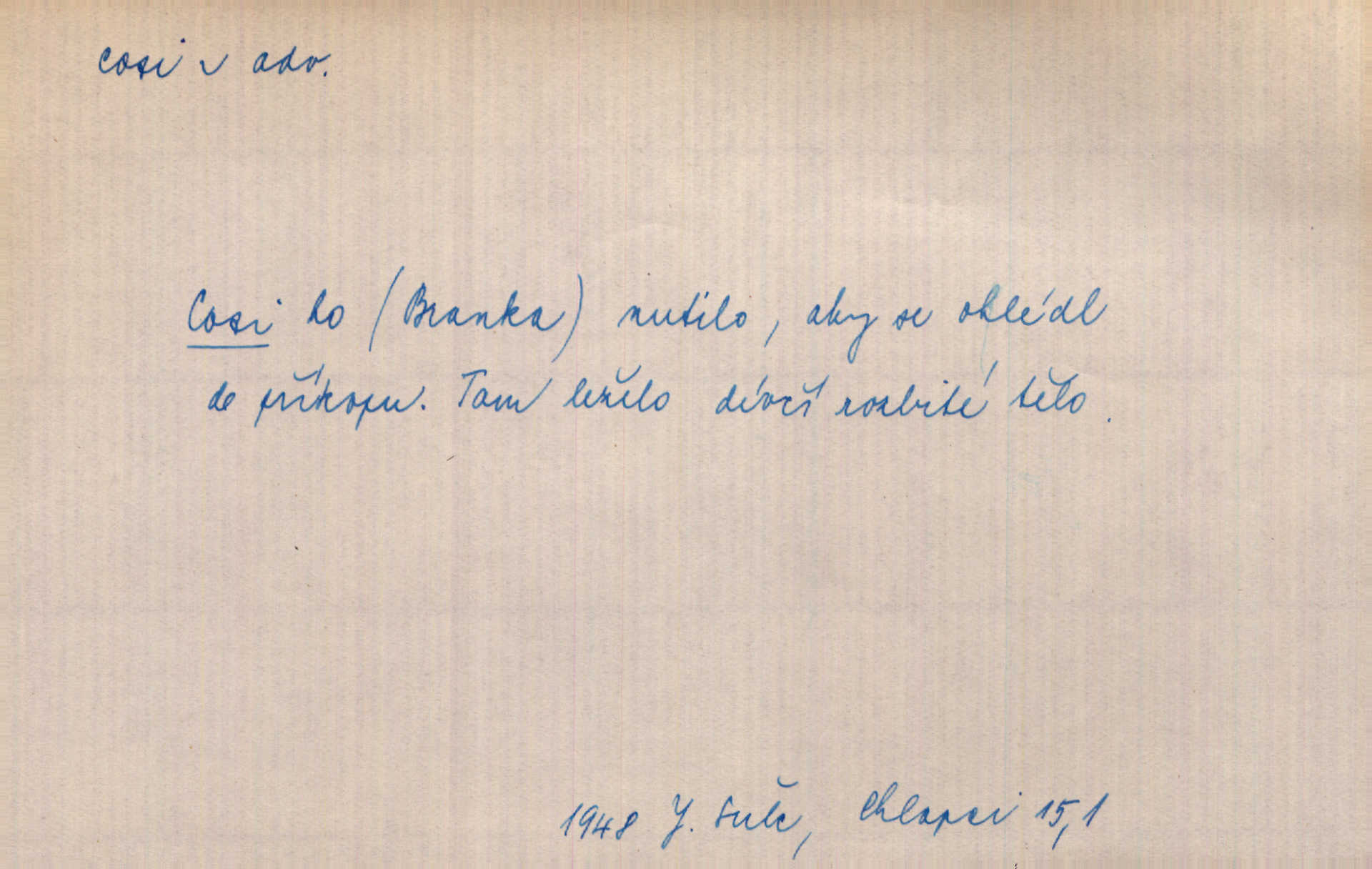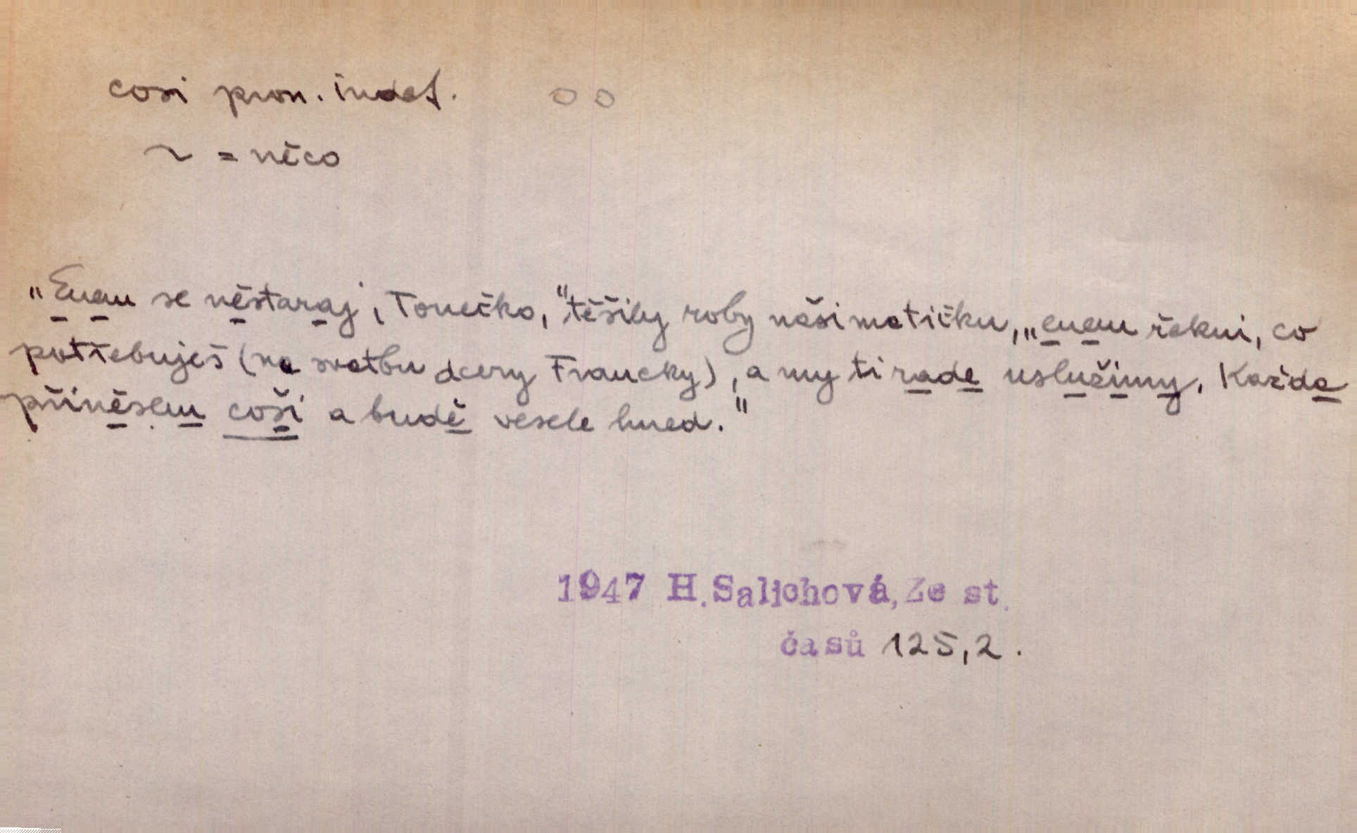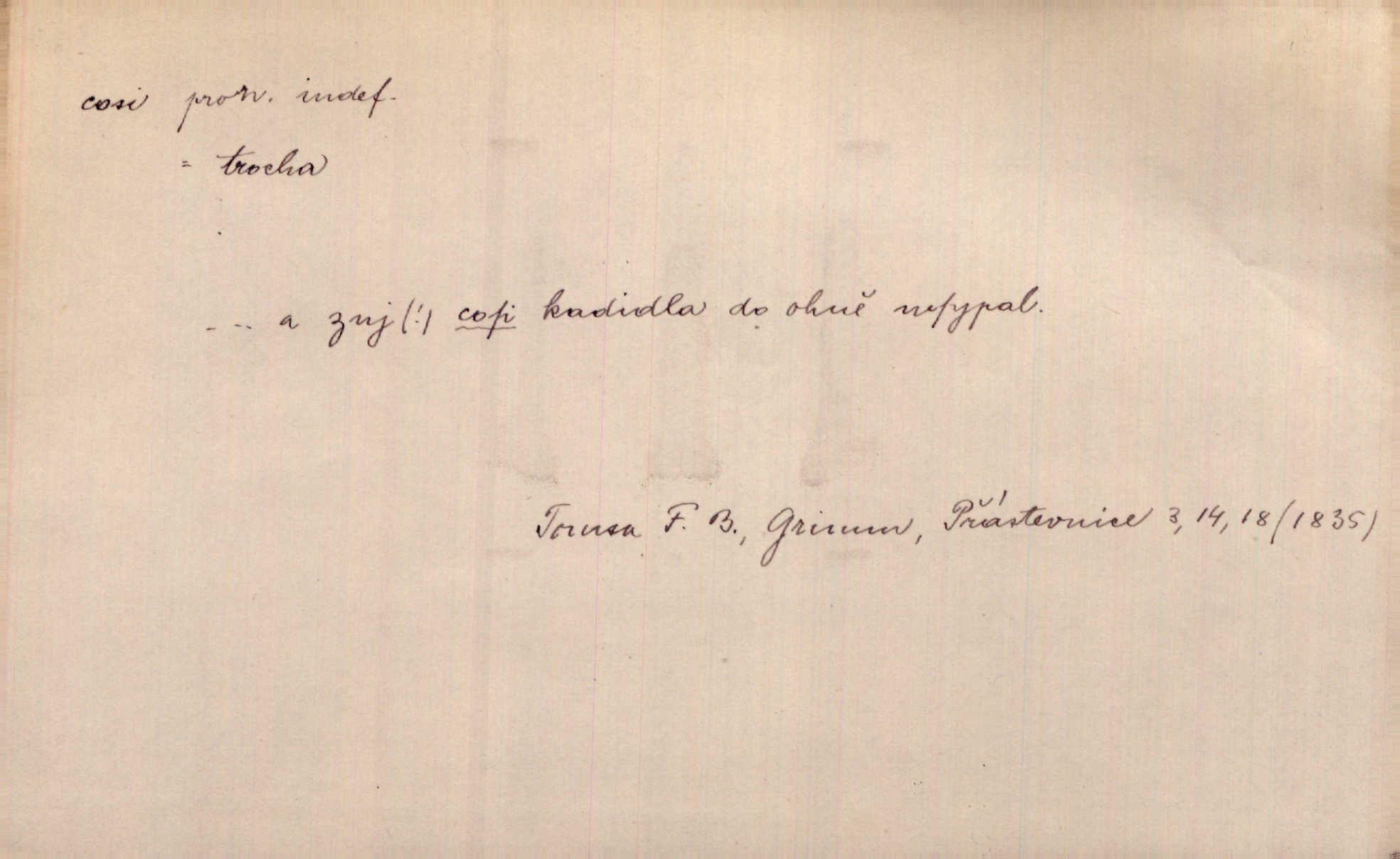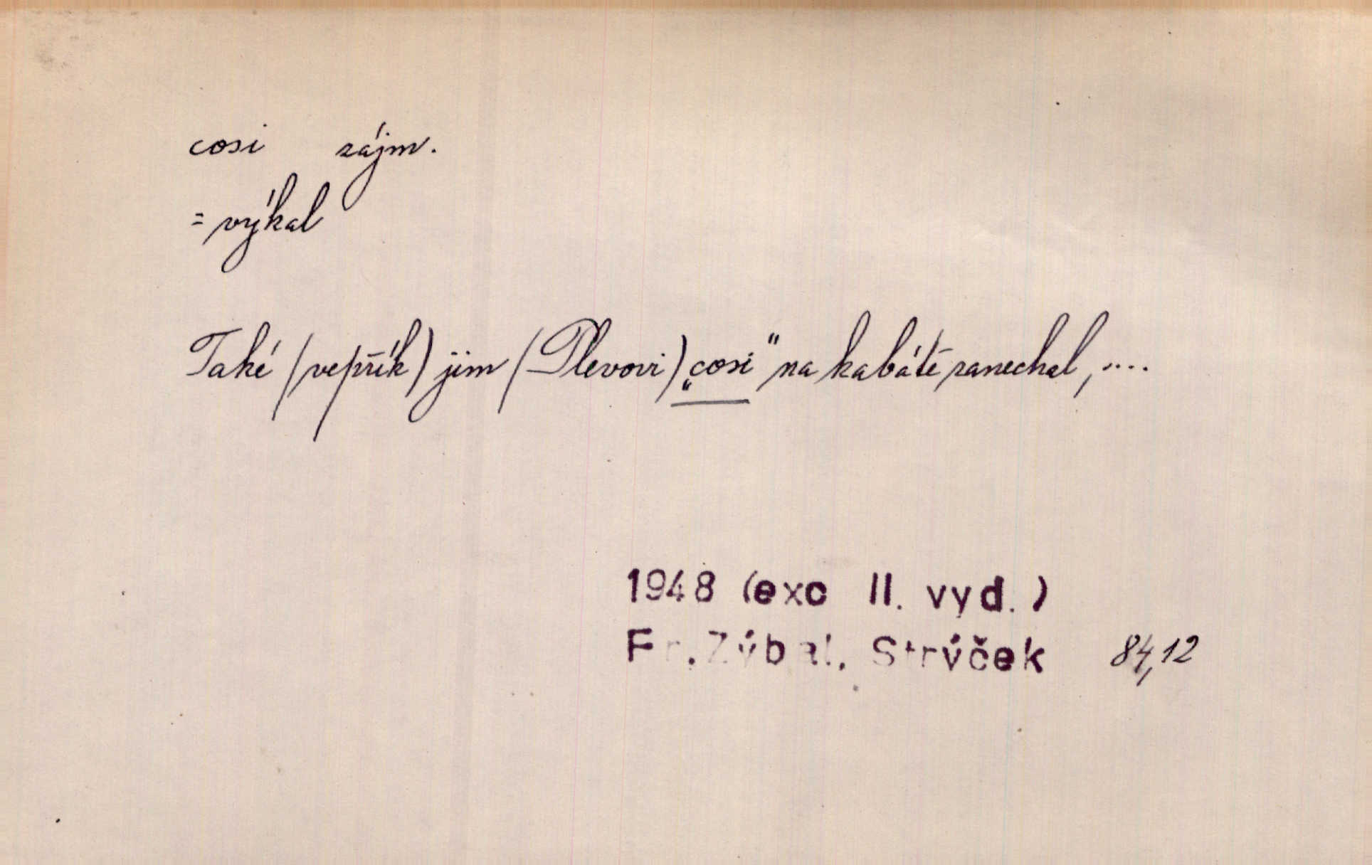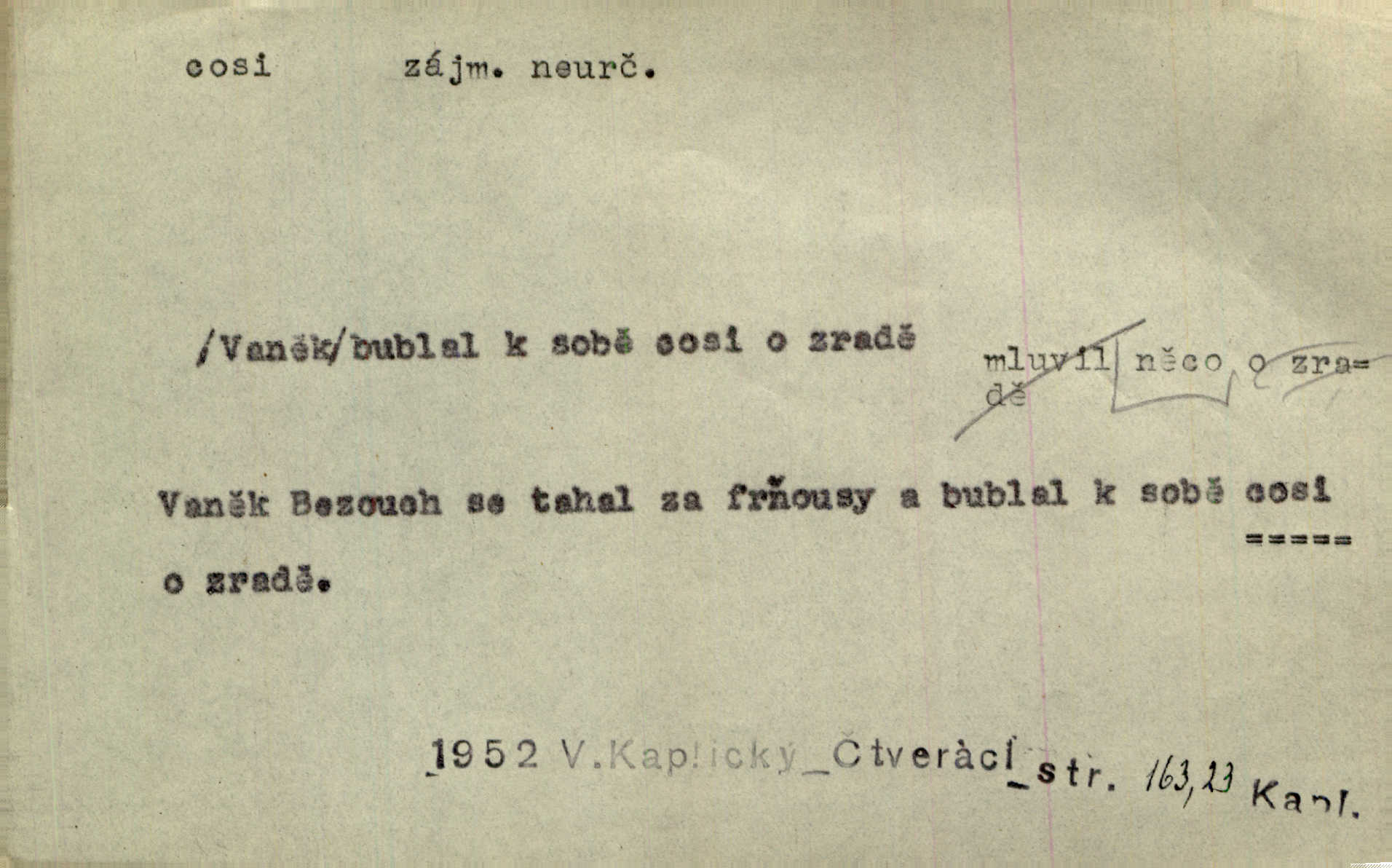 - cos, cosi n. zájm. neurč. označující předmět skutečný. K jezeru vždy ji cos pohání. Erb. V očích slzami zalitých svitlo cosi jako nadšení. Jir. D kdesi cosi všelicos, leccos. Pořád že jsme spolu chodili do školy a kdesi cosi všelijaké povídání. Rais. Arch. Cosi tosi leccos. Doufala, že v nádherném hlučném domě otcovském aspoň cosi tosi z těch myšlených věcí užije. Ondrák.
