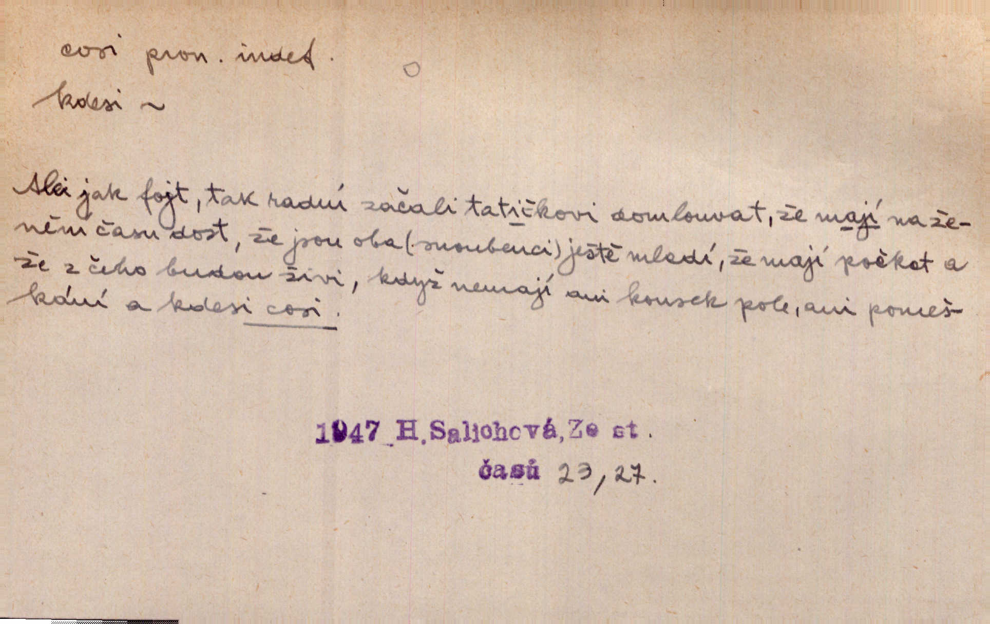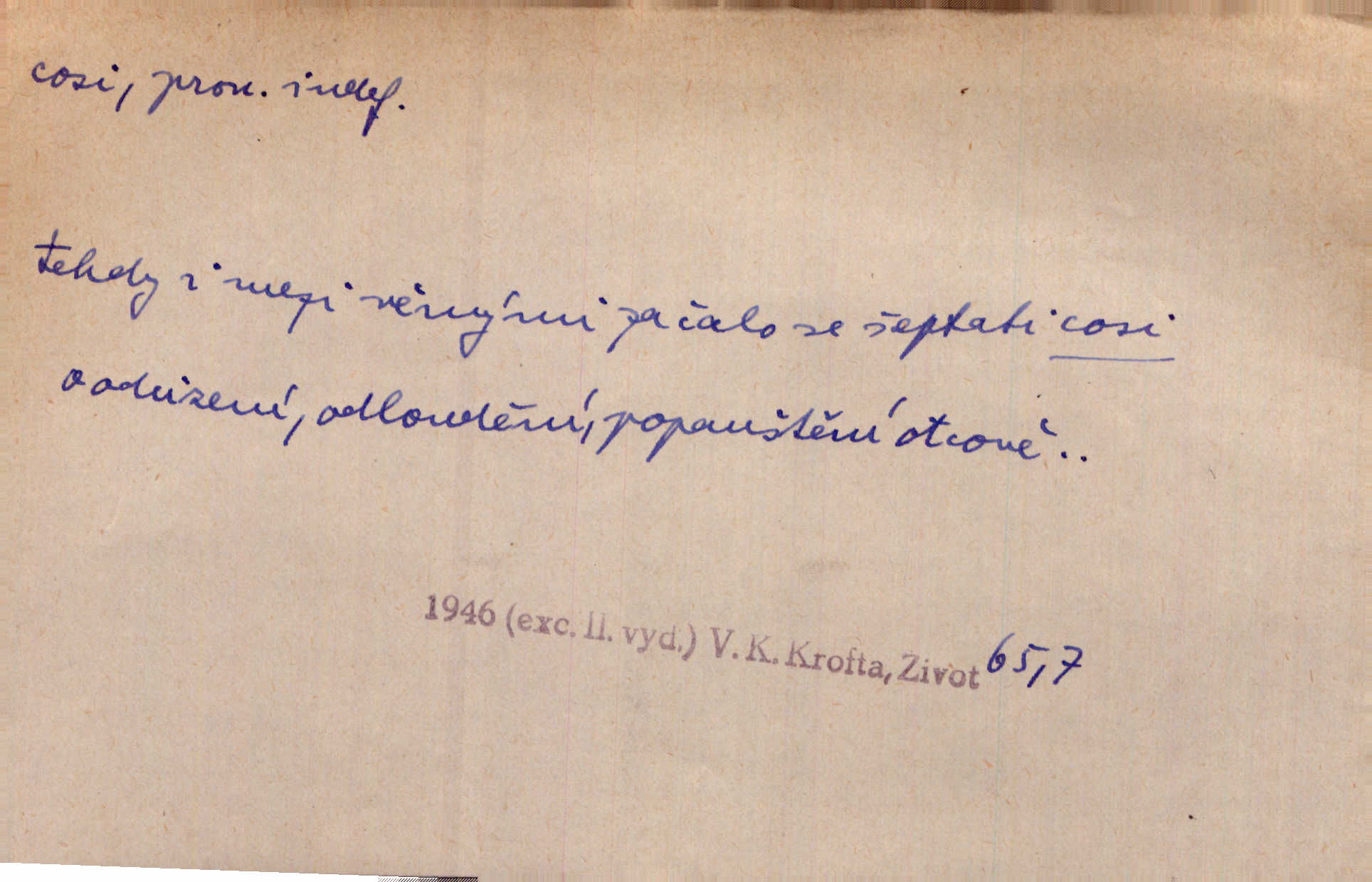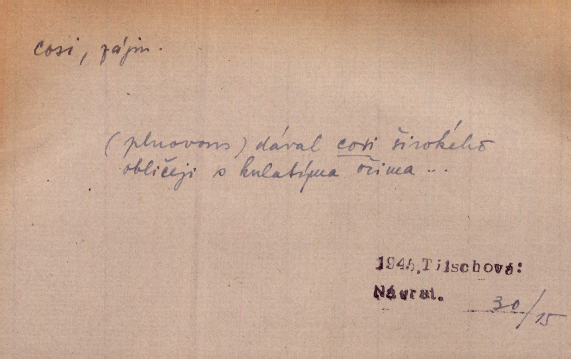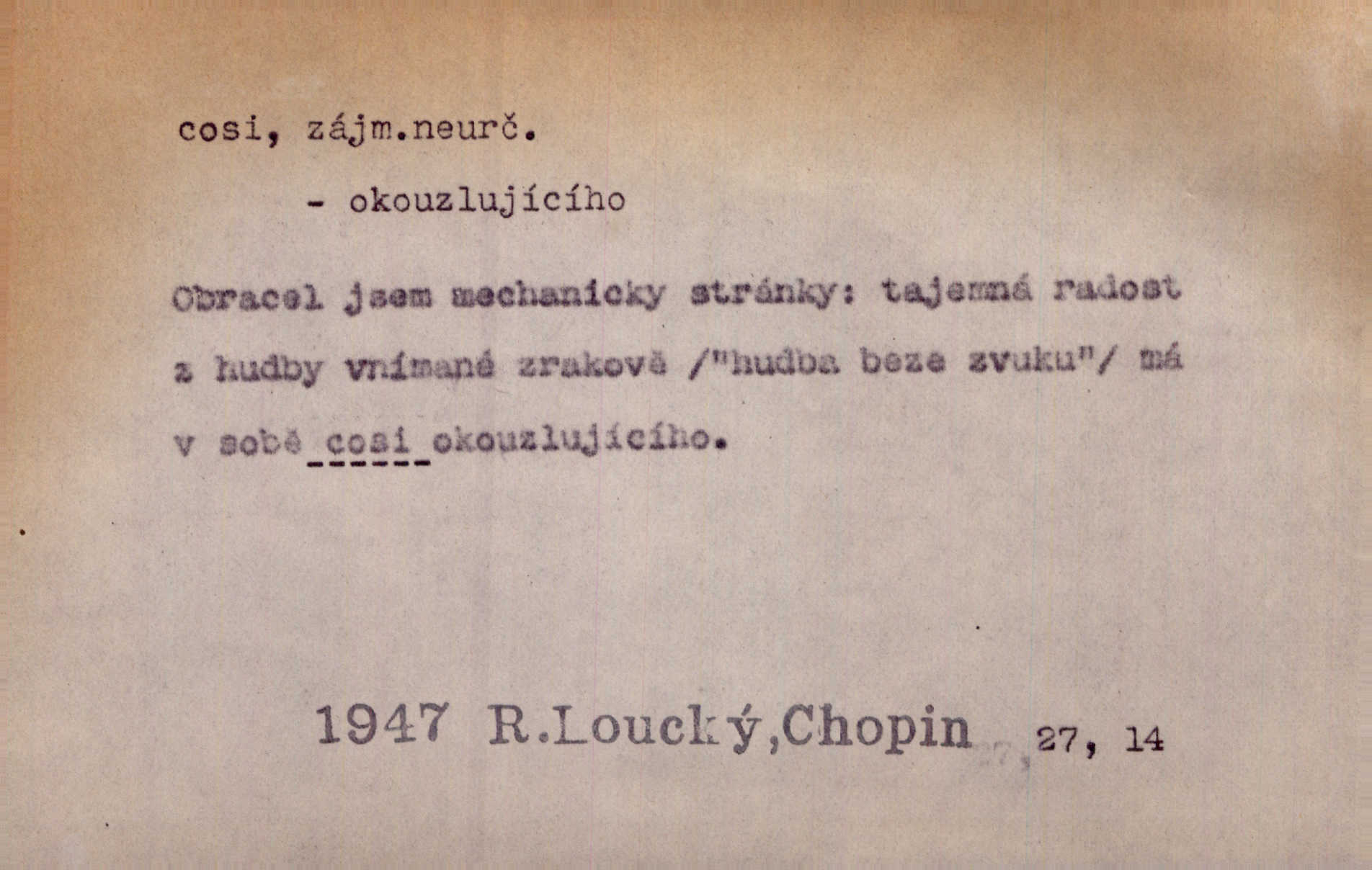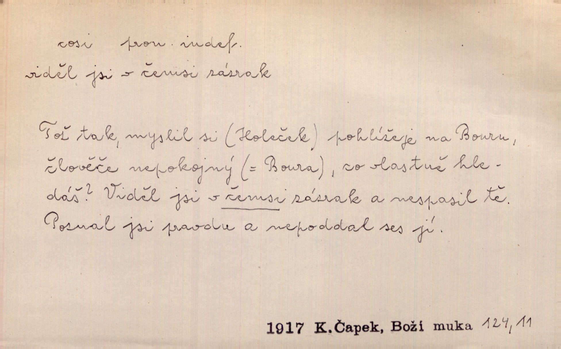 - cos, cosi n. zájm. neurč. označující předmět skutečný. K jezeru vždy ji cos pohání. Erb. V očích slzami zalitých svitlo cosi jako nadšení. Jir. D kdesi cosi všelicos, leccos. Pořád že jsme spolu chodili do školy a kdesi cosi všelijaké povídání. Rais. Arch. Cosi tosi leccos. Doufala, že v nádherném hlučném domě otcovském aspoň cosi tosi z těch myšlených věcí užije. Ondrák.