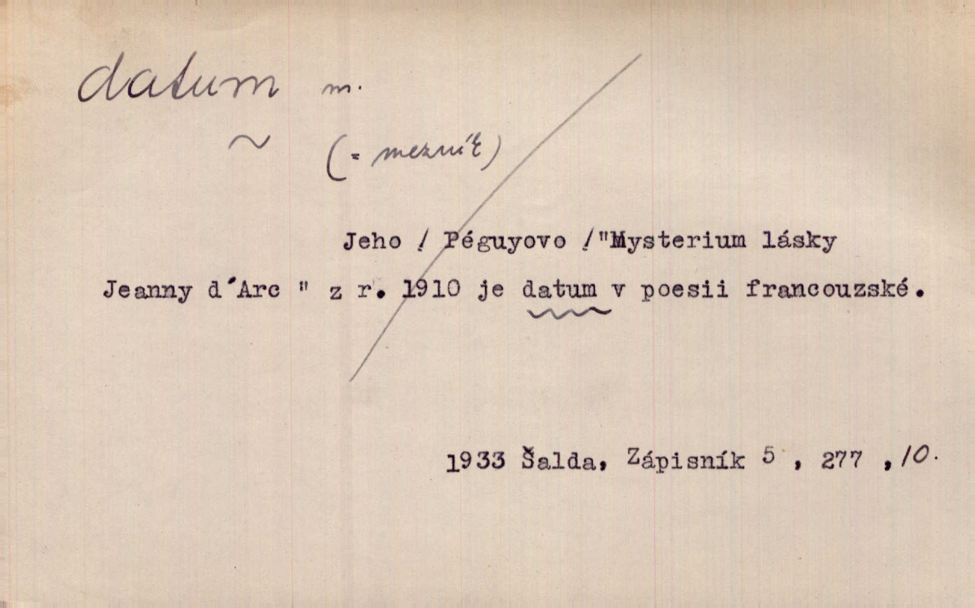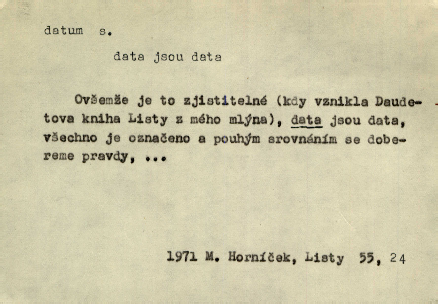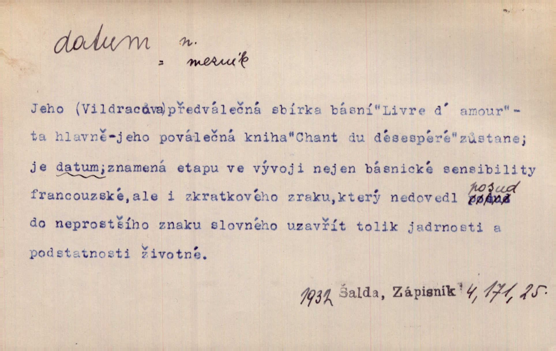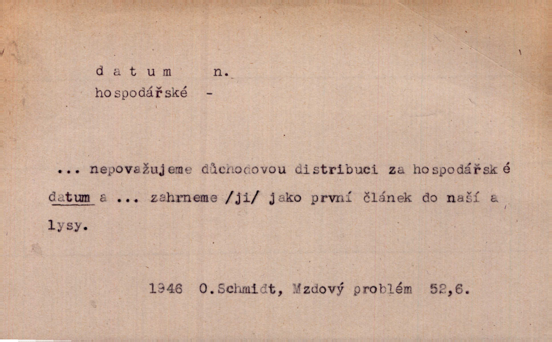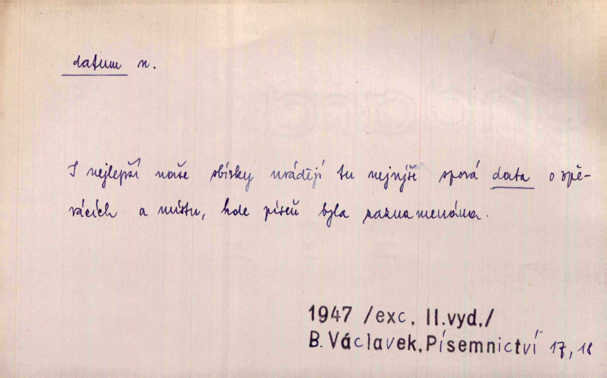 - datum, -ta n. udání doby napsání, vročení. Datum dopisu, listiny, článku. Opatřiti datem udati dobu napsání. D doba, kdy se něco stalo. Datum narození a úmrtí. Her. Člověk starého data nemoderní, starosvětský. Písně novějšího i staršího data z mladších i starších dob. Hál. D mezník, začátek nové doby. Vildracova sbírka básní „Livre d’amour“ je datum; znamená etapu ve vývoji básnické sensibility francouzské. Šal. D data pomn. údaje, fakto. Statistická data, životopisná data. Dřevnický se tázal po bližších datech o mladém Sezimovi. Šmil.