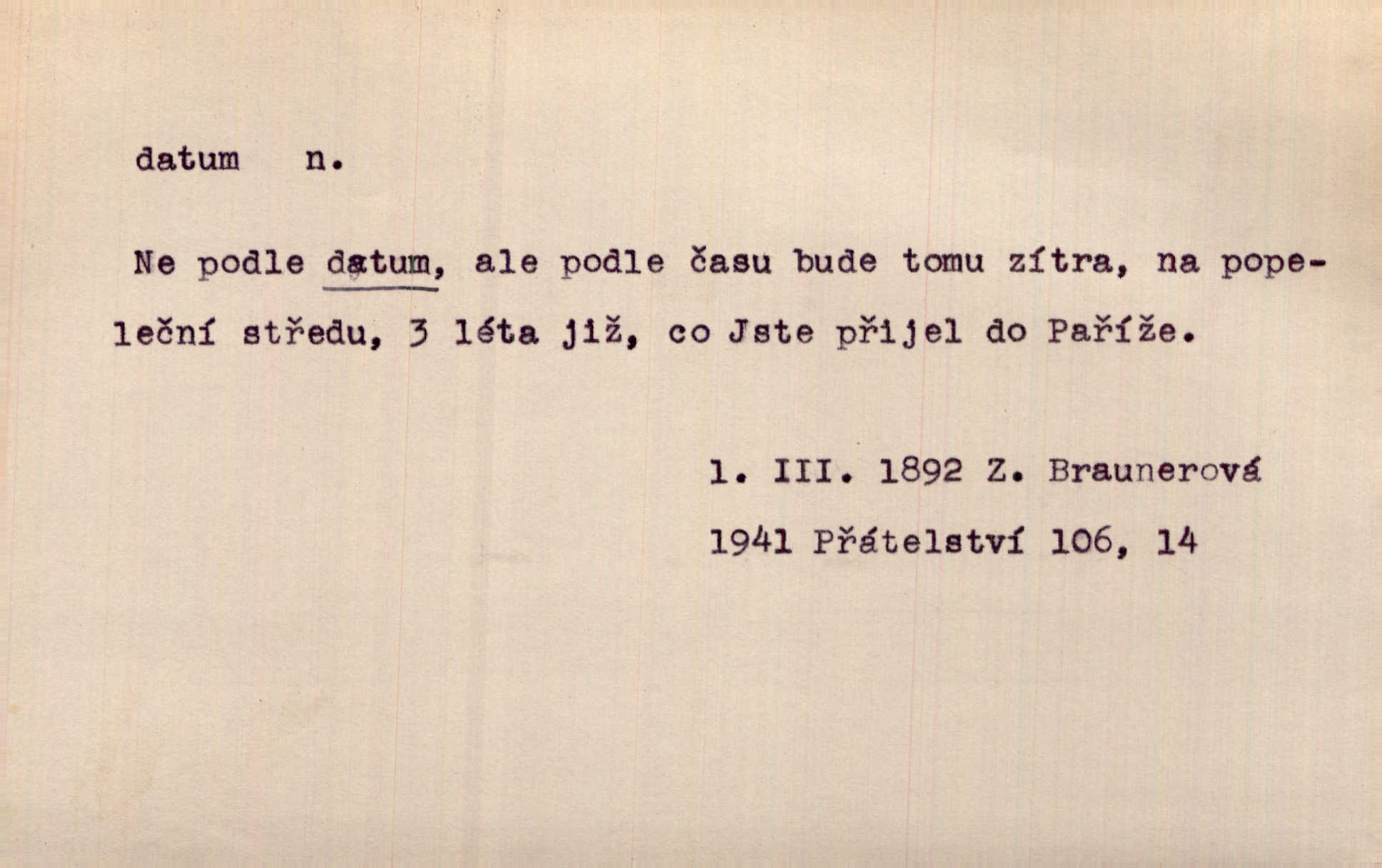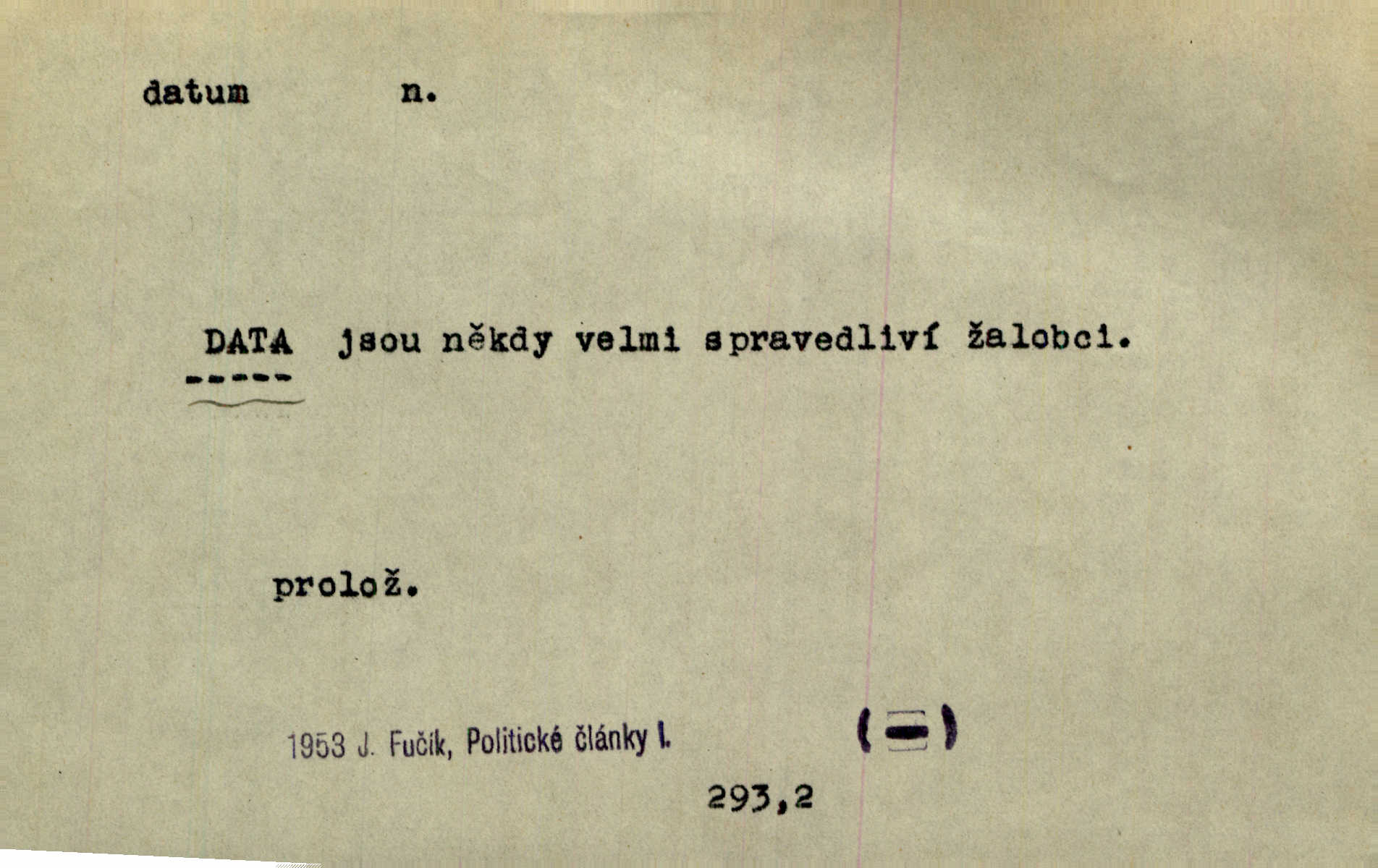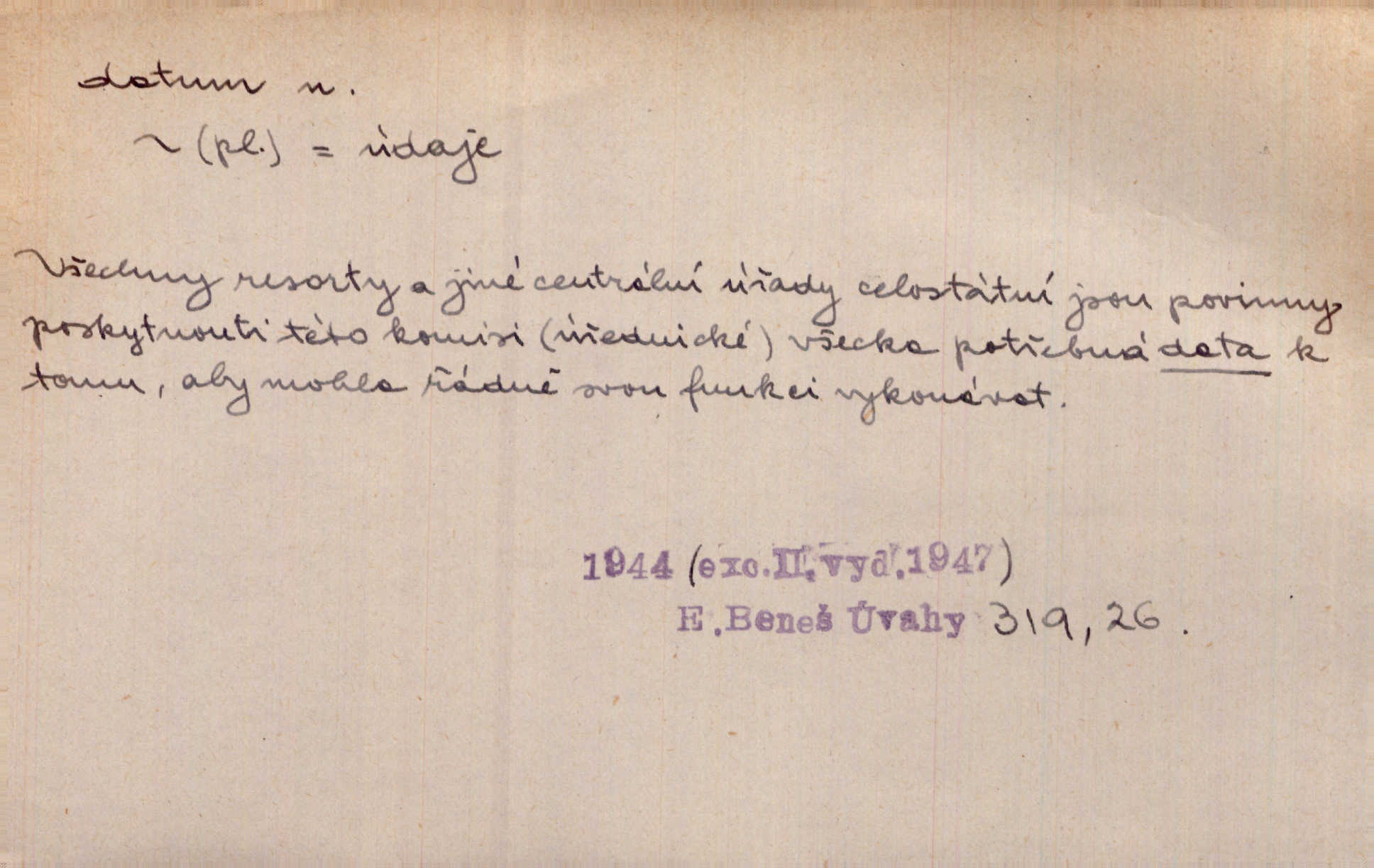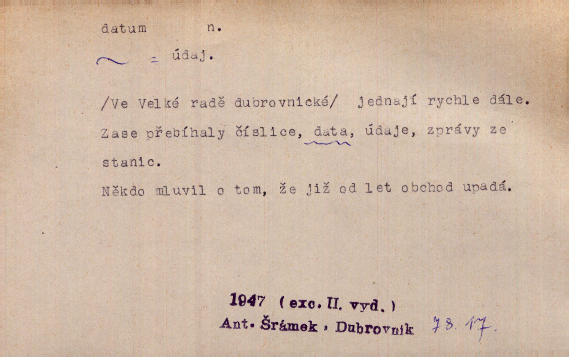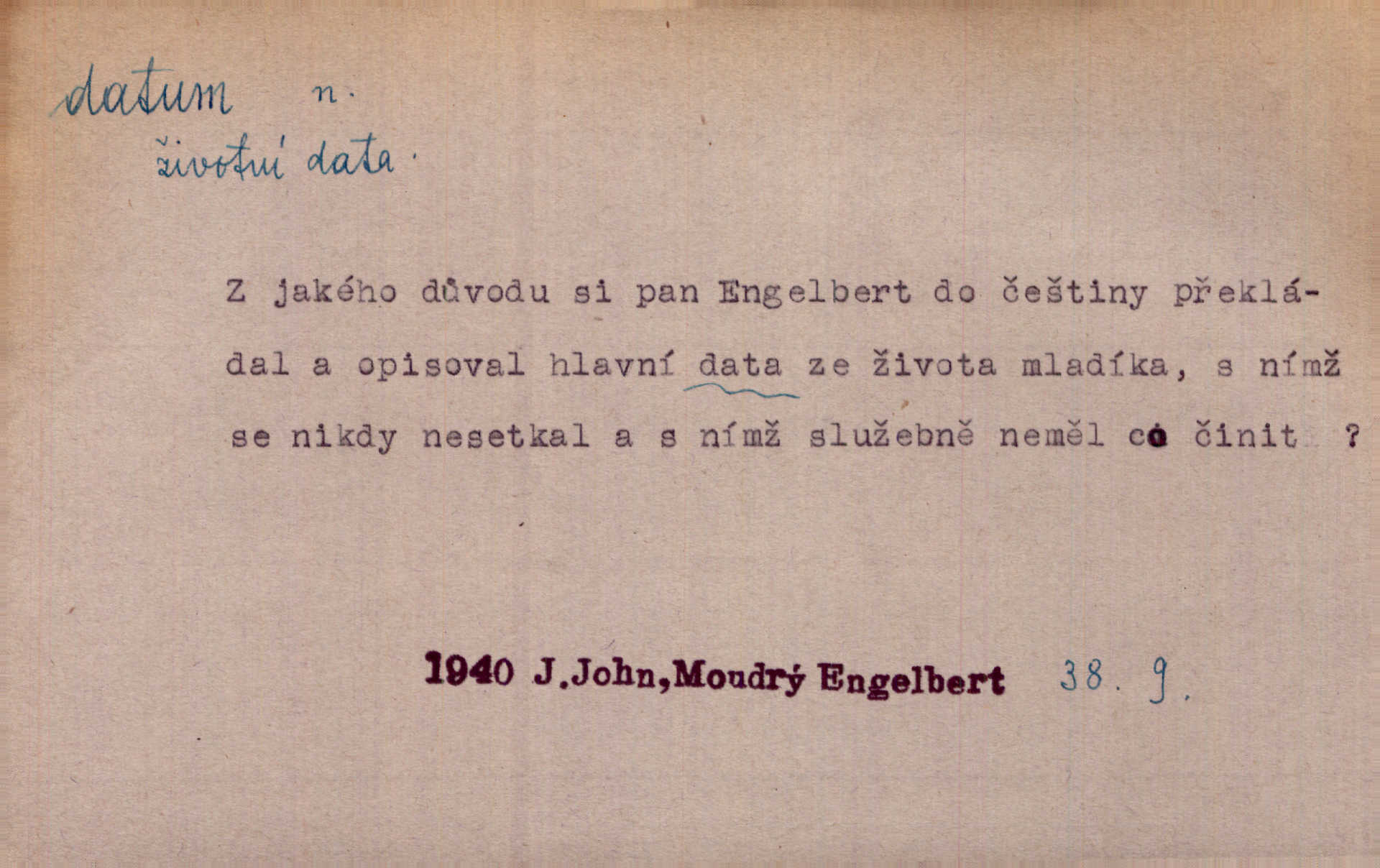 - datum, -ta n. udání doby napsání, vročení. Datum dopisu, listiny, článku. Opatřiti datem udati dobu napsání. D doba, kdy se něco stalo. Datum narození a úmrtí. Her. Člověk starého data nemoderní, starosvětský. Písně novějšího i staršího data z mladších i starších dob. Hál. D mezník, začátek nové doby. Vildracova sbírka básní „Livre d’amour“ je datum; znamená etapu ve vývoji básnické sensibility francouzské. Šal. D data pomn. údaje, fakto. Statistická data, životopisná data. Dřevnický se tázal po bližších datech o mladém Sezimovi. Šmil.