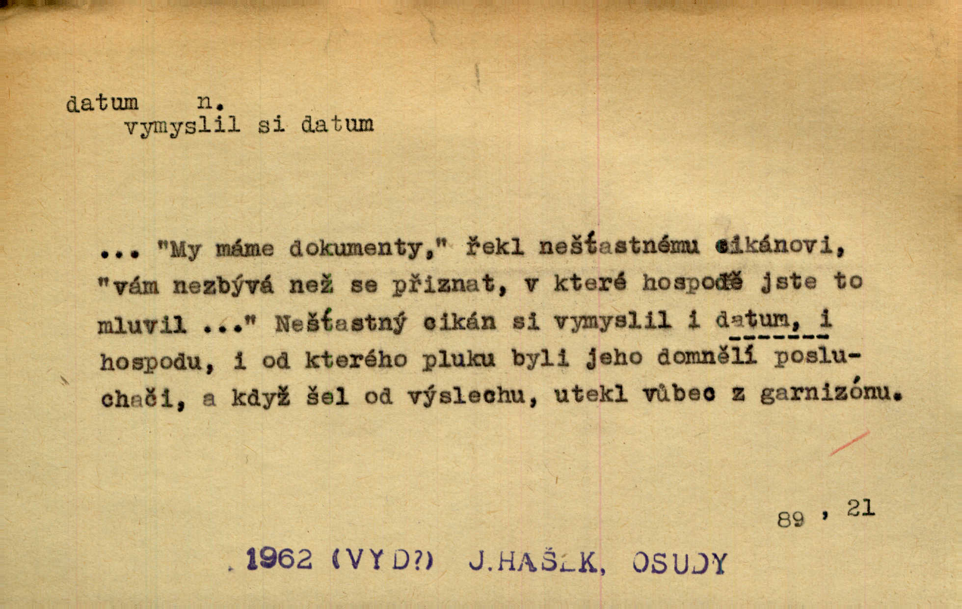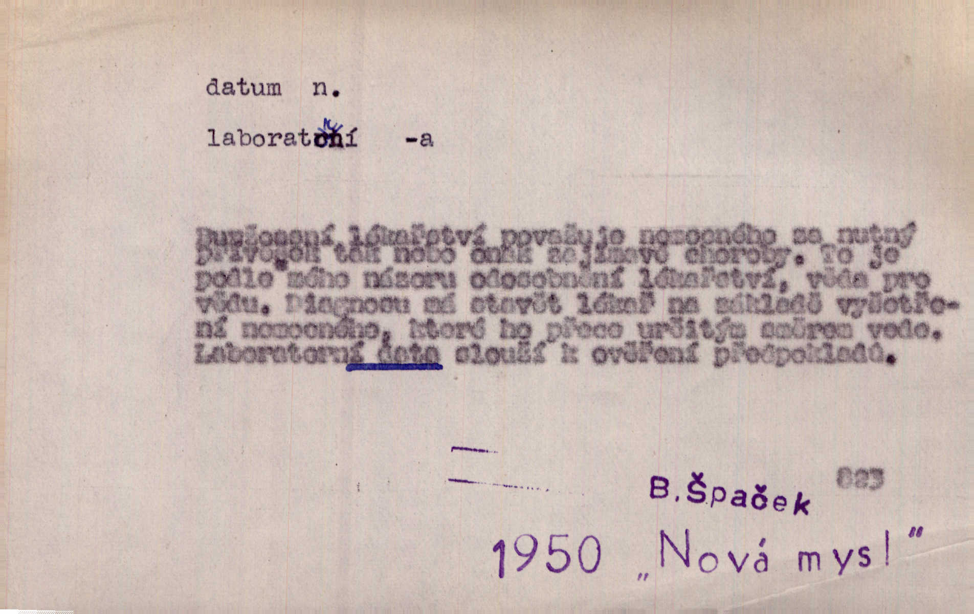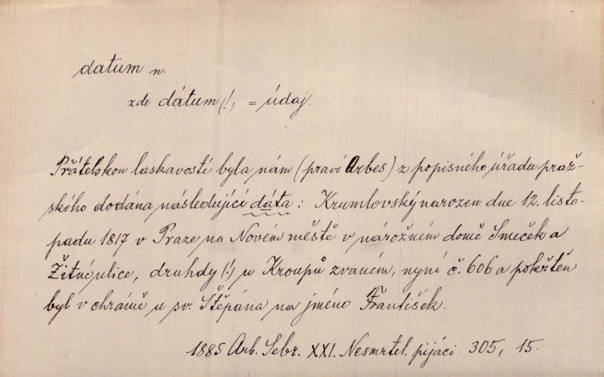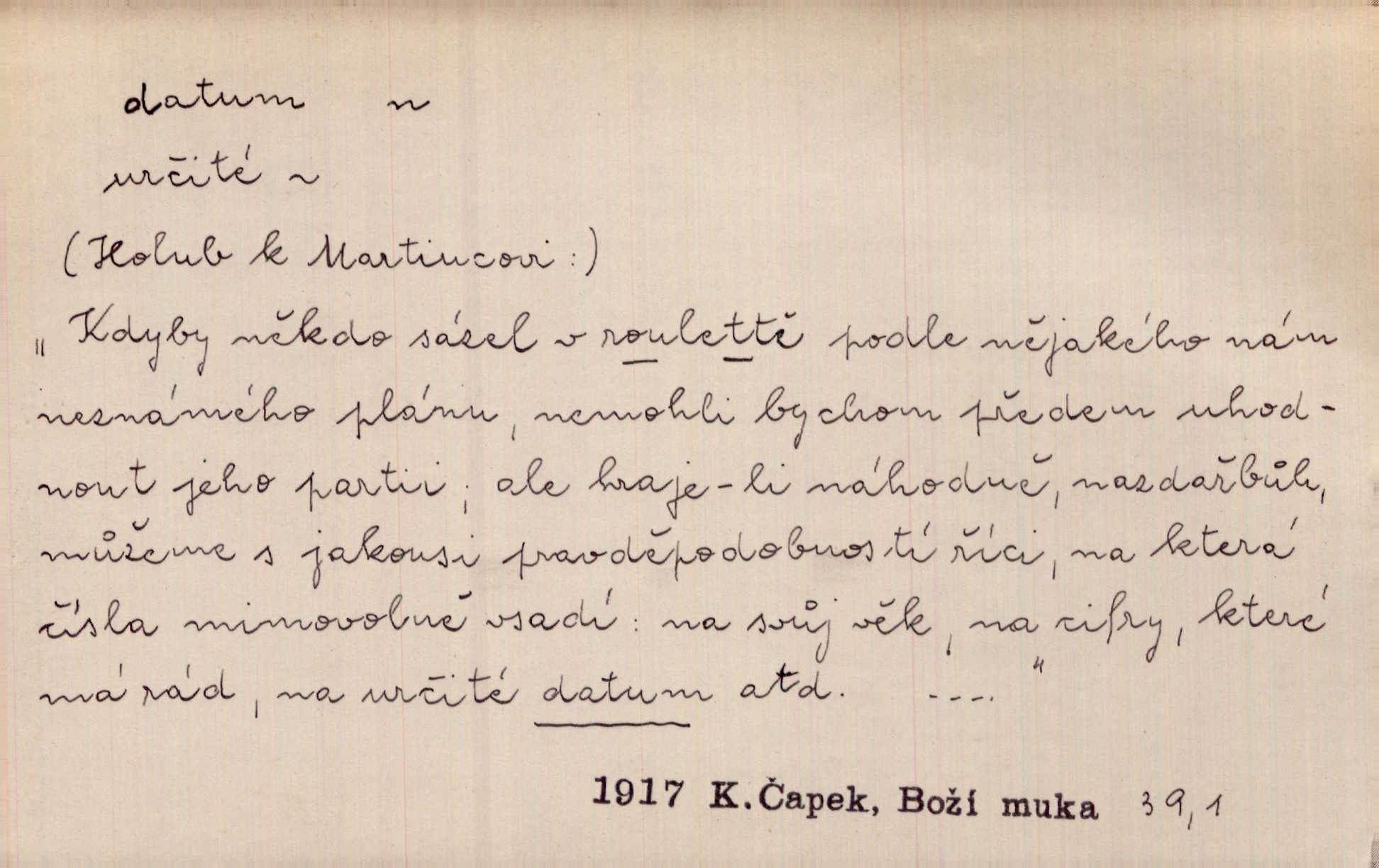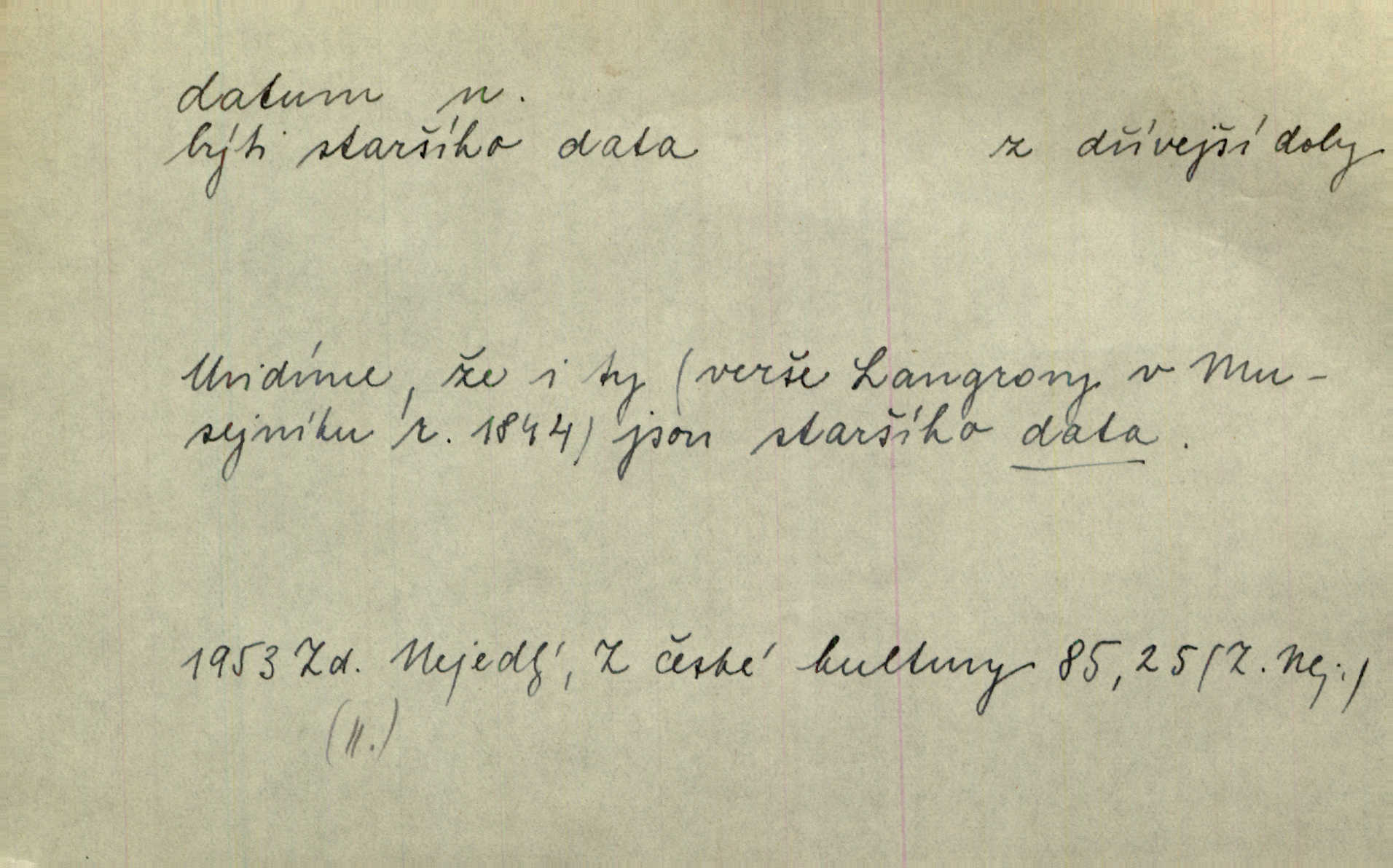 - datum, -ta n. udání doby napsání, vročení. Datum dopisu, listiny, článku. Opatřiti datem udati dobu napsání. D doba, kdy se něco stalo. Datum narození a úmrtí. Her. Člověk starého data nemoderní, starosvětský. Písně novějšího i staršího data z mladších i starších dob. Hál. D mezník, začátek nové doby. Vildracova sbírka básní „Livre d’amour“ je datum; znamená etapu ve vývoji básnické sensibility francouzské. Šal. D data pomn. údaje, fakto. Statistická data, životopisná data. Dřevnický se tázal po bližších datech o mladém Sezimovi. Šmil.