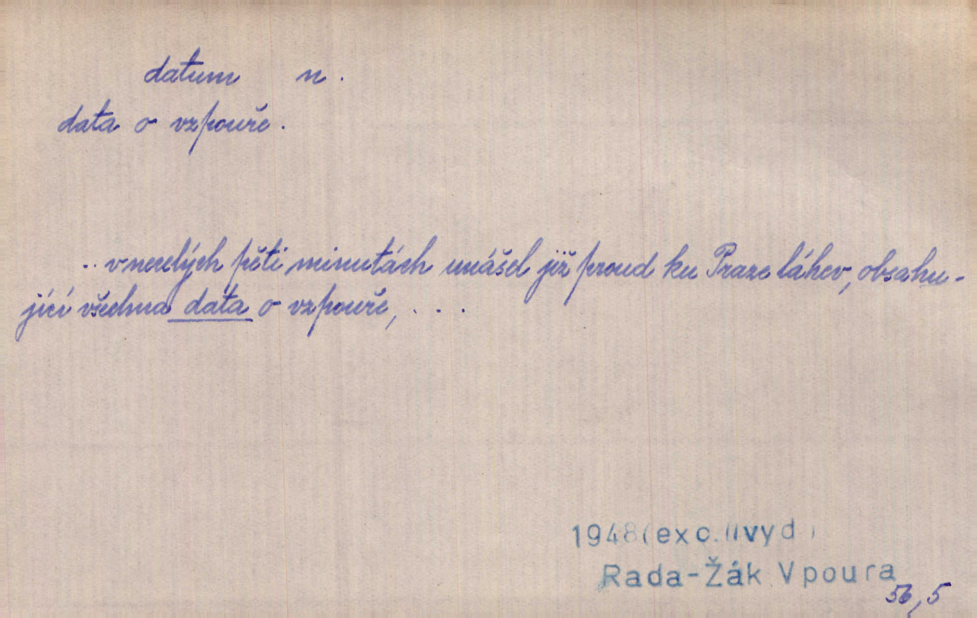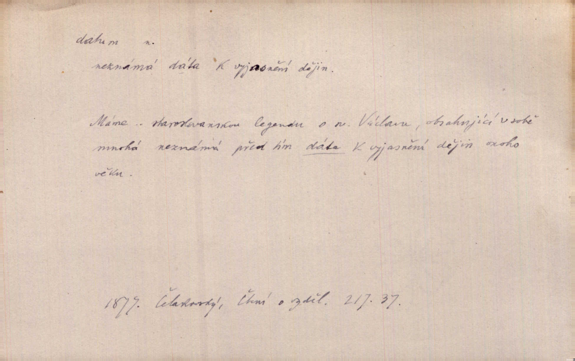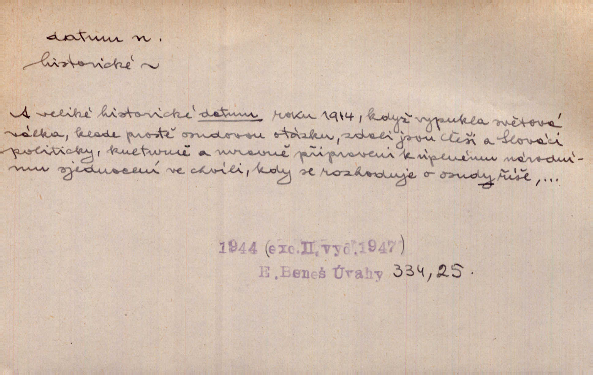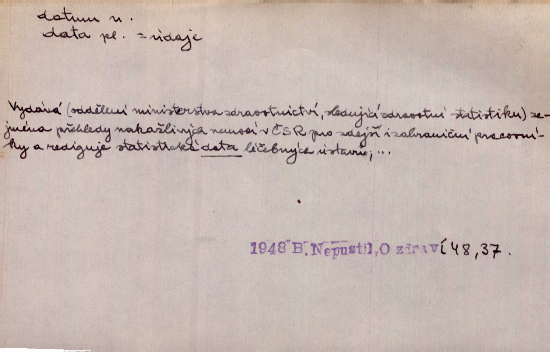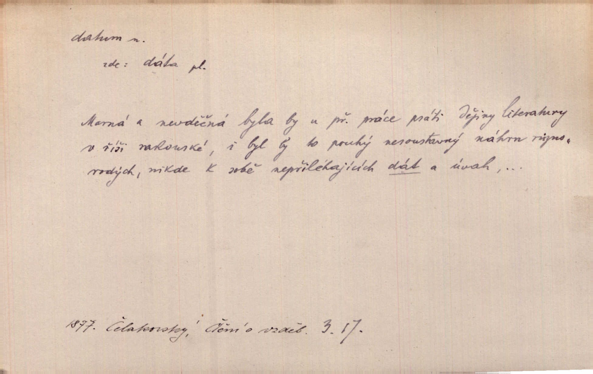 - datum, -ta n. udání doby napsání, vročení. Datum dopisu, listiny, článku. Opatřiti datem udati dobu napsání. D doba, kdy se něco stalo. Datum narození a úmrtí. Her. Člověk starého data nemoderní, starosvětský. Písně novějšího i staršího data z mladších i starších dob. Hál. D mezník, začátek nové doby. Vildracova sbírka básní „Livre d’amour“ je datum; znamená etapu ve vývoji básnické sensibility francouzské. Šal. D data pomn. údaje, fakto. Statistická data, životopisná data. Dřevnický se tázal po bližších datech o mladém Sezimovi. Šmil.