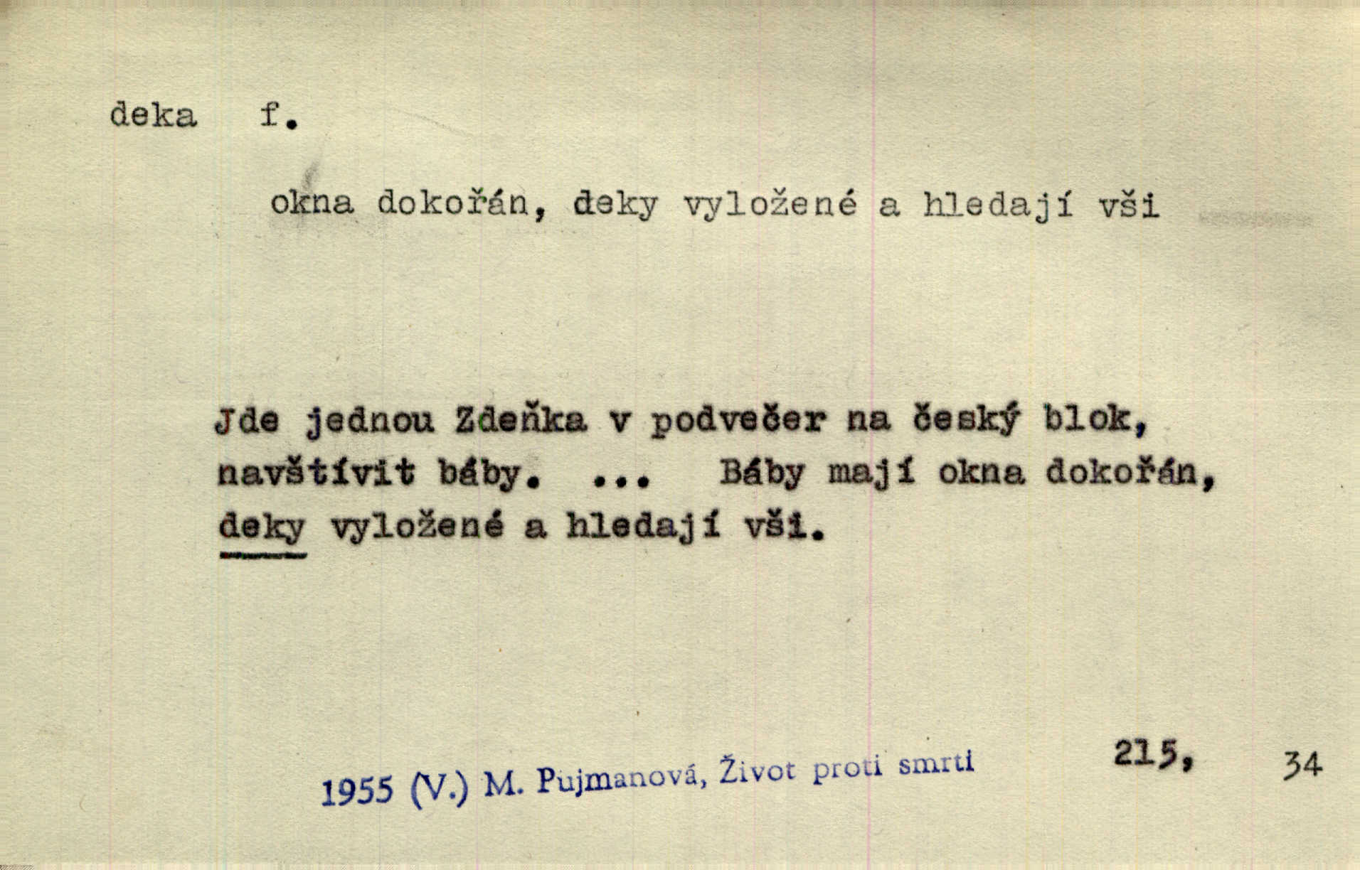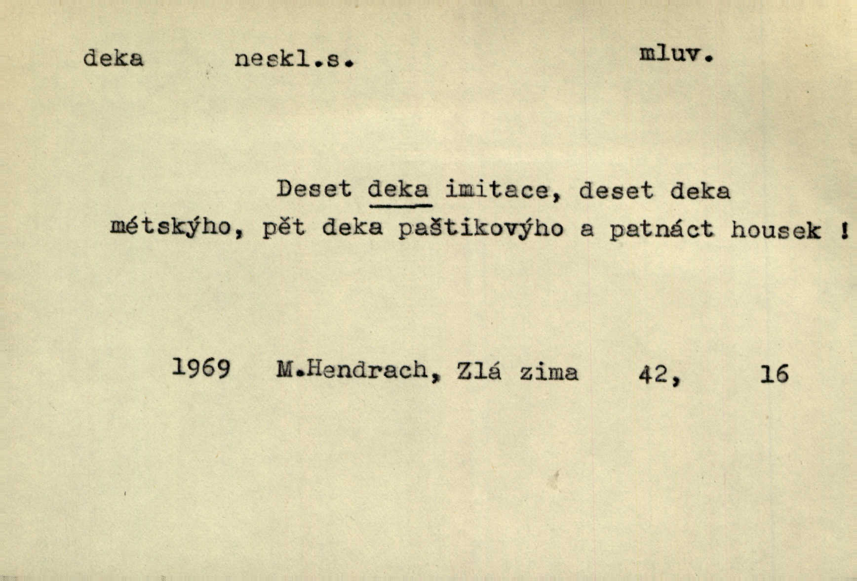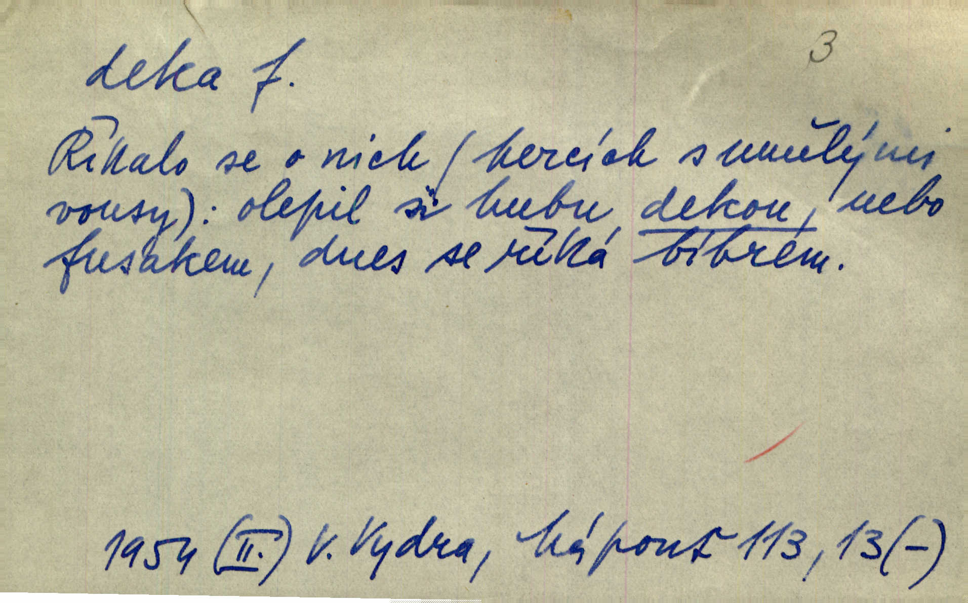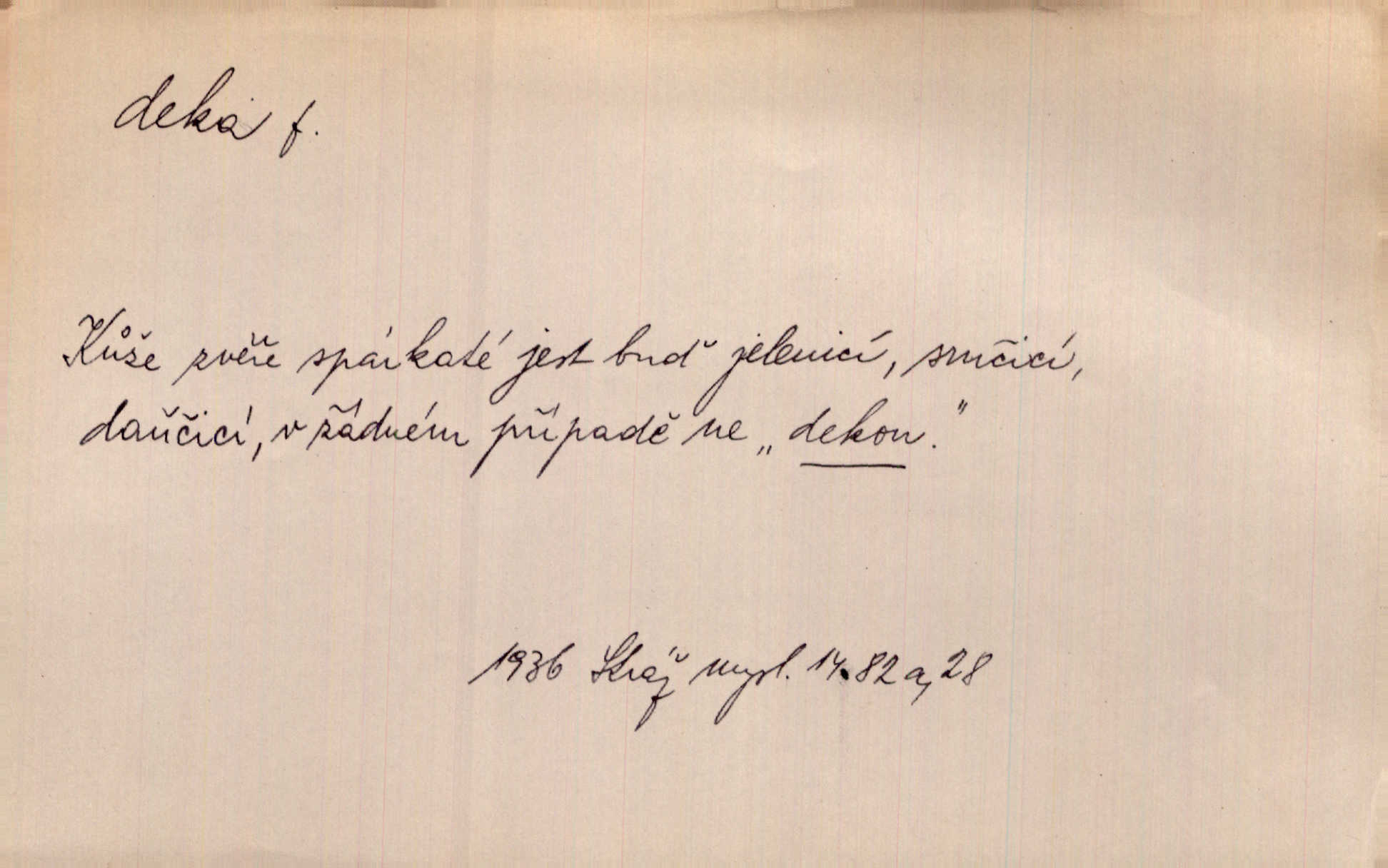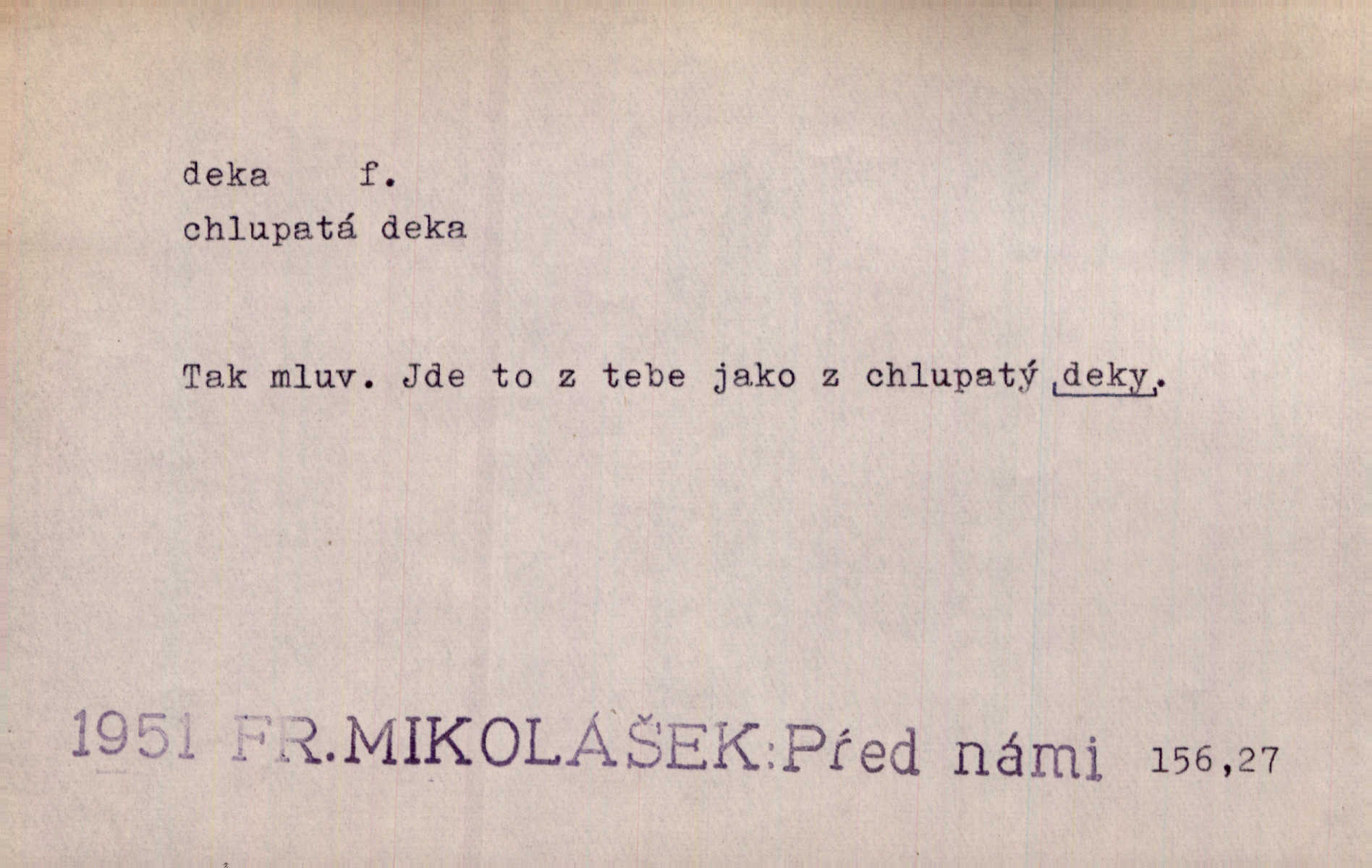 - deka, -y f. pokrývka, houně. U starostů mají ty deky [na nábytku] háčkované. Rais. Hodil starou deku na kobylu. Her. Vulg. Šli [studenti] na tah. Pravili: mazat deku hýřiti, flámovati. Nor. Vulg. To vypravování leze z vdovy jako z chlupaté deky. Poláč. Vyřídíme si [vojáci] to s tebou — deku dostaneš zabalí ho do deky a pak zmlátí. Šrám.