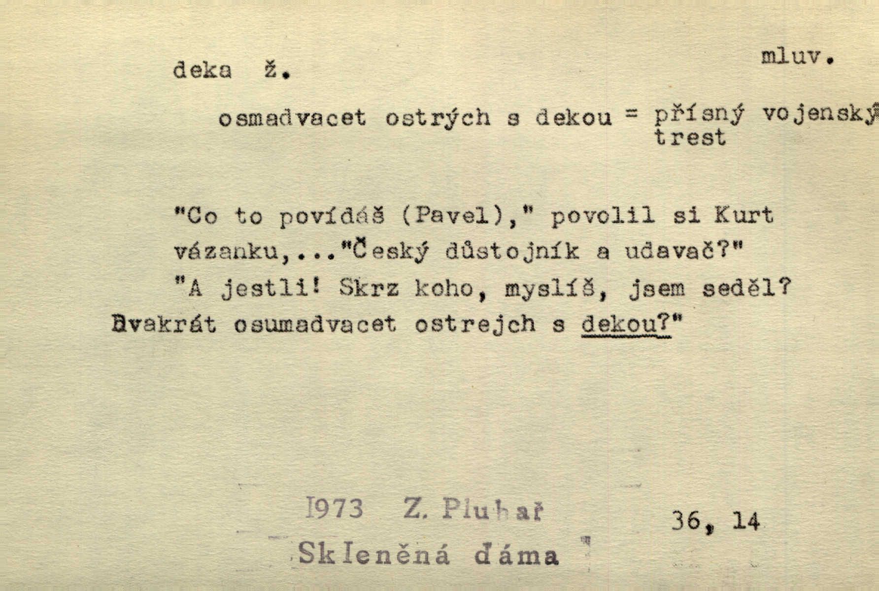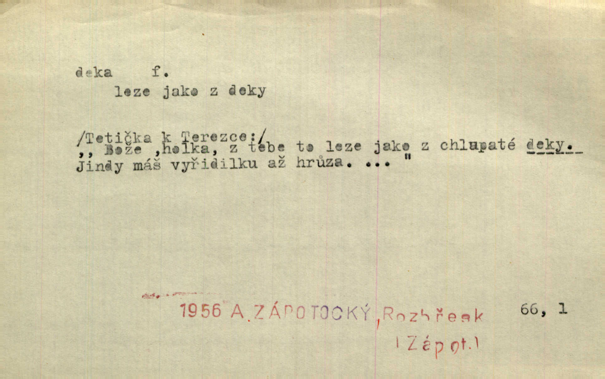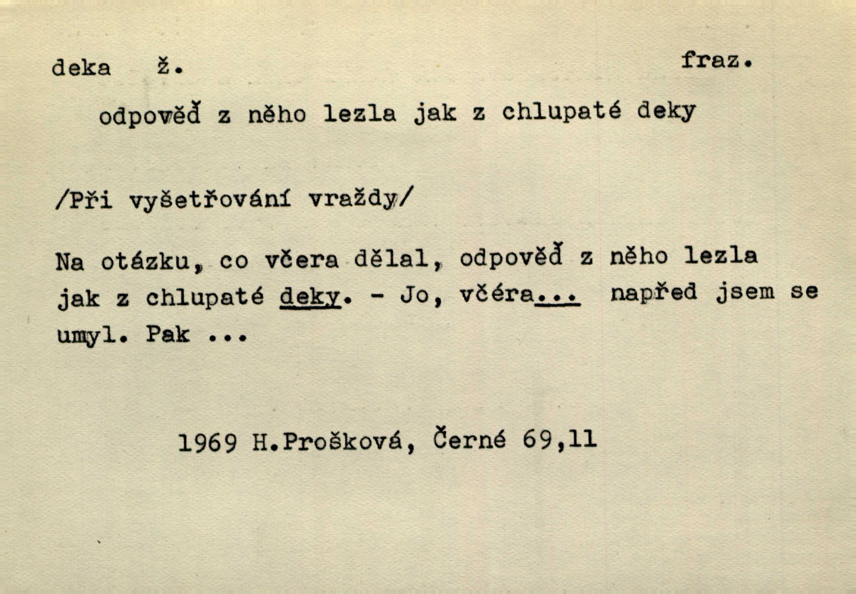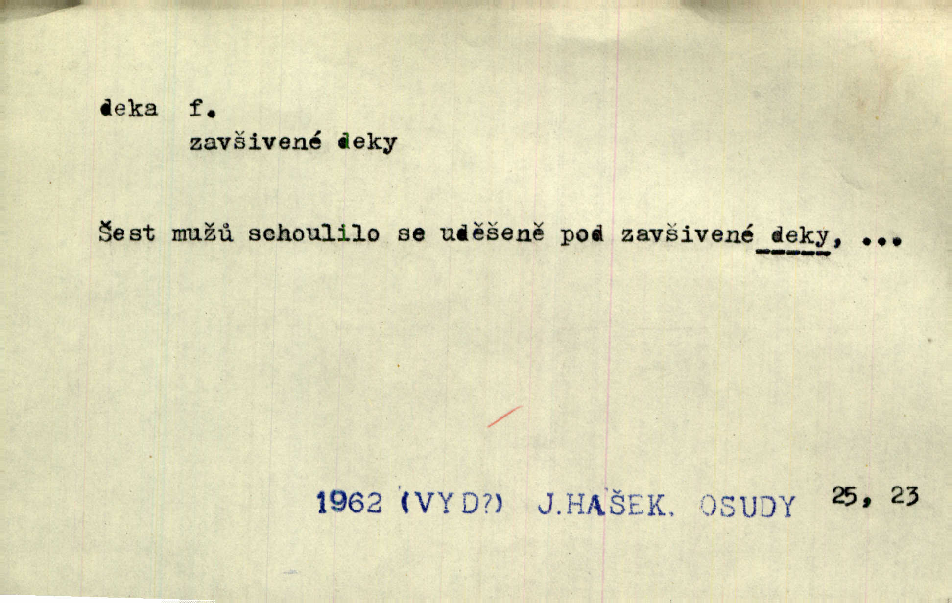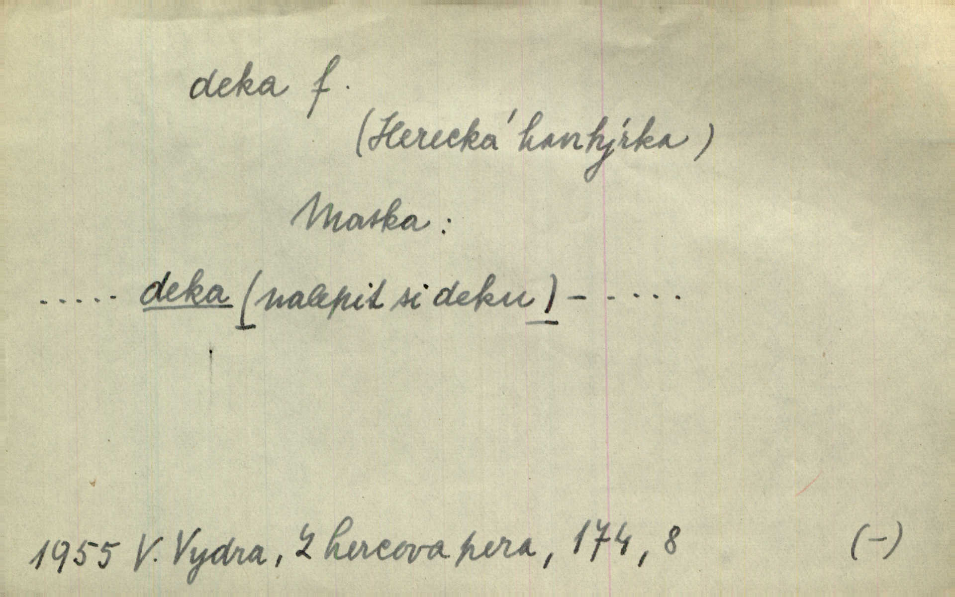 - deka, -y f. pokrývka, houně. U starostů mají ty deky [na nábytku] háčkované. Rais. Hodil starou deku na kobylu. Her. Vulg. Šli [studenti] na tah. Pravili: mazat deku hýřiti, flámovati. Nor. Vulg. To vypravování leze z vdovy jako z chlupaté deky. Poláč. Vyřídíme si [vojáci] to s tebou — deku dostaneš zabalí ho do deky a pak zmlátí. Šrám.