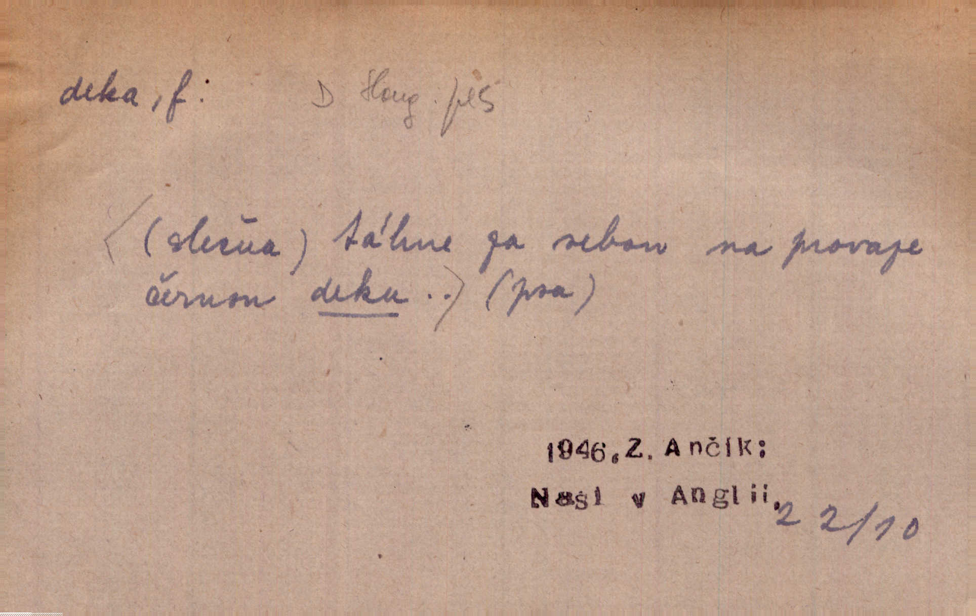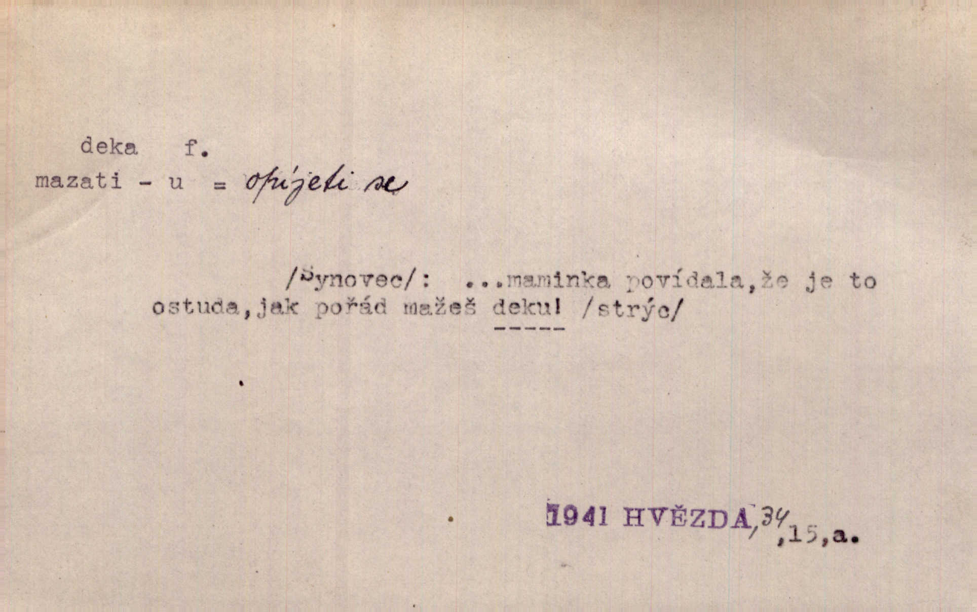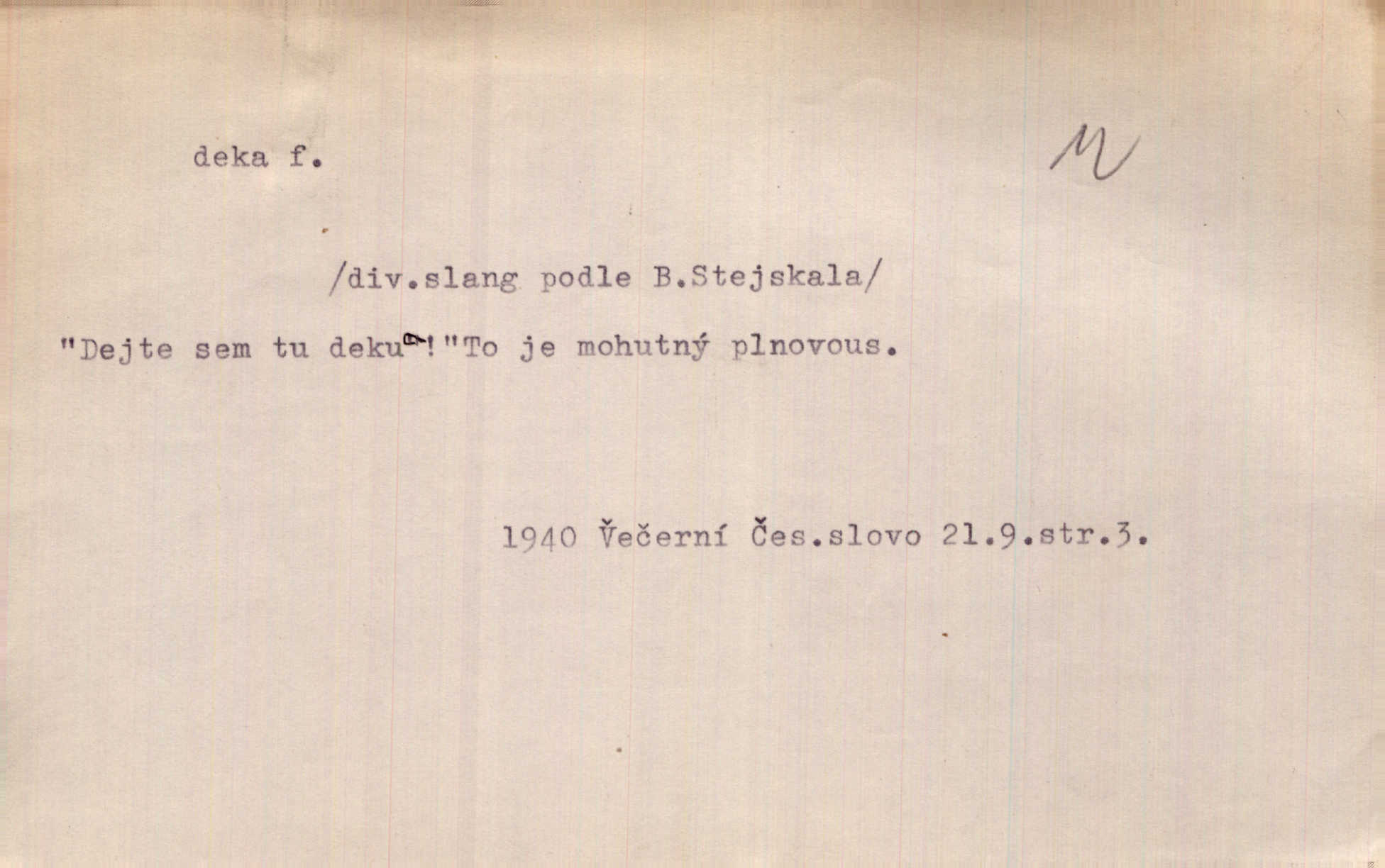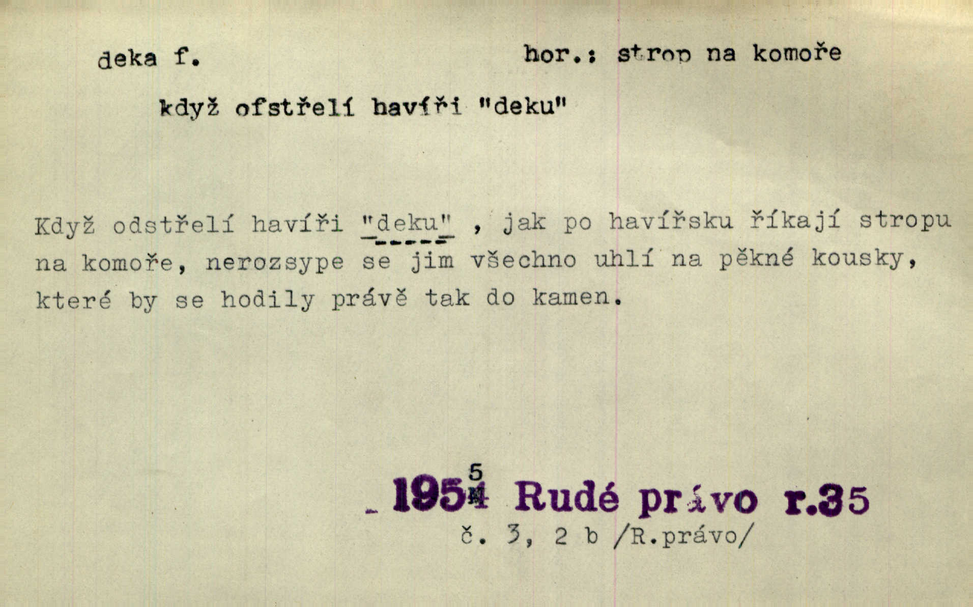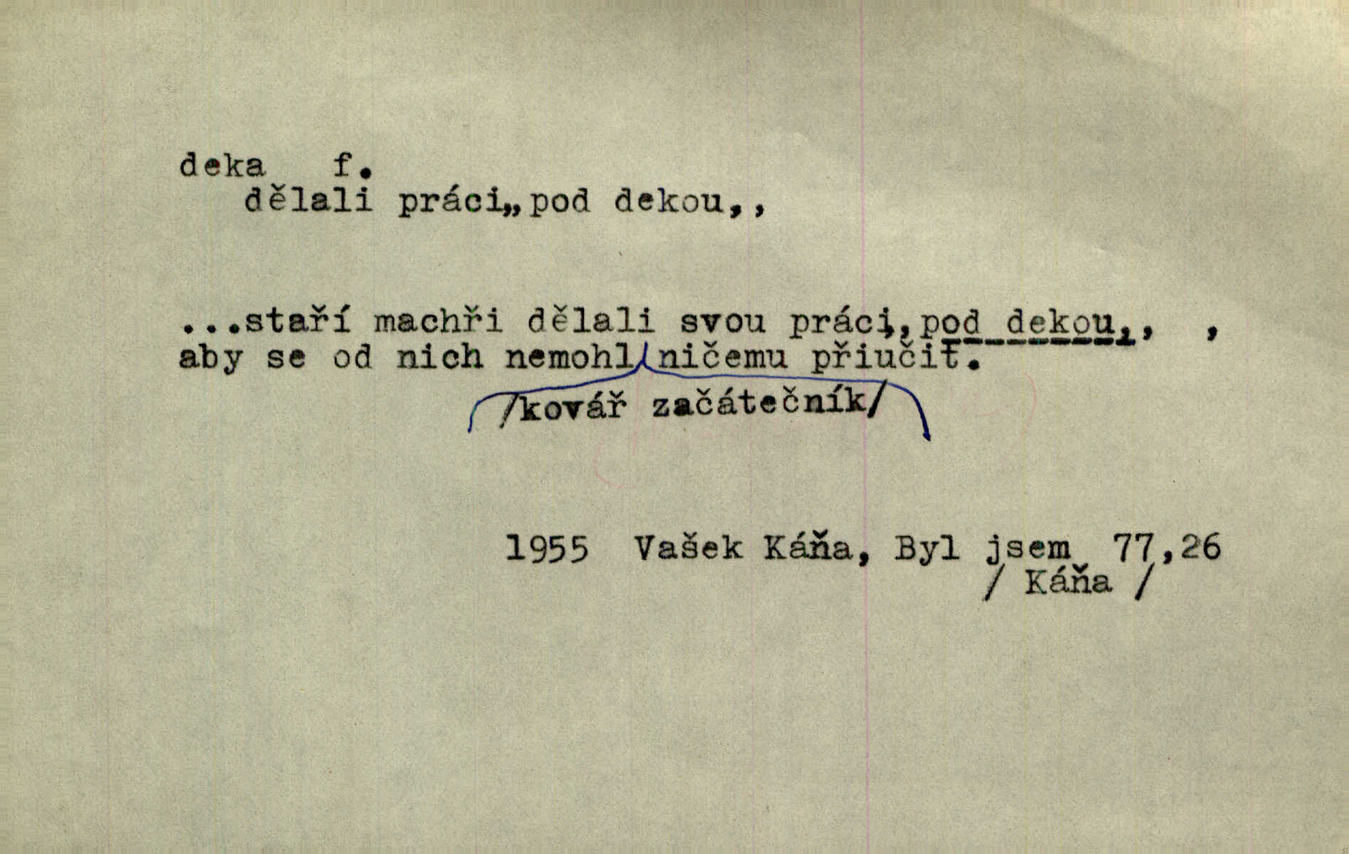- deka, -y f. pokrývka, houně. U starostů mají ty deky [na nábytku] háčkované. Rais. Hodil starou deku na kobylu. Her. Vulg. Šli [studenti] na tah. Pravili: mazat deku hýřiti, flámovati. Nor. Vulg. To vypravování leze z vdovy jako z chlupaté deky. Poláč. Vyřídíme si [vojáci] to s tebou — deku dostaneš zabalí ho do deky a pak zmlátí. Šrám.
