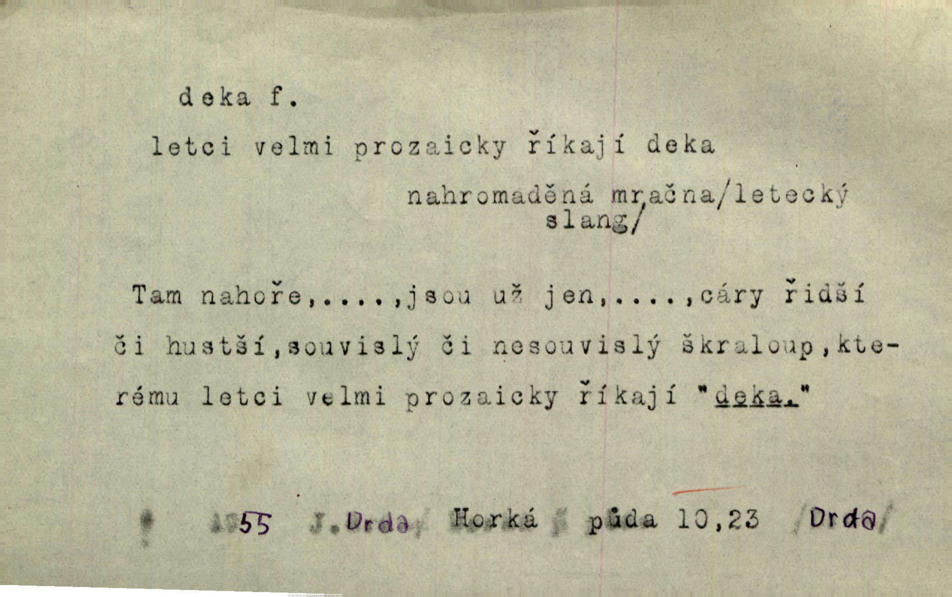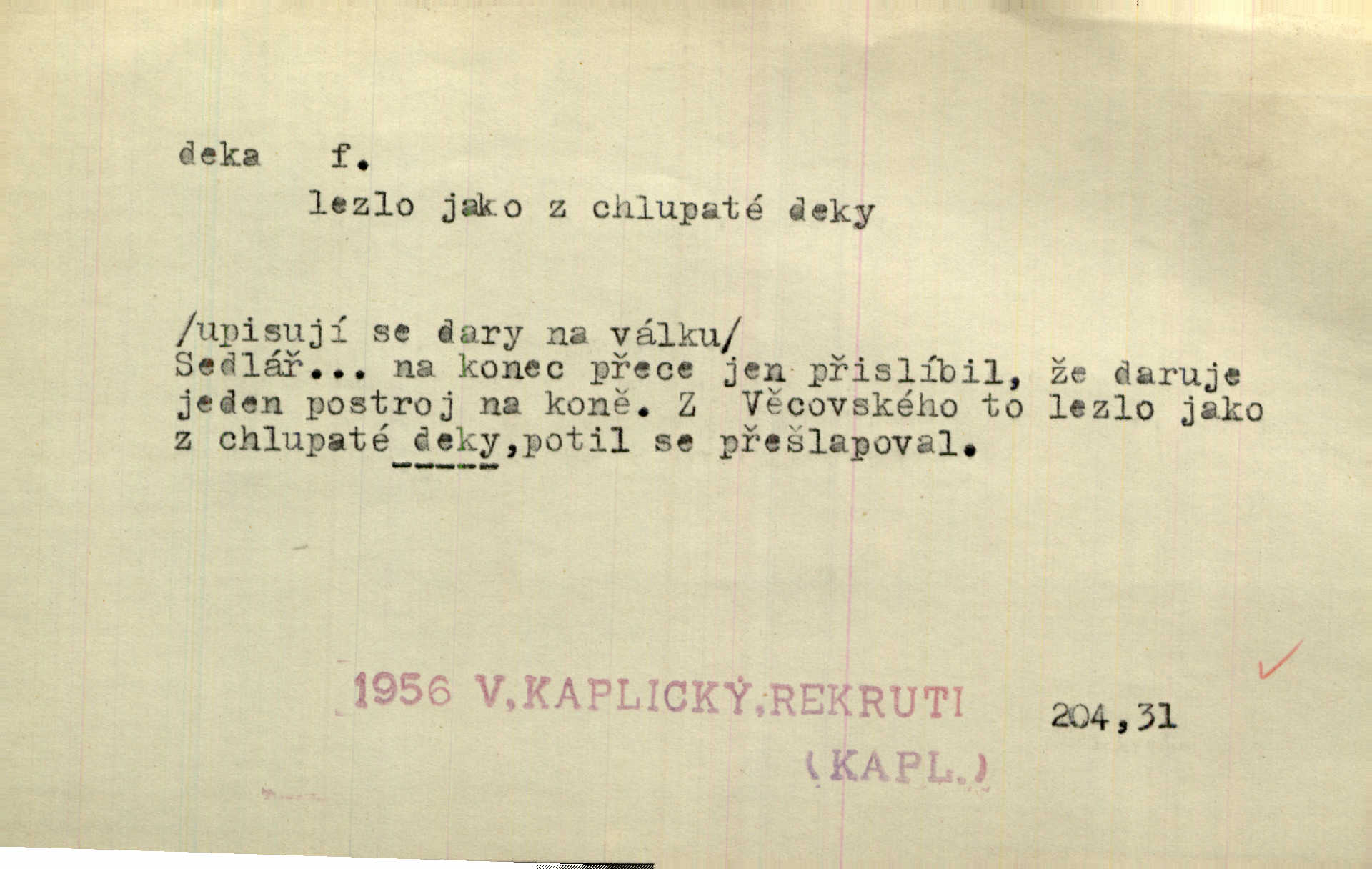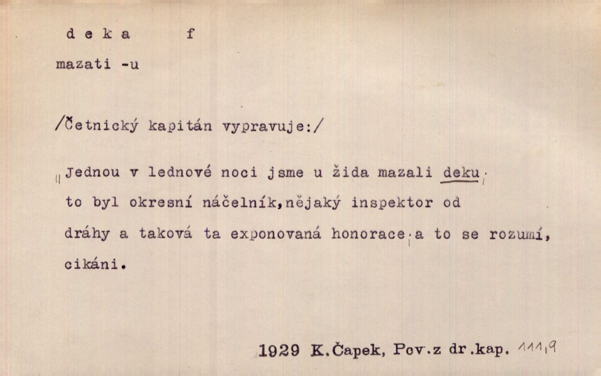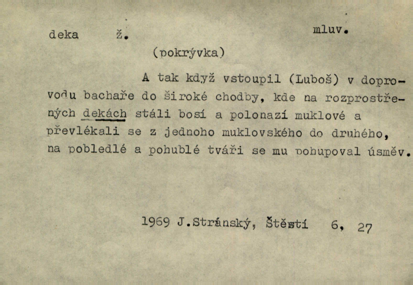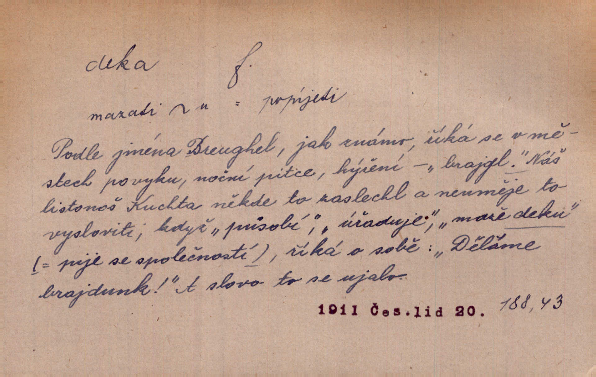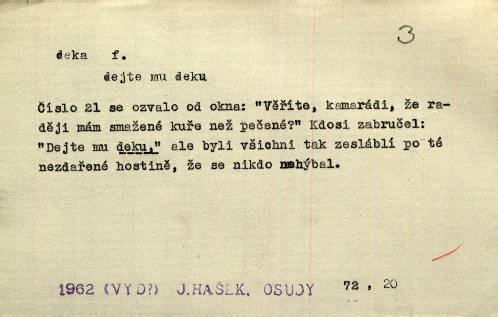 - deka, -y f. pokrývka, houně. U starostů mají ty deky [na nábytku] háčkované. Rais. Hodil starou deku na kobylu. Her. Vulg. Šli [studenti] na tah. Pravili: mazat deku hýřiti, flámovati. Nor. Vulg. To vypravování leze z vdovy jako z chlupaté deky. Poláč. Vyřídíme si [vojáci] to s tebou — deku dostaneš zabalí ho do deky a pak zmlátí. Šrám.