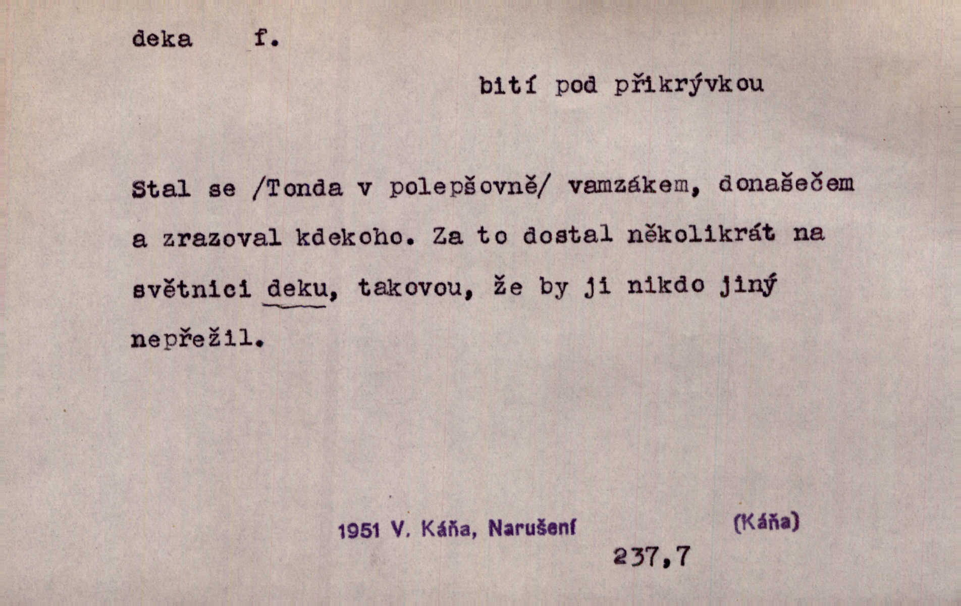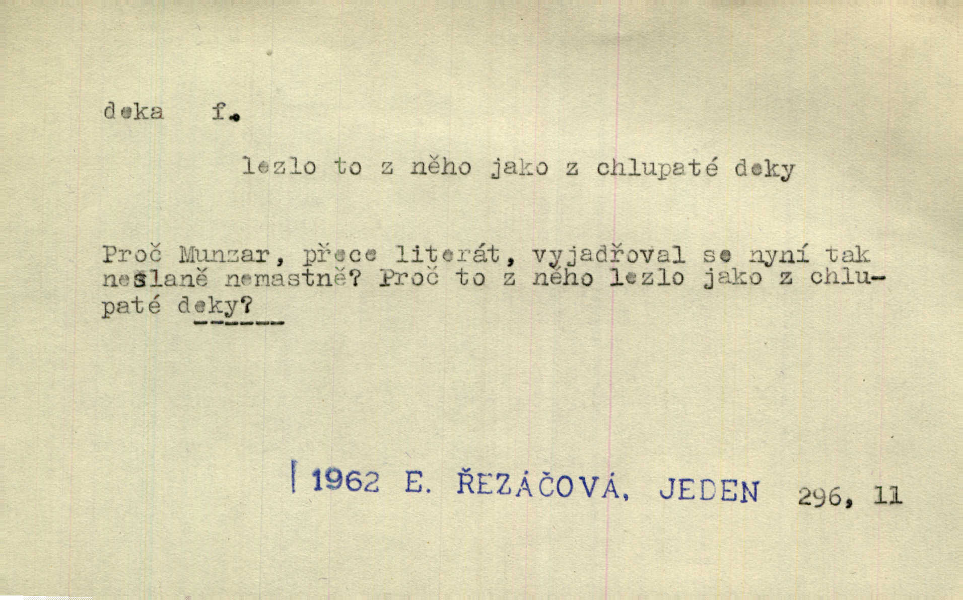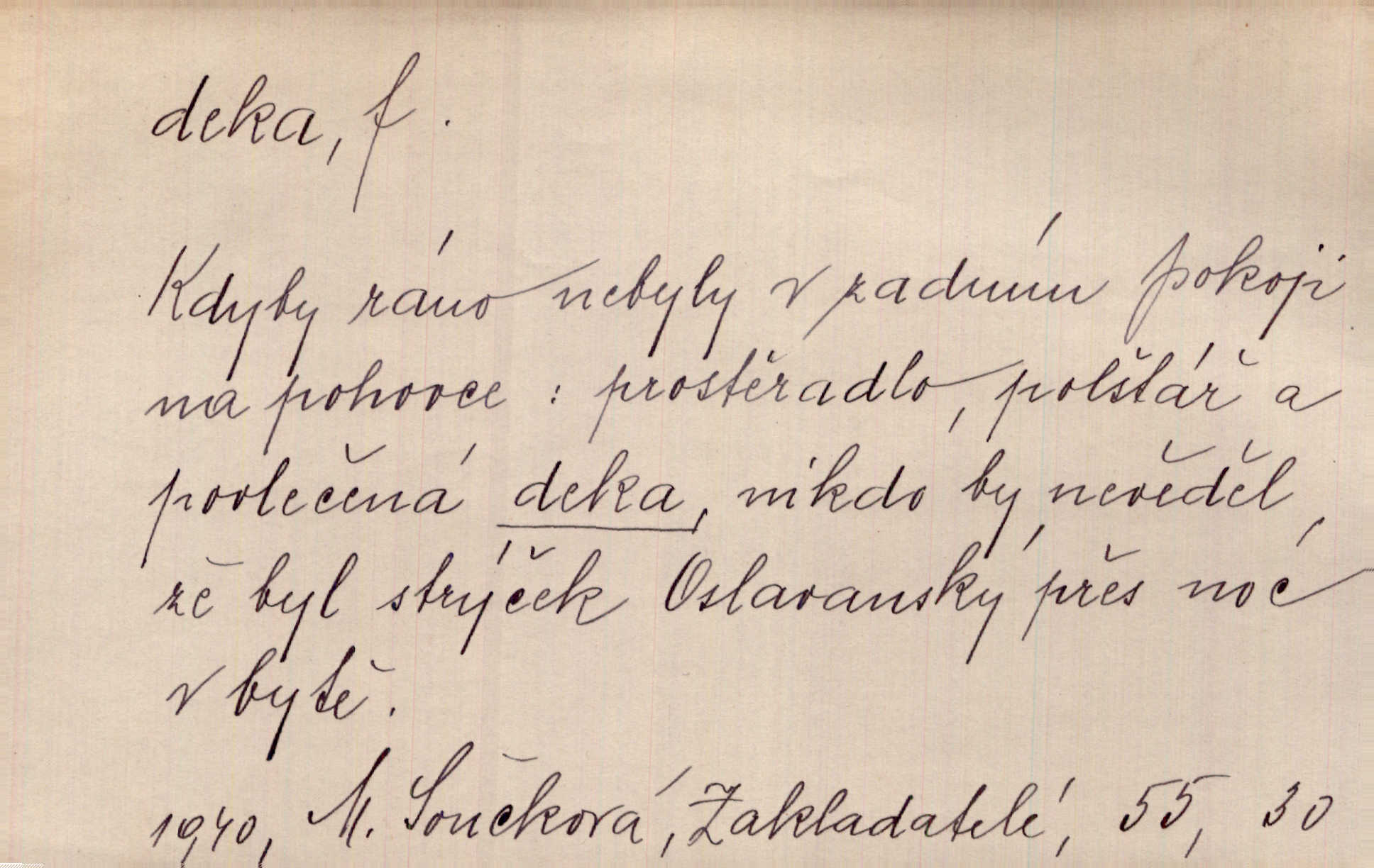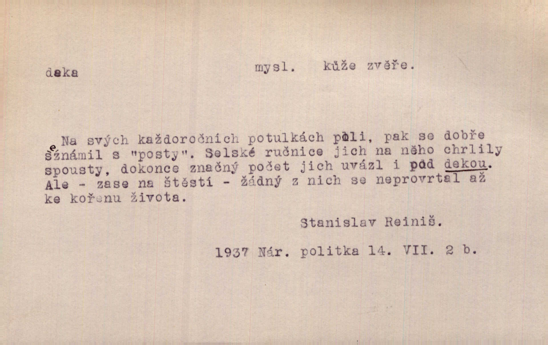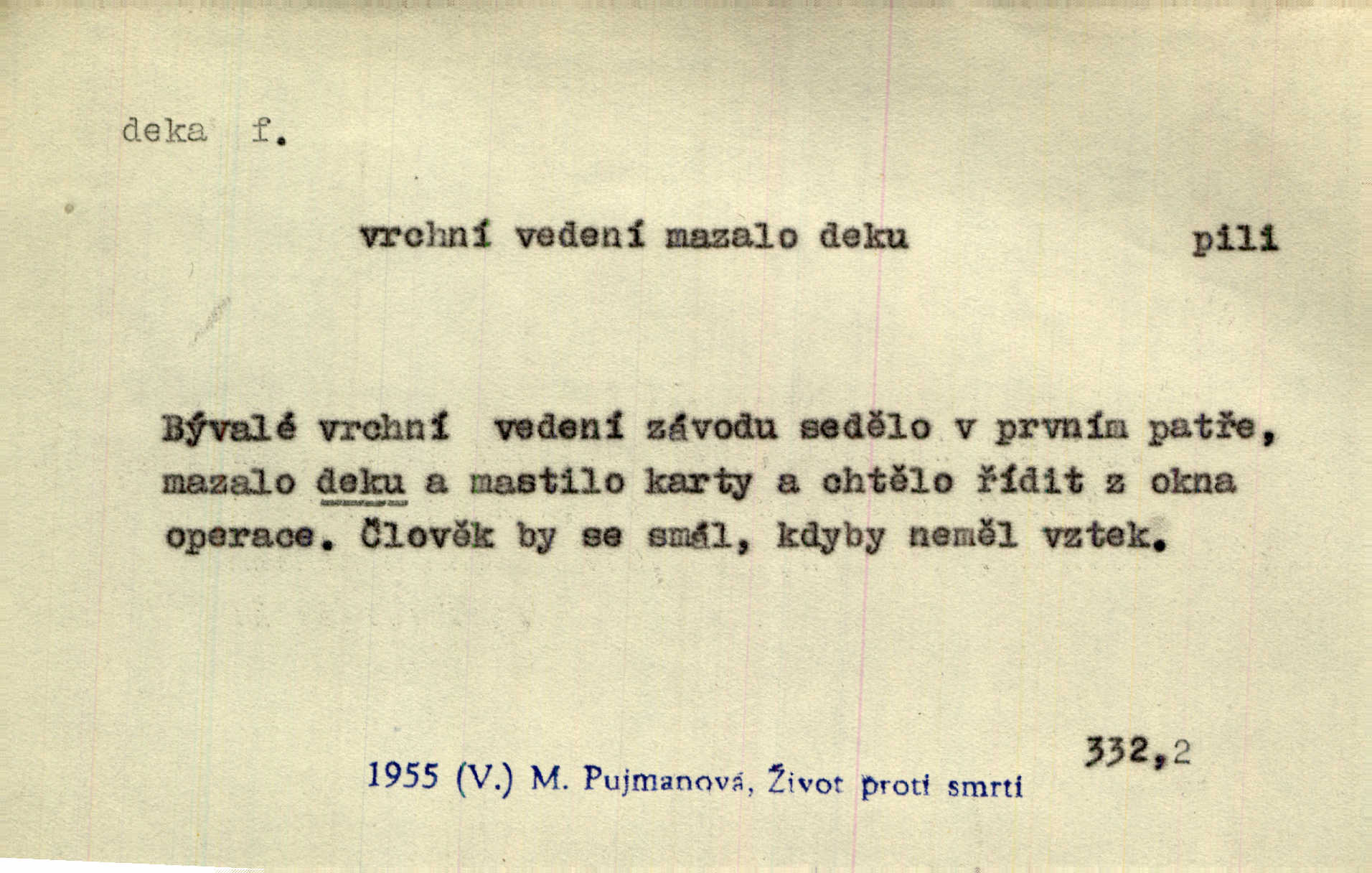 - deka, -y f. pokrývka, houně. U starostů mají ty deky [na nábytku] háčkované. Rais. Hodil starou deku na kobylu. Her. Vulg. Šli [studenti] na tah. Pravili: mazat deku hýřiti, flámovati. Nor. Vulg. To vypravování leze z vdovy jako z chlupaté deky. Poláč. Vyřídíme si [vojáci] to s tebou — deku dostaneš zabalí ho do deky a pak zmlátí. Šrám.