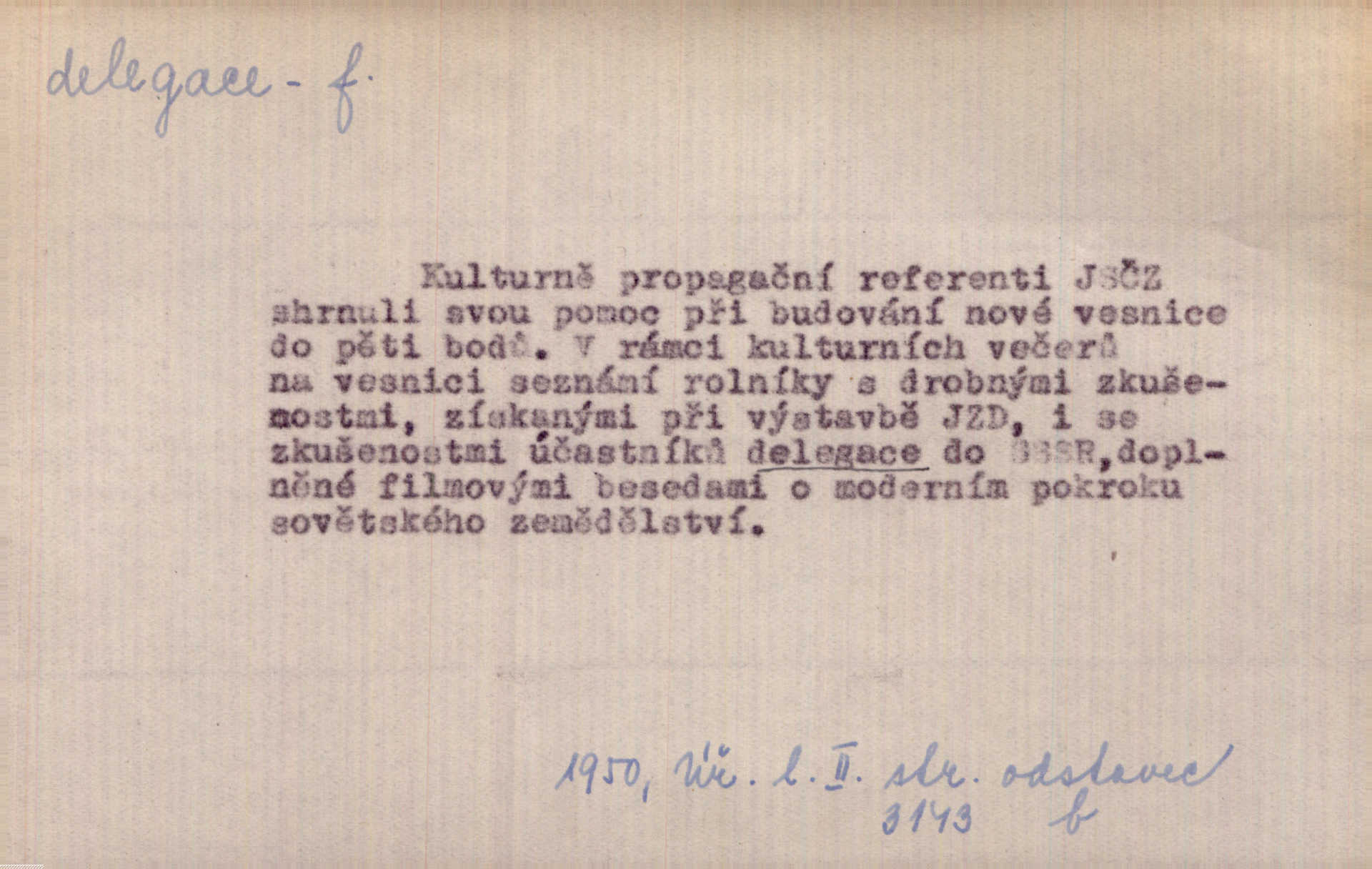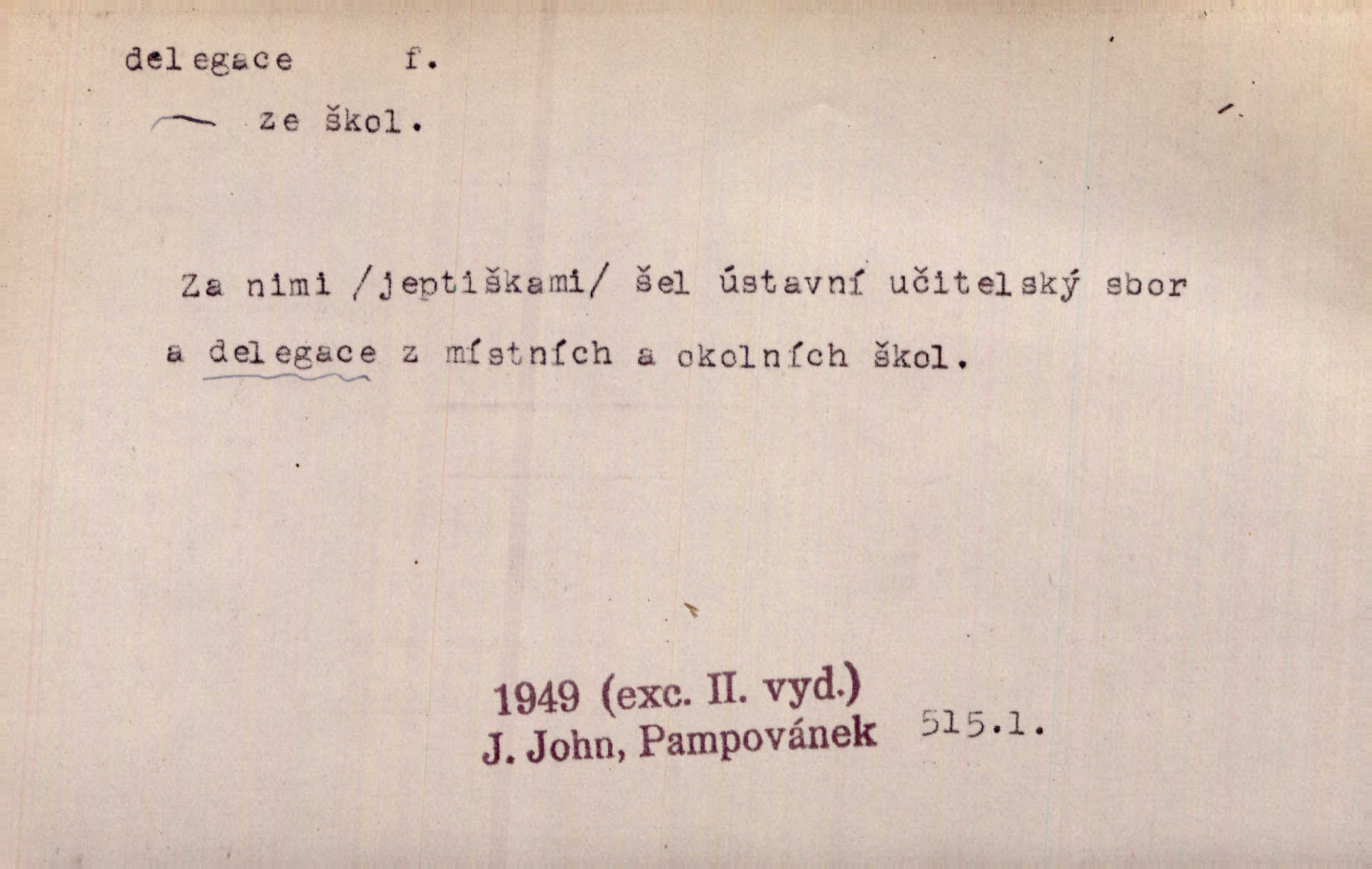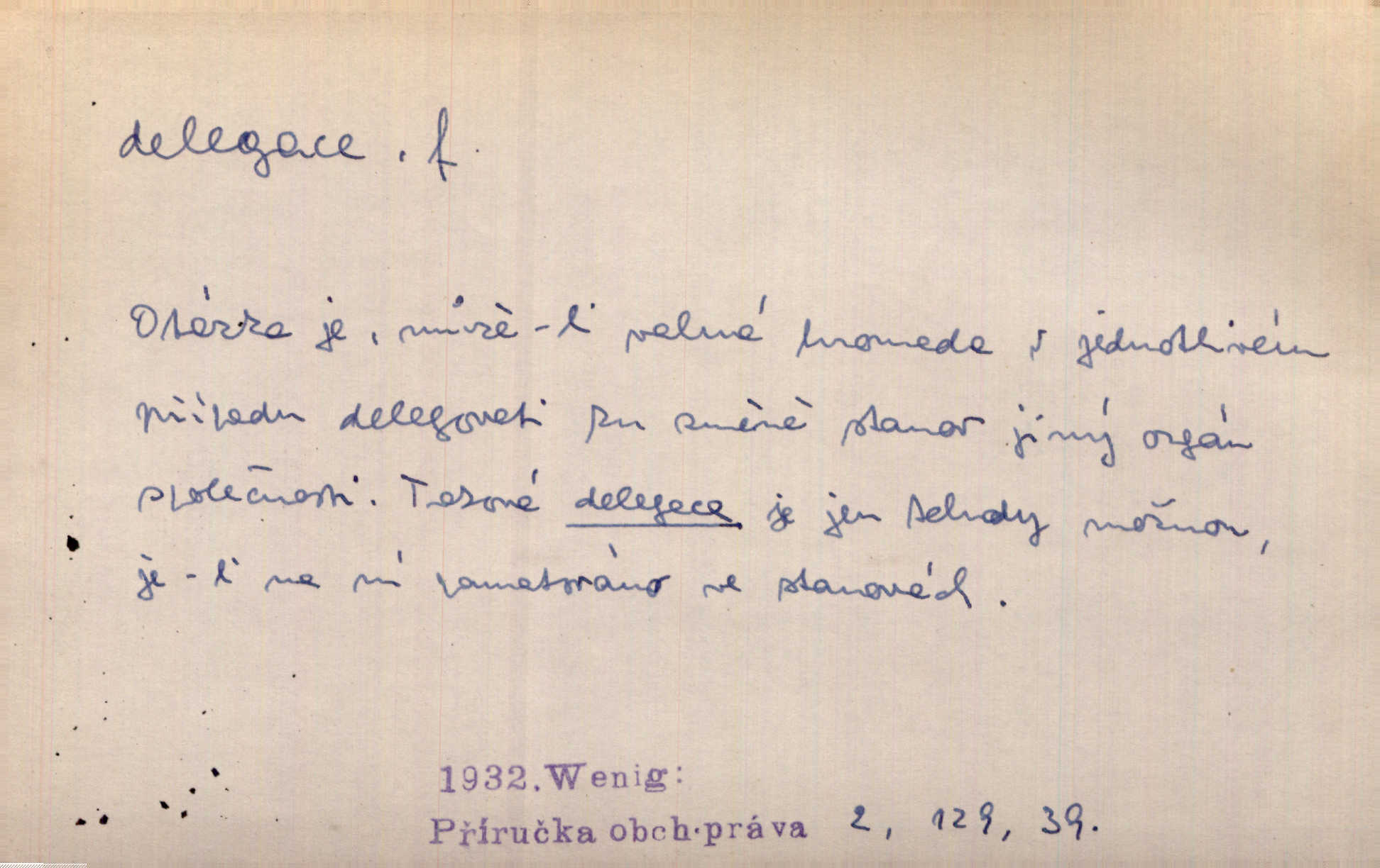 - delegace, -e f. zplnomocnění. Kompetence parlamentu plynou přímo z ústavy, nikoli z delegace jiného státního orgánu. Čes. pol. D zvolení zástupci, poselstvo. Česká delegace ve vídeňském parlamentě. Mach. Občané gubernie vilenské poslali delegaci k carovi. Krás. D společné zastupitelstvo z obou parlamentů v býv. Rakousko-Uhersku.