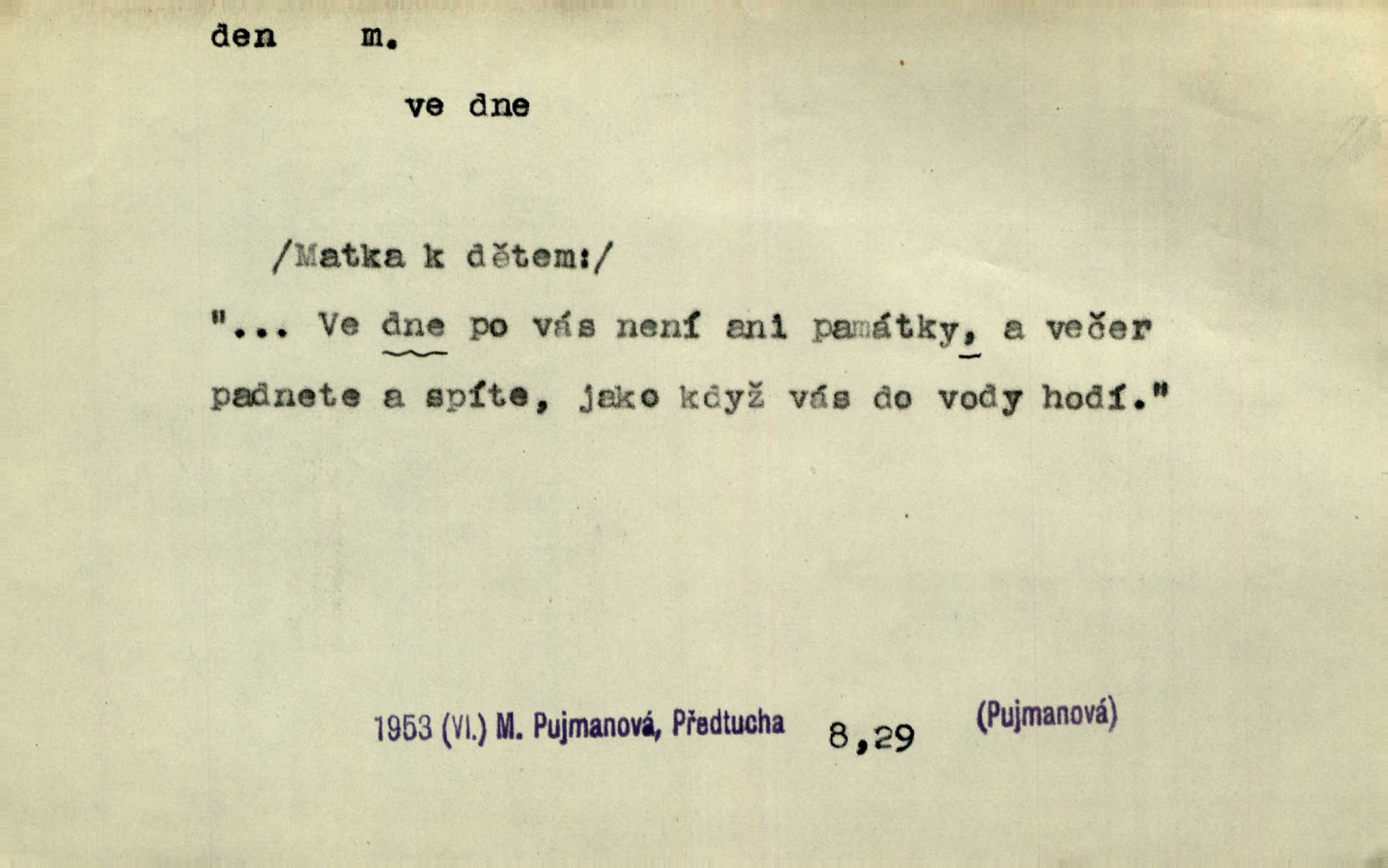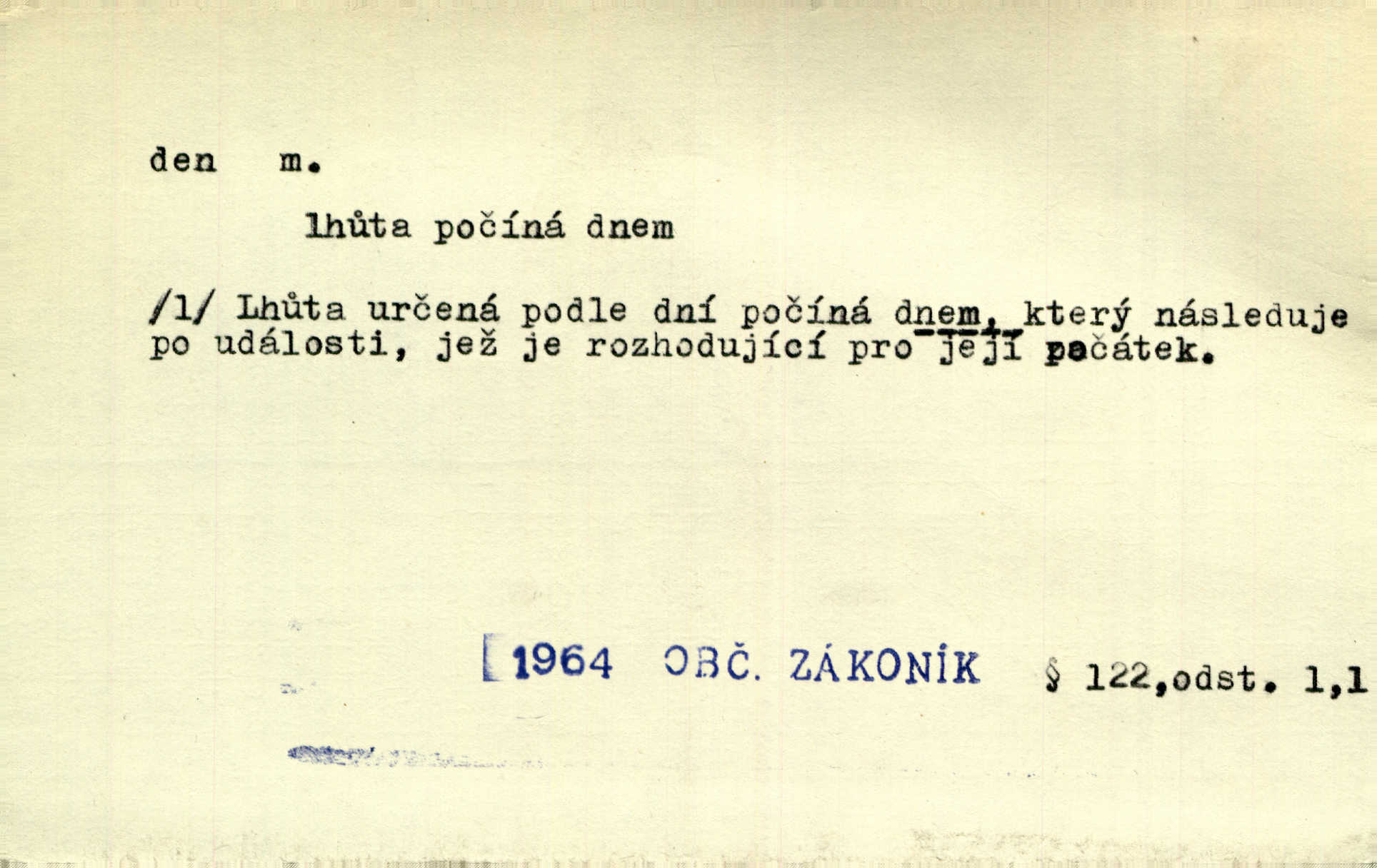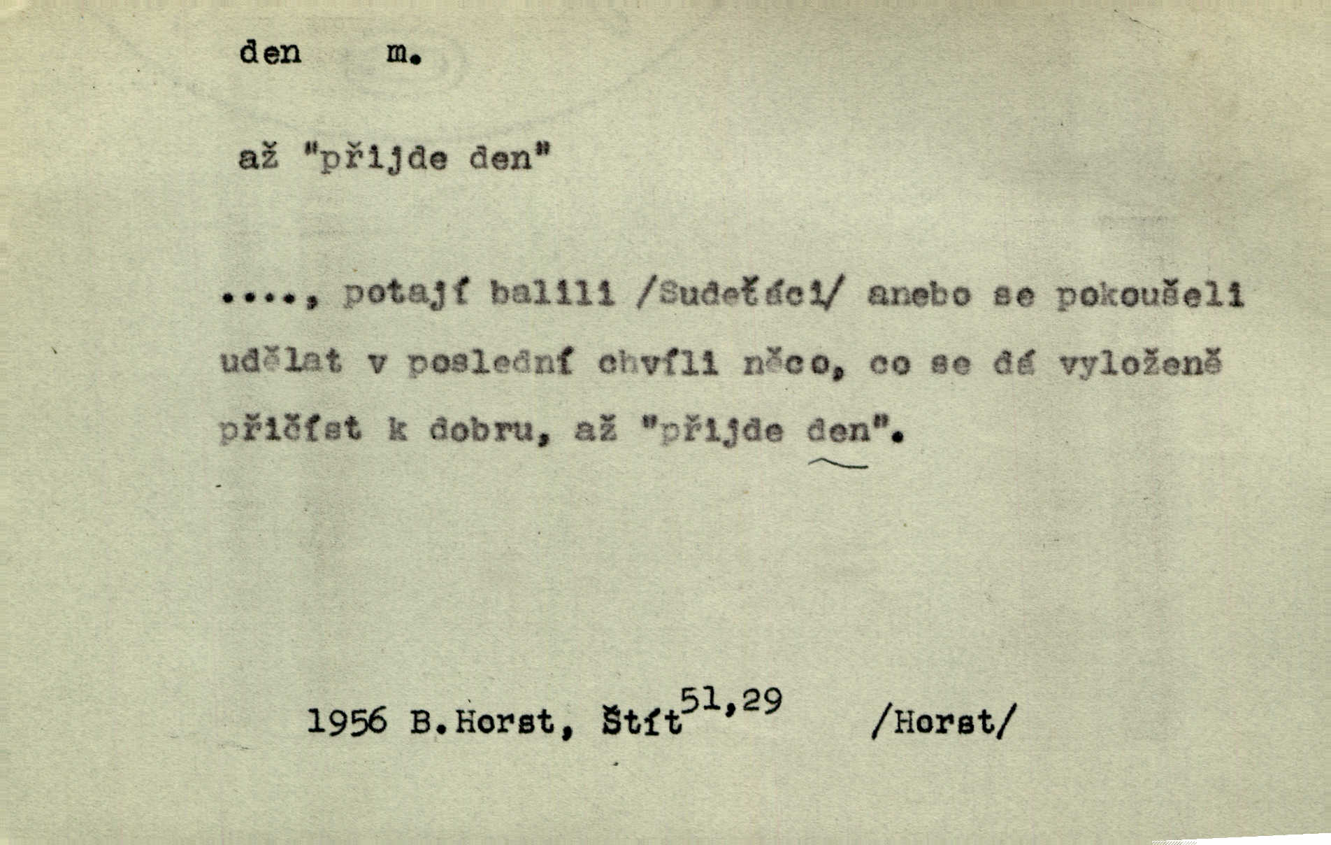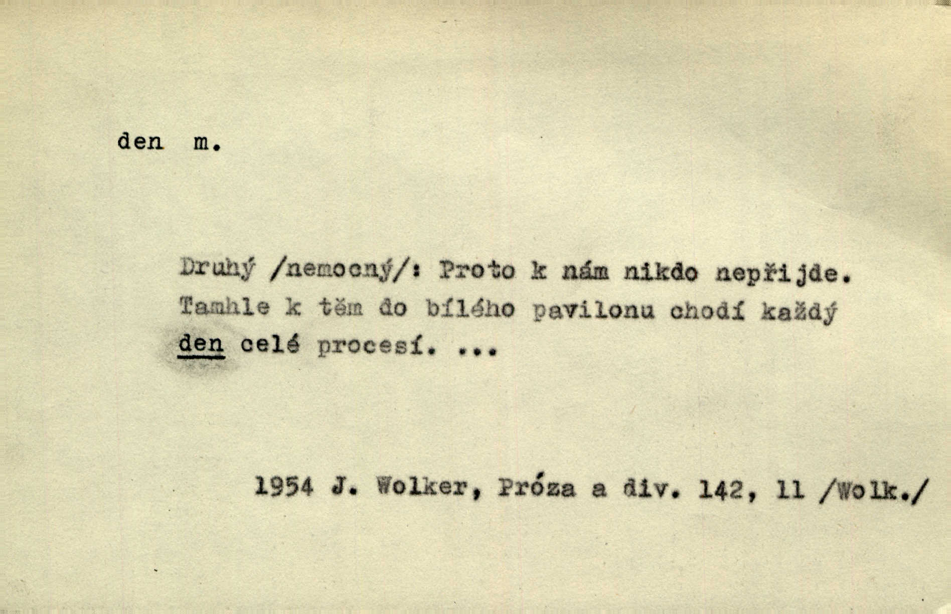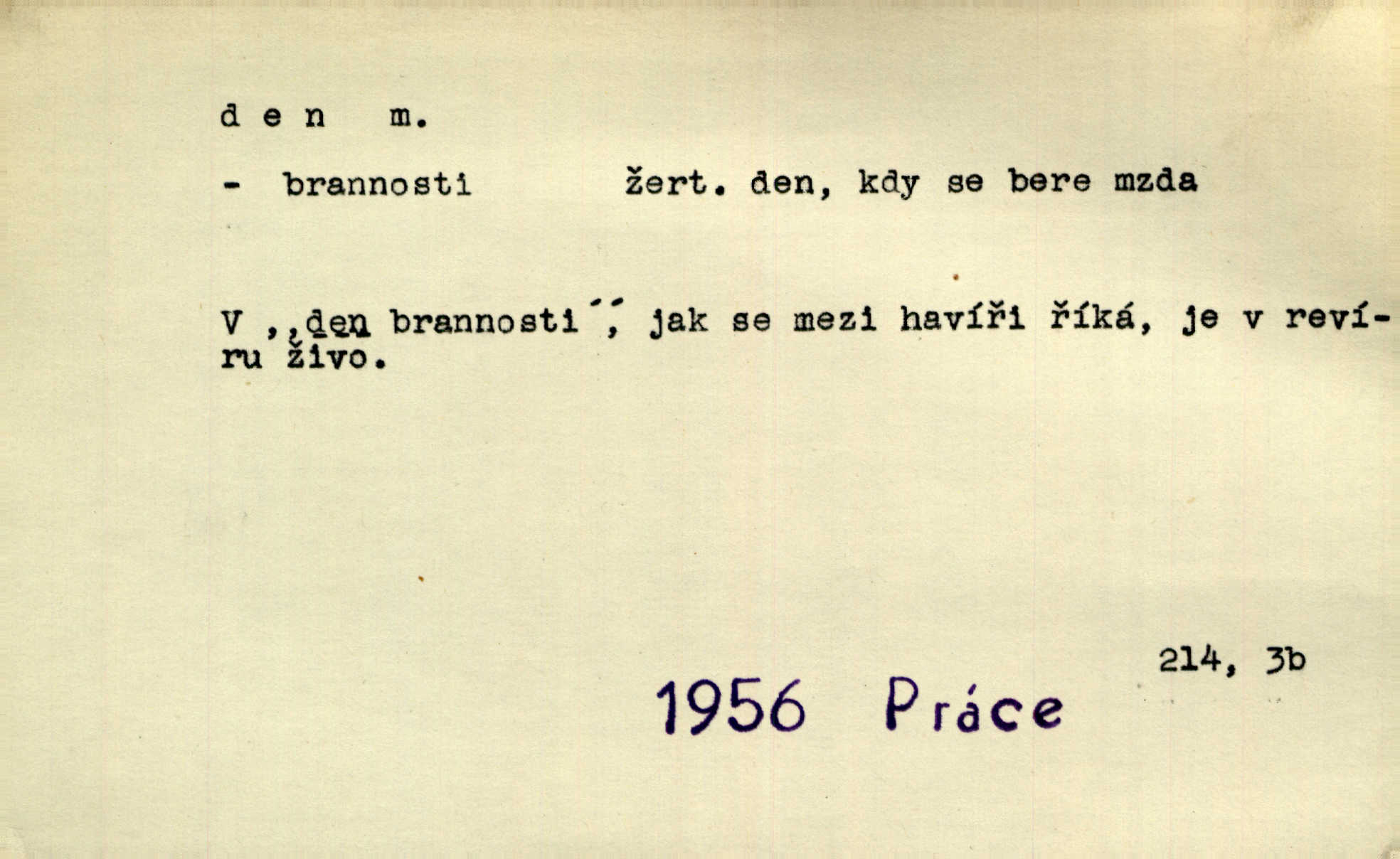 - den, dne m. (dat. lok. dni n. dnu, plur. nom. dni, dny, zř. dnové, gen. dní, dnů, ak. dni, dny) doba od východu do západu slunce; astron. doba 24 hodin. Dnem i nocí, ve dne v noci, ve dne i v noci stále. Den Páně neděle. Náb. soudný den poslední den světa. Štědrý den 24. prosince. Výroční den jubileum. Dobrovský slavil výroční den svého vstoupení v řád jezovitský. Šmil. Dobrý den! pozdrav. Dělati si, tropiti si z někoho dobrý den dobírati si koho, posmívati se komu. Míti svůj zlý den býti mrzut, rozladěn, rozhněván. Hledati včerejší den konati marnou práci. Býti na den pracovati za denní mzdu, býti nádeníkem. „Copak řve poklasný na nás — nejsme na den — máme od míry,“ zlobila se dělnice. Baar. Vulg. nejsem na den nedám si poroučet, se šikanovat. Žíti ze dne na den bez jistoty, co bude zítra. D čas, věk, život (zvl. bás.); často plur. Nač truchlit, nač se káti, dokud mladý svítí den? Šmil. Nemocnému, jehož den se sklání kams do propasti, třeba plnit přání. Klášt. Duše smířené se vším, co dává den. Klášt. Den zhas’ jim v jednom mžiku, v jednom bolu v ráj odletěly jejich duše spolu. Vrch. Jeho dny jsou sečteny je blízek smrti. Ach! nastali nám přežalostní dnové! Havl. Ideály našich dnů. Vše strádání a klopoty svých dnů on [Akiba] obětoval jedné myšlence. Vrch. D denní světlo. Jako skřivánci již přede dnem, když lidstvo ještě sklíčeno zlým snem, s červánky mladě ku nebi se nesem. Ner. Den stromů korunou se tmí a šeří. Vrch. Syn Markétky a Fausta v žaláři uzřel den narodil se. Vrch. Arch. Však se horní čeleď neopováží, aby svůj nářek z temných dolů na den pustila. Tyl. Býti, ležeti na bíle dni býti každému zřejmý.