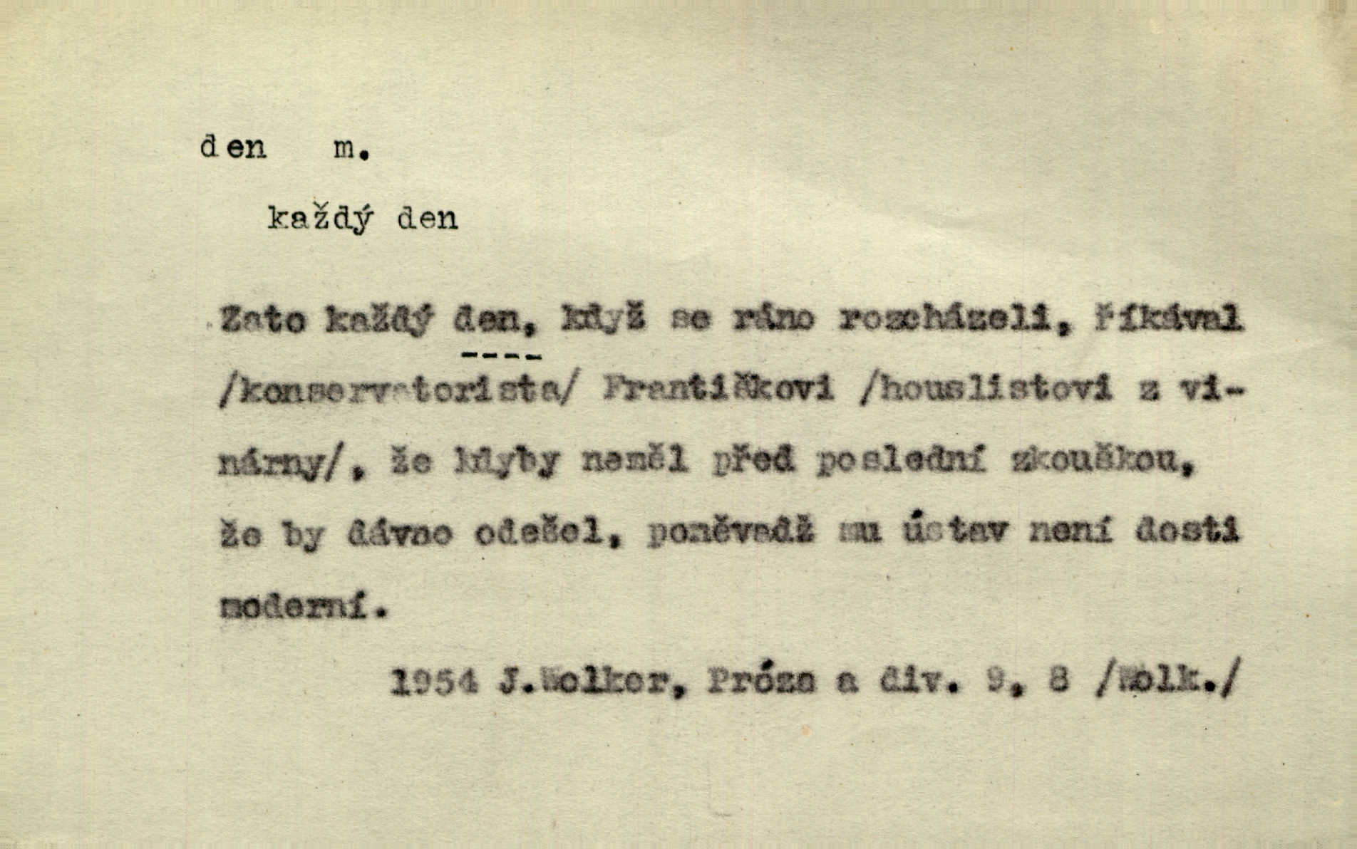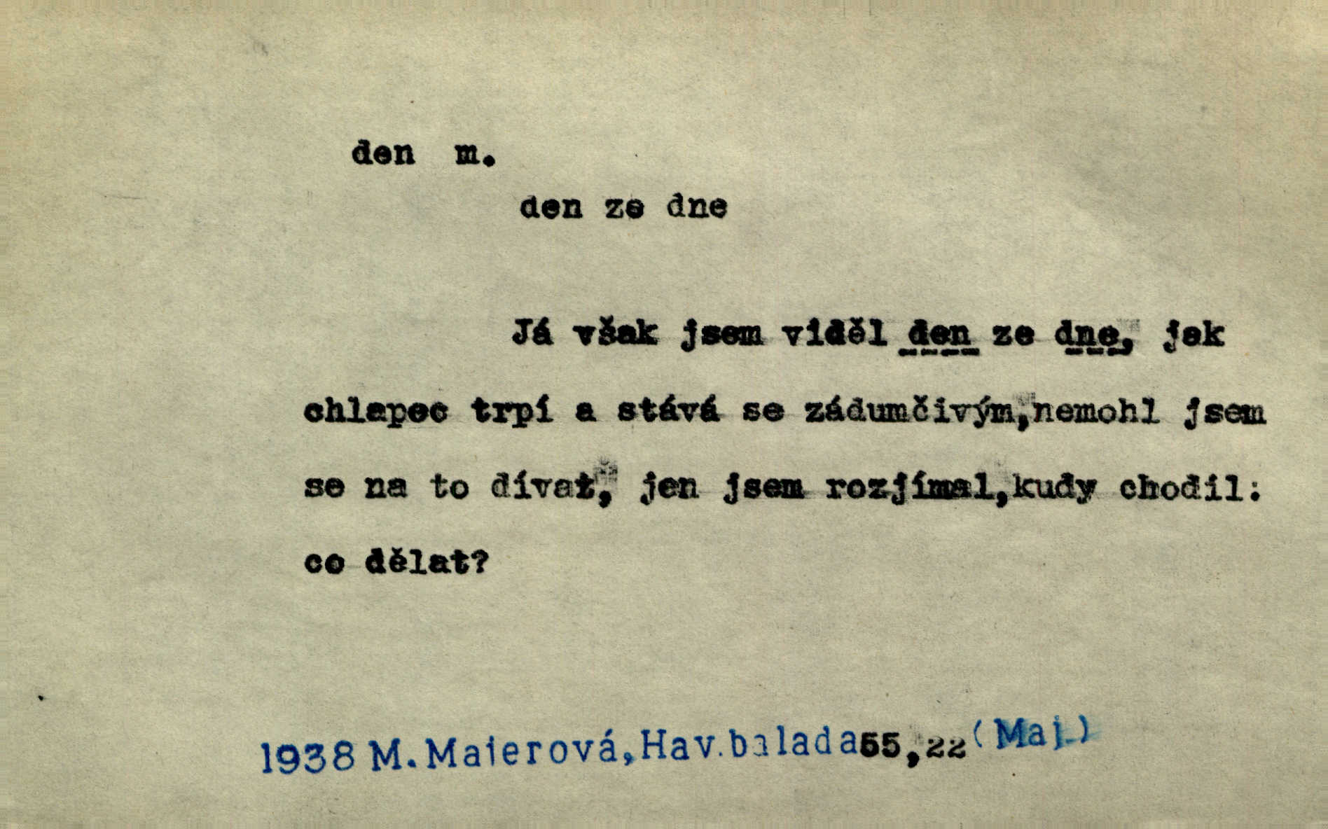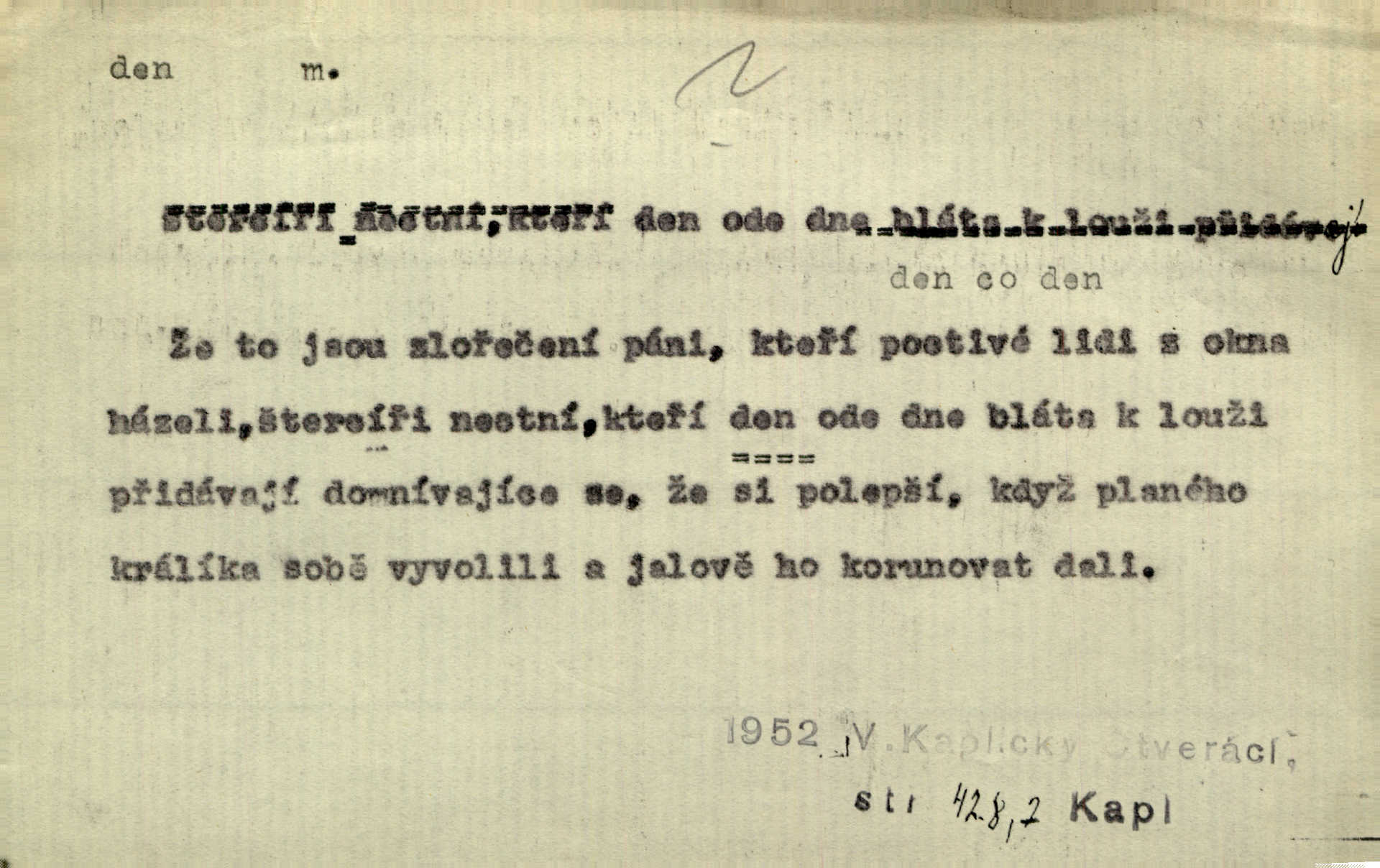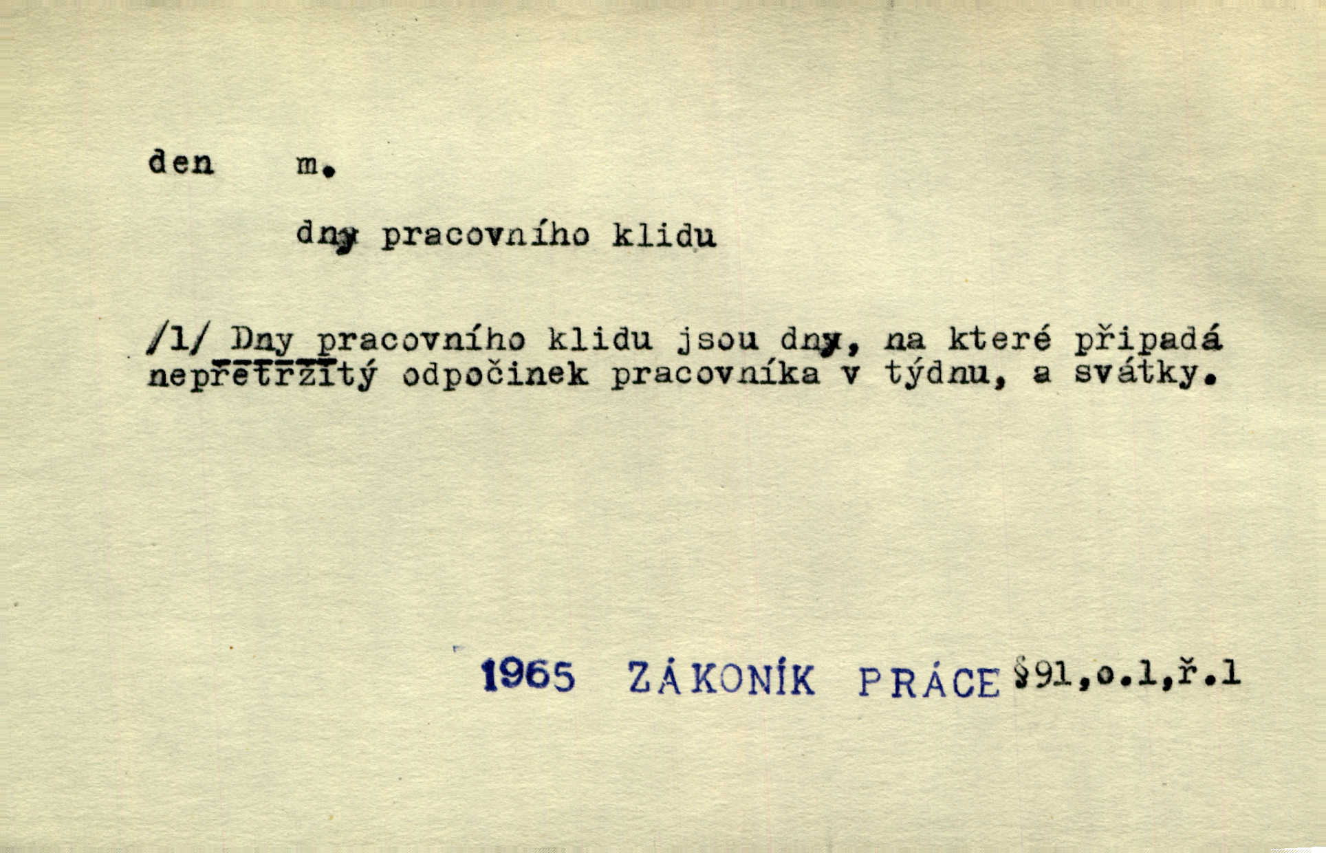- den, dne m. (dat. lok. dni n. dnu, plur. nom. dni, dny, zř. dnové, gen. dní, dnů, ak. dni, dny) doba od východu do západu slunce; astron. doba 24 hodin. Dnem i nocí, ve dne v noci, ve dne i v noci stále. Den Páně neděle. Náb. soudný den poslední den světa. Štědrý den 24. prosince. Výroční den jubileum. Dobrovský slavil výroční den svého vstoupení v řád jezovitský. Šmil. Dobrý den! pozdrav. Dělati si, tropiti si z někoho dobrý den dobírati si koho, posmívati se komu. Míti svůj zlý den býti mrzut, rozladěn, rozhněván. Hledati včerejší den konati marnou práci. Býti na den pracovati za denní mzdu, býti nádeníkem. „Copak řve poklasný na nás — nejsme na den — máme od míry,“ zlobila se dělnice. Baar. Vulg. nejsem na den nedám si poroučet, se šikanovat. Žíti ze dne na den bez jistoty, co bude zítra. D čas, věk, život (zvl. bás.); často plur. Nač truchlit, nač se káti, dokud mladý svítí den? Šmil. Nemocnému, jehož den se sklání kams do propasti, třeba plnit přání. Klášt. Duše smířené se vším, co dává den. Klášt. Den zhas’ jim v jednom mžiku, v jednom bolu v ráj odletěly jejich duše spolu. Vrch. Jeho dny jsou sečteny je blízek smrti. Ach! nastali nám přežalostní dnové! Havl. Ideály našich dnů. Vše strádání a klopoty svých dnů on [Akiba] obětoval jedné myšlence. Vrch. D denní světlo. Jako skřivánci již přede dnem, když lidstvo ještě sklíčeno zlým snem, s červánky mladě ku nebi se nesem. Ner. Den stromů korunou se tmí a šeří. Vrch. Syn Markétky a Fausta v žaláři uzřel den narodil se. Vrch. Arch. Však se horní čeleď neopováží, aby svůj nářek z temných dolů na den pustila. Tyl. Býti, ležeti na bíle dni býti každému zřejmý.