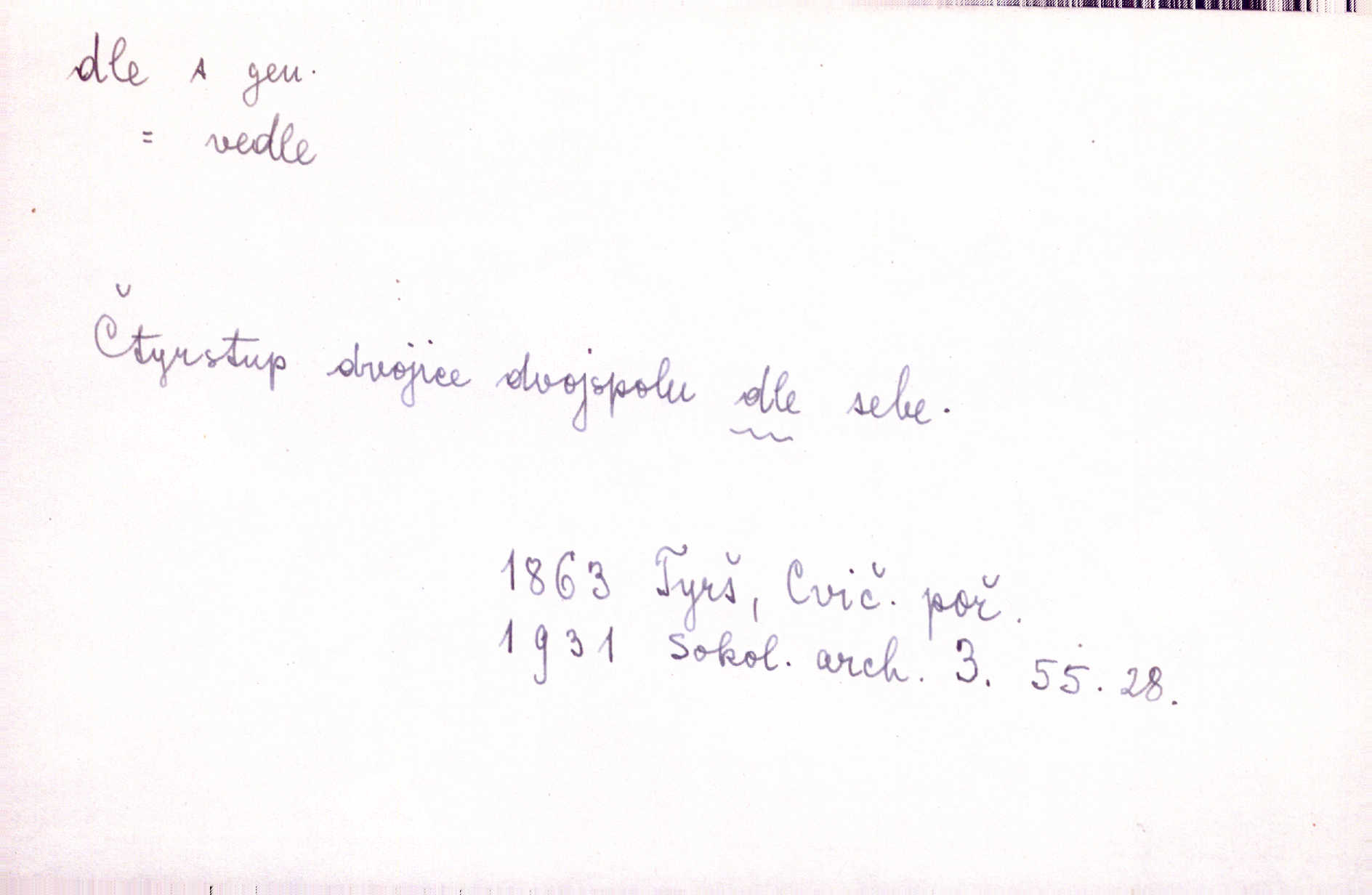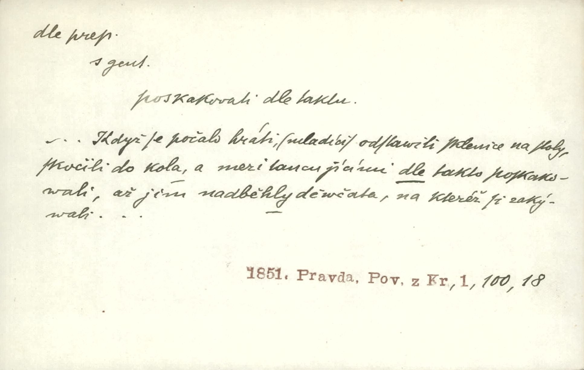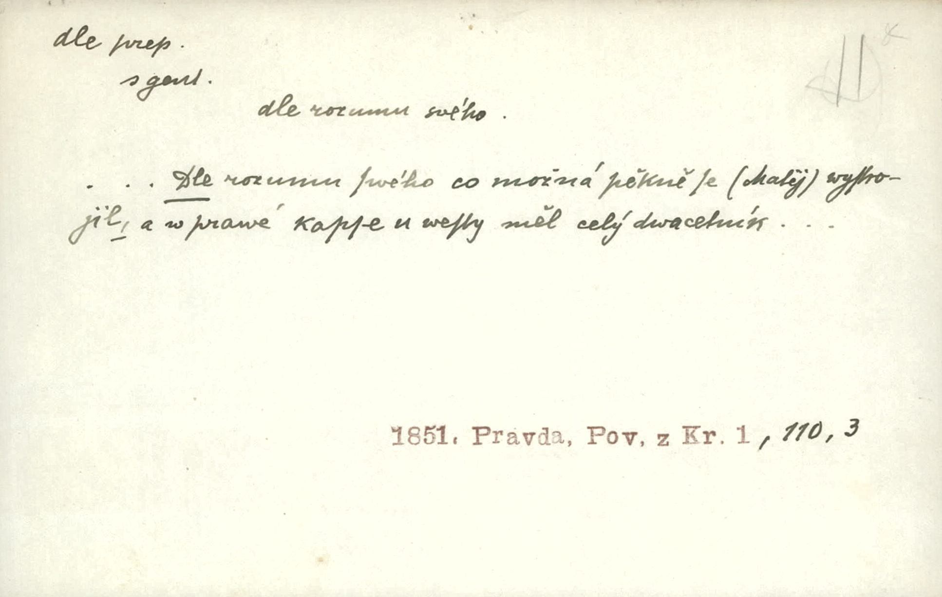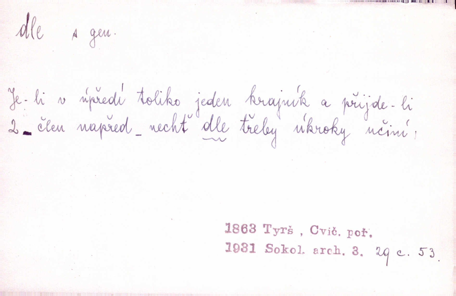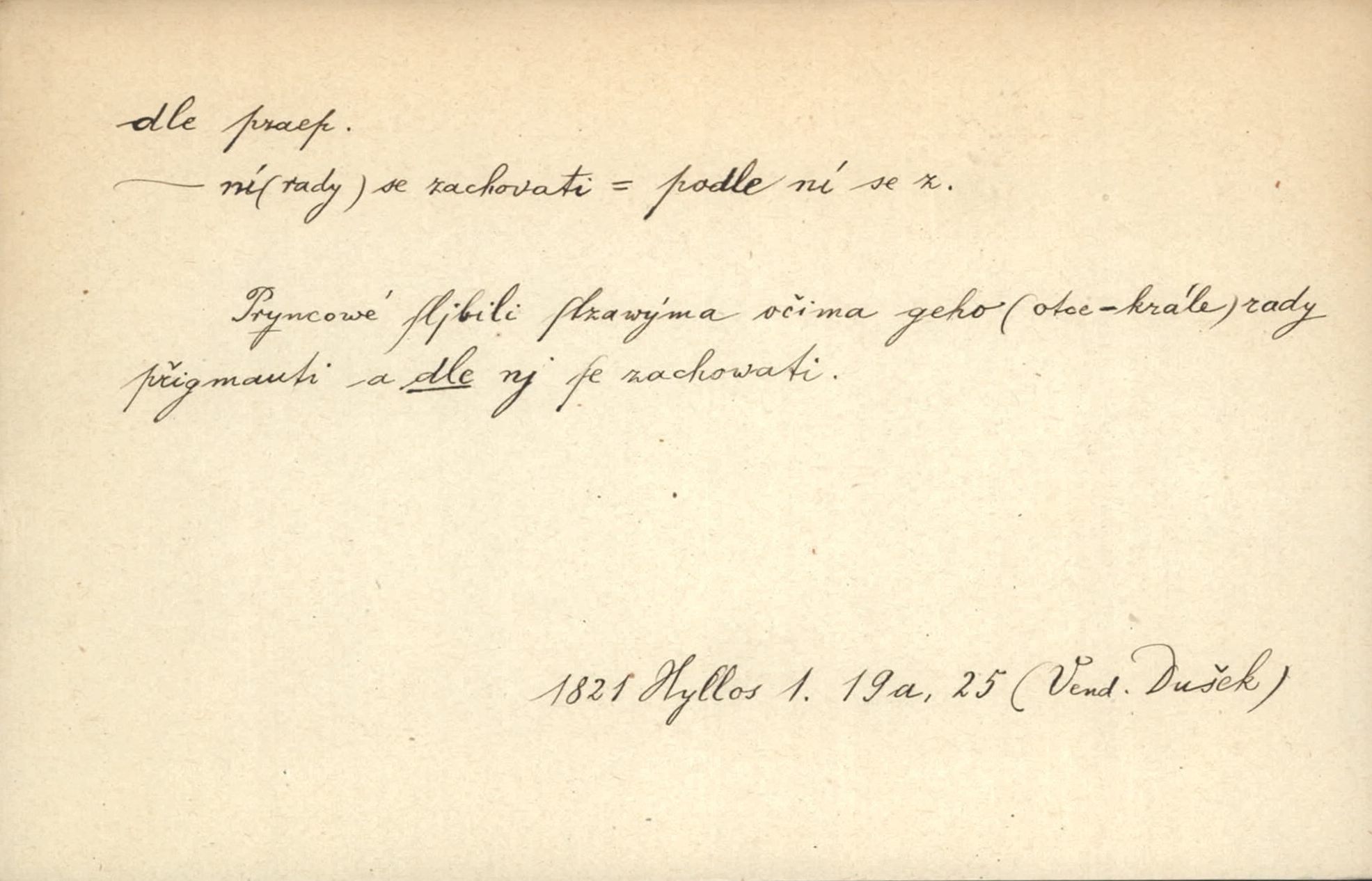 - dle předl. s gen. podle; značí přiměřenost, souhlas, shodu. Svůj k svému a vždy dle pravdy! Pal. Staniž se dle tvých slov! Zey. Na voze seděla asi třicetiletá, pěkná paní, dle obleku Polka. Jir. Tomu bych dle všeho věřil soudě podle všech okolností. Rais. D Bás. místo vedle, podle značí místní blízkost. Loutny, lyry, harfy si hověly zde v pýše královské dle pastýřského rohu starých bardů. Vrch. S příč i déli ve vůz ten kůň dle koně zapřažen. Quis.
