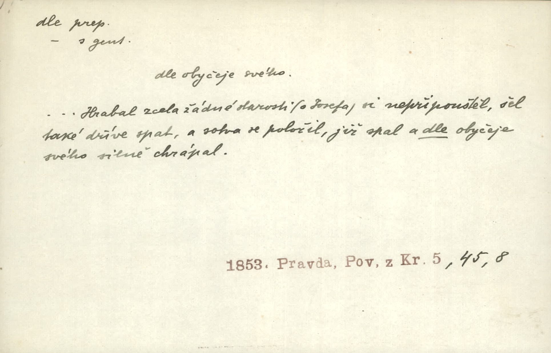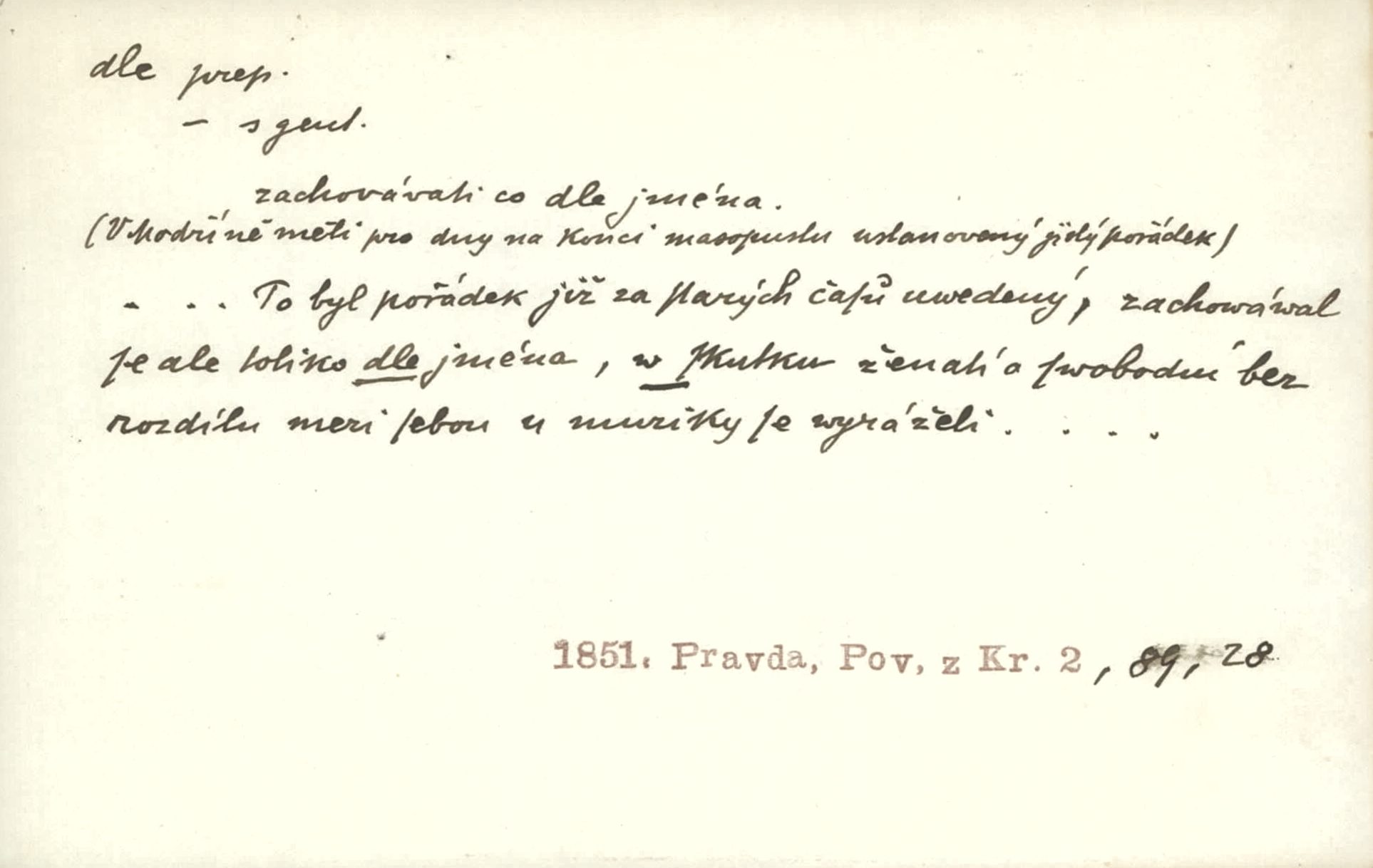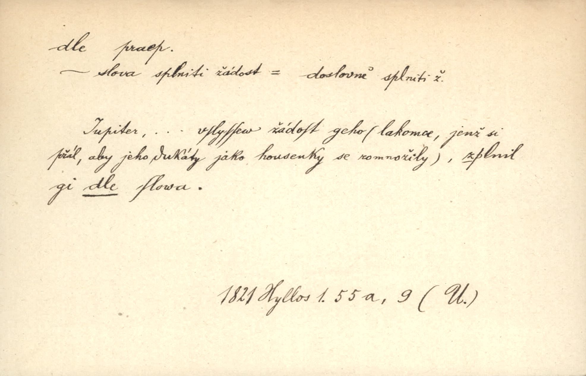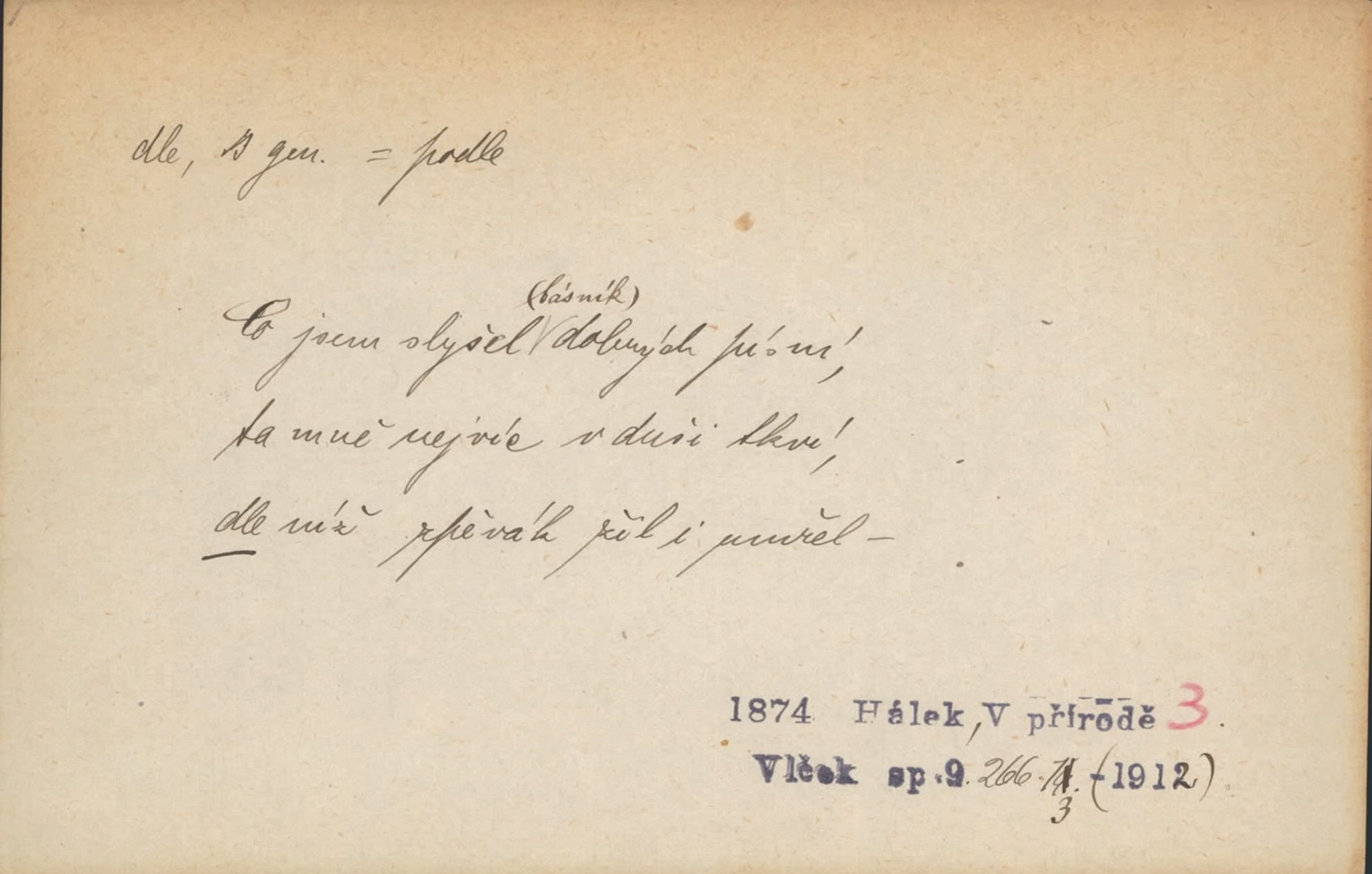 - dle předl. s gen. podle; značí přiměřenost, souhlas, shodu. Svůj k svému a vždy dle pravdy! Pal. Staniž se dle tvých slov! Zey. Na voze seděla asi třicetiletá, pěkná paní, dle obleku Polka. Jir. Tomu bych dle všeho věřil soudě podle všech okolností. Rais. D Bás. místo vedle, podle značí místní blízkost. Loutny, lyry, harfy si hověly zde v pýše královské dle pastýřského rohu starých bardů. Vrch. S příč i déli ve vůz ten kůň dle koně zapřažen. Quis.