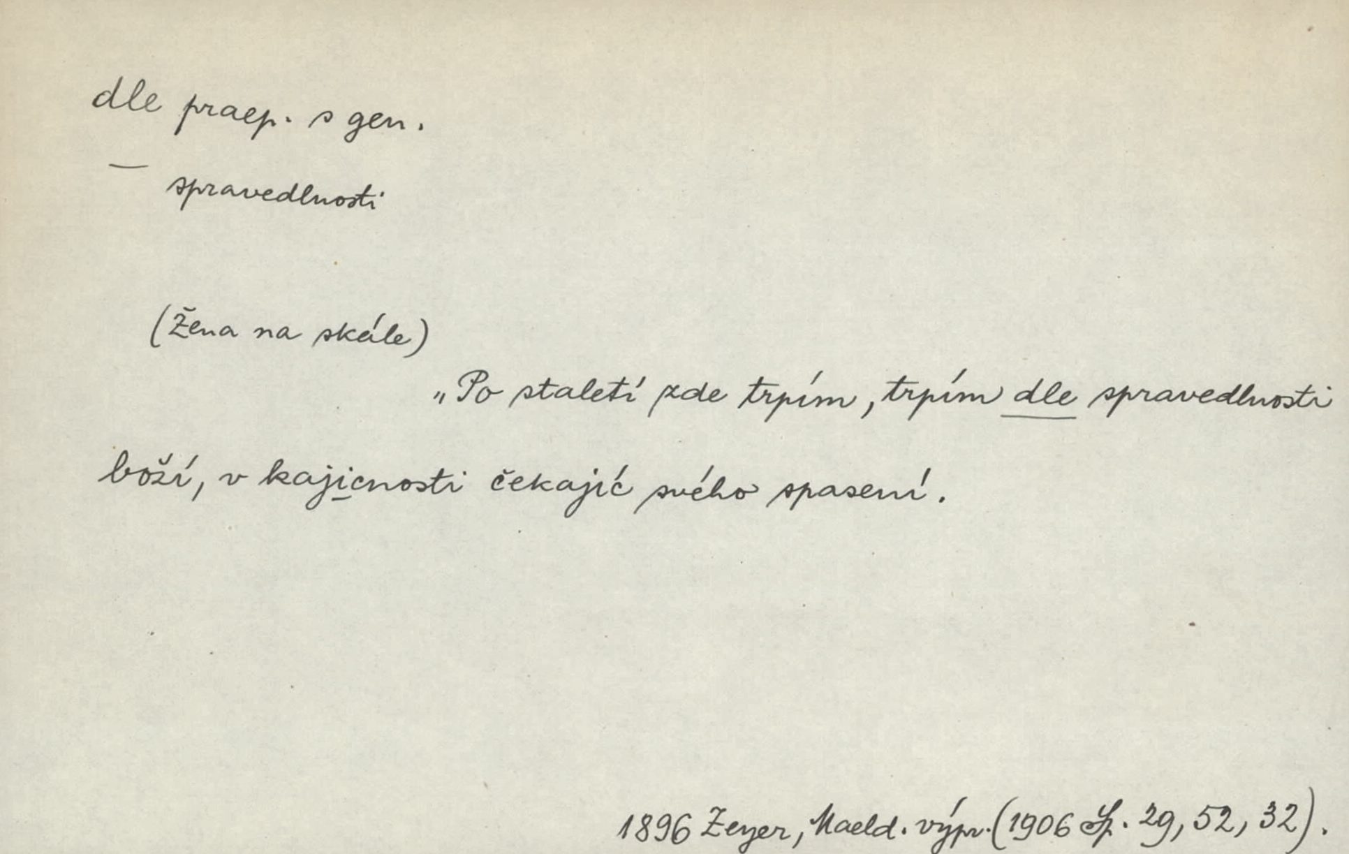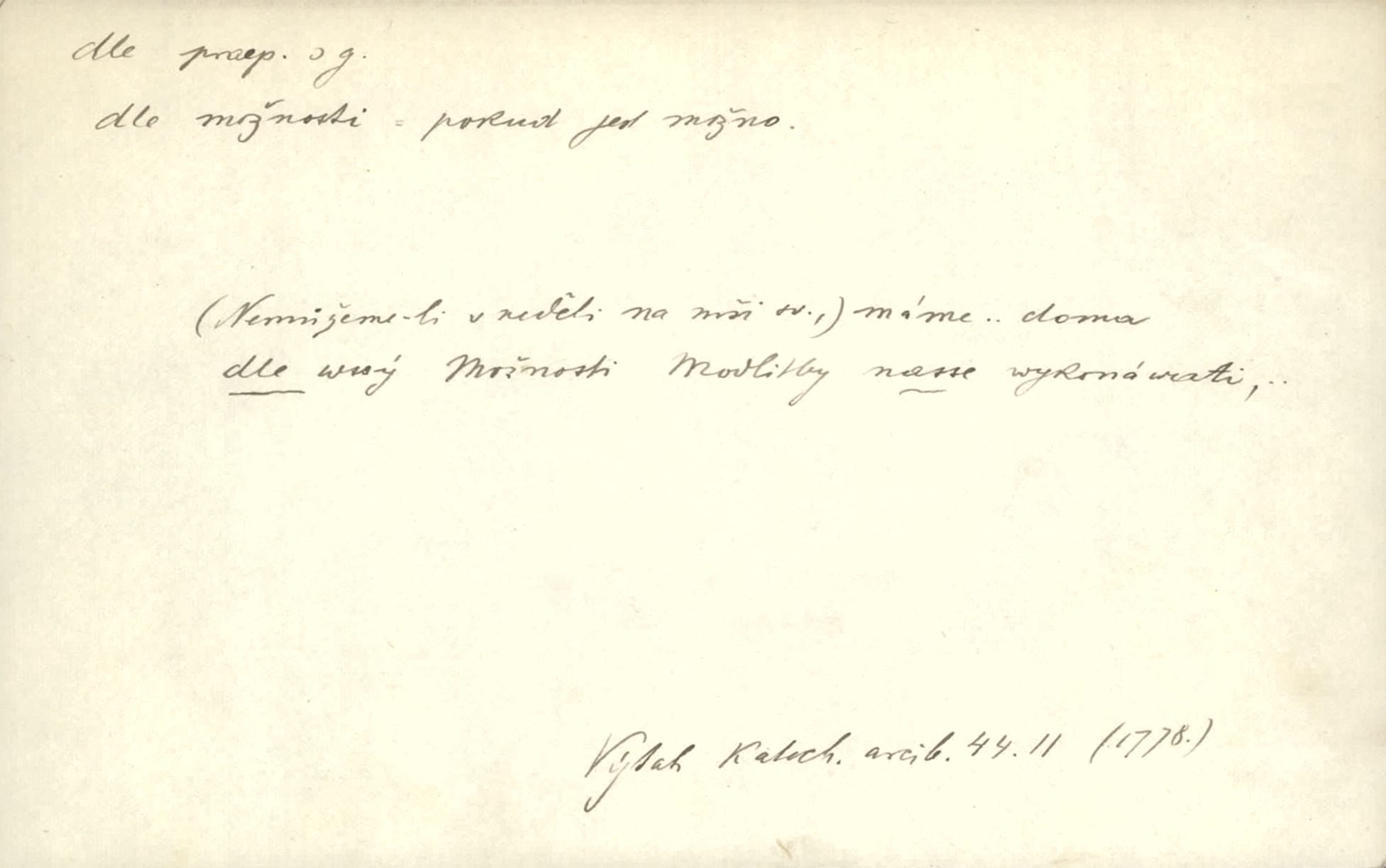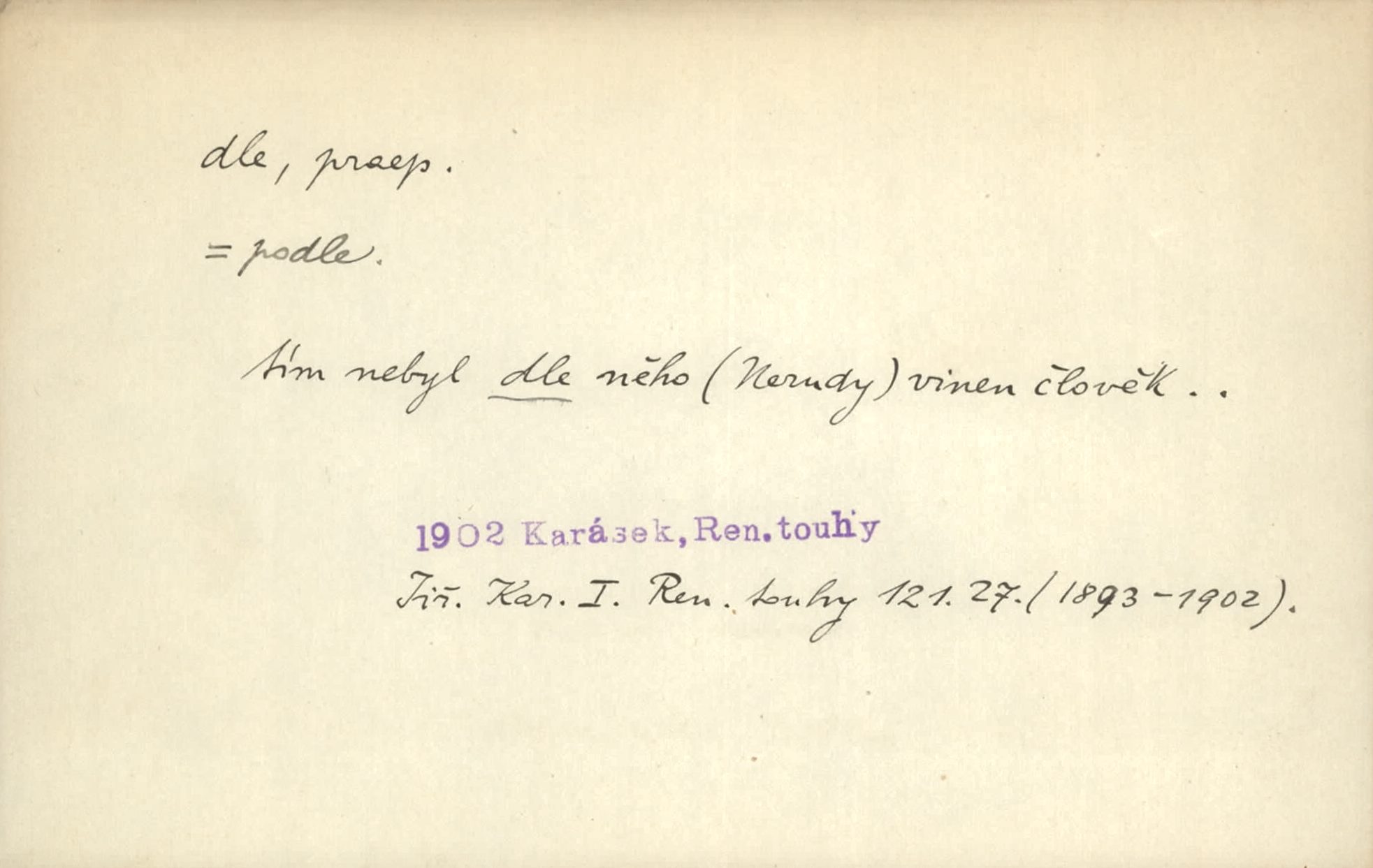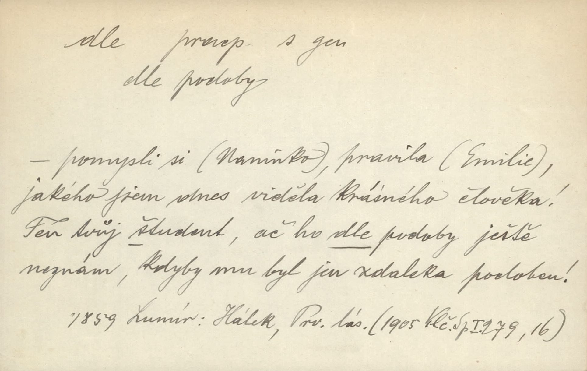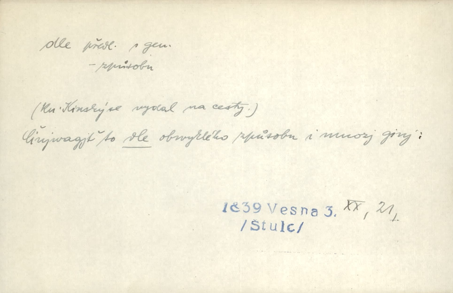 - dle předl. s gen. podle; značí přiměřenost, souhlas, shodu. Svůj k svému a vždy dle pravdy! Pal. Staniž se dle tvých slov! Zey. Na voze seděla asi třicetiletá, pěkná paní, dle obleku Polka. Jir. Tomu bych dle všeho věřil soudě podle všech okolností. Rais. D Bás. místo vedle, podle značí místní blízkost. Loutny, lyry, harfy si hověly zde v pýše královské dle pastýřského rohu starých bardů. Vrch. S příč i déli ve vůz ten kůň dle koně zapřažen. Quis.