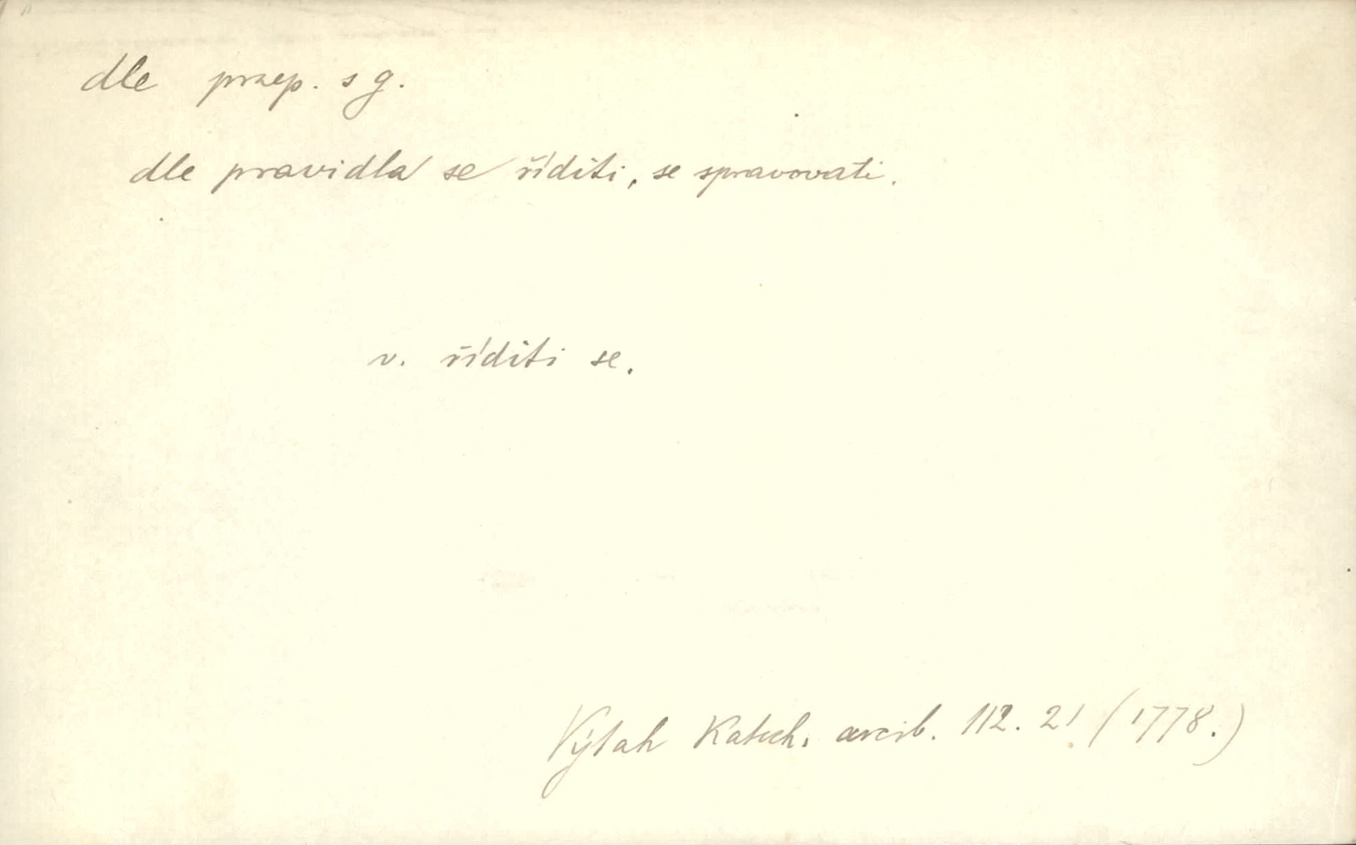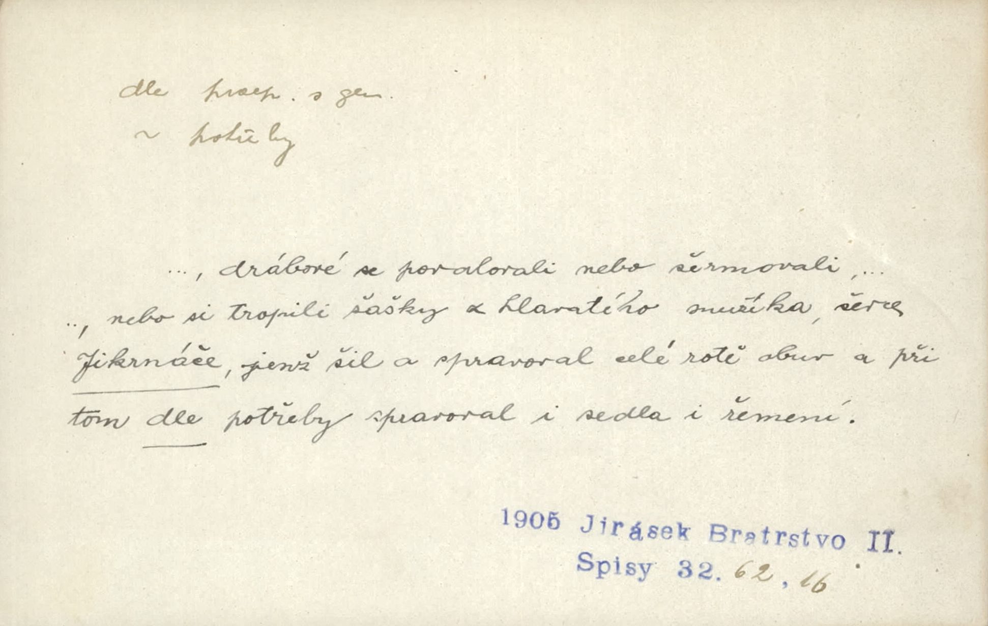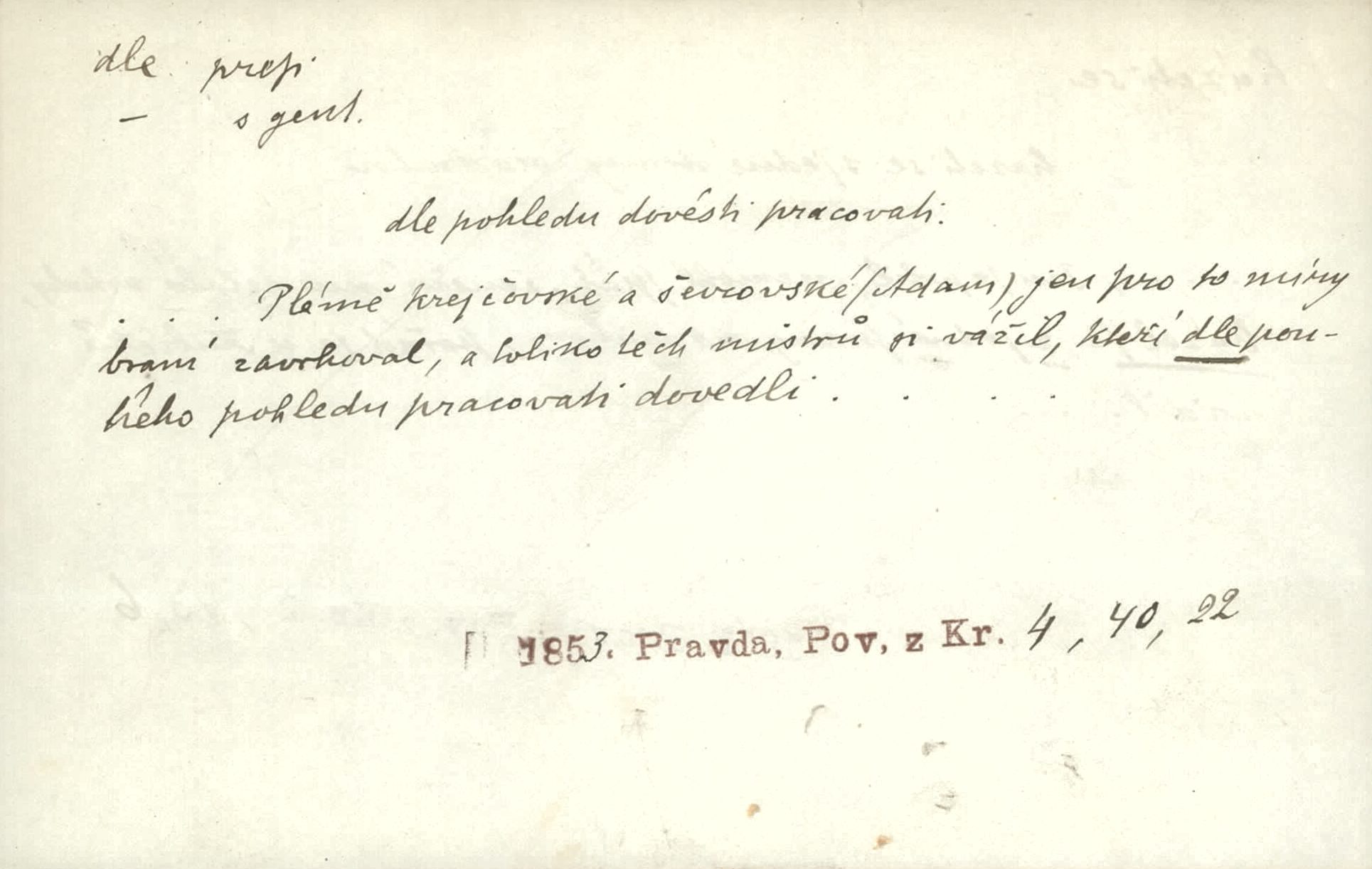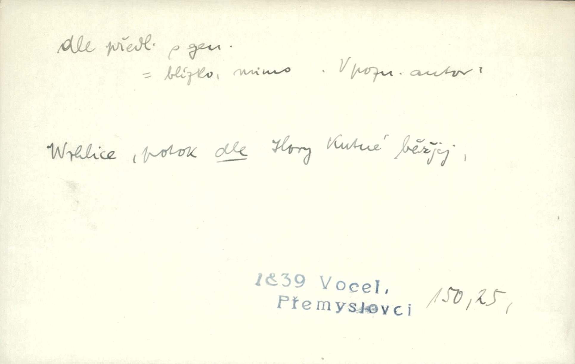 - dle předl. s gen. podle; značí přiměřenost, souhlas, shodu. Svůj k svému a vždy dle pravdy! Pal. Staniž se dle tvých slov! Zey. Na voze seděla asi třicetiletá, pěkná paní, dle obleku Polka. Jir. Tomu bych dle všeho věřil soudě podle všech okolností. Rais. D Bás. místo vedle, podle značí místní blízkost. Loutny, lyry, harfy si hověly zde v pýše královské dle pastýřského rohu starých bardů. Vrch. S příč i déli ve vůz ten kůň dle koně zapřažen. Quis.
