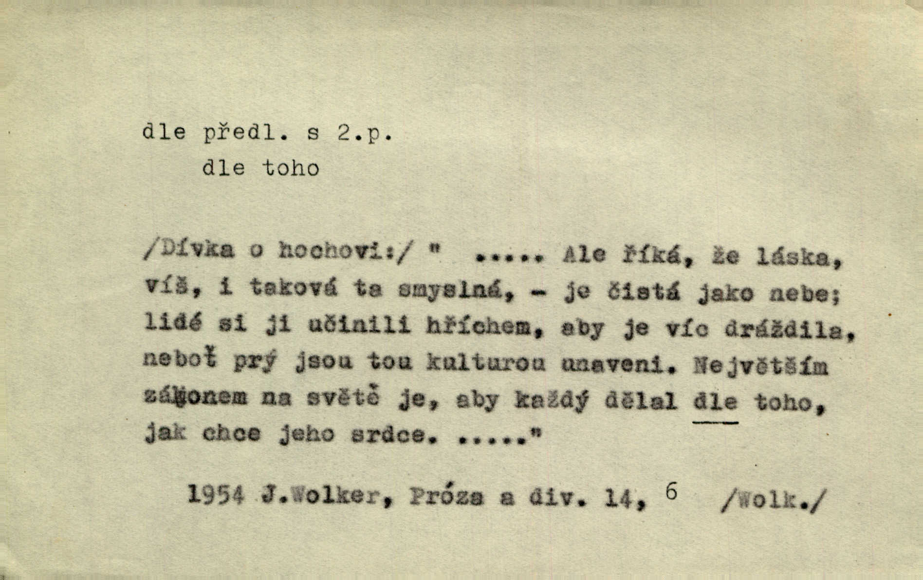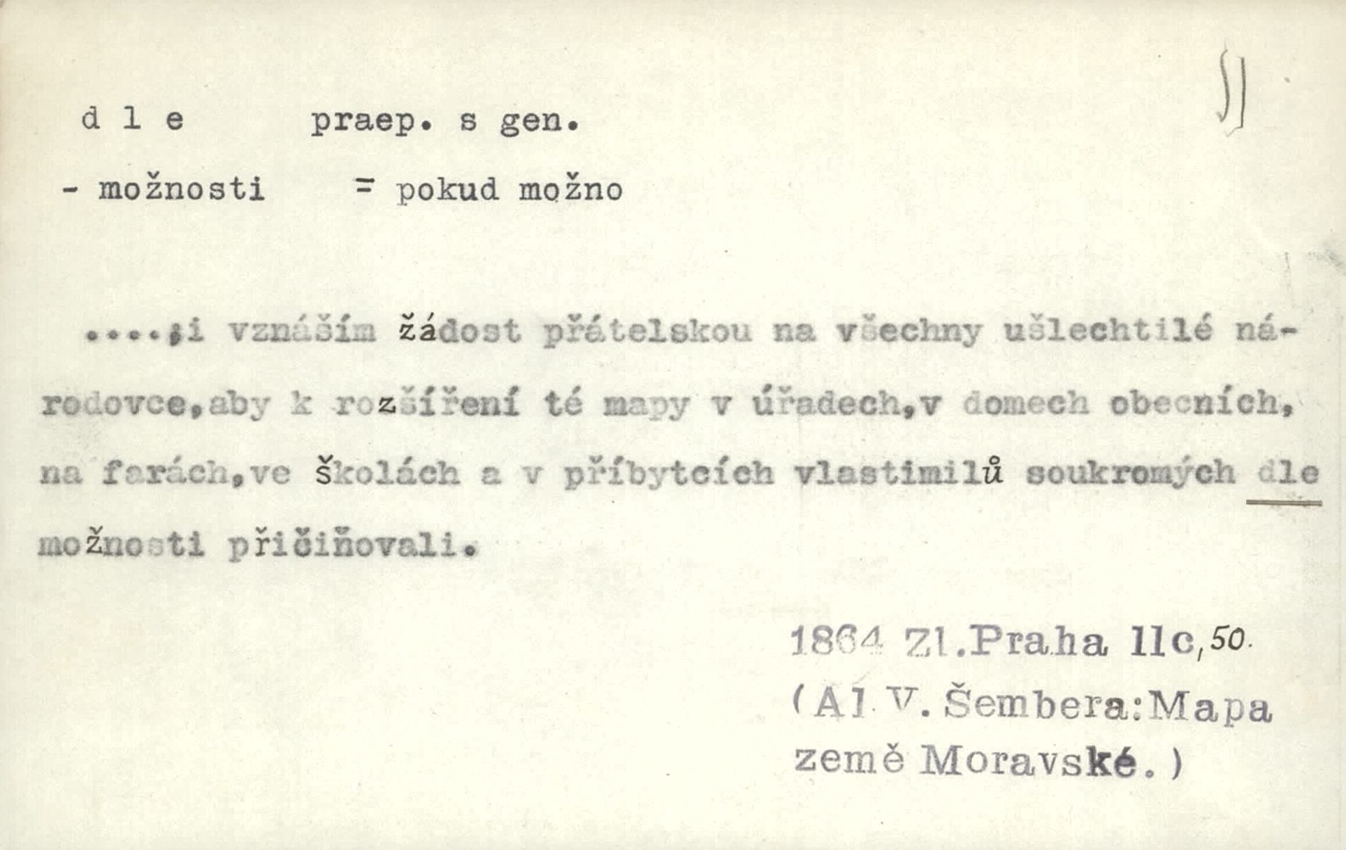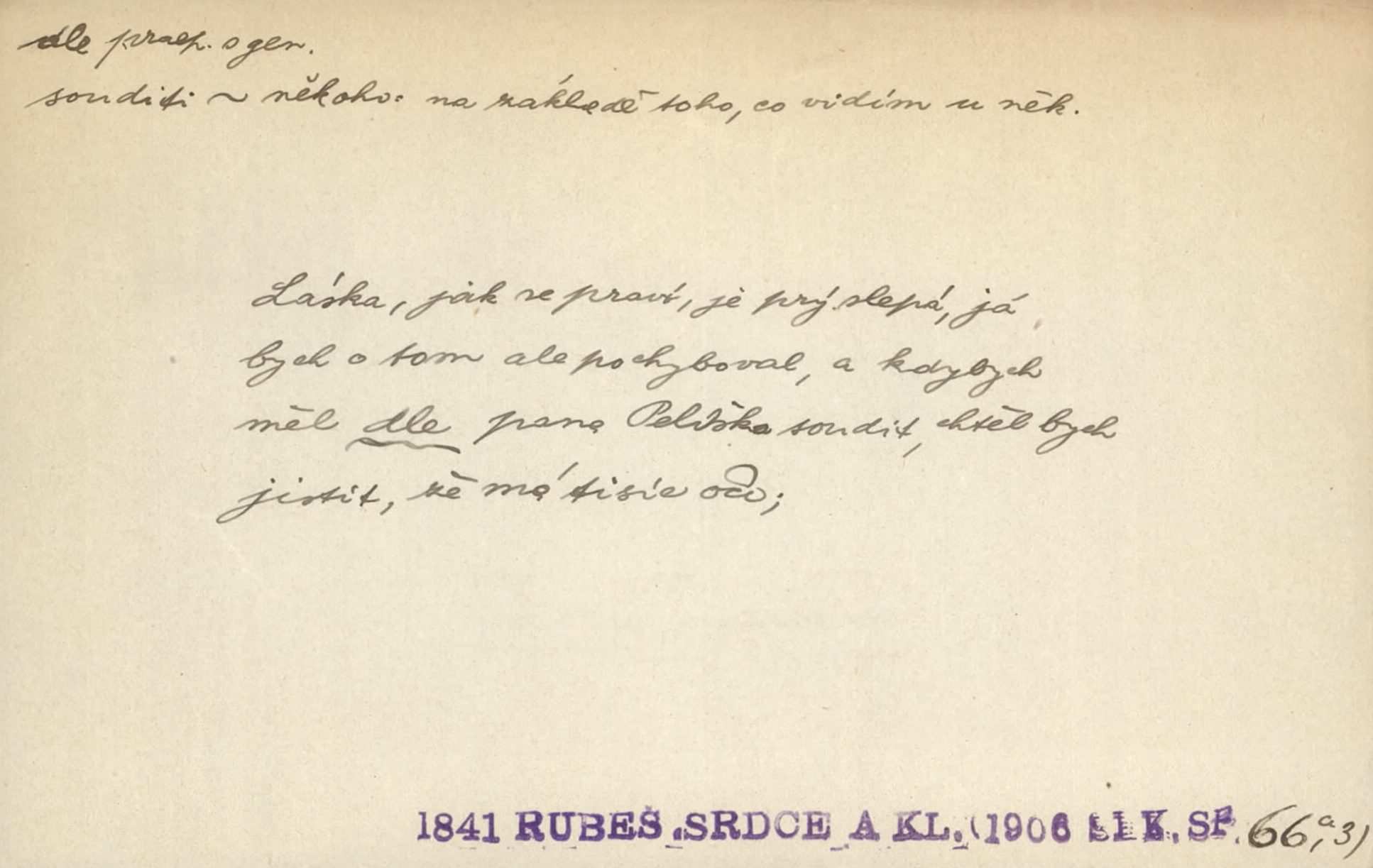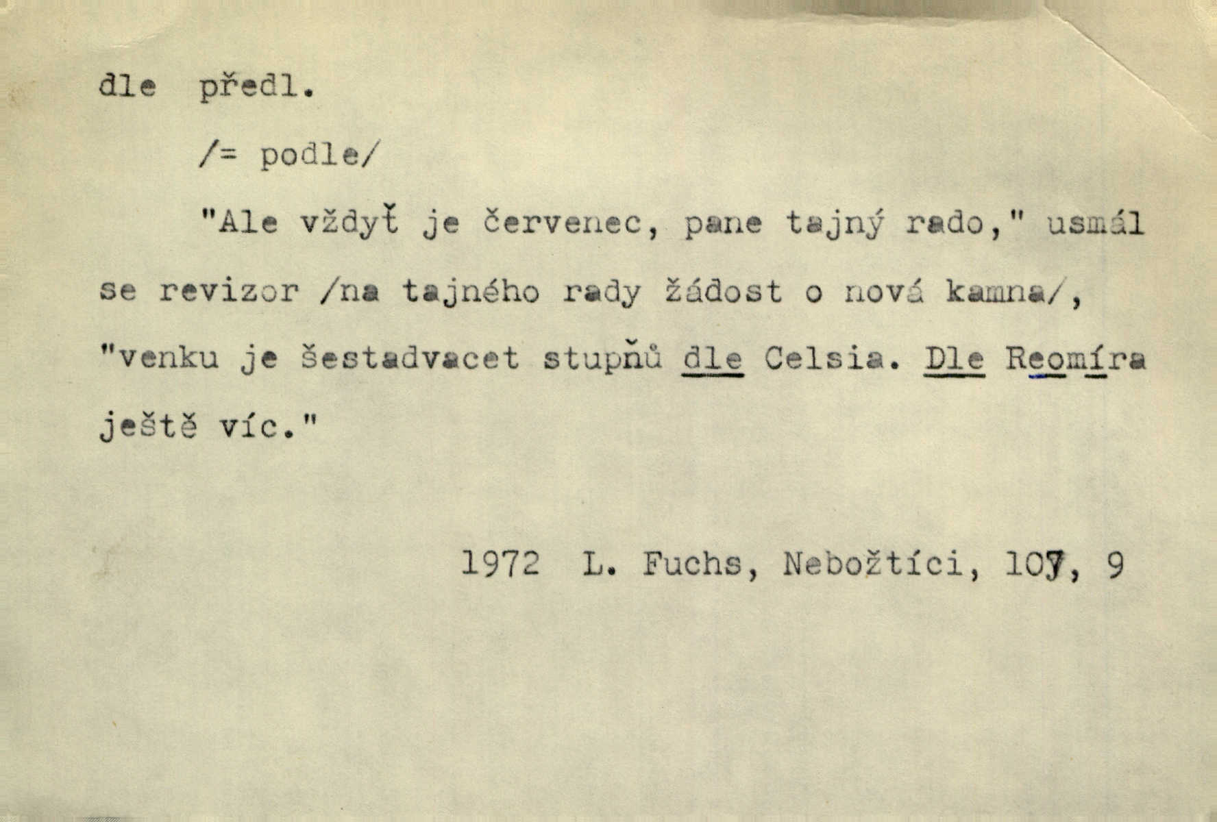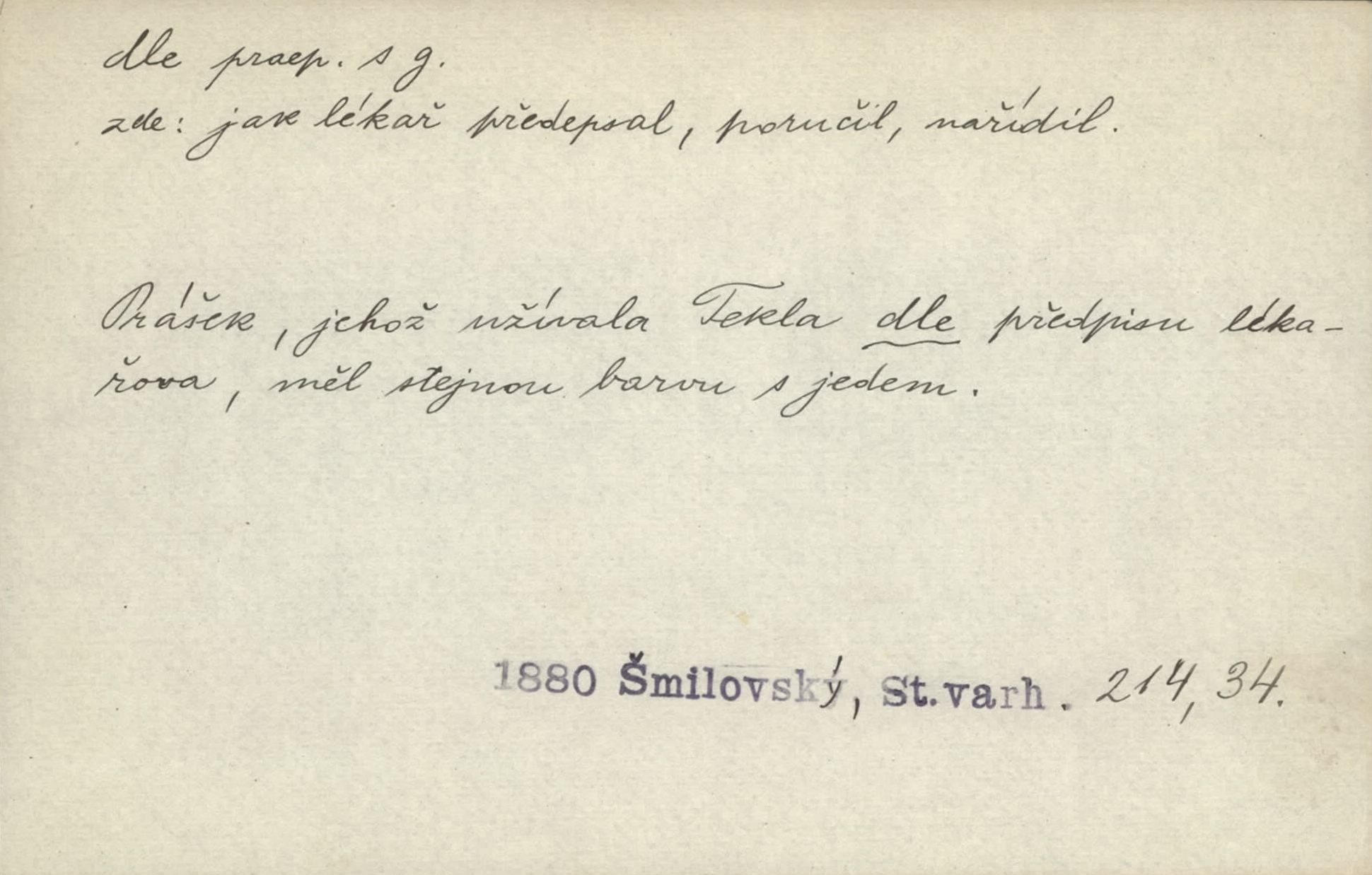 - dle předl. s gen. podle; značí přiměřenost, souhlas, shodu. Svůj k svému a vždy dle pravdy! Pal. Staniž se dle tvých slov! Zey. Na voze seděla asi třicetiletá, pěkná paní, dle obleku Polka. Jir. Tomu bych dle všeho věřil soudě podle všech okolností. Rais. D Bás. místo vedle, podle značí místní blízkost. Loutny, lyry, harfy si hověly zde v pýše královské dle pastýřského rohu starých bardů. Vrch. S příč i déli ve vůz ten kůň dle koně zapřažen. Quis.