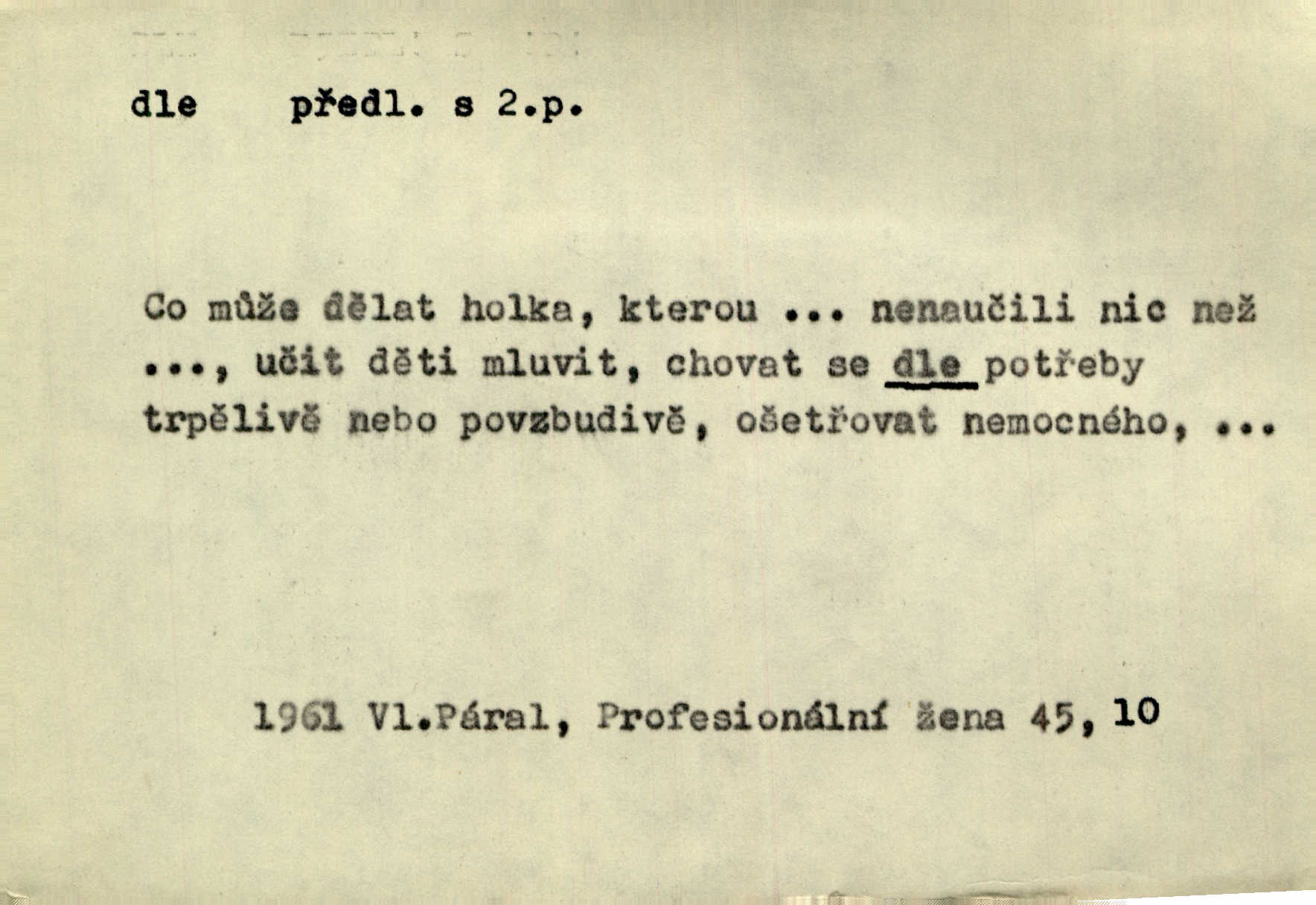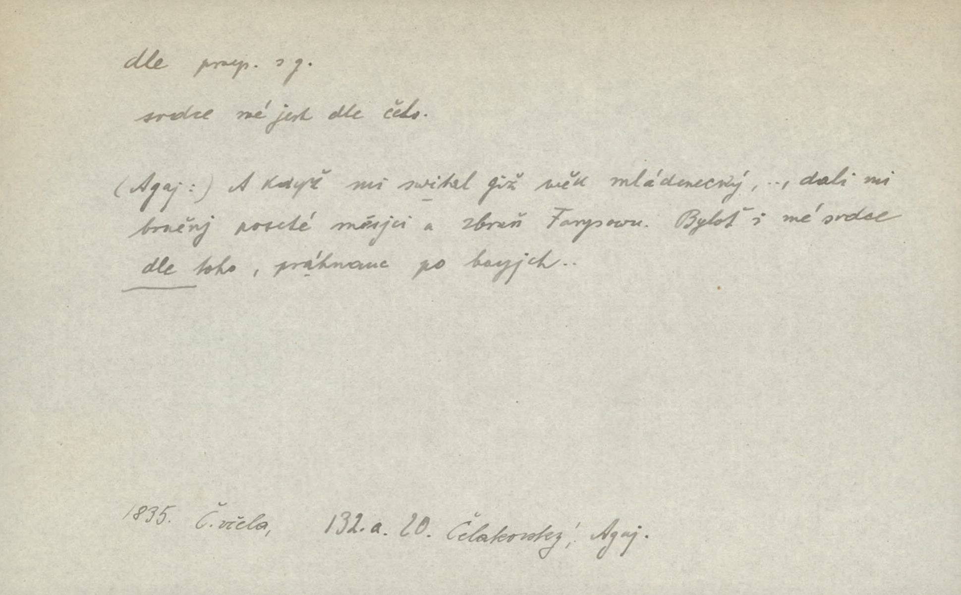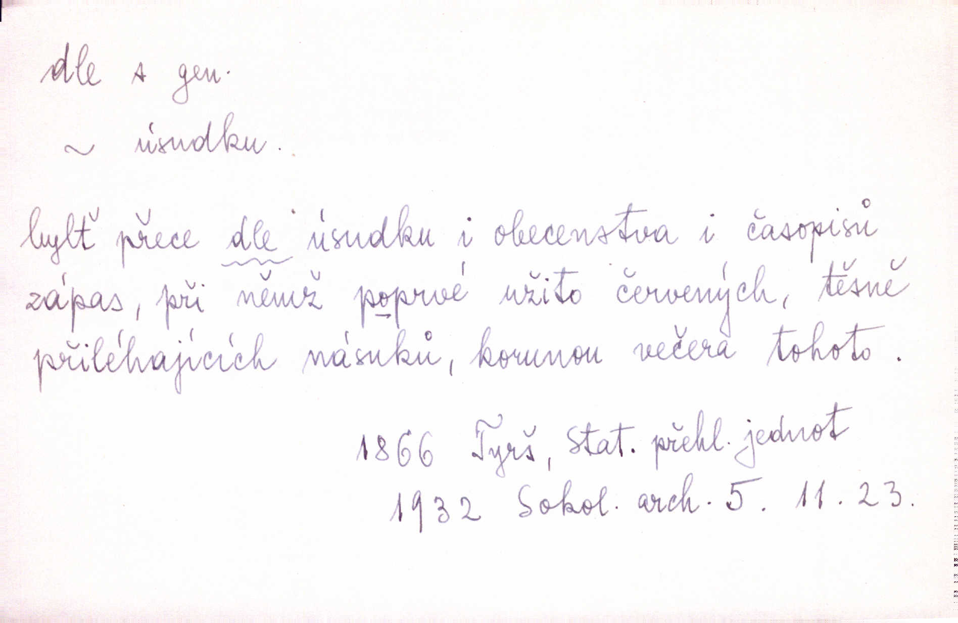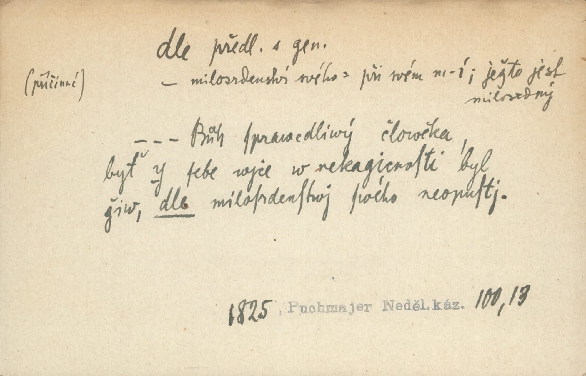 - dle předl. s gen. podle; značí přiměřenost, souhlas, shodu. Svůj k svému a vždy dle pravdy! Pal. Staniž se dle tvých slov! Zey. Na voze seděla asi třicetiletá, pěkná paní, dle obleku Polka. Jir. Tomu bych dle všeho věřil soudě podle všech okolností. Rais. D Bás. místo vedle, podle značí místní blízkost. Loutny, lyry, harfy si hověly zde v pýše královské dle pastýřského rohu starých bardů. Vrch. S příč i déli ve vůz ten kůň dle koně zapřažen. Quis.