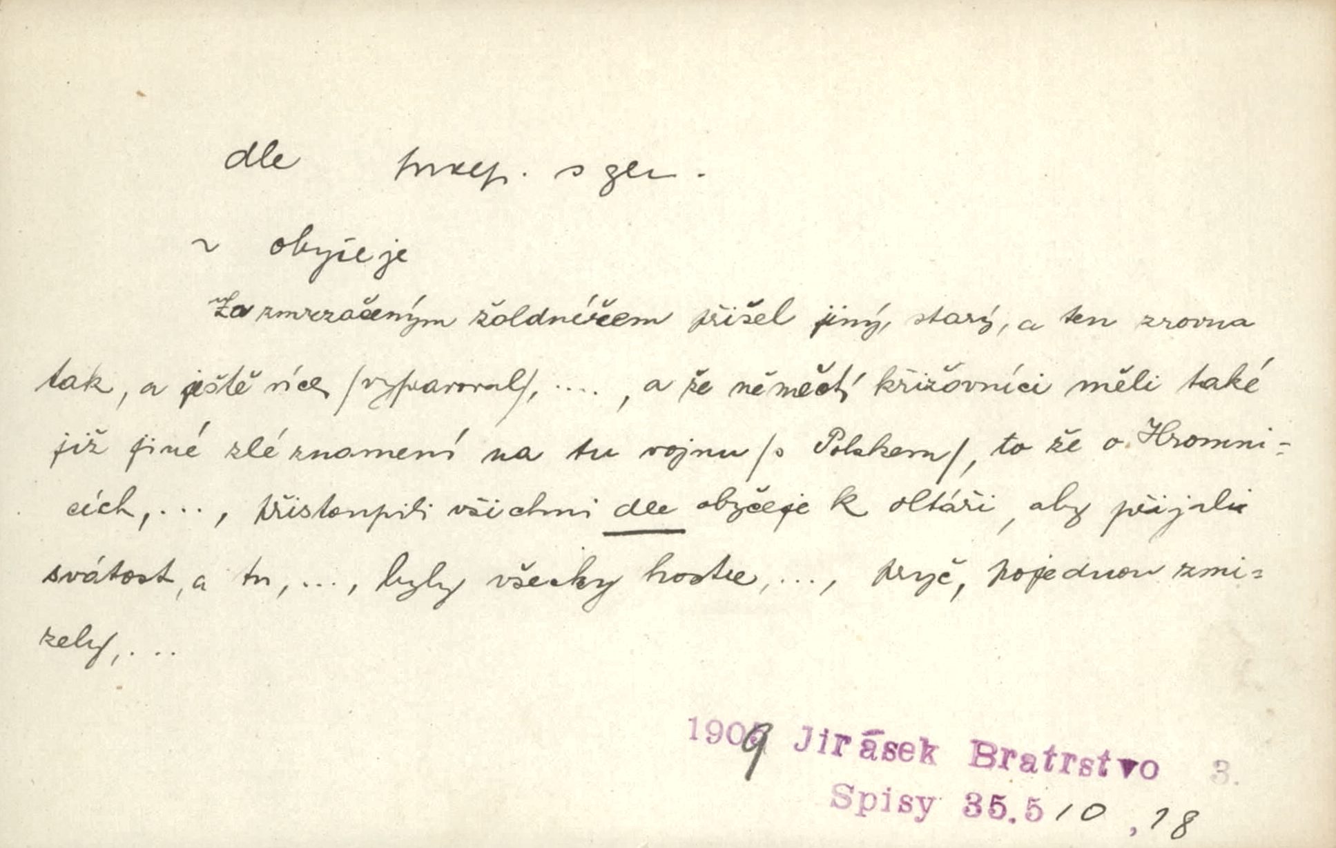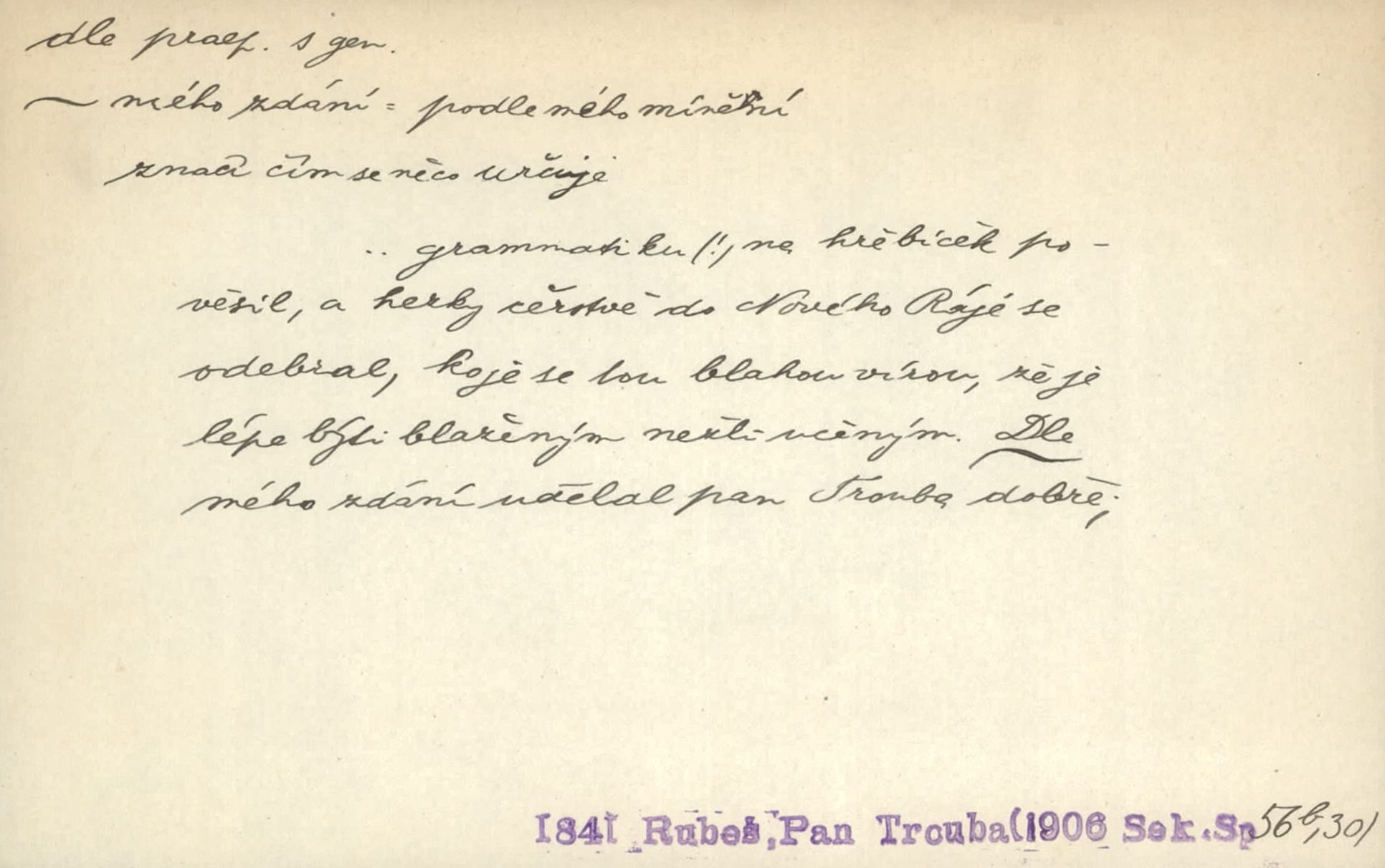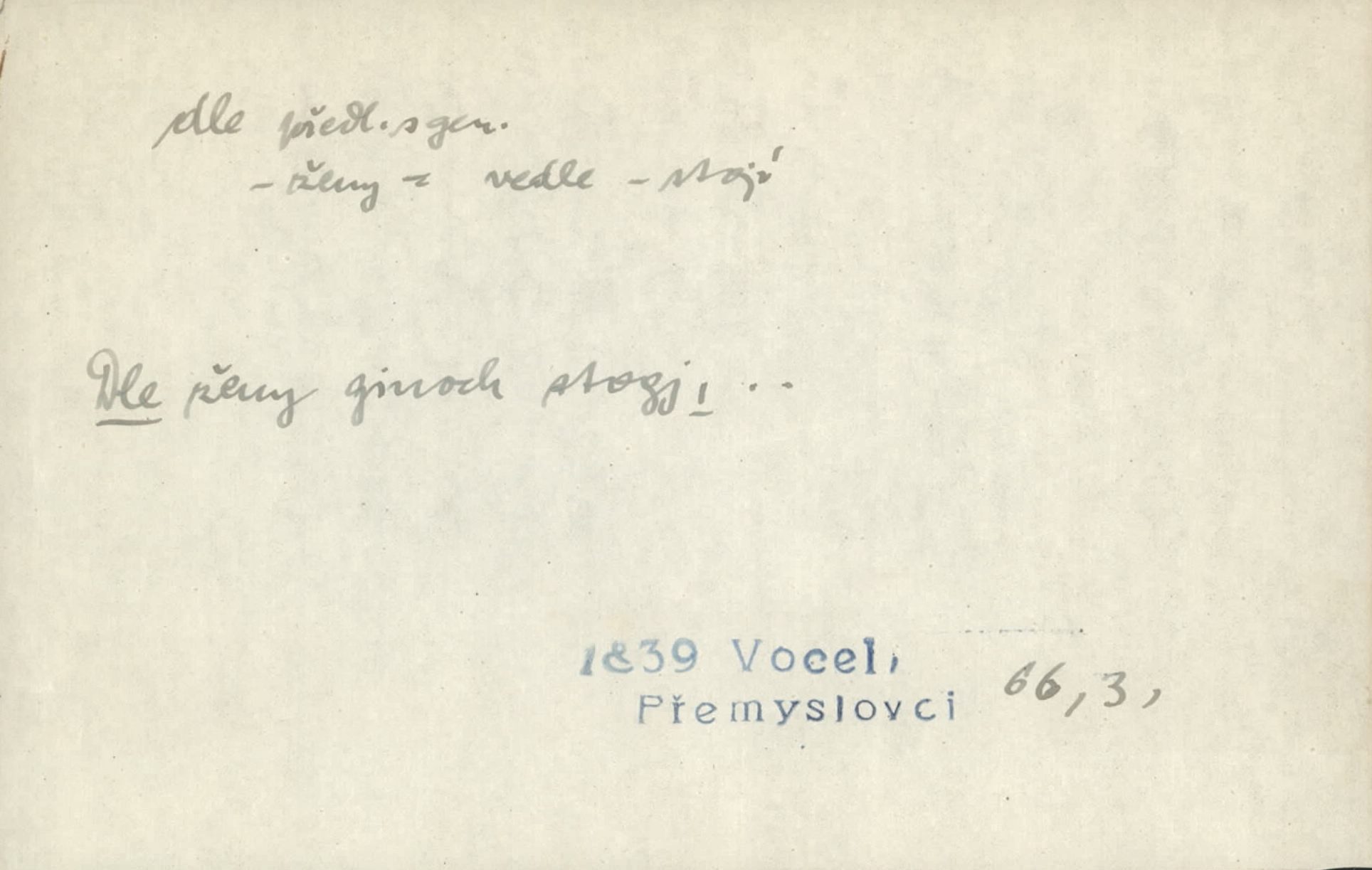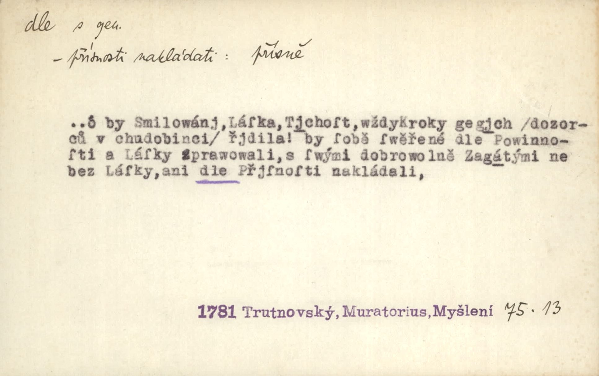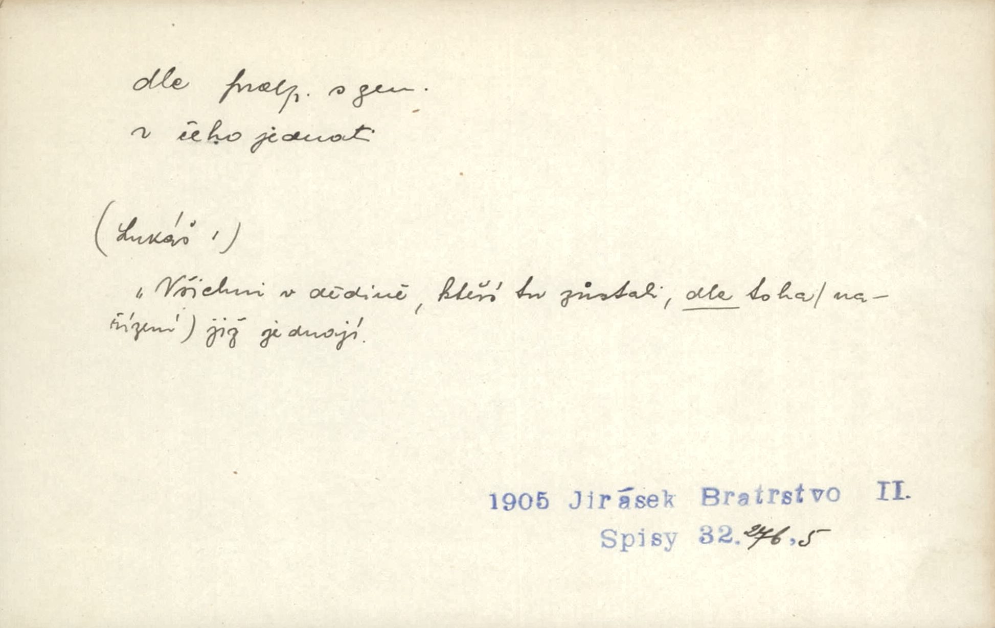 - dle předl. s gen. podle; značí přiměřenost, souhlas, shodu. Svůj k svému a vždy dle pravdy! Pal. Staniž se dle tvých slov! Zey. Na voze seděla asi třicetiletá, pěkná paní, dle obleku Polka. Jir. Tomu bych dle všeho věřil soudě podle všech okolností. Rais. D Bás. místo vedle, podle značí místní blízkost. Loutny, lyry, harfy si hověly zde v pýše královské dle pastýřského rohu starých bardů. Vrch. S příč i déli ve vůz ten kůň dle koně zapřažen. Quis.