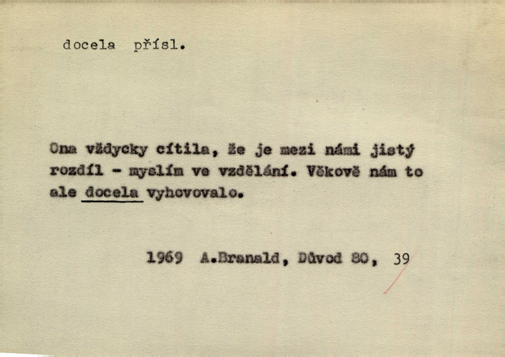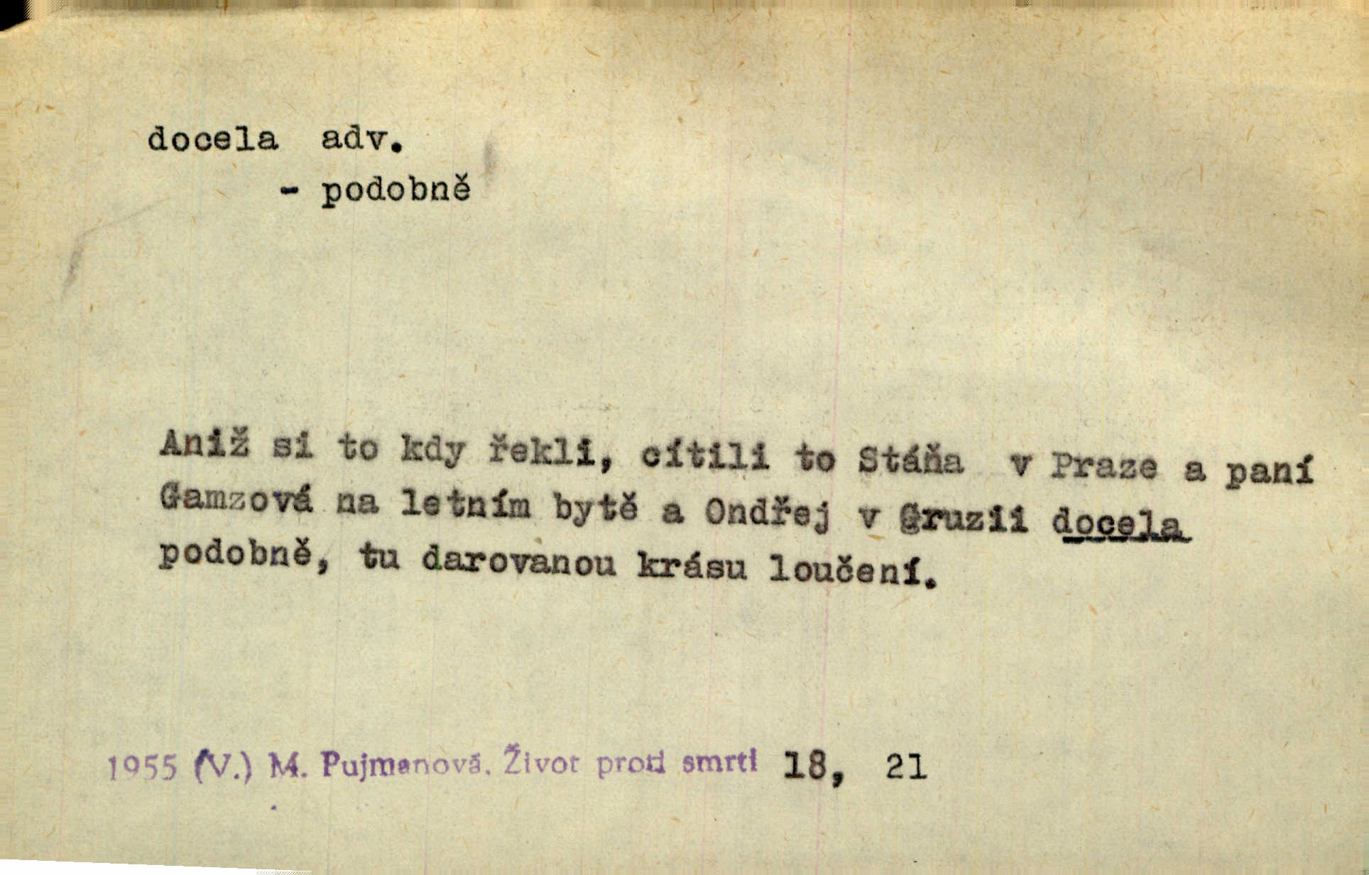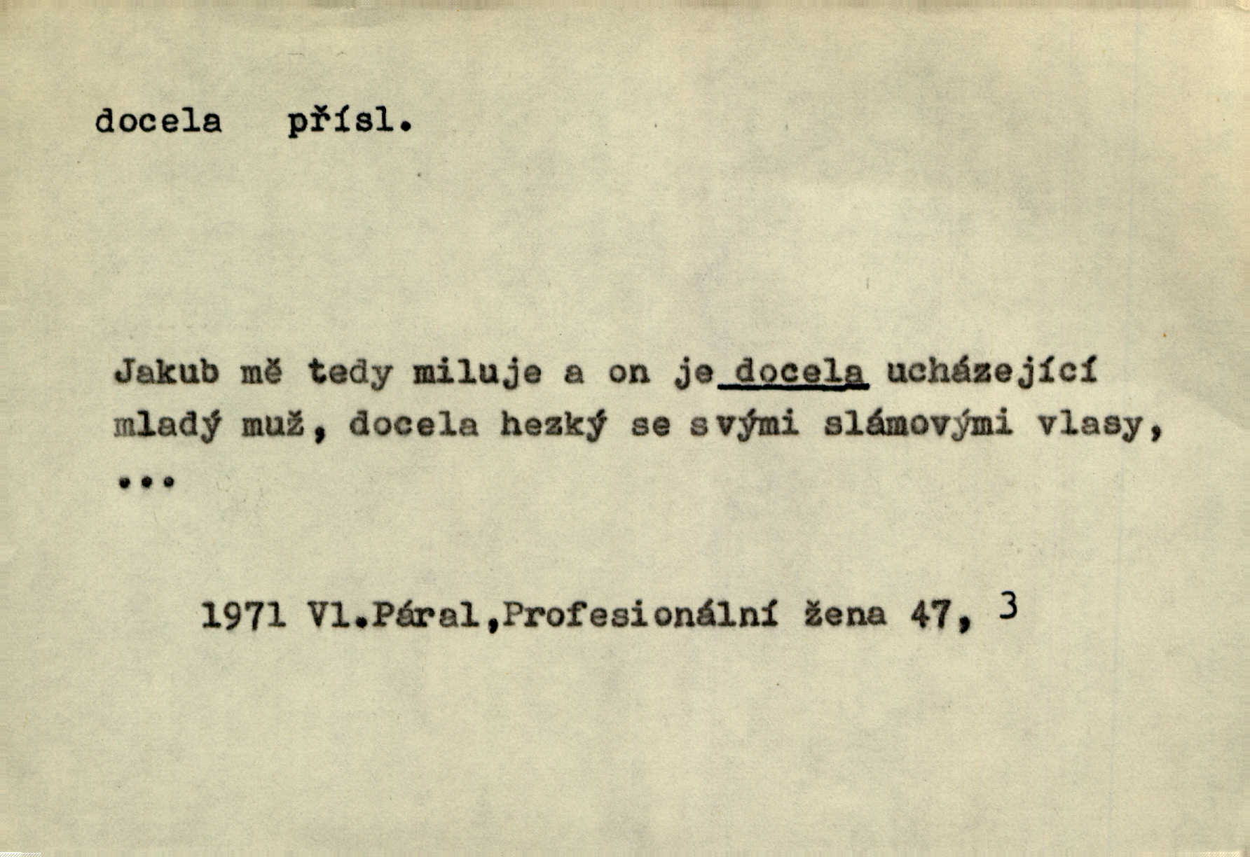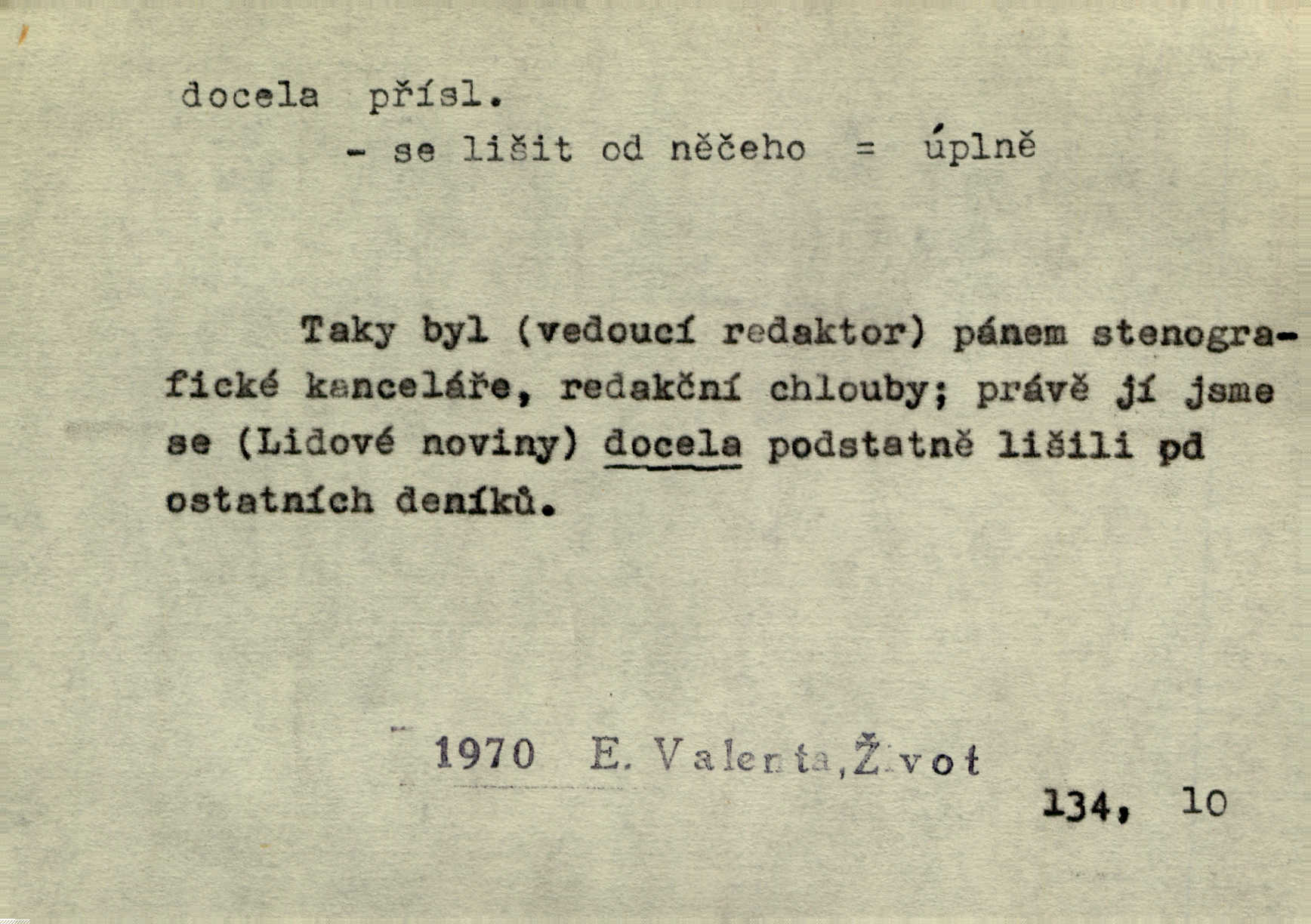 - docela adv. úplně, nadobro. Probošt, pootevřev okenici, čekal, pak odstrčil okenici docela. Jir. Lampa, co temně hořela, prskla a zhasla docela. Erb. Mimo polohu na stráni nebylo na dědině docela nic zvláštního. Herb. Takové dámy jsou zvyklé na něco docela jiného. Rais. D vyjadřuje stupňování. Proskakovalo tu a tam, že byl [pan domácí] taky kdysi ženat, někdo tvrdil docela, že dvakráte dokonce. Kun. Zeisl, aby už docela zde neseděl jako kluk, zapálil si doutník. V. Mrš.