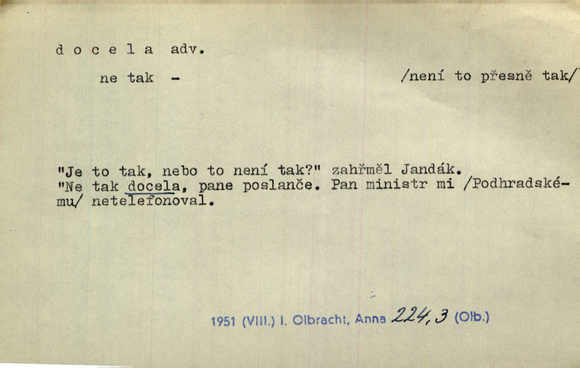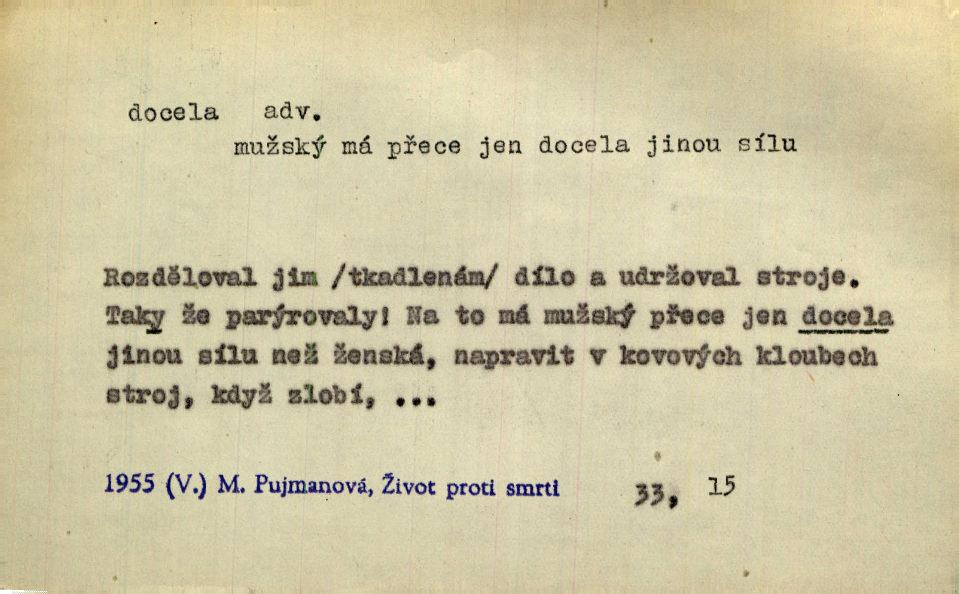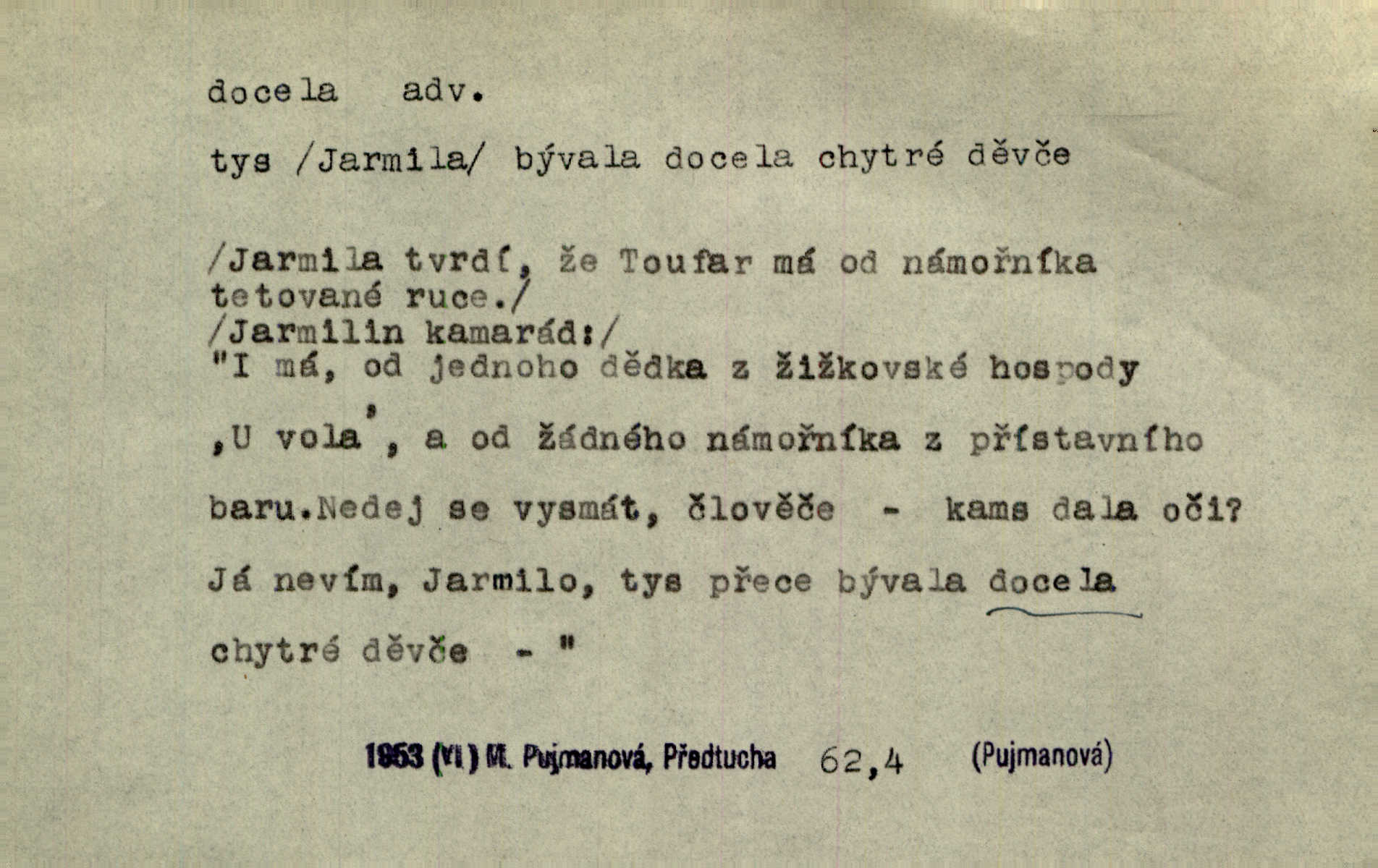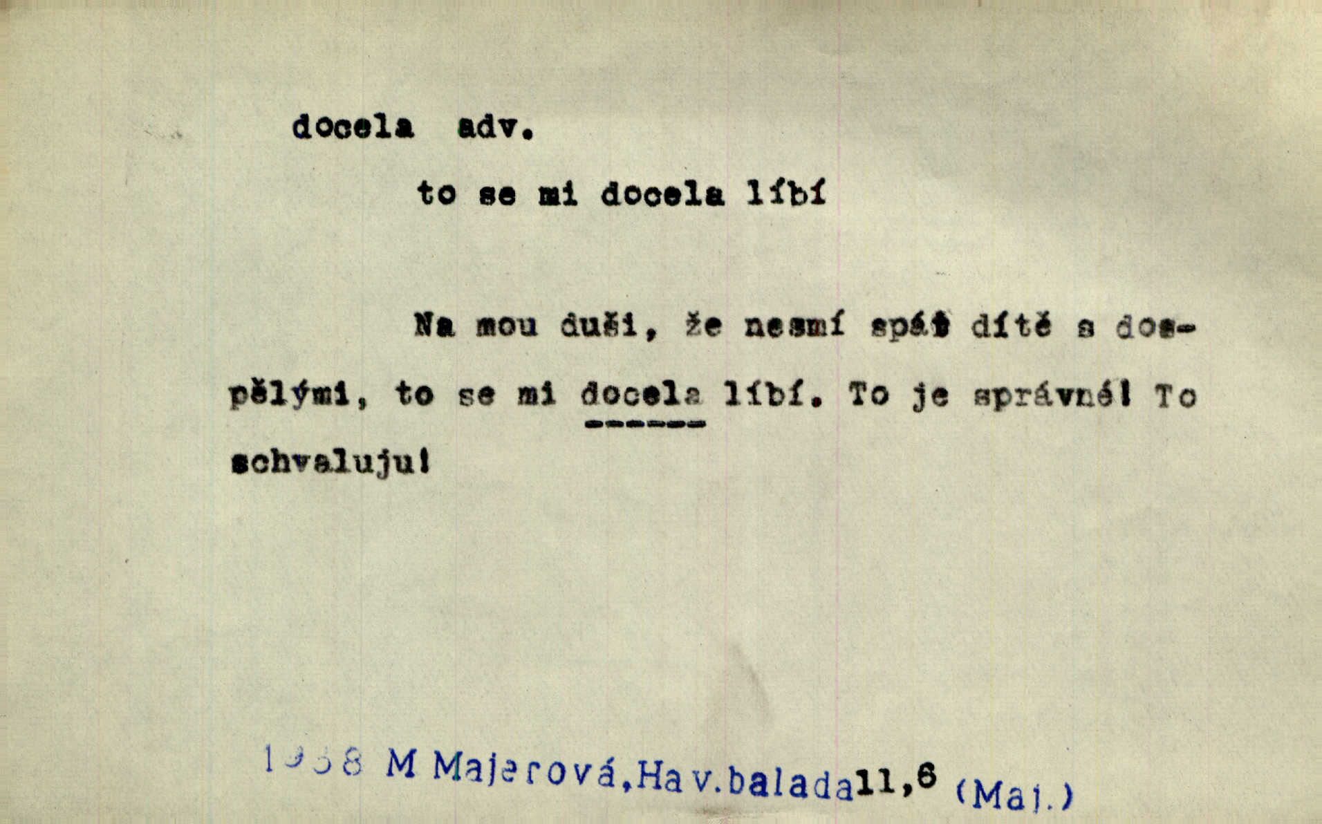 - docela adv. úplně, nadobro. Probošt, pootevřev okenici, čekal, pak odstrčil okenici docela. Jir. Lampa, co temně hořela, prskla a zhasla docela. Erb. Mimo polohu na stráni nebylo na dědině docela nic zvláštního. Herb. Takové dámy jsou zvyklé na něco docela jiného. Rais. D vyjadřuje stupňování. Proskakovalo tu a tam, že byl [pan domácí] taky kdysi ženat, někdo tvrdil docela, že dvakráte dokonce. Kun. Zeisl, aby už docela zde neseděl jako kluk, zapálil si doutník. V. Mrš.