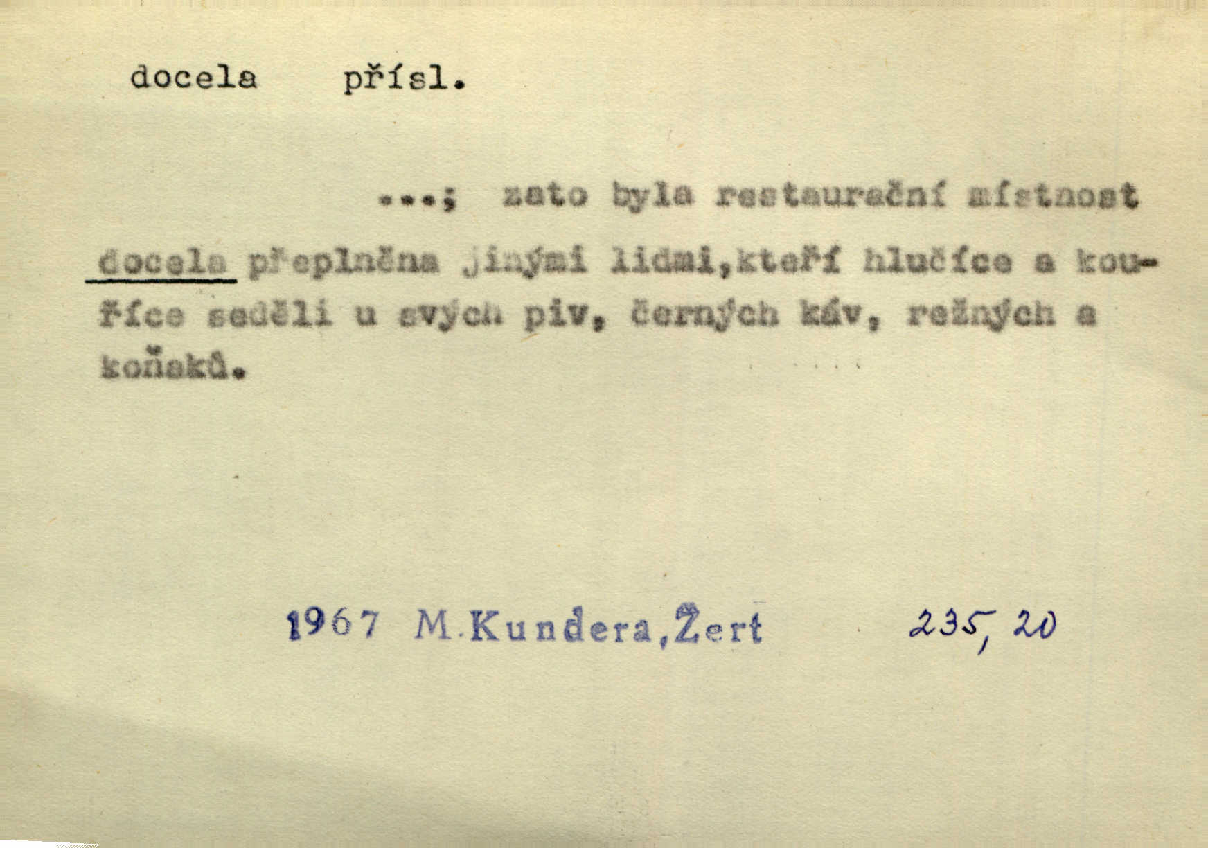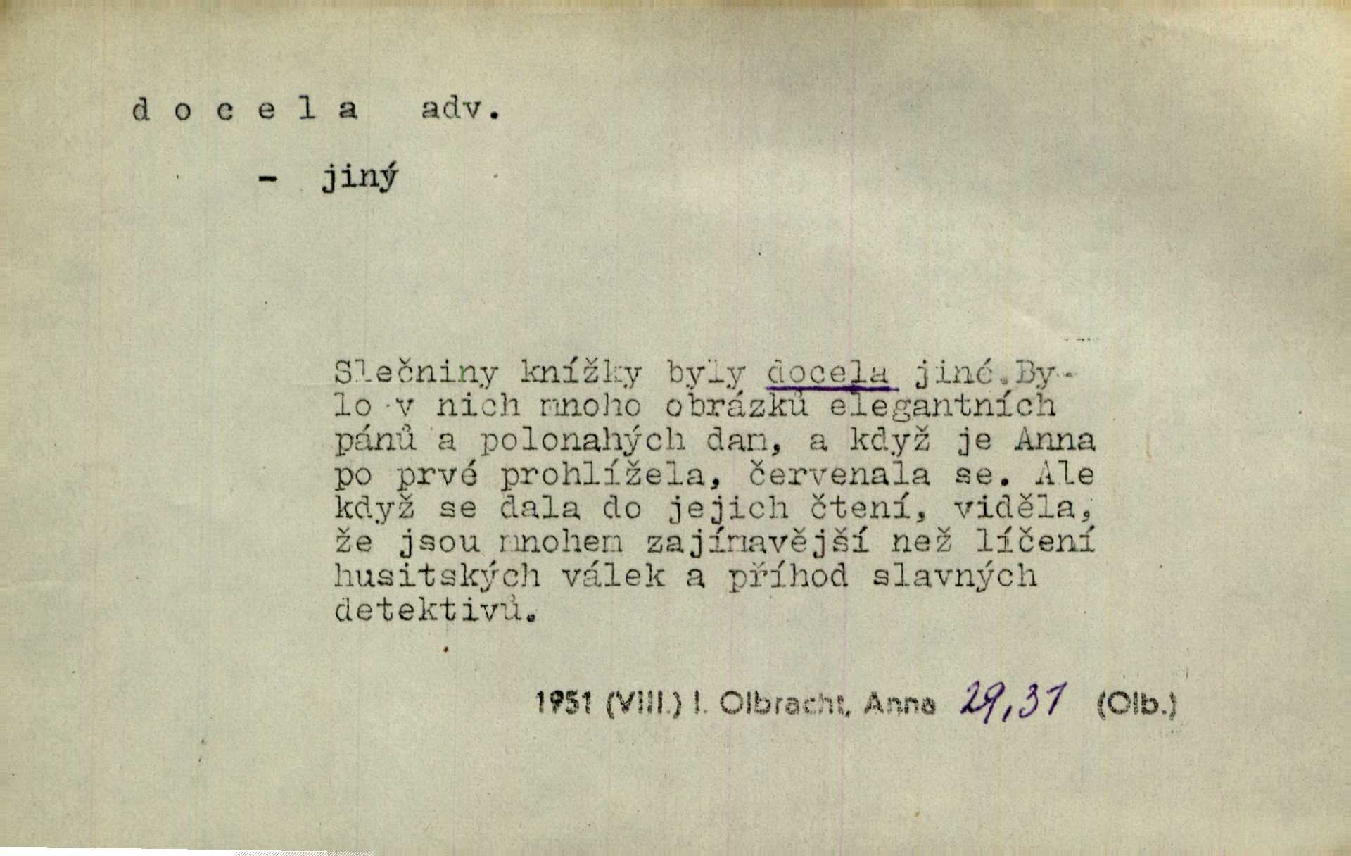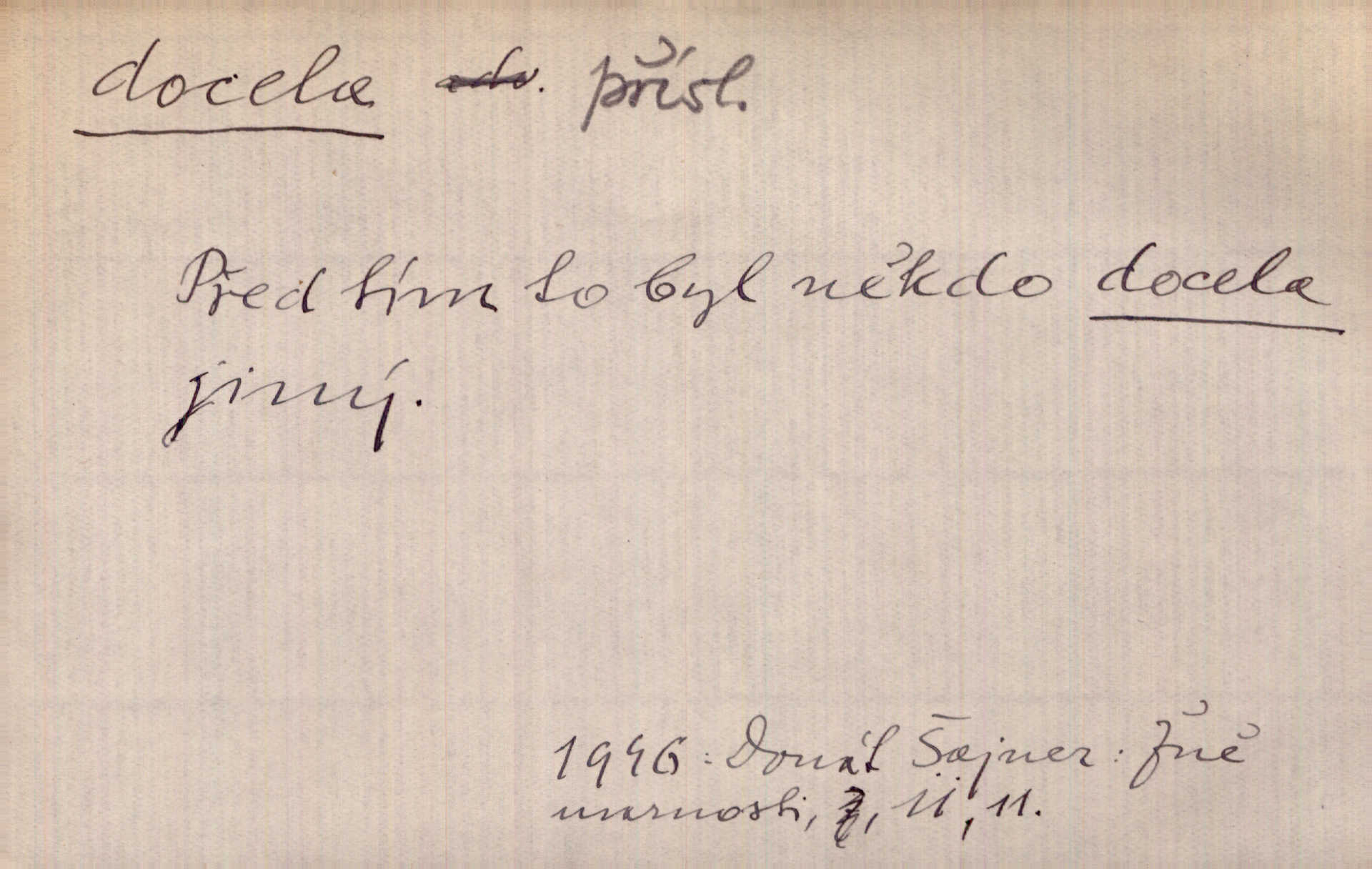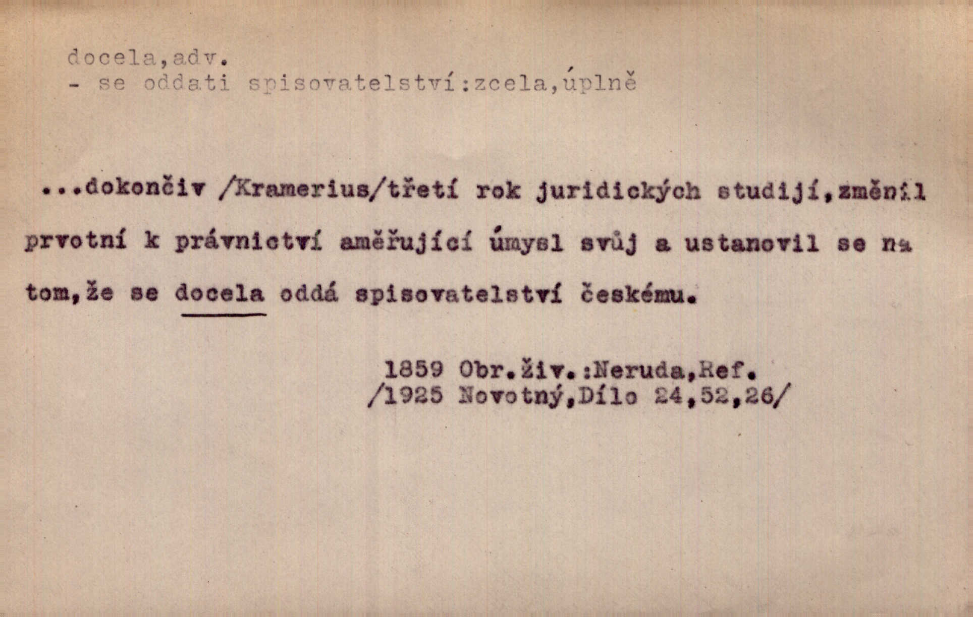 - docela adv. úplně, nadobro. Probošt, pootevřev okenici, čekal, pak odstrčil okenici docela. Jir. Lampa, co temně hořela, prskla a zhasla docela. Erb. Mimo polohu na stráni nebylo na dědině docela nic zvláštního. Herb. Takové dámy jsou zvyklé na něco docela jiného. Rais. D vyjadřuje stupňování. Proskakovalo tu a tam, že byl [pan domácí] taky kdysi ženat, někdo tvrdil docela, že dvakráte dokonce. Kun. Zeisl, aby už docela zde neseděl jako kluk, zapálil si doutník. V. Mrš.
