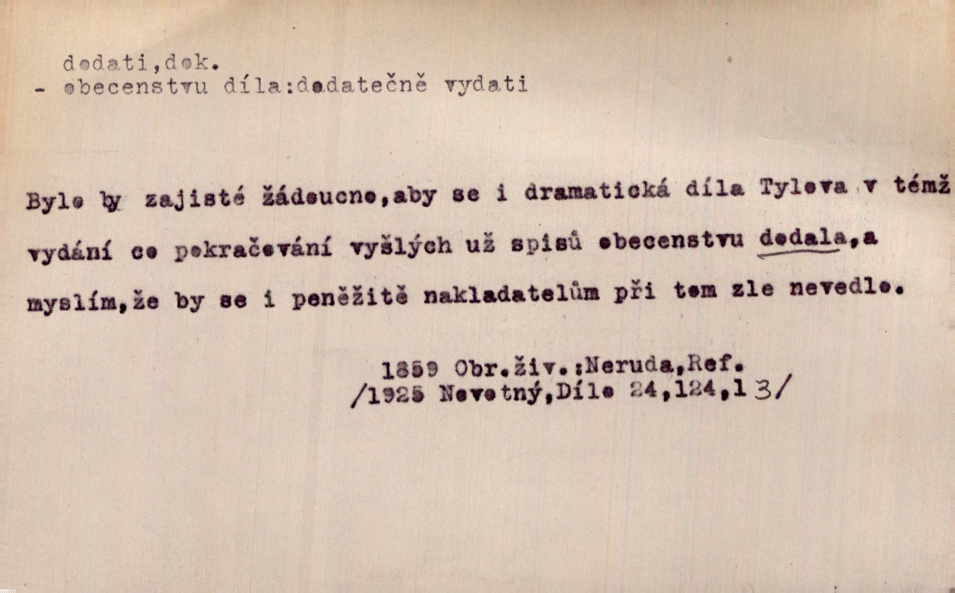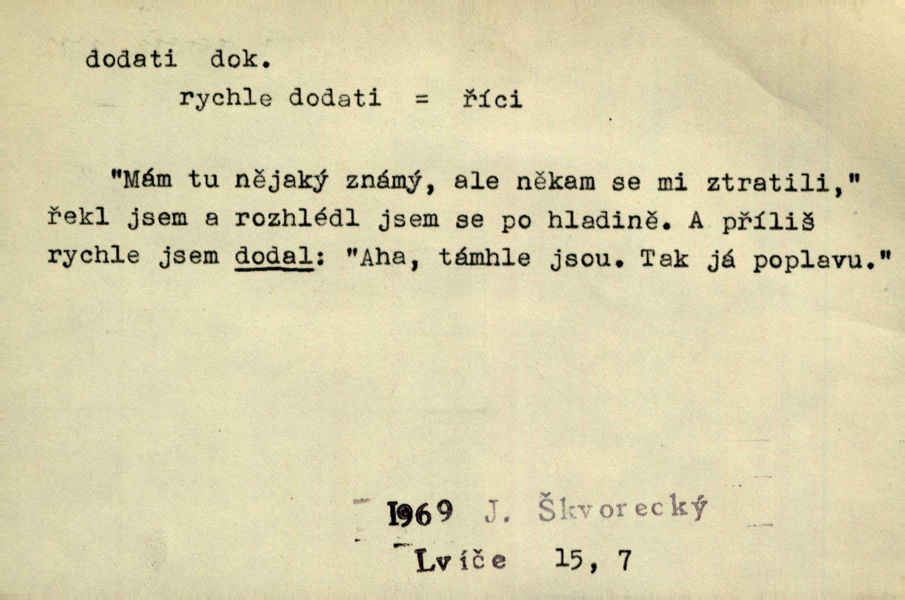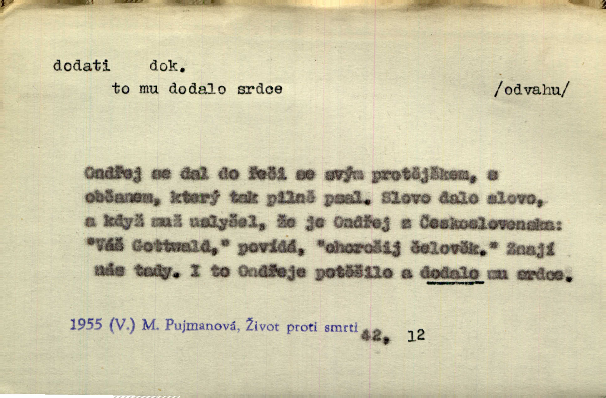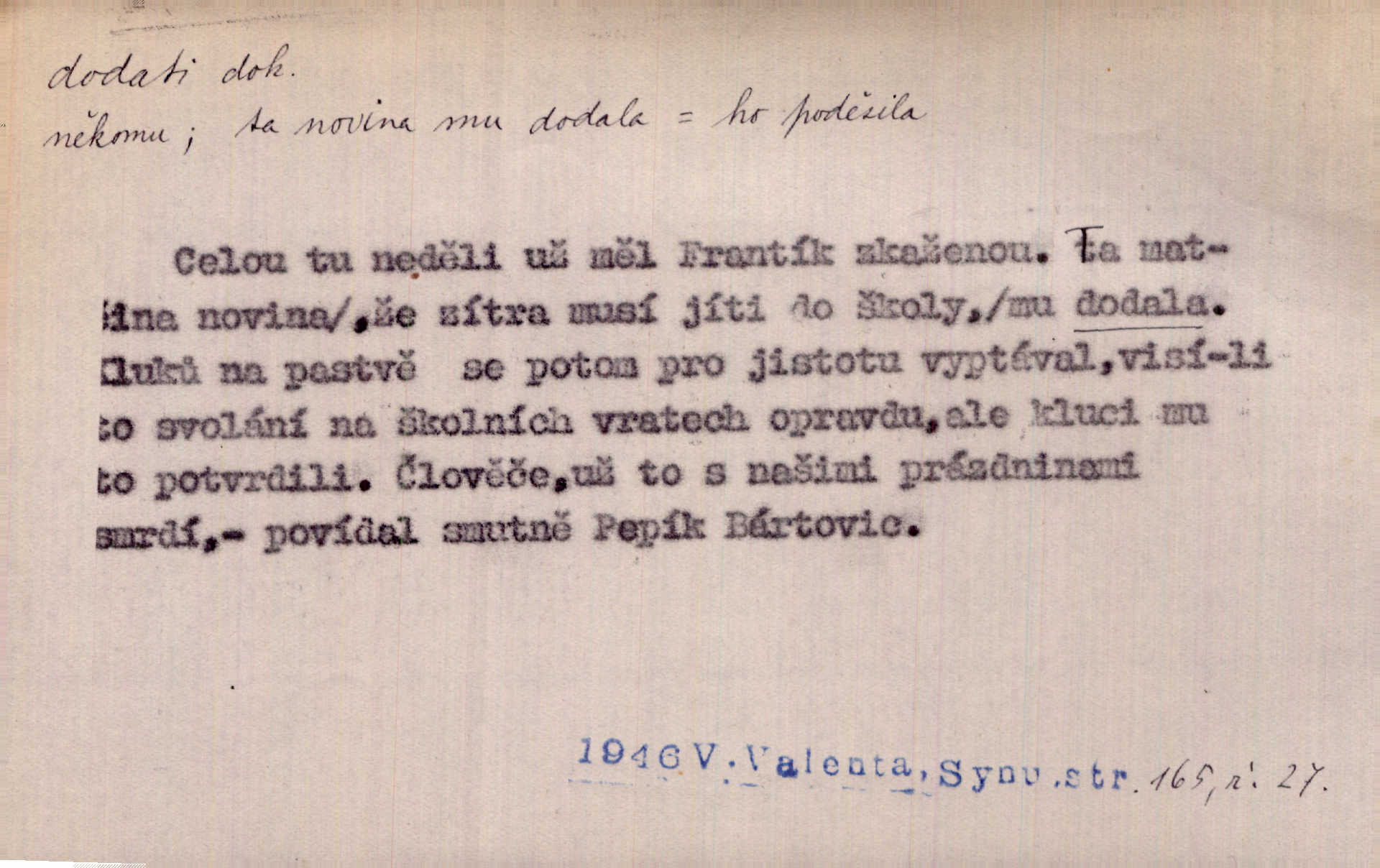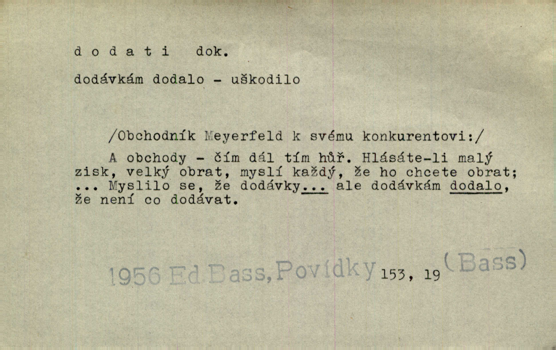- dodati dok. (přech. přít. dodaje) (něco) přidati, připojiti. Knihu ještě příručnější činí dodané rejstříky. Ath. Ale hospodář je dobrý, dodal pán. Herb. To jsem řekl a Toník dodal, že bez Pavly sem taky nepůjde! Rais. D (v kartách) naposledy dáti. Bylo rázem půl desáté, když Havlíček prohlásil „hráč dodá“. V. Mrš. Obch. dodati na něco vrátiti drobnější peníze na větší. Úředník na zlatku dodal mu čtyřicet čtyři krejcary. Kam. D (někomu něčeho, zř. něco) rozmnožiti, zvětšiti, zesíliti. Ta slova jim dodala chuti. Něm. Dodal si smělosti. Prav. Dobytý úspěch dodal královským odvahu. Jir. D přitížiti, doraziti. Nachladil se, rozčilil, pak zpráva o smrti pána jeho a přítele mu dodala — leží. Jir. Jindy tam bývalo vozů jako ve vojanském táboře; železné dráhy však dodaly formanům a hospodám. Kosm. D (komu co) odevzdati, přinésti, přivézti, poskytnouti. Černoušek dodal Jelence lístek. Třeb. Budeme přejímat objednané potraviny. Hokynář je právě dodal. Mach. Rychtář dostal nařízení, aby Felcmana zatkl a na zámek dodal. Jir. Panství bylo zavázáno tolik a tolik vojáků dodati. Herb. Pošt. dodati (dodání) odevzdati adresátovi zásilku v místnostech úřadu (op. doručiti = odevzdati adresátovi do bytu). D dodati se dosti dáti. Děravého pytle nenaplníš a lakomci se nedodáš. Čel.