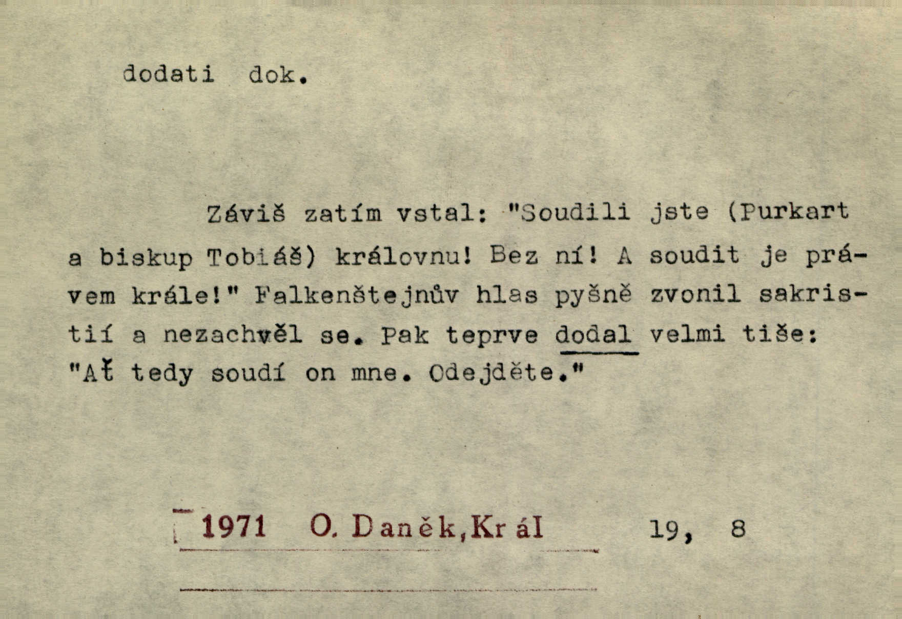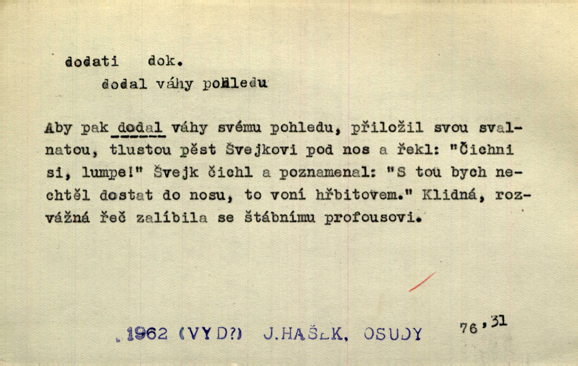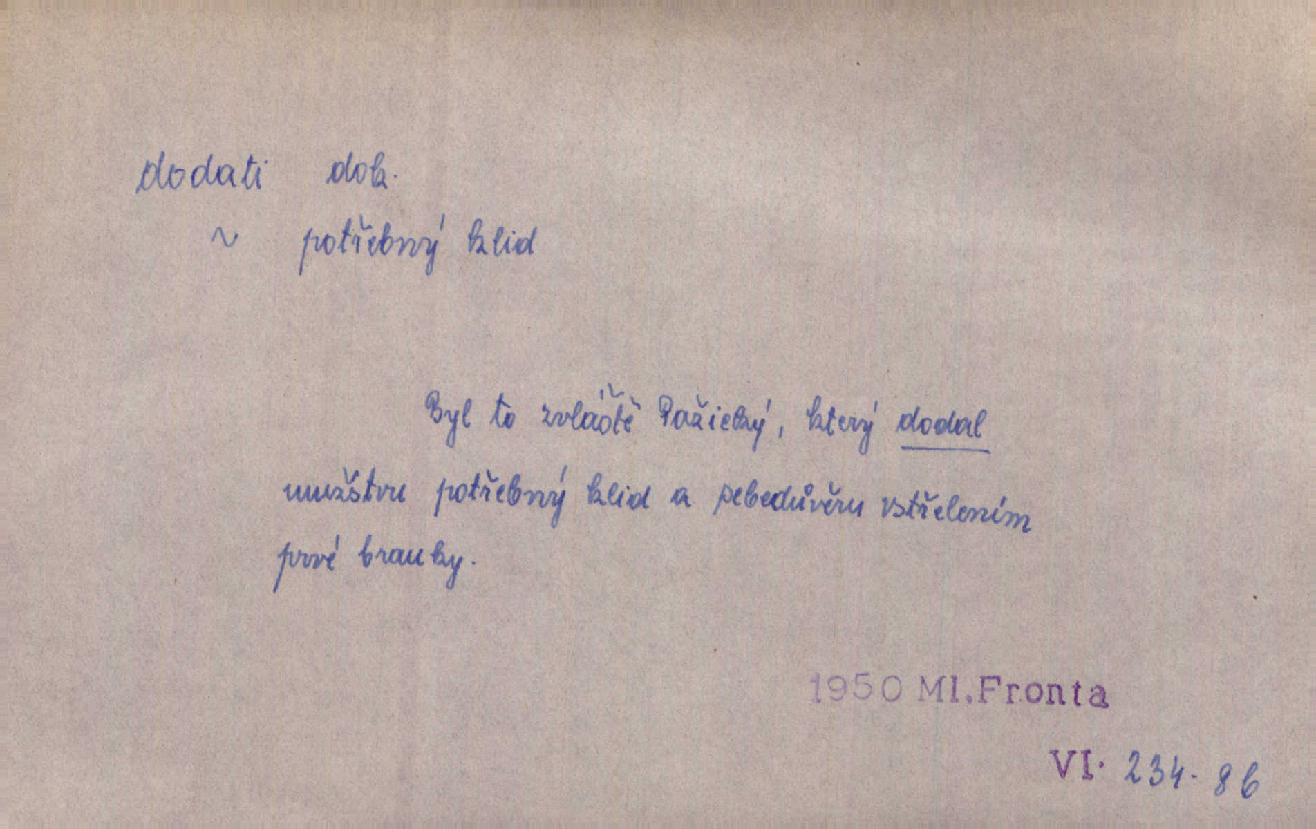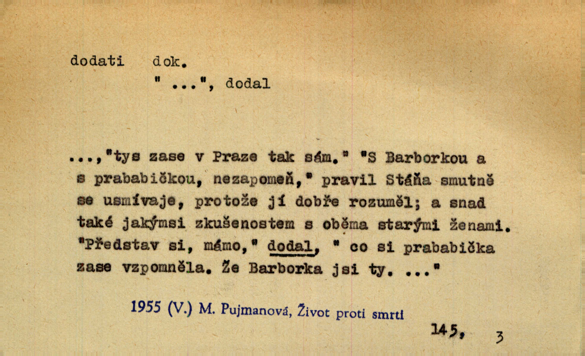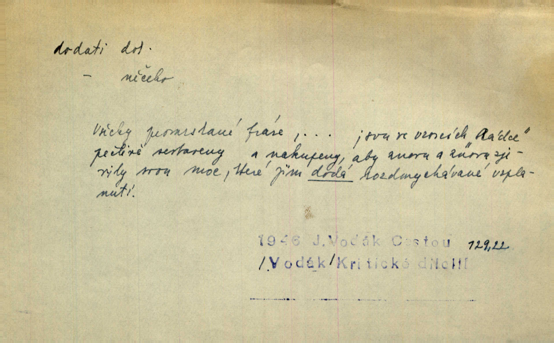 - dodati dok. (přech. přít. dodaje) (něco) přidati, připojiti. Knihu ještě příručnější činí dodané rejstříky. Ath. Ale hospodář je dobrý, dodal pán. Herb. To jsem řekl a Toník dodal, že bez Pavly sem taky nepůjde! Rais. D (v kartách) naposledy dáti. Bylo rázem půl desáté, když Havlíček prohlásil „hráč dodá“. V. Mrš. Obch. dodati na něco vrátiti drobnější peníze na větší. Úředník na zlatku dodal mu čtyřicet čtyři krejcary. Kam. D (někomu něčeho, zř. něco) rozmnožiti, zvětšiti, zesíliti. Ta slova jim dodala chuti. Něm. Dodal si smělosti. Prav. Dobytý úspěch dodal královským odvahu. Jir. D přitížiti, doraziti. Nachladil se, rozčilil, pak zpráva o smrti pána jeho a přítele mu dodala — leží. Jir. Jindy tam bývalo vozů jako ve vojanském táboře; železné dráhy však dodaly formanům a hospodám. Kosm. D (komu co) odevzdati, přinésti, přivézti, poskytnouti. Černoušek dodal Jelence lístek. Třeb. Budeme přejímat objednané potraviny. Hokynář je právě dodal. Mach. Rychtář dostal nařízení, aby Felcmana zatkl a na zámek dodal. Jir. Panství bylo zavázáno tolik a tolik vojáků dodati. Herb. Pošt. dodati (dodání) odevzdati adresátovi zásilku v místnostech úřadu (op. doručiti = odevzdati adresátovi do bytu). D dodati se dosti dáti. Děravého pytle nenaplníš a lakomci se nedodáš. Čel.