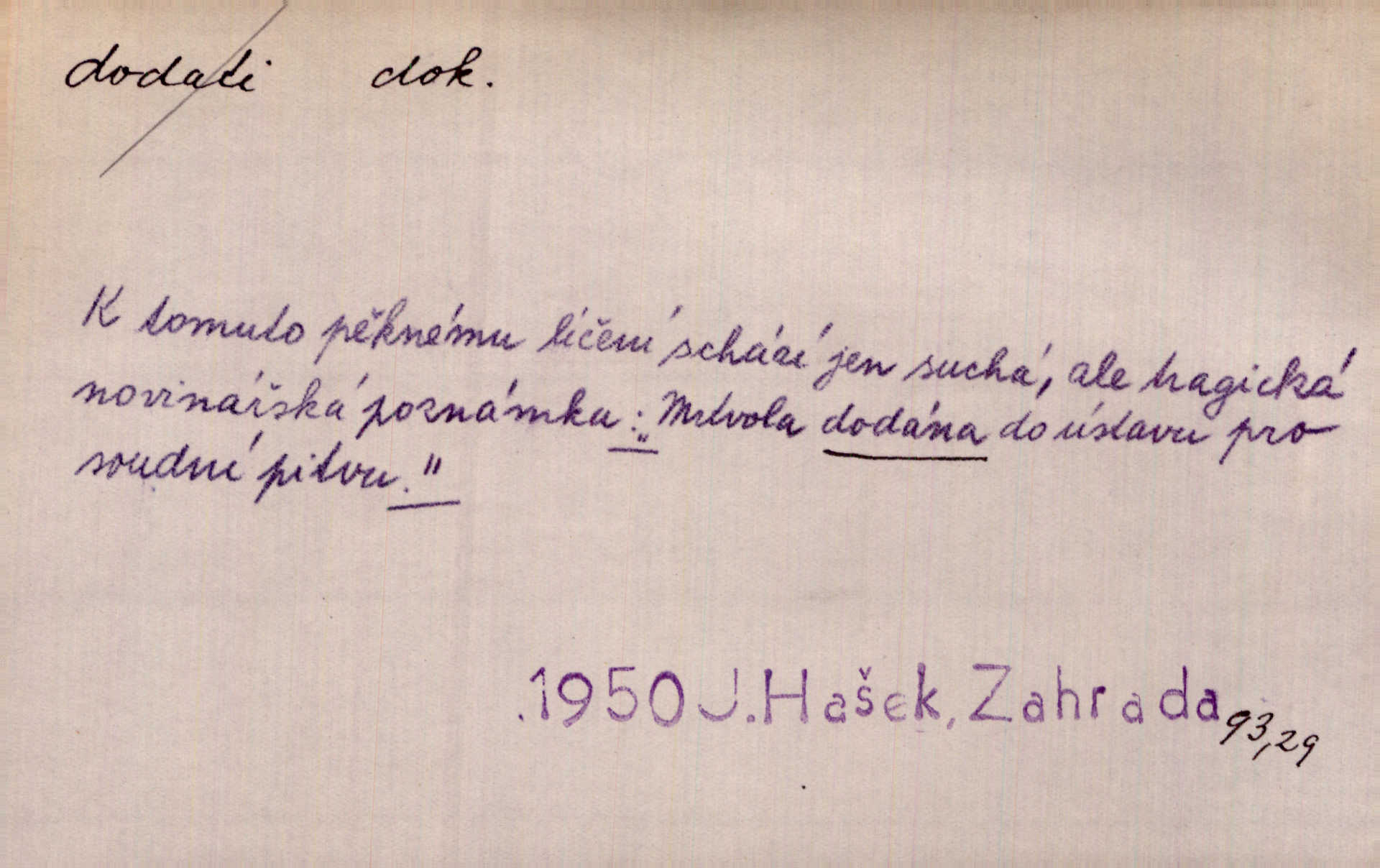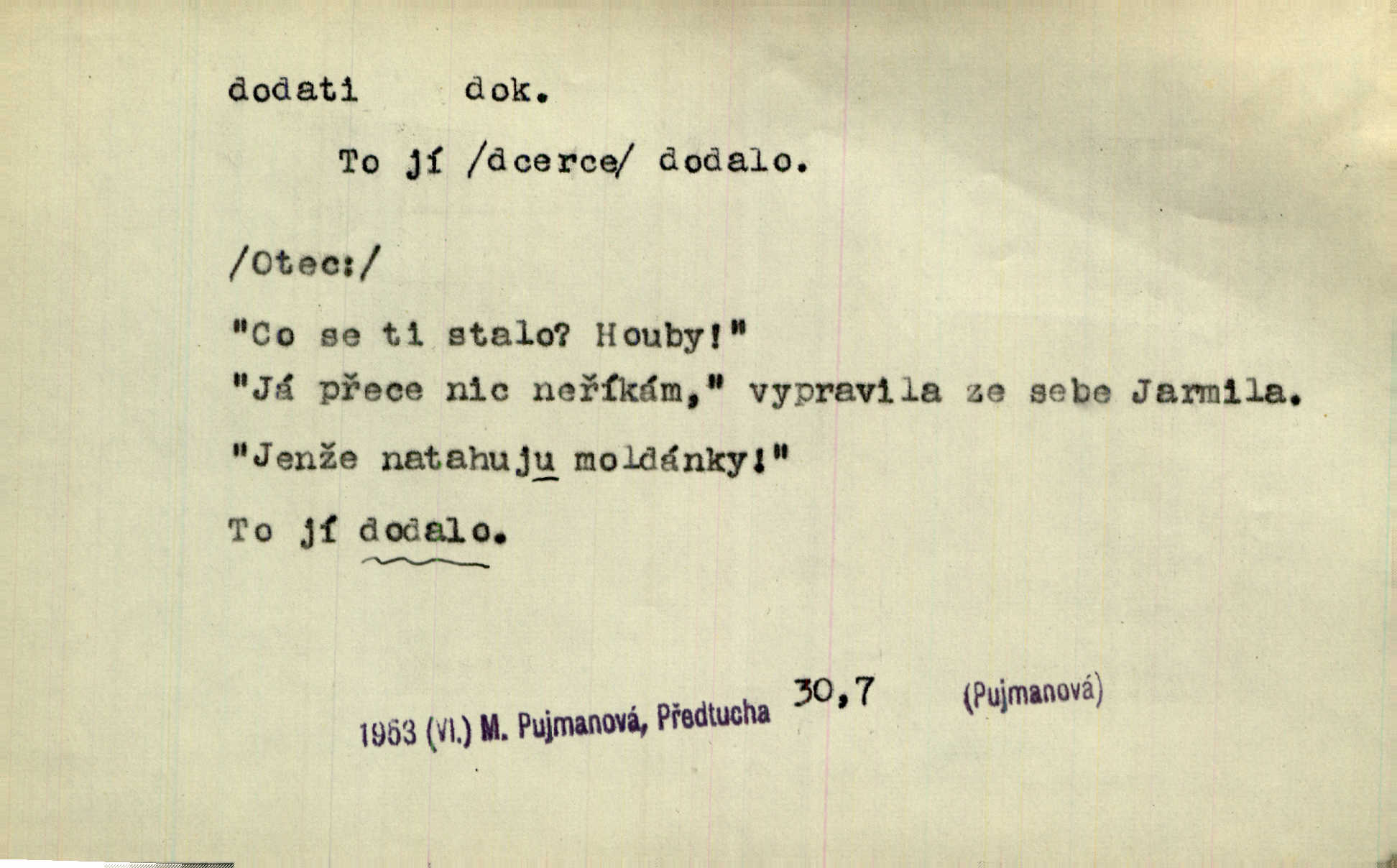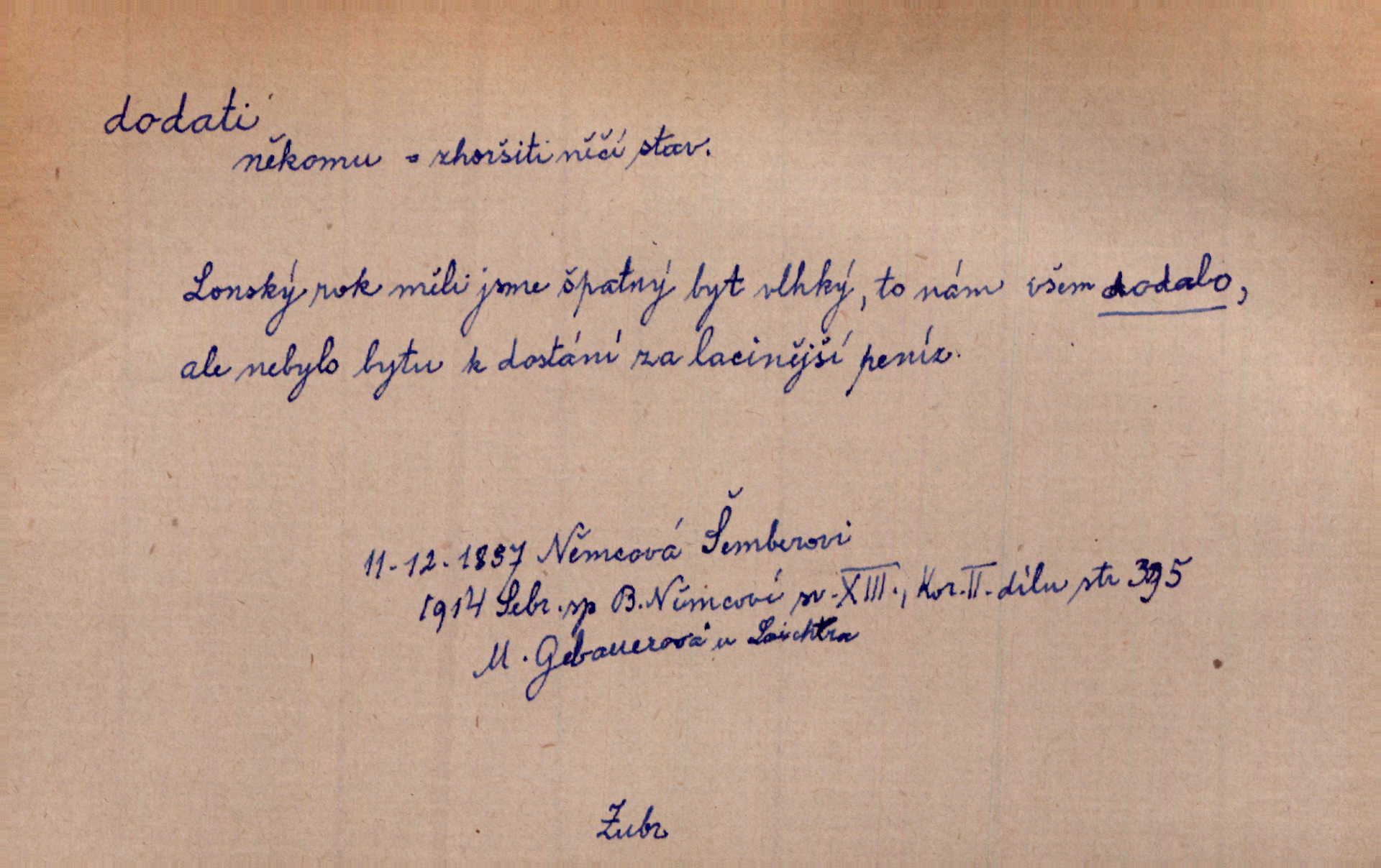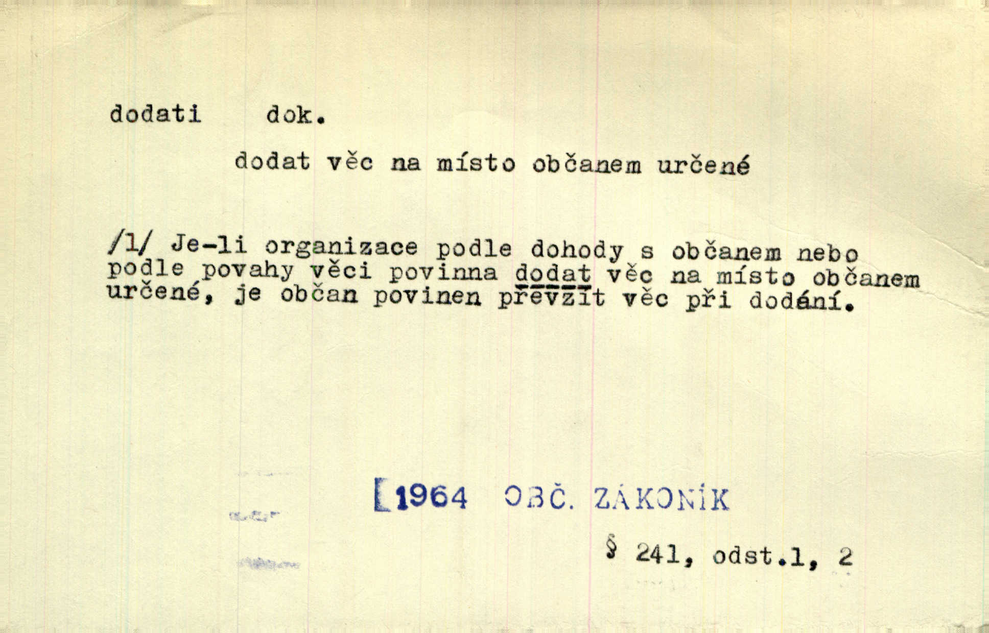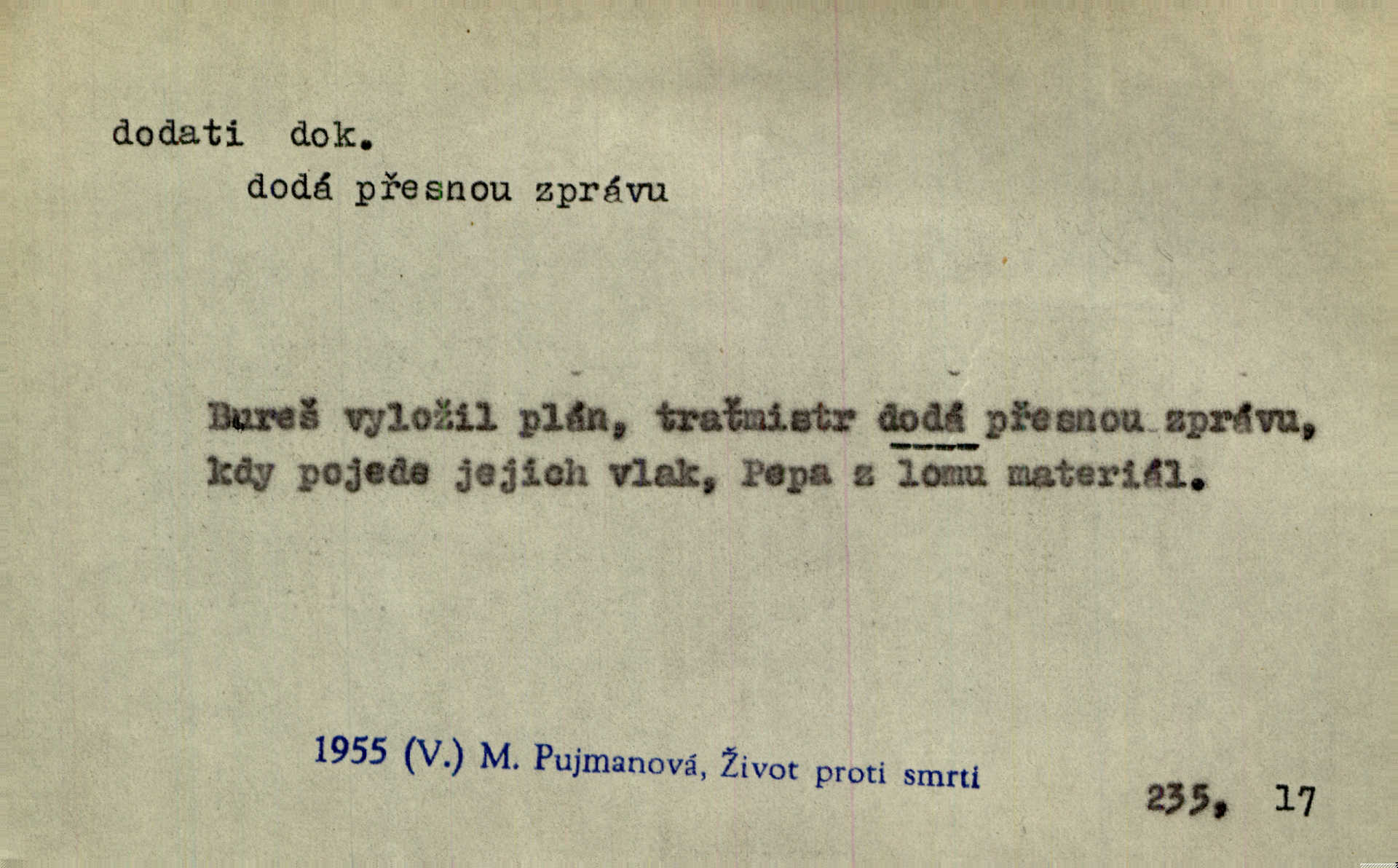 - dodati dok. (přech. přít. dodaje) (něco) přidati, připojiti. Knihu ještě příručnější činí dodané rejstříky. Ath. Ale hospodář je dobrý, dodal pán. Herb. To jsem řekl a Toník dodal, že bez Pavly sem taky nepůjde! Rais. D (v kartách) naposledy dáti. Bylo rázem půl desáté, když Havlíček prohlásil „hráč dodá“. V. Mrš. Obch. dodati na něco vrátiti drobnější peníze na větší. Úředník na zlatku dodal mu čtyřicet čtyři krejcary. Kam. D (někomu něčeho, zř. něco) rozmnožiti, zvětšiti, zesíliti. Ta slova jim dodala chuti. Něm. Dodal si smělosti. Prav. Dobytý úspěch dodal královským odvahu. Jir. D přitížiti, doraziti. Nachladil se, rozčilil, pak zpráva o smrti pána jeho a přítele mu dodala — leží. Jir. Jindy tam bývalo vozů jako ve vojanském táboře; železné dráhy však dodaly formanům a hospodám. Kosm. D (komu co) odevzdati, přinésti, přivézti, poskytnouti. Černoušek dodal Jelence lístek. Třeb. Budeme přejímat objednané potraviny. Hokynář je právě dodal. Mach. Rychtář dostal nařízení, aby Felcmana zatkl a na zámek dodal. Jir. Panství bylo zavázáno tolik a tolik vojáků dodati. Herb. Pošt. dodati (dodání) odevzdati adresátovi zásilku v místnostech úřadu (op. doručiti = odevzdati adresátovi do bytu). D dodati se dosti dáti. Děravého pytle nenaplníš a lakomci se nedodáš. Čel.