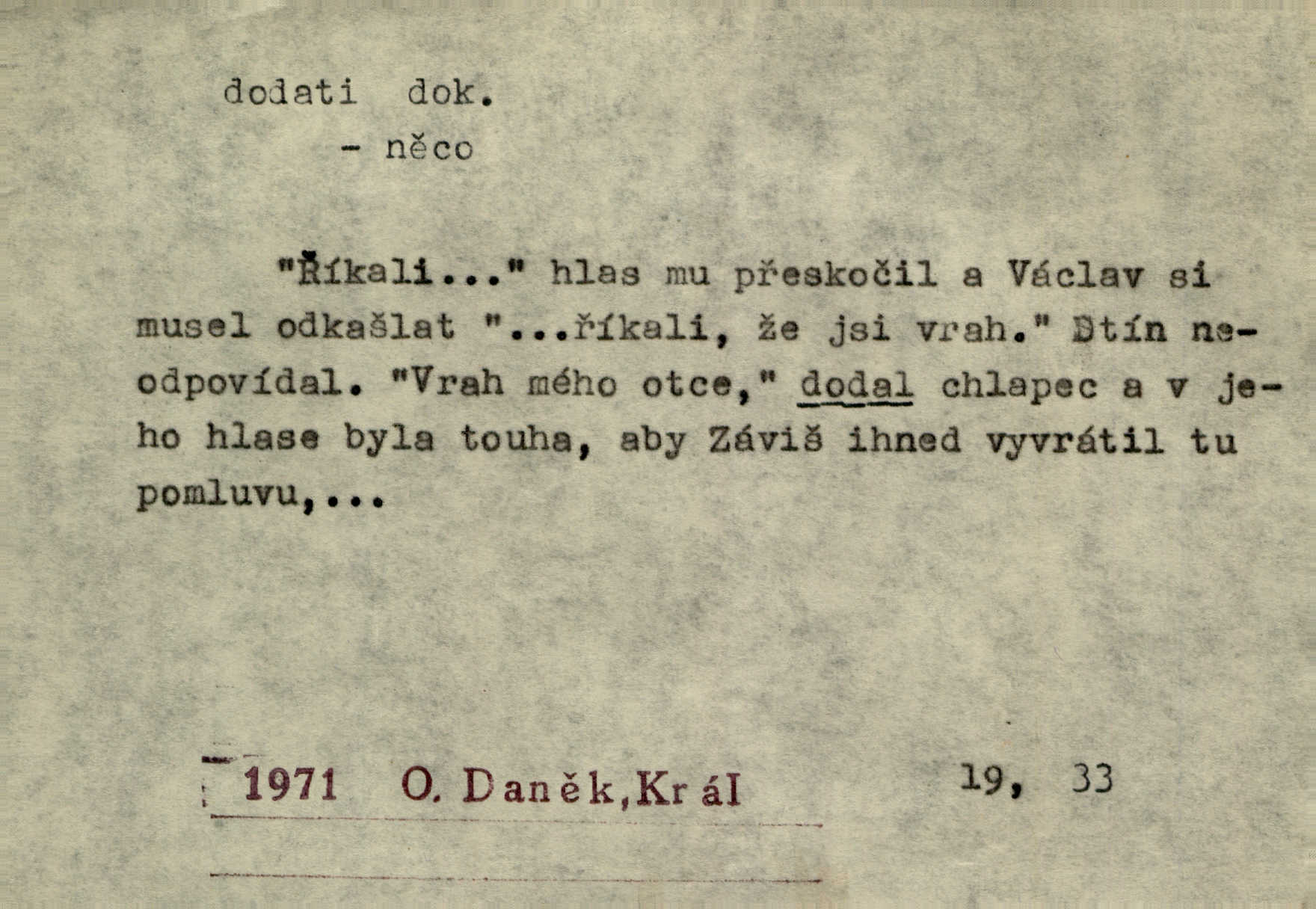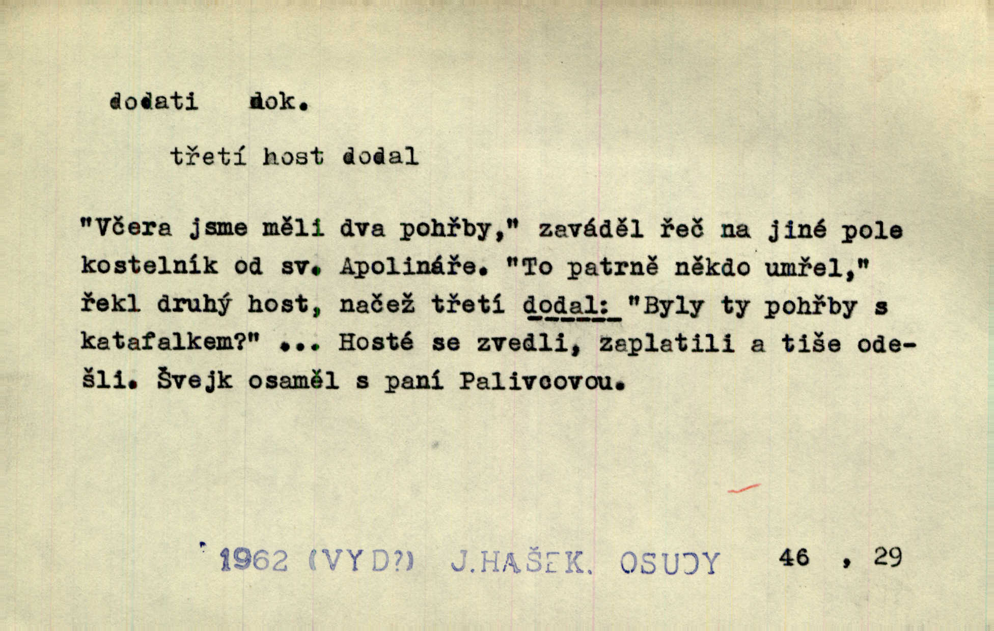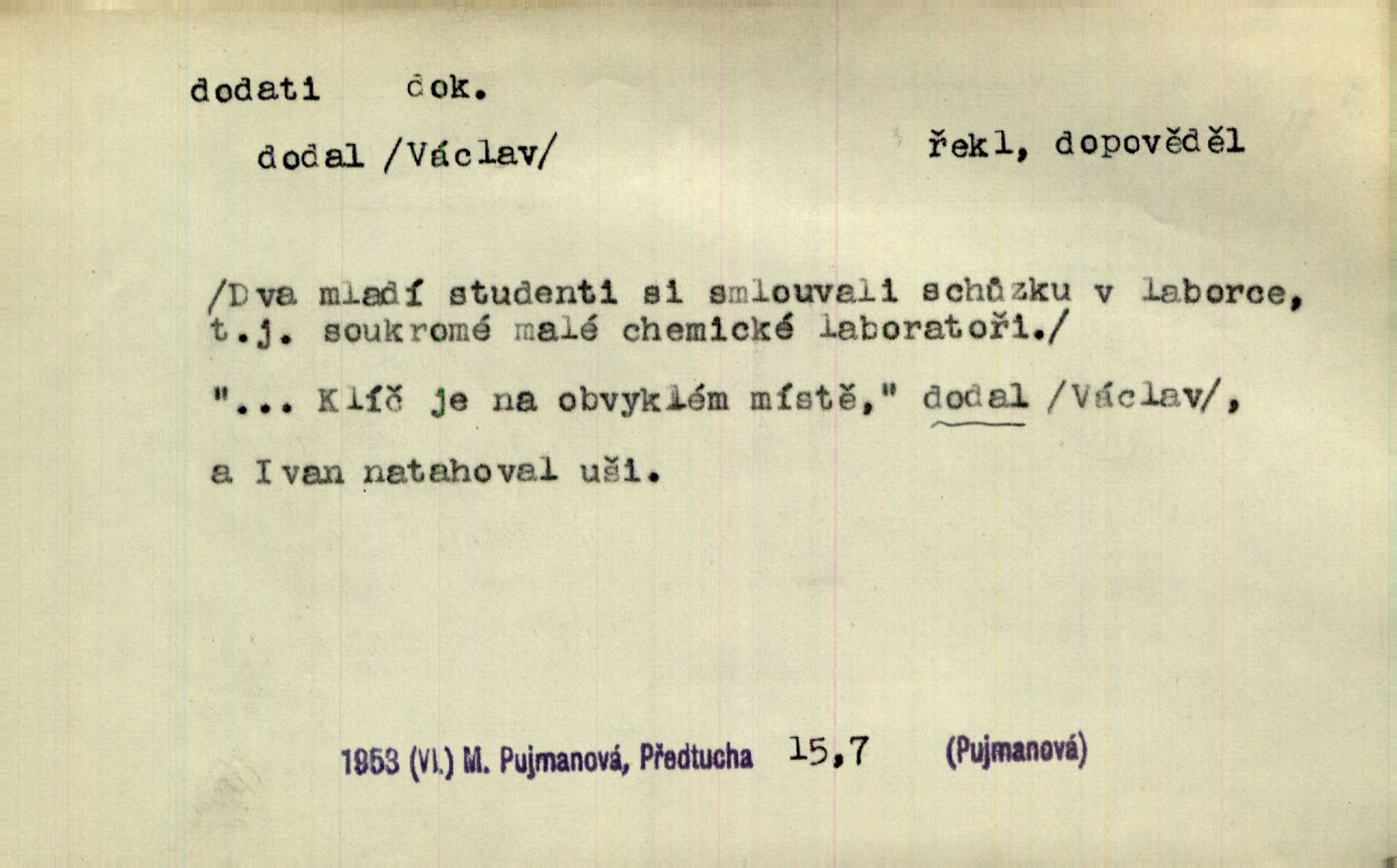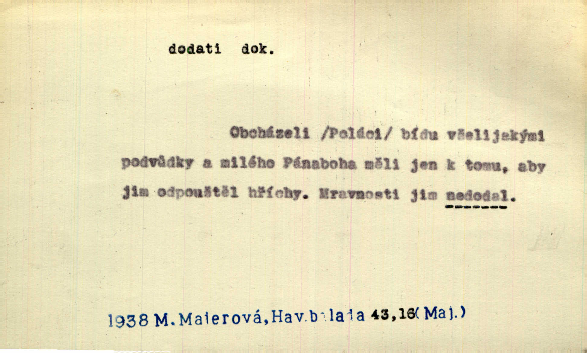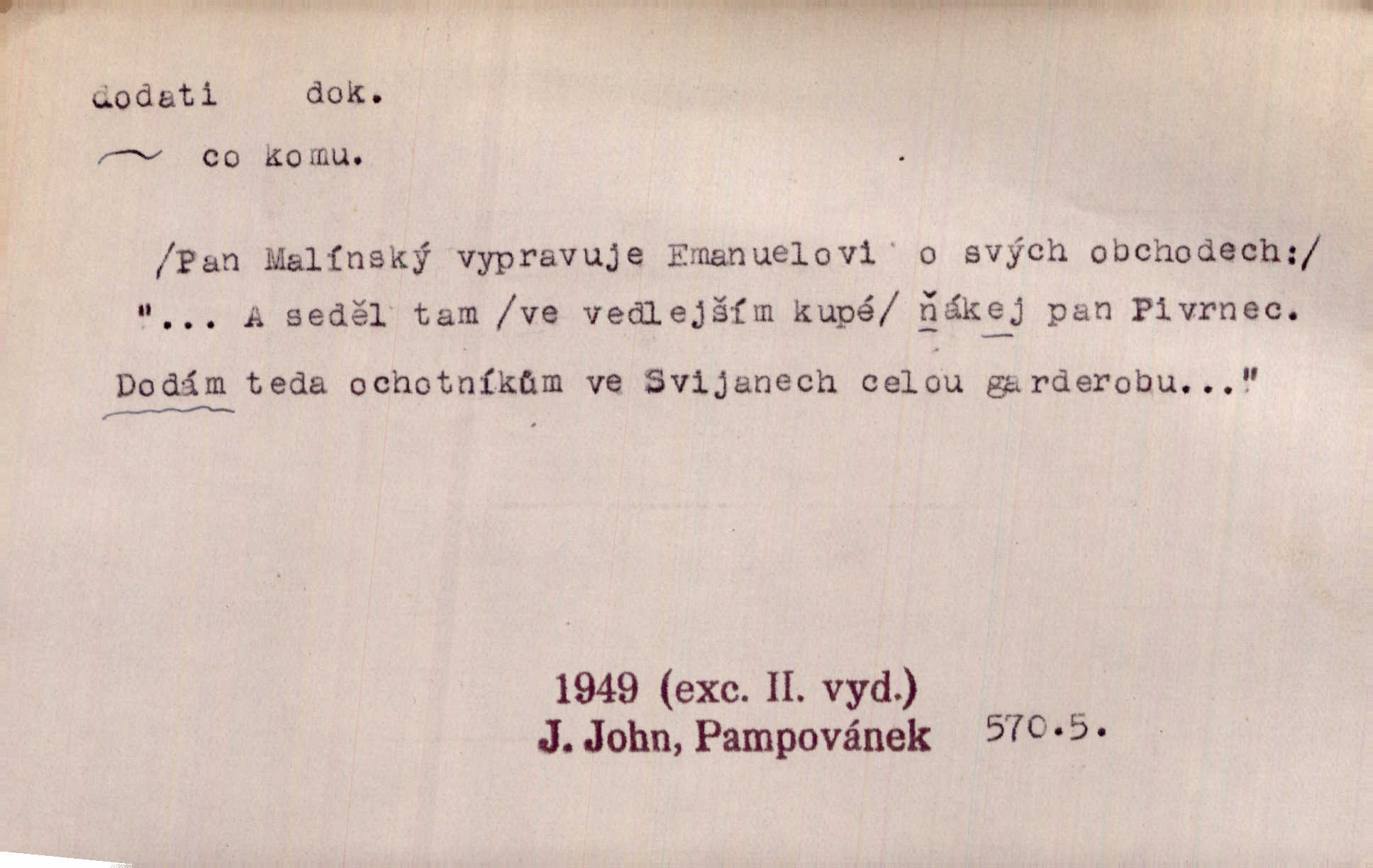 - dodati dok. (přech. přít. dodaje) (něco) přidati, připojiti. Knihu ještě příručnější činí dodané rejstříky. Ath. Ale hospodář je dobrý, dodal pán. Herb. To jsem řekl a Toník dodal, že bez Pavly sem taky nepůjde! Rais. D (v kartách) naposledy dáti. Bylo rázem půl desáté, když Havlíček prohlásil „hráč dodá“. V. Mrš. Obch. dodati na něco vrátiti drobnější peníze na větší. Úředník na zlatku dodal mu čtyřicet čtyři krejcary. Kam. D (někomu něčeho, zř. něco) rozmnožiti, zvětšiti, zesíliti. Ta slova jim dodala chuti. Něm. Dodal si smělosti. Prav. Dobytý úspěch dodal královským odvahu. Jir. D přitížiti, doraziti. Nachladil se, rozčilil, pak zpráva o smrti pána jeho a přítele mu dodala — leží. Jir. Jindy tam bývalo vozů jako ve vojanském táboře; železné dráhy však dodaly formanům a hospodám. Kosm. D (komu co) odevzdati, přinésti, přivézti, poskytnouti. Černoušek dodal Jelence lístek. Třeb. Budeme přejímat objednané potraviny. Hokynář je právě dodal. Mach. Rychtář dostal nařízení, aby Felcmana zatkl a na zámek dodal. Jir. Panství bylo zavázáno tolik a tolik vojáků dodati. Herb. Pošt. dodati (dodání) odevzdati adresátovi zásilku v místnostech úřadu (op. doručiti = odevzdati adresátovi do bytu). D dodati se dosti dáti. Děravého pytle nenaplníš a lakomci se nedodáš. Čel.