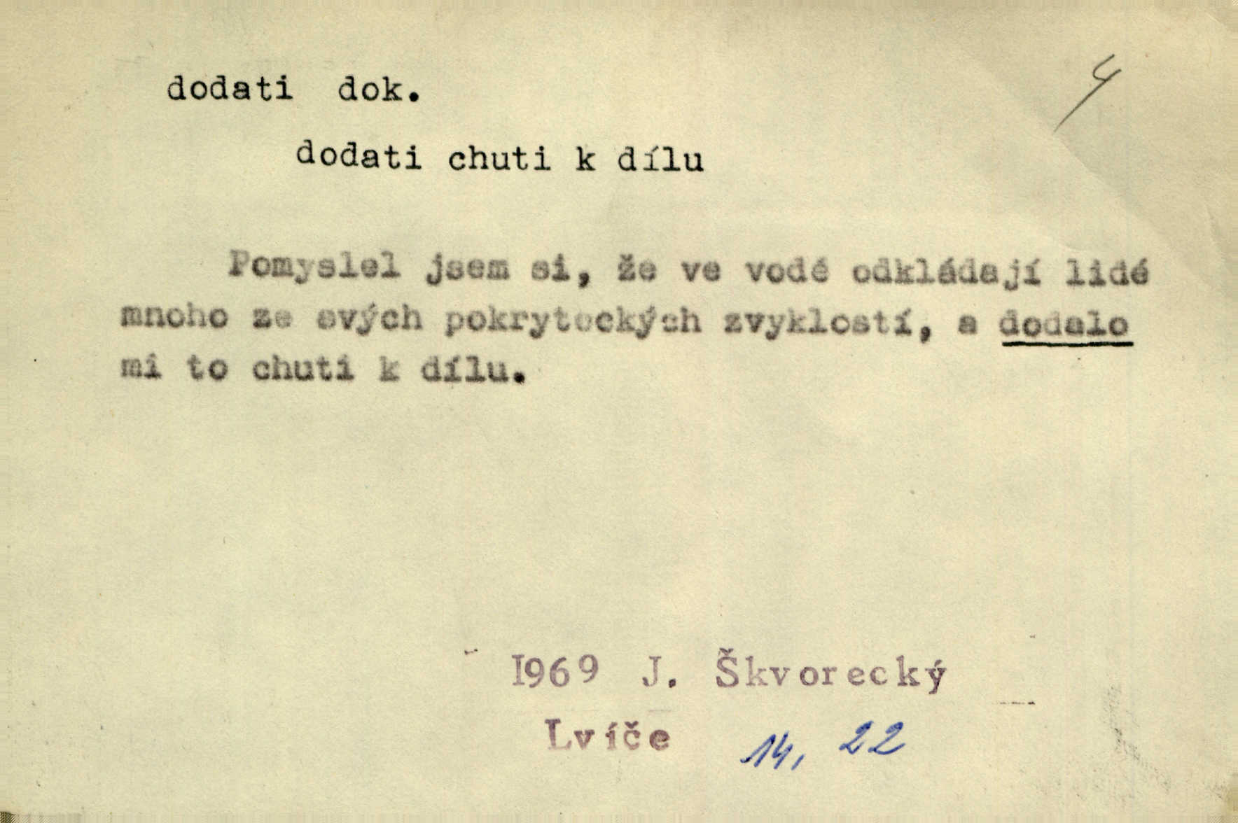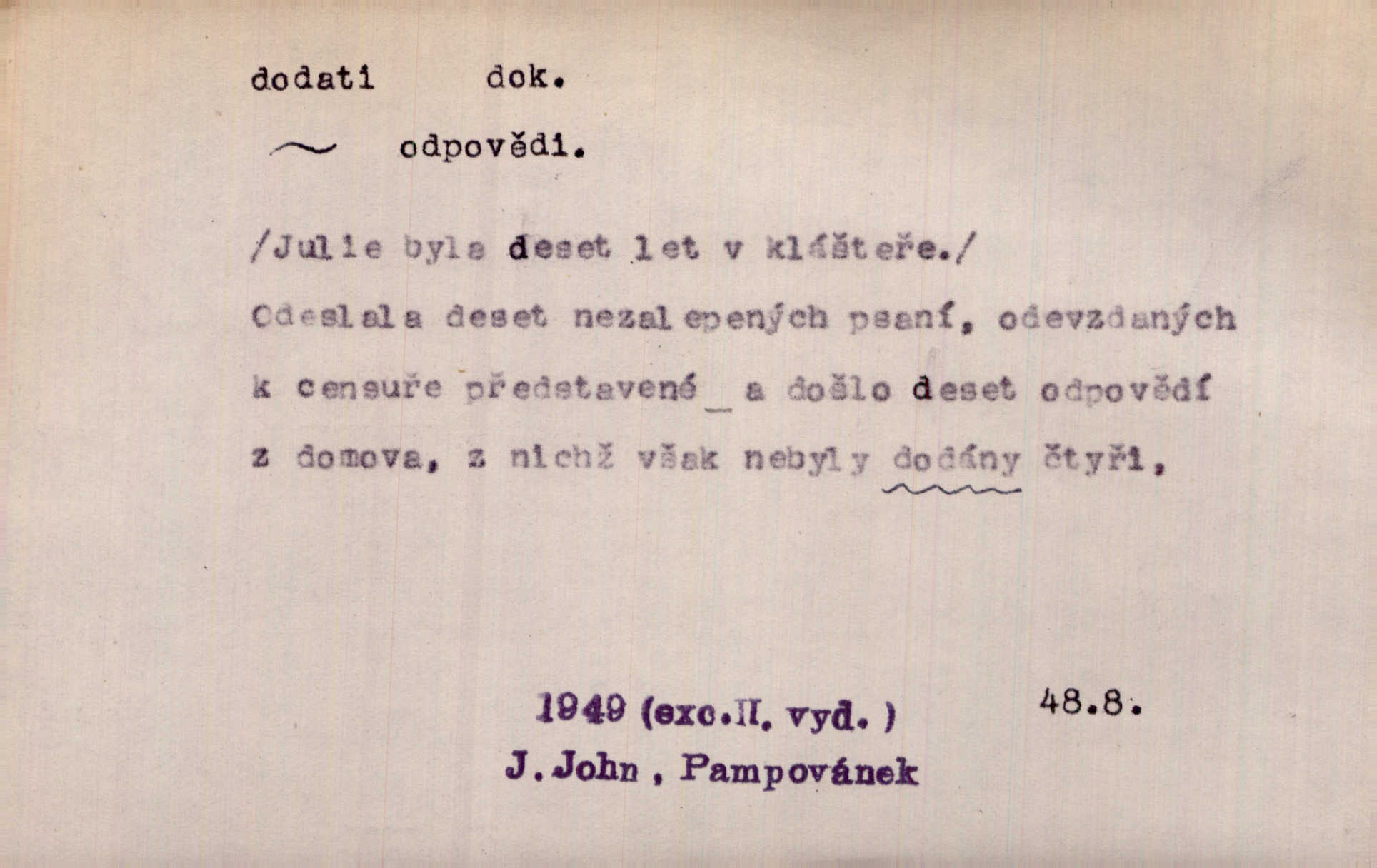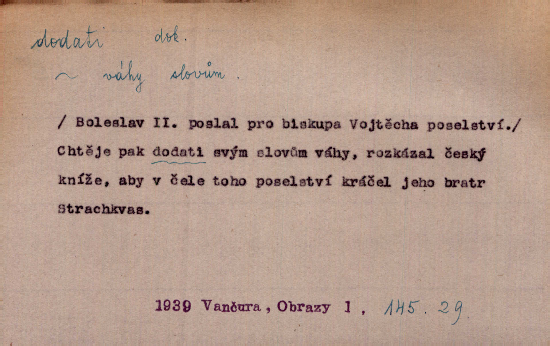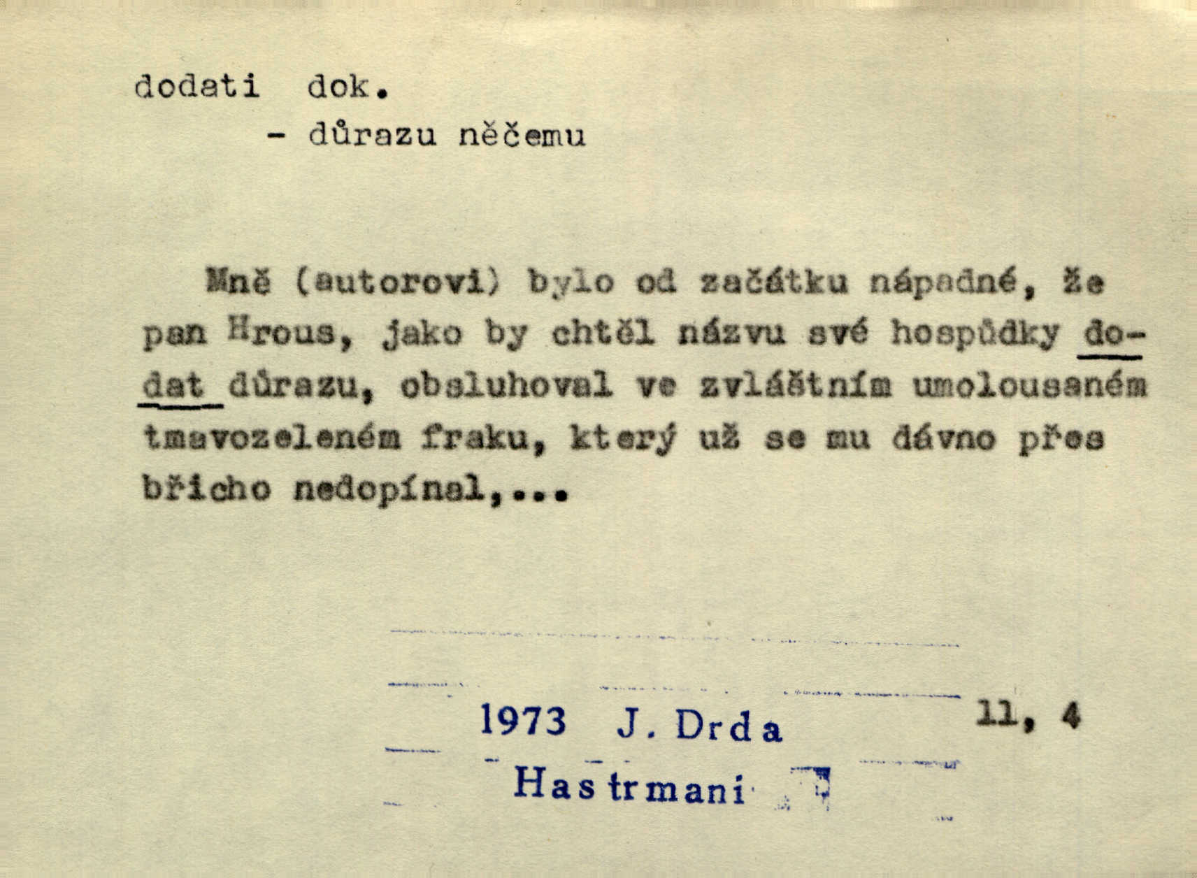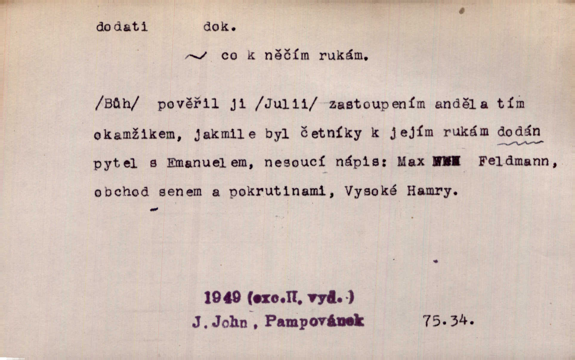 - dodati dok. (přech. přít. dodaje) (něco) přidati, připojiti. Knihu ještě příručnější činí dodané rejstříky. Ath. Ale hospodář je dobrý, dodal pán. Herb. To jsem řekl a Toník dodal, že bez Pavly sem taky nepůjde! Rais. D (v kartách) naposledy dáti. Bylo rázem půl desáté, když Havlíček prohlásil „hráč dodá“. V. Mrš. Obch. dodati na něco vrátiti drobnější peníze na větší. Úředník na zlatku dodal mu čtyřicet čtyři krejcary. Kam. D (někomu něčeho, zř. něco) rozmnožiti, zvětšiti, zesíliti. Ta slova jim dodala chuti. Něm. Dodal si smělosti. Prav. Dobytý úspěch dodal královským odvahu. Jir. D přitížiti, doraziti. Nachladil se, rozčilil, pak zpráva o smrti pána jeho a přítele mu dodala — leží. Jir. Jindy tam bývalo vozů jako ve vojanském táboře; železné dráhy však dodaly formanům a hospodám. Kosm. D (komu co) odevzdati, přinésti, přivézti, poskytnouti. Černoušek dodal Jelence lístek. Třeb. Budeme přejímat objednané potraviny. Hokynář je právě dodal. Mach. Rychtář dostal nařízení, aby Felcmana zatkl a na zámek dodal. Jir. Panství bylo zavázáno tolik a tolik vojáků dodati. Herb. Pošt. dodati (dodání) odevzdati adresátovi zásilku v místnostech úřadu (op. doručiti = odevzdati adresátovi do bytu). D dodati se dosti dáti. Děravého pytle nenaplníš a lakomci se nedodáš. Čel.