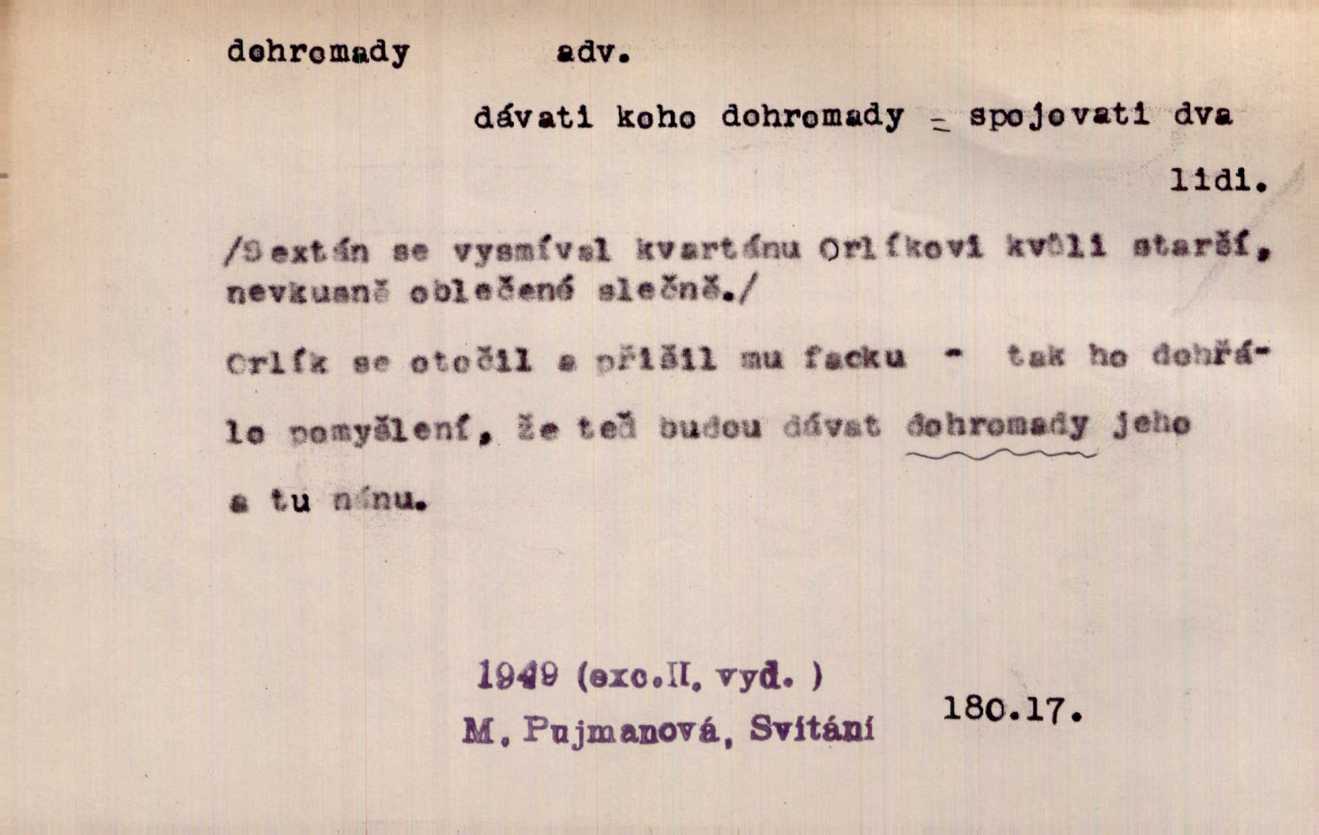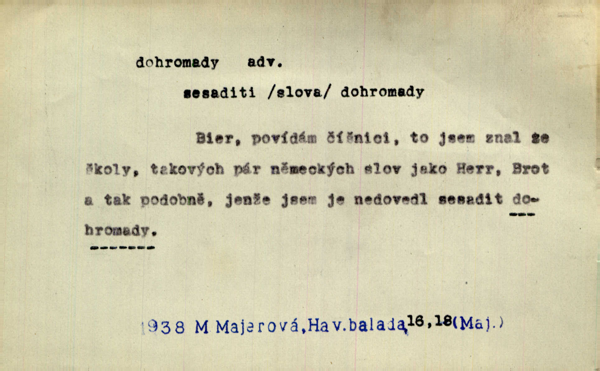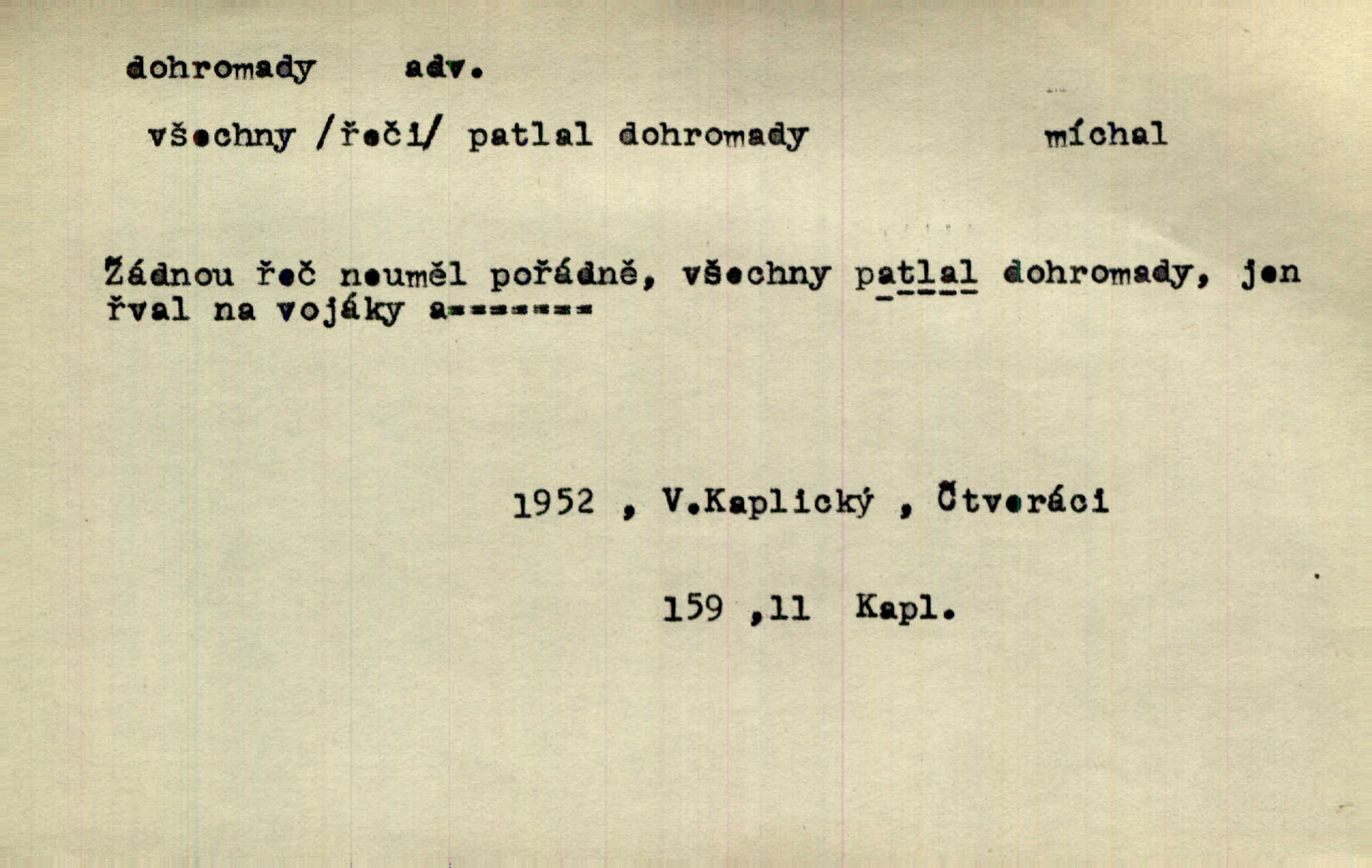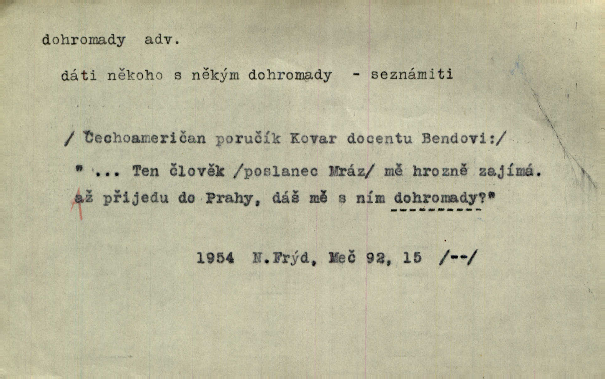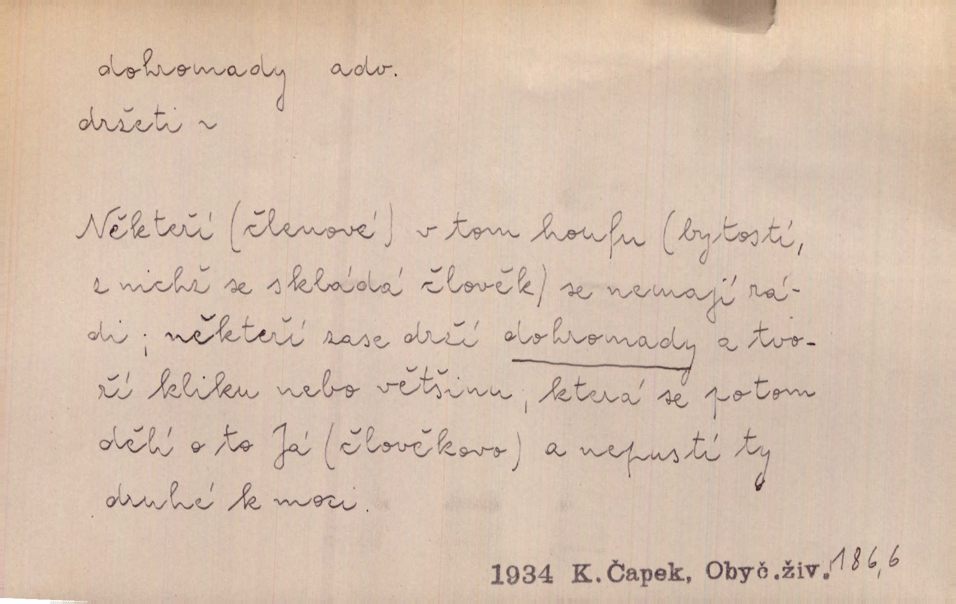 - dohromady adv. k sobě, v celek, společně, pospolu. Svažte ty otýpky dohromady otýpky, z nichž každá je svázána, svažte v hromadný celek. Hajný skládal pušku [rozebranou] dohromady. Svob. Úloha byla trudná: svésti všechny ty osoby na plese tak dohromady, aby po celý akt maškarní ples trval zajímavým. Durd. Pracovat s vámi dohromady je nebezpečno! Nejste spolehlivý! ve spolku s vámi. Čap. Ch. Oficírská šavle a naše břinkovka to nejde dohromady nesnáší se. Rais. S jedné strany má turkyň a soused žid s druhé strany řepu, to nehraje dohromady nehodí se k sobě. Herb. Trvalo jí chvilku, než si v hlavě dala dohromady, že to je „ten pravař“ uvědomila si. H. Dvoř. Již se [kramáři] dostali dohromady, klejí, nadávají si do hádky. Prav. Baby sedící v hospodě pod okny strkaly hlavy dohromady: Všimly ste si, tetko? šuškaly si. Herb. Namluvíš si fešnou holku… dáte se dohromady budete žíti spolu. Kronb. Dejte něco dohromady zaranžujte. Kronb. Seberte rozum dohromady uvažte dobře! Něm. Přišli dva sedláci, jeden měl hřebce, druhý kobylu. Oba koně ale měli dohromady v společném majetku. Něm. D celkem, úhrnem, vesměs. Zaznamenává dohromady 1558 čísel [valdštejské literatury]. Pekárek. Slova, lesklé věty a dohromady nic. Mach.