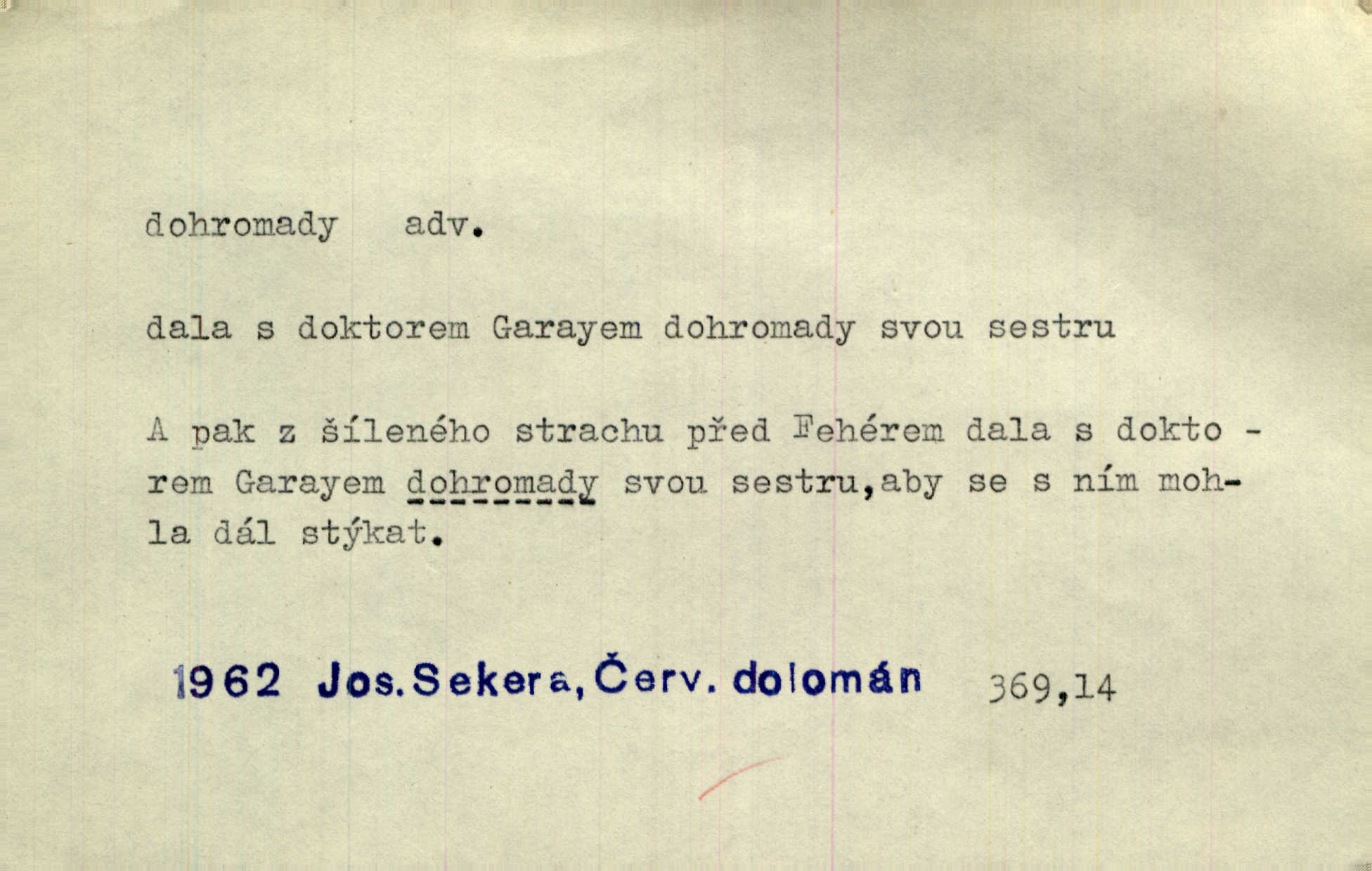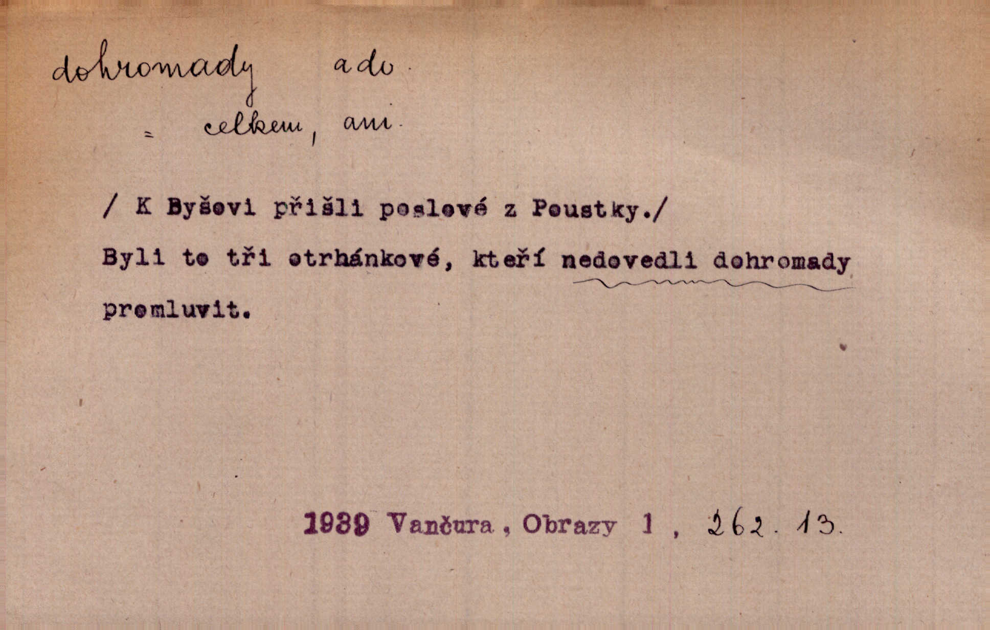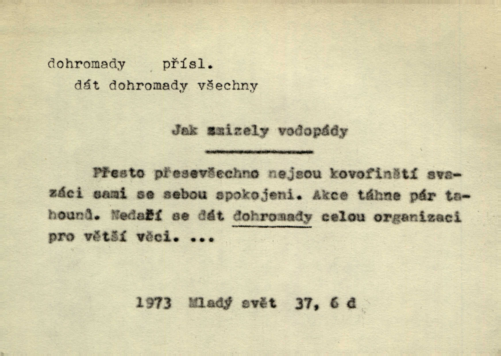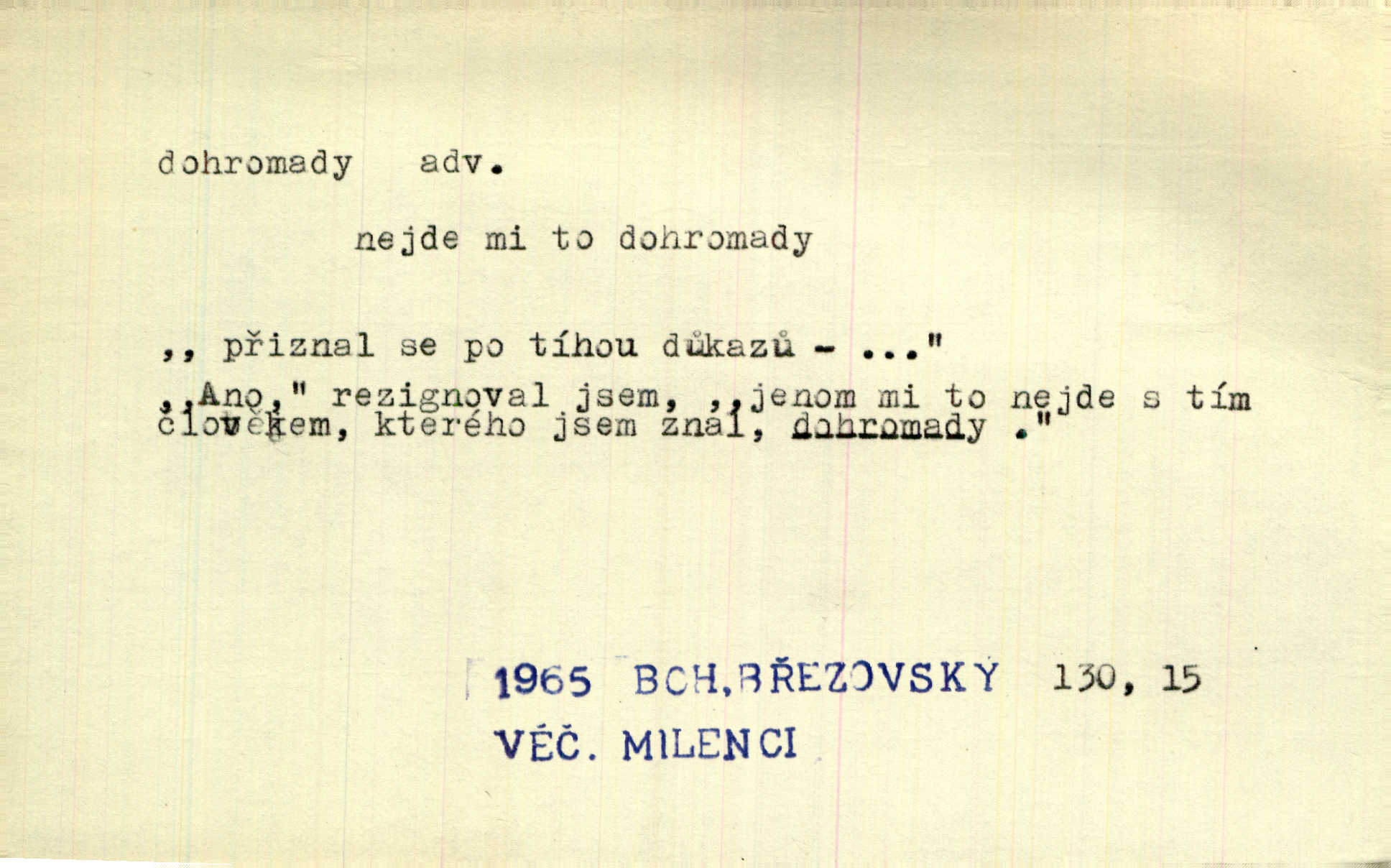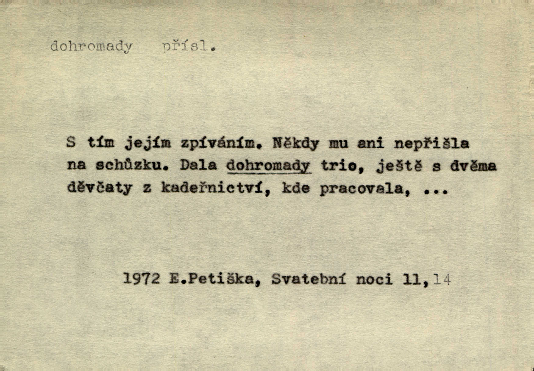 - dohromady adv. k sobě, v celek, společně, pospolu. Svažte ty otýpky dohromady otýpky, z nichž každá je svázána, svažte v hromadný celek. Hajný skládal pušku [rozebranou] dohromady. Svob. Úloha byla trudná: svésti všechny ty osoby na plese tak dohromady, aby po celý akt maškarní ples trval zajímavým. Durd. Pracovat s vámi dohromady je nebezpečno! Nejste spolehlivý! ve spolku s vámi. Čap. Ch. Oficírská šavle a naše břinkovka to nejde dohromady nesnáší se. Rais. S jedné strany má turkyň a soused žid s druhé strany řepu, to nehraje dohromady nehodí se k sobě. Herb. Trvalo jí chvilku, než si v hlavě dala dohromady, že to je „ten pravař“ uvědomila si. H. Dvoř. Již se [kramáři] dostali dohromady, klejí, nadávají si do hádky. Prav. Baby sedící v hospodě pod okny strkaly hlavy dohromady: Všimly ste si, tetko? šuškaly si. Herb. Namluvíš si fešnou holku… dáte se dohromady budete žíti spolu. Kronb. Dejte něco dohromady zaranžujte. Kronb. Seberte rozum dohromady uvažte dobře! Něm. Přišli dva sedláci, jeden měl hřebce, druhý kobylu. Oba koně ale měli dohromady v společném majetku. Něm. D celkem, úhrnem, vesměs. Zaznamenává dohromady 1558 čísel [valdštejské literatury]. Pekárek. Slova, lesklé věty a dohromady nic. Mach.