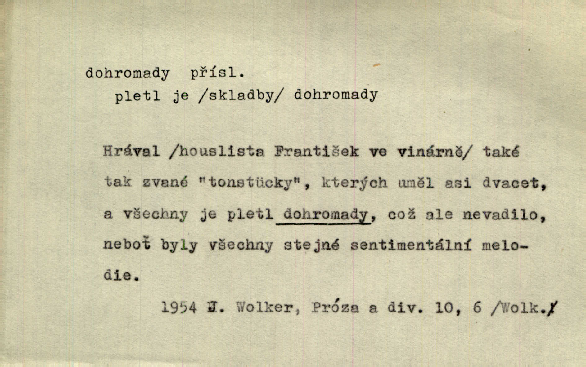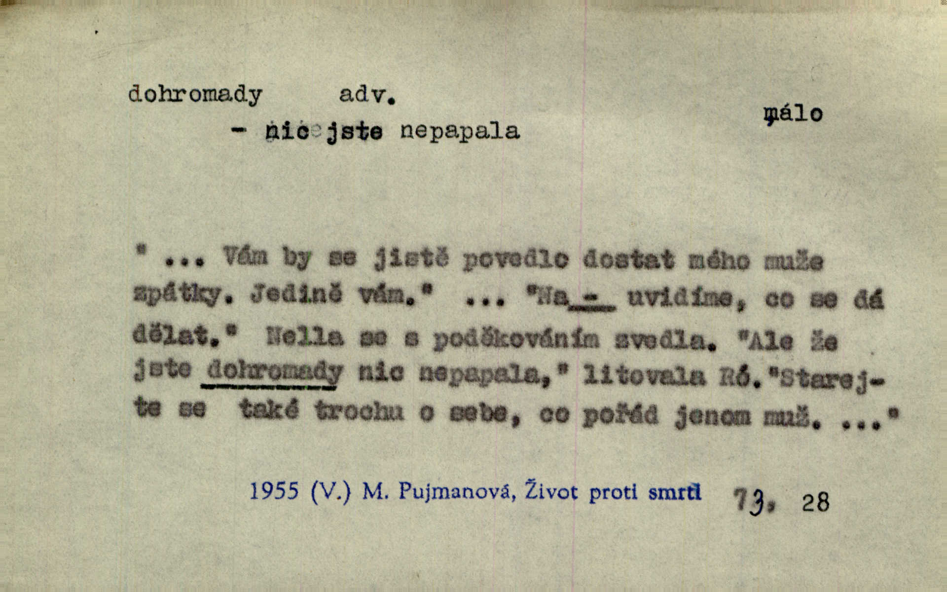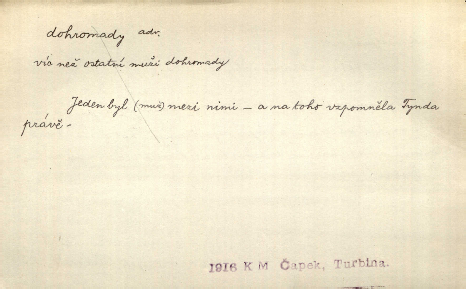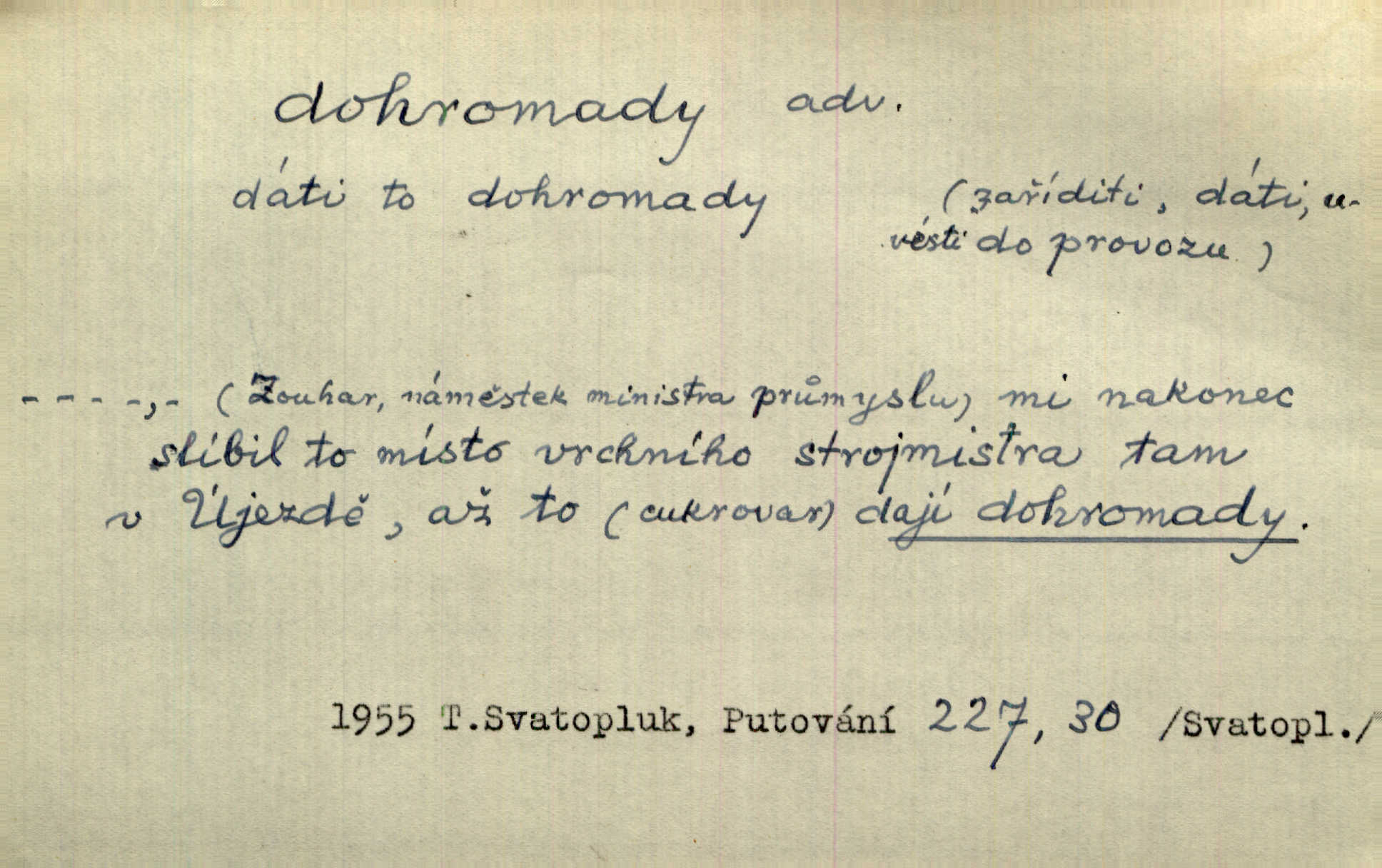 - dohromady adv. k sobě, v celek, společně, pospolu. Svažte ty otýpky dohromady otýpky, z nichž každá je svázána, svažte v hromadný celek. Hajný skládal pušku [rozebranou] dohromady. Svob. Úloha byla trudná: svésti všechny ty osoby na plese tak dohromady, aby po celý akt maškarní ples trval zajímavým. Durd. Pracovat s vámi dohromady je nebezpečno! Nejste spolehlivý! ve spolku s vámi. Čap. Ch. Oficírská šavle a naše břinkovka to nejde dohromady nesnáší se. Rais. S jedné strany má turkyň a soused žid s druhé strany řepu, to nehraje dohromady nehodí se k sobě. Herb. Trvalo jí chvilku, než si v hlavě dala dohromady, že to je „ten pravař“ uvědomila si. H. Dvoř. Již se [kramáři] dostali dohromady, klejí, nadávají si do hádky. Prav. Baby sedící v hospodě pod okny strkaly hlavy dohromady: Všimly ste si, tetko? šuškaly si. Herb. Namluvíš si fešnou holku… dáte se dohromady budete žíti spolu. Kronb. Dejte něco dohromady zaranžujte. Kronb. Seberte rozum dohromady uvažte dobře! Něm. Přišli dva sedláci, jeden měl hřebce, druhý kobylu. Oba koně ale měli dohromady v společném majetku. Něm. D celkem, úhrnem, vesměs. Zaznamenává dohromady 1558 čísel [valdštejské literatury]. Pekárek. Slova, lesklé věty a dohromady nic. Mach.
