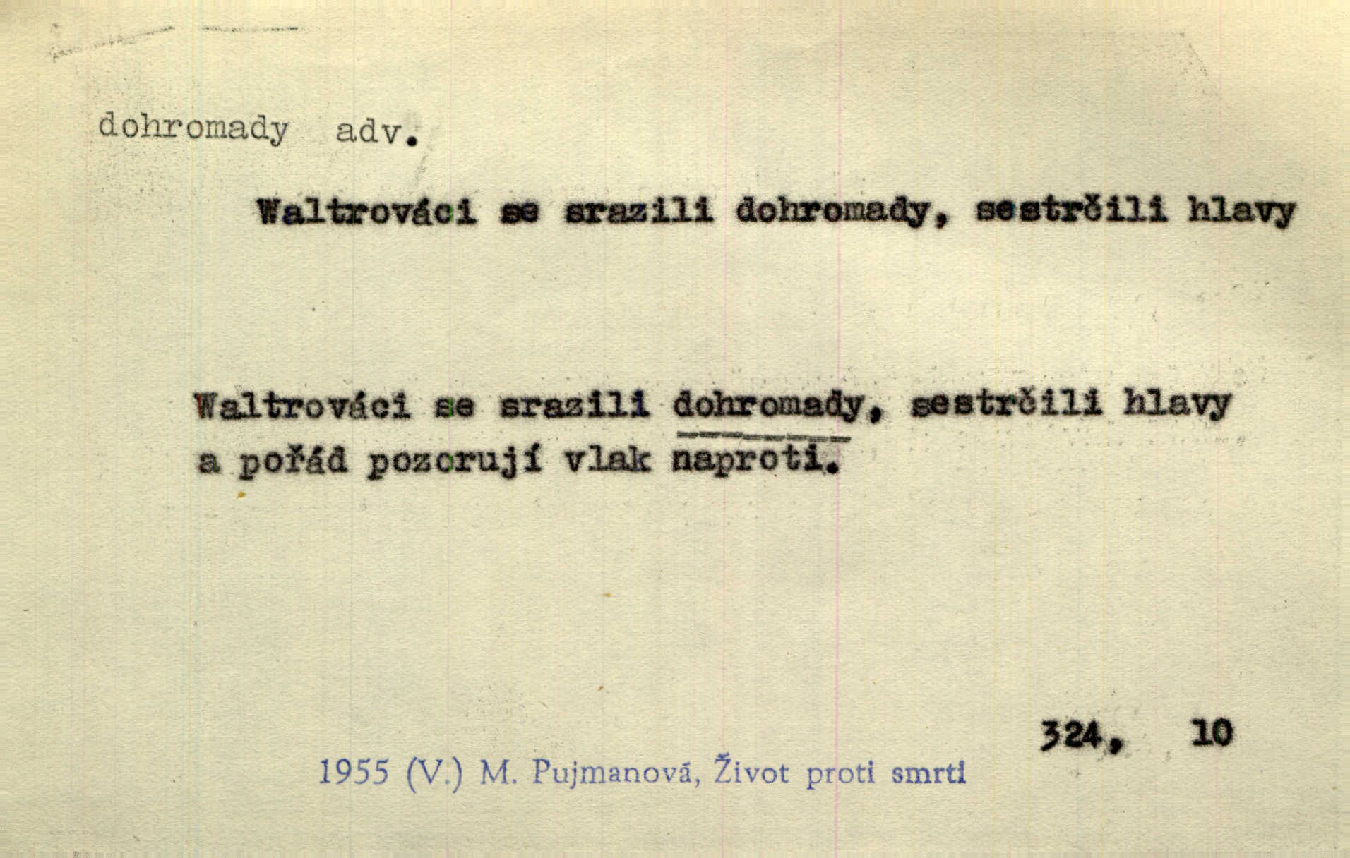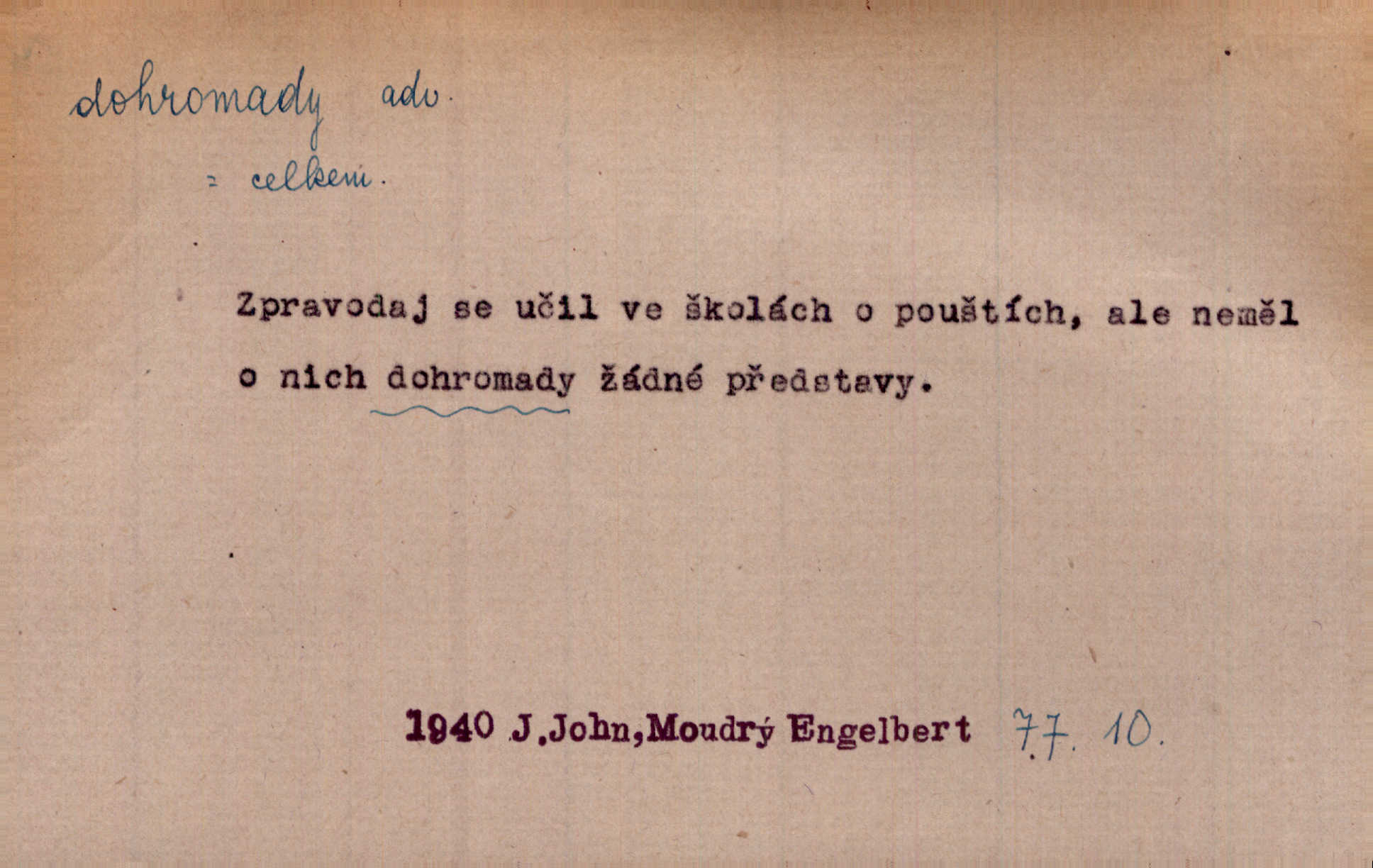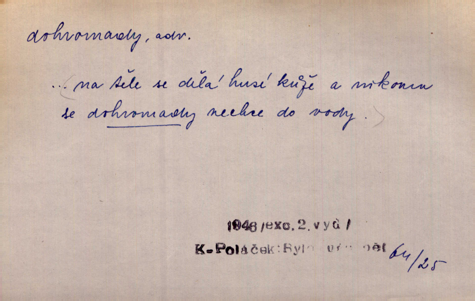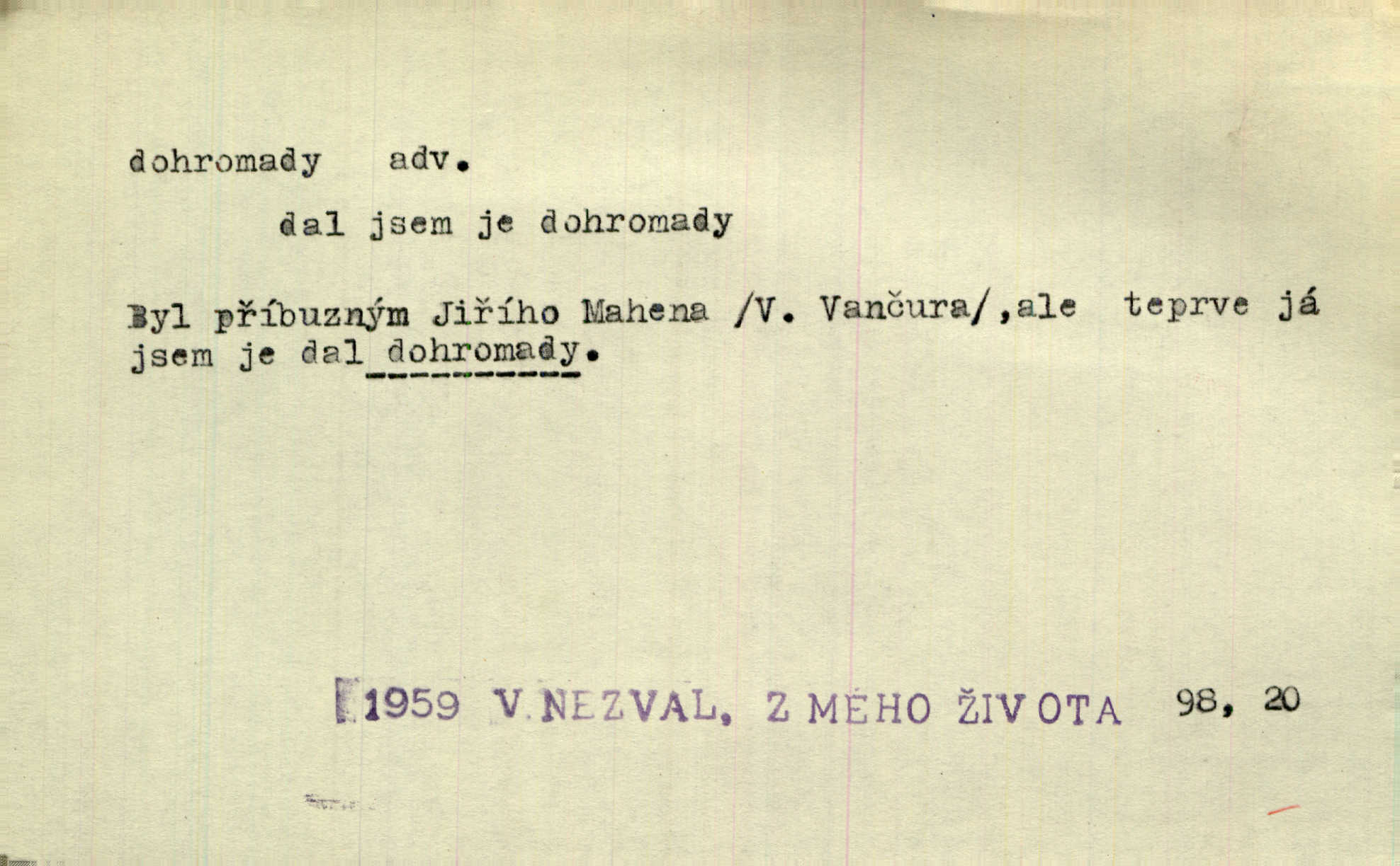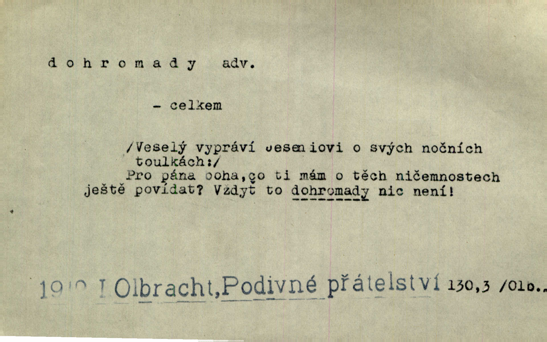- dohromady adv. k sobě, v celek, společně, pospolu. Svažte ty otýpky dohromady otýpky, z nichž každá je svázána, svažte v hromadný celek. Hajný skládal pušku [rozebranou] dohromady. Svob. Úloha byla trudná: svésti všechny ty osoby na plese tak dohromady, aby po celý akt maškarní ples trval zajímavým. Durd. Pracovat s vámi dohromady je nebezpečno! Nejste spolehlivý! ve spolku s vámi. Čap. Ch. Oficírská šavle a naše břinkovka to nejde dohromady nesnáší se. Rais. S jedné strany má turkyň a soused žid s druhé strany řepu, to nehraje dohromady nehodí se k sobě. Herb. Trvalo jí chvilku, než si v hlavě dala dohromady, že to je „ten pravař“ uvědomila si. H. Dvoř. Již se [kramáři] dostali dohromady, klejí, nadávají si do hádky. Prav. Baby sedící v hospodě pod okny strkaly hlavy dohromady: Všimly ste si, tetko? šuškaly si. Herb. Namluvíš si fešnou holku… dáte se dohromady budete žíti spolu. Kronb. Dejte něco dohromady zaranžujte. Kronb. Seberte rozum dohromady uvažte dobře! Něm. Přišli dva sedláci, jeden měl hřebce, druhý kobylu. Oba koně ale měli dohromady v společném majetku. Něm. D celkem, úhrnem, vesměs. Zaznamenává dohromady 1558 čísel [valdštejské literatury]. Pekárek. Slova, lesklé věty a dohromady nic. Mach.