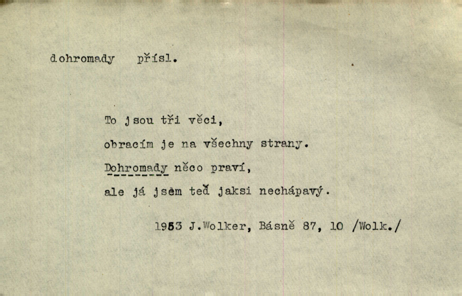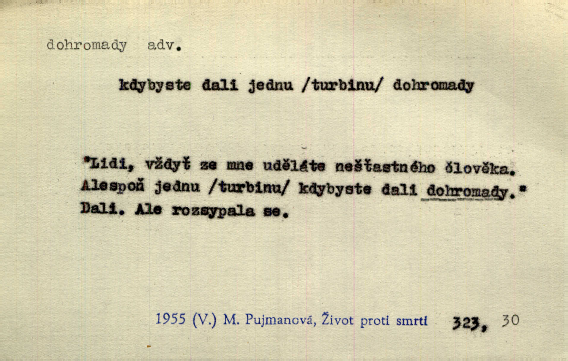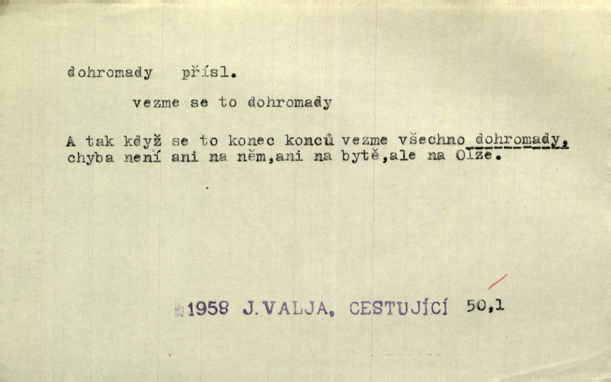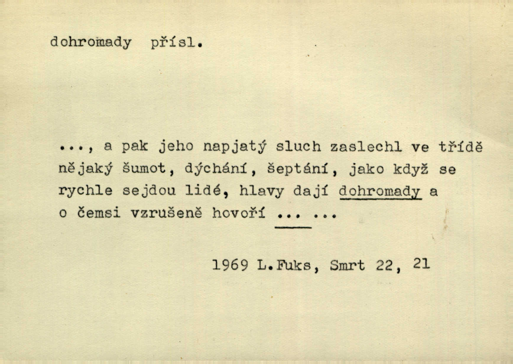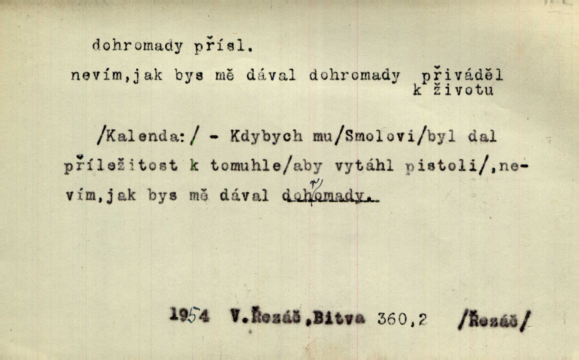- dohromady adv. k sobě, v celek, společně, pospolu. Svažte ty otýpky dohromady otýpky, z nichž každá je svázána, svažte v hromadný celek. Hajný skládal pušku [rozebranou] dohromady. Svob. Úloha byla trudná: svésti všechny ty osoby na plese tak dohromady, aby po celý akt maškarní ples trval zajímavým. Durd. Pracovat s vámi dohromady je nebezpečno! Nejste spolehlivý! ve spolku s vámi. Čap. Ch. Oficírská šavle a naše břinkovka to nejde dohromady nesnáší se. Rais. S jedné strany má turkyň a soused žid s druhé strany řepu, to nehraje dohromady nehodí se k sobě. Herb. Trvalo jí chvilku, než si v hlavě dala dohromady, že to je „ten pravař“ uvědomila si. H. Dvoř. Již se [kramáři] dostali dohromady, klejí, nadávají si do hádky. Prav. Baby sedící v hospodě pod okny strkaly hlavy dohromady: Všimly ste si, tetko? šuškaly si. Herb. Namluvíš si fešnou holku… dáte se dohromady budete žíti spolu. Kronb. Dejte něco dohromady zaranžujte. Kronb. Seberte rozum dohromady uvažte dobře! Něm. Přišli dva sedláci, jeden měl hřebce, druhý kobylu. Oba koně ale měli dohromady v společném majetku. Něm. D celkem, úhrnem, vesměs. Zaznamenává dohromady 1558 čísel [valdštejské literatury]. Pekárek. Slova, lesklé věty a dohromady nic. Mach.