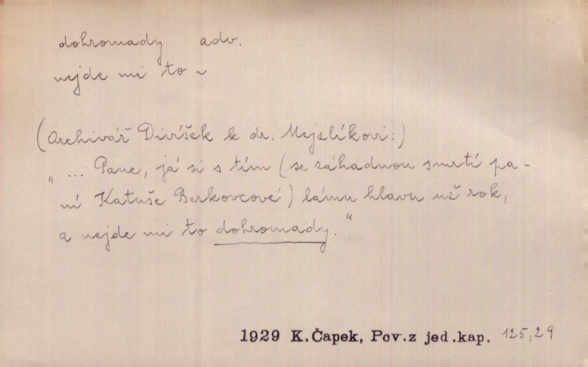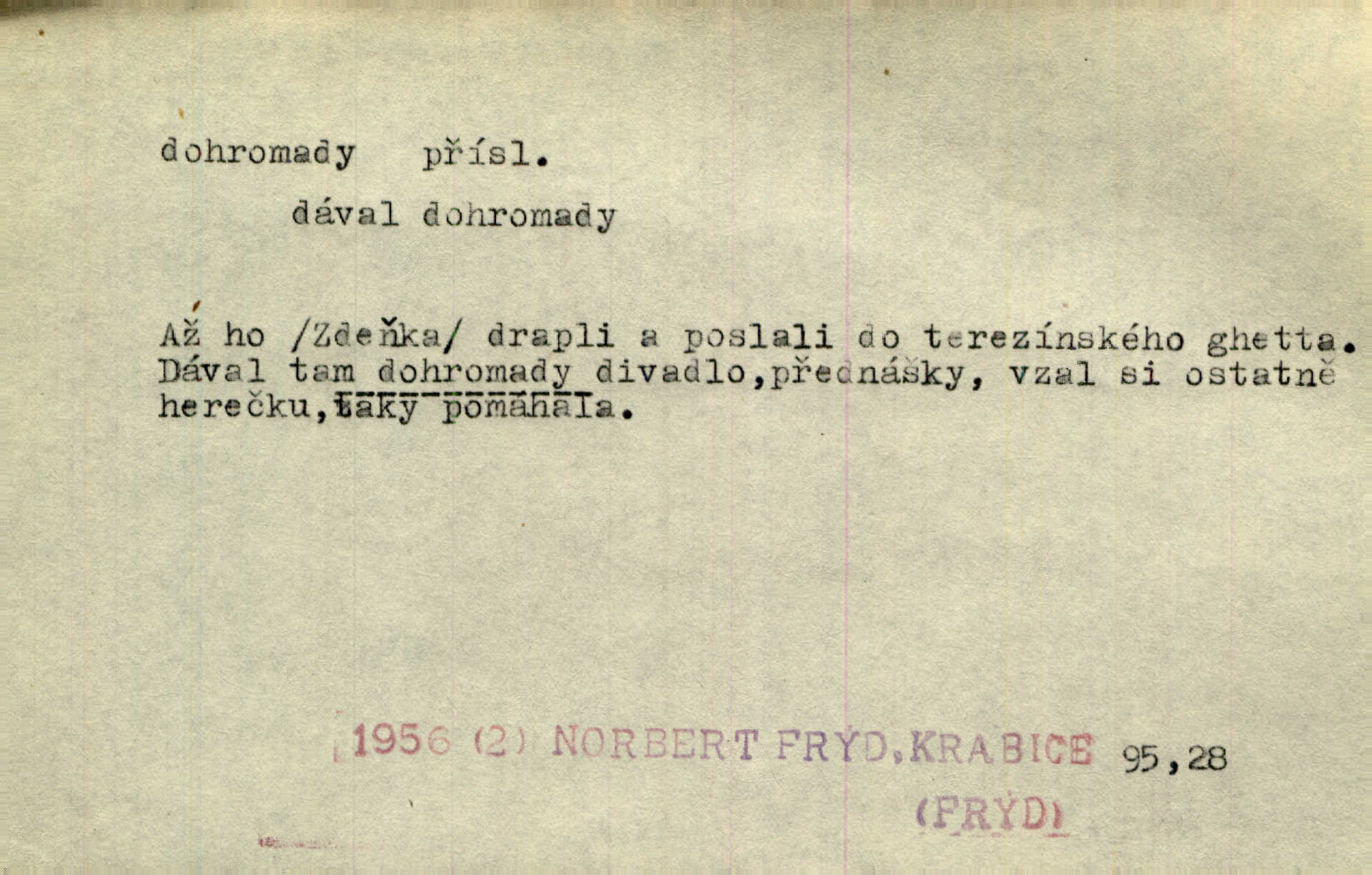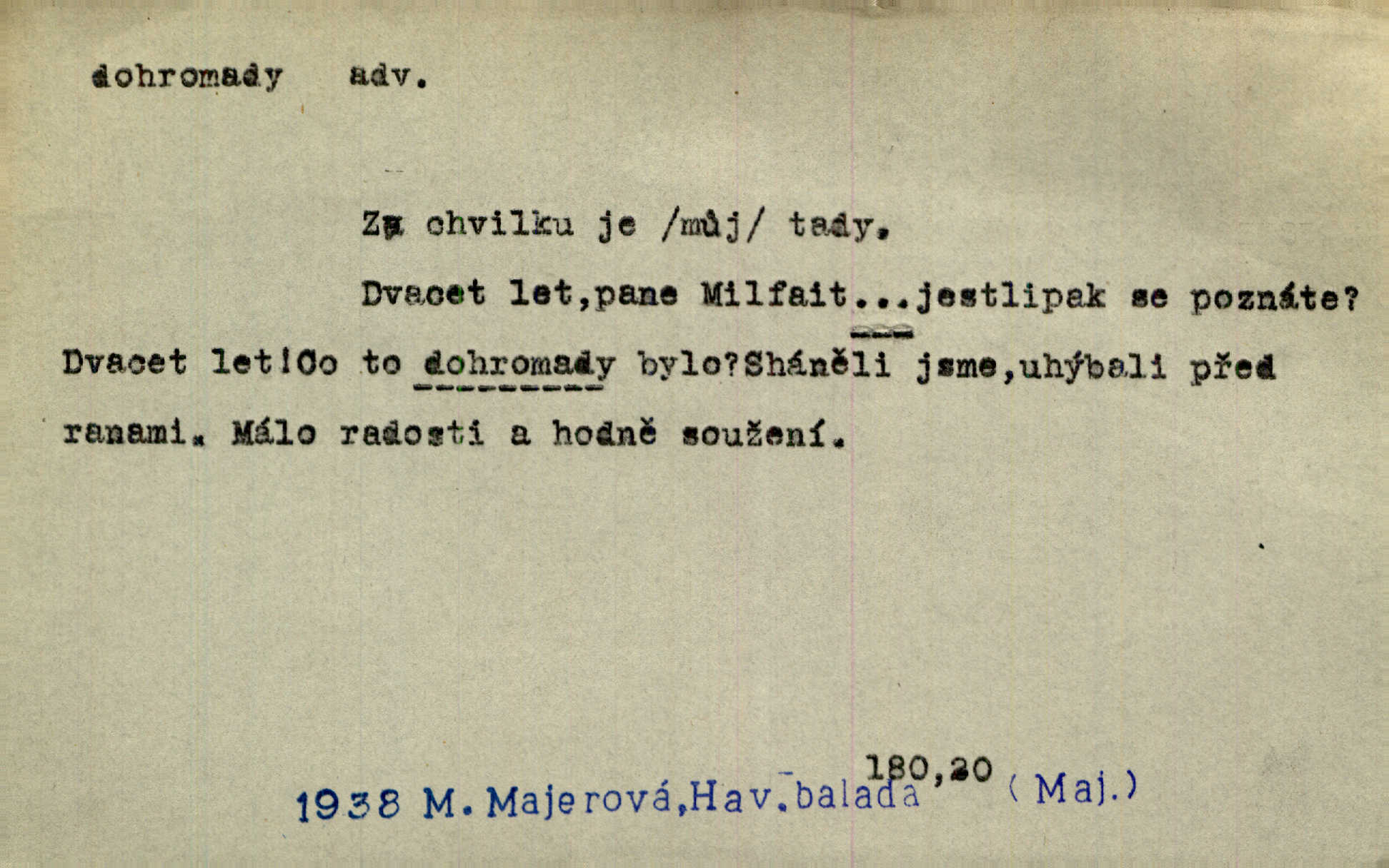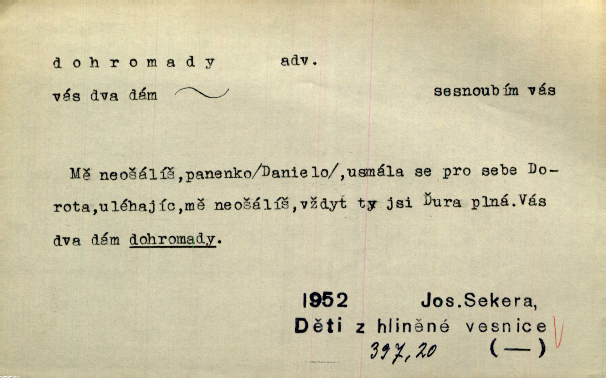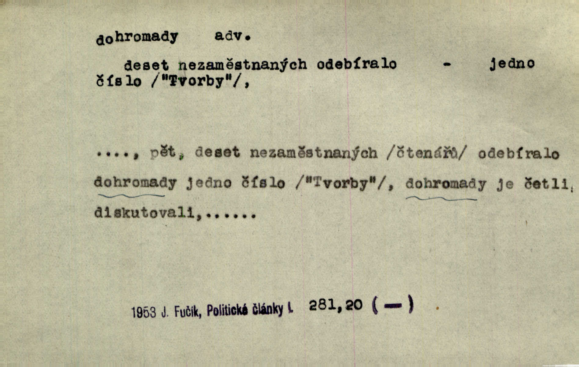 - dohromady adv. k sobě, v celek, společně, pospolu. Svažte ty otýpky dohromady otýpky, z nichž každá je svázána, svažte v hromadný celek. Hajný skládal pušku [rozebranou] dohromady. Svob. Úloha byla trudná: svésti všechny ty osoby na plese tak dohromady, aby po celý akt maškarní ples trval zajímavým. Durd. Pracovat s vámi dohromady je nebezpečno! Nejste spolehlivý! ve spolku s vámi. Čap. Ch. Oficírská šavle a naše břinkovka to nejde dohromady nesnáší se. Rais. S jedné strany má turkyň a soused žid s druhé strany řepu, to nehraje dohromady nehodí se k sobě. Herb. Trvalo jí chvilku, než si v hlavě dala dohromady, že to je „ten pravař“ uvědomila si. H. Dvoř. Již se [kramáři] dostali dohromady, klejí, nadávají si do hádky. Prav. Baby sedící v hospodě pod okny strkaly hlavy dohromady: Všimly ste si, tetko? šuškaly si. Herb. Namluvíš si fešnou holku… dáte se dohromady budete žíti spolu. Kronb. Dejte něco dohromady zaranžujte. Kronb. Seberte rozum dohromady uvažte dobře! Něm. Přišli dva sedláci, jeden měl hřebce, druhý kobylu. Oba koně ale měli dohromady v společném majetku. Něm. D celkem, úhrnem, vesměs. Zaznamenává dohromady 1558 čísel [valdštejské literatury]. Pekárek. Slova, lesklé věty a dohromady nic. Mach.