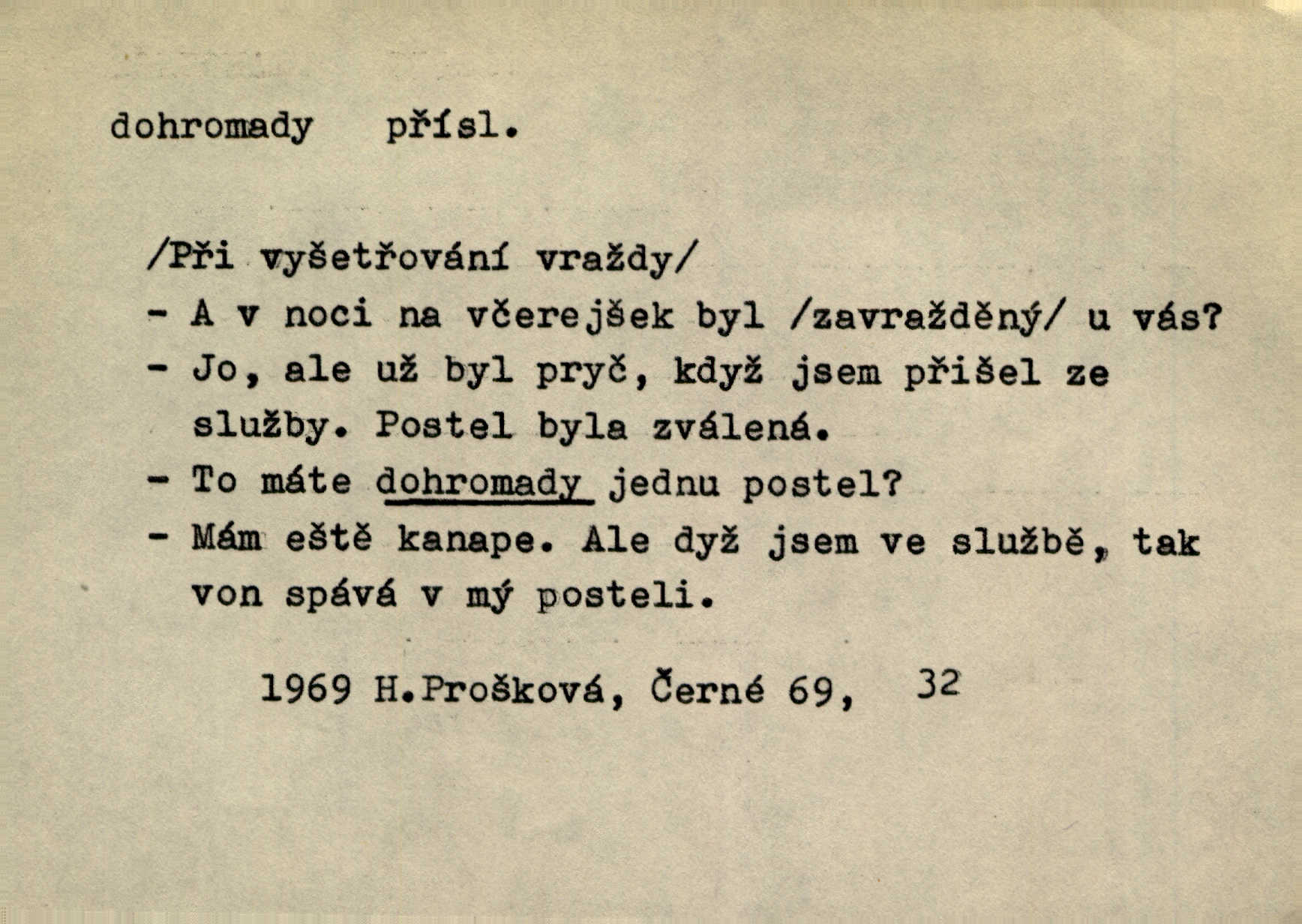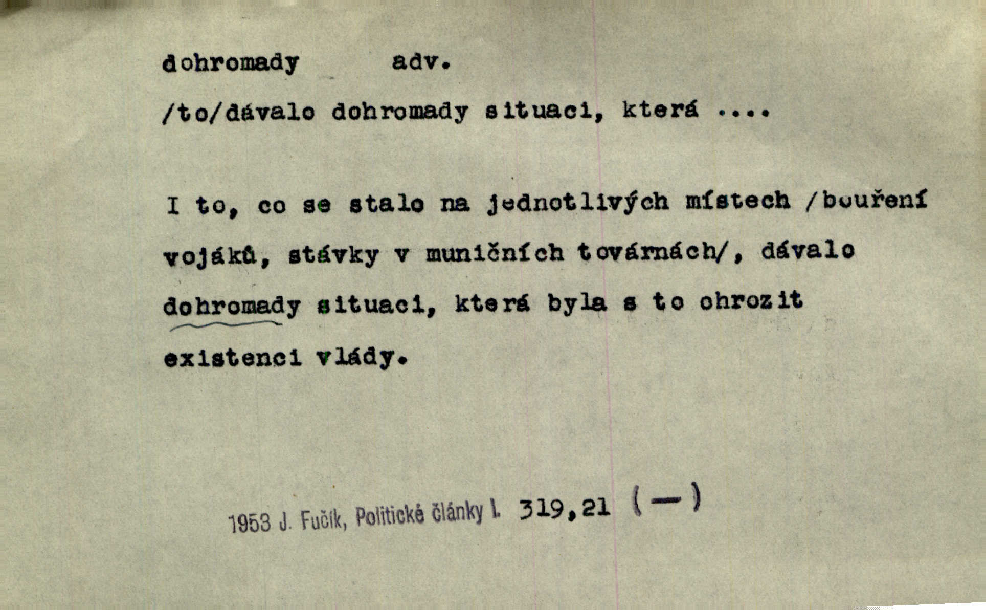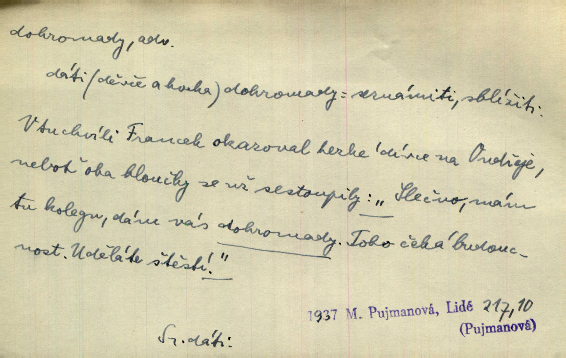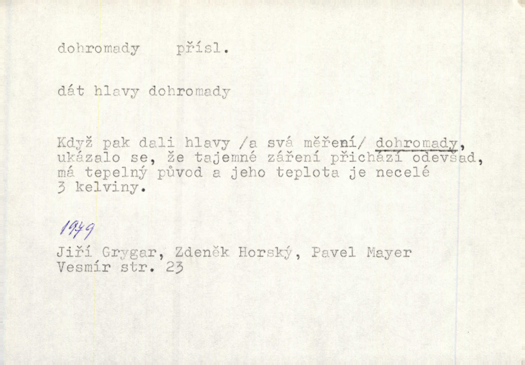 - dohromady adv. k sobě, v celek, společně, pospolu. Svažte ty otýpky dohromady otýpky, z nichž každá je svázána, svažte v hromadný celek. Hajný skládal pušku [rozebranou] dohromady. Svob. Úloha byla trudná: svésti všechny ty osoby na plese tak dohromady, aby po celý akt maškarní ples trval zajímavým. Durd. Pracovat s vámi dohromady je nebezpečno! Nejste spolehlivý! ve spolku s vámi. Čap. Ch. Oficírská šavle a naše břinkovka to nejde dohromady nesnáší se. Rais. S jedné strany má turkyň a soused žid s druhé strany řepu, to nehraje dohromady nehodí se k sobě. Herb. Trvalo jí chvilku, než si v hlavě dala dohromady, že to je „ten pravař“ uvědomila si. H. Dvoř. Již se [kramáři] dostali dohromady, klejí, nadávají si do hádky. Prav. Baby sedící v hospodě pod okny strkaly hlavy dohromady: Všimly ste si, tetko? šuškaly si. Herb. Namluvíš si fešnou holku… dáte se dohromady budete žíti spolu. Kronb. Dejte něco dohromady zaranžujte. Kronb. Seberte rozum dohromady uvažte dobře! Něm. Přišli dva sedláci, jeden měl hřebce, druhý kobylu. Oba koně ale měli dohromady v společném majetku. Něm. D celkem, úhrnem, vesměs. Zaznamenává dohromady 1558 čísel [valdštejské literatury]. Pekárek. Slova, lesklé věty a dohromady nic. Mach.