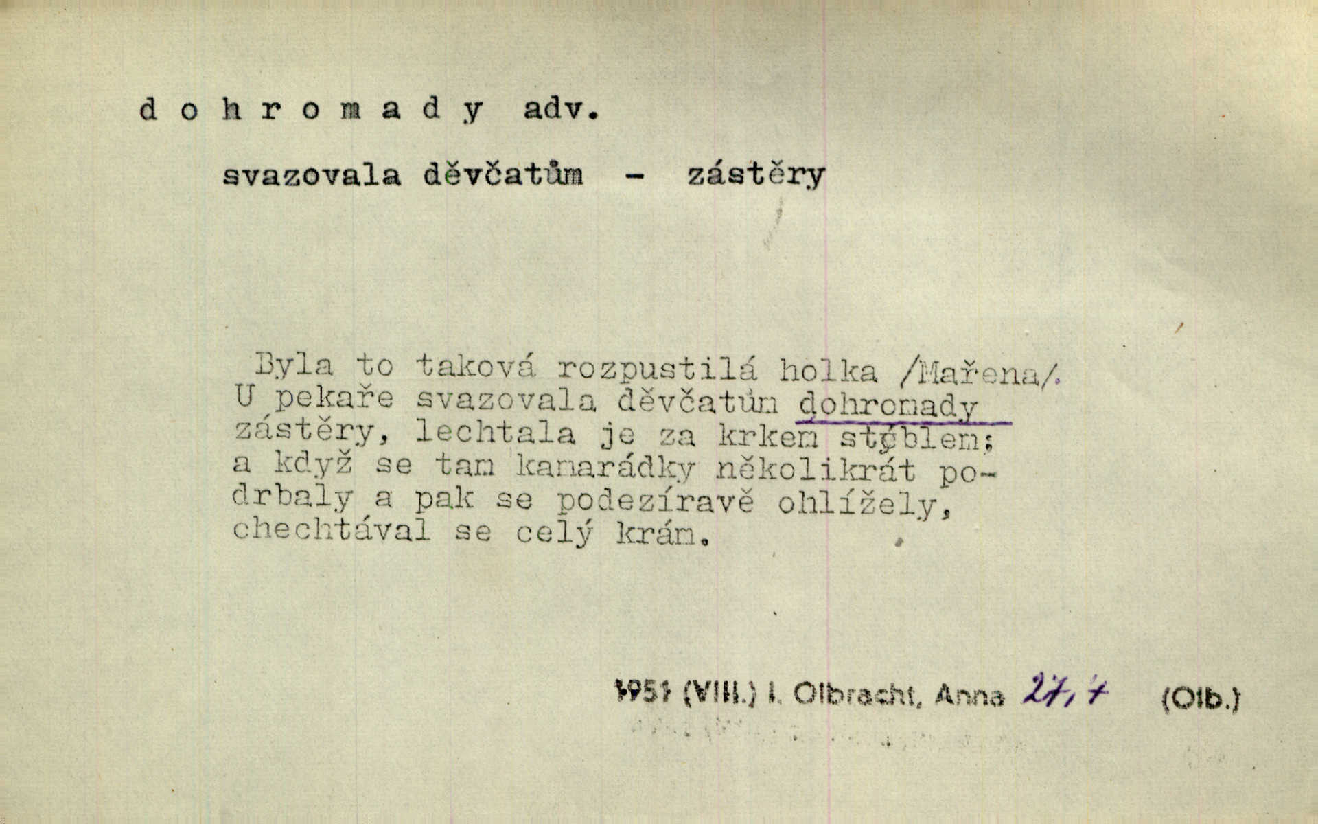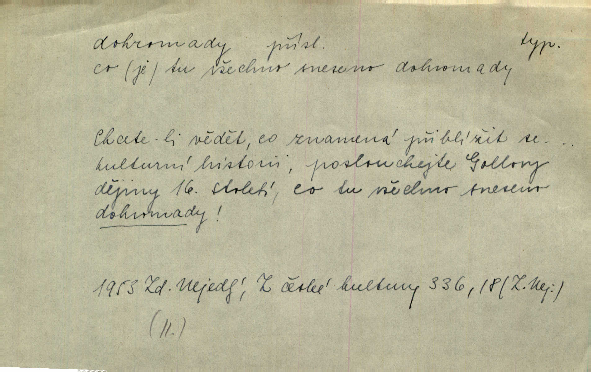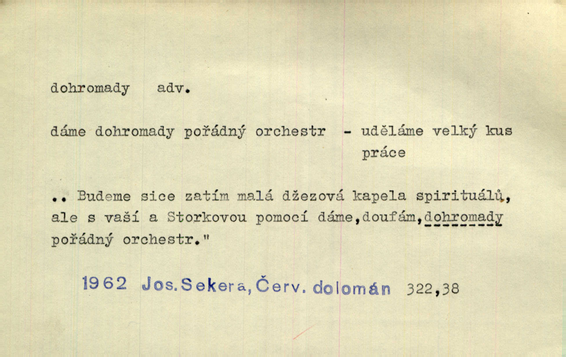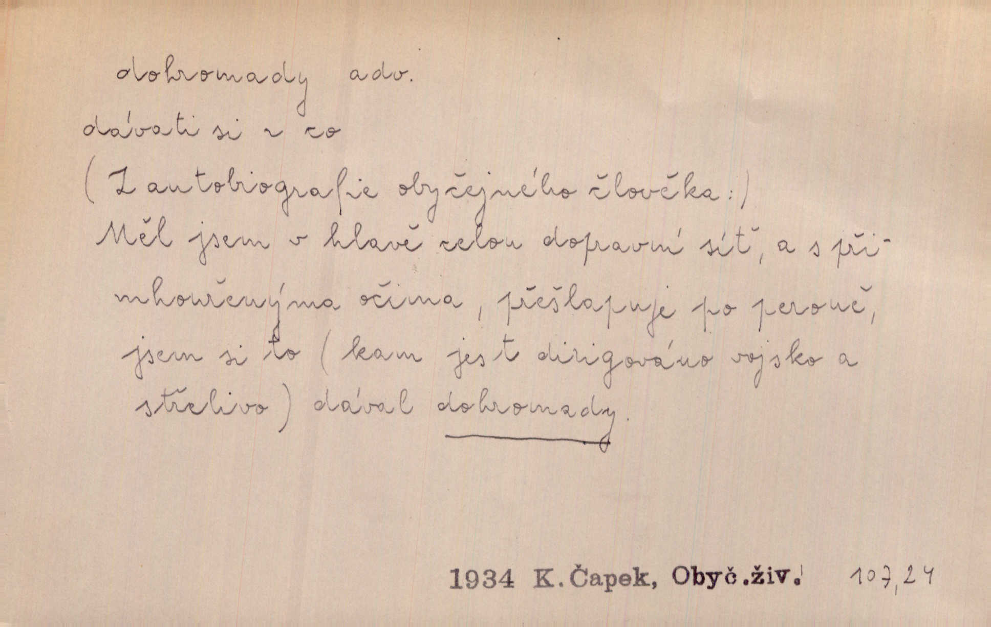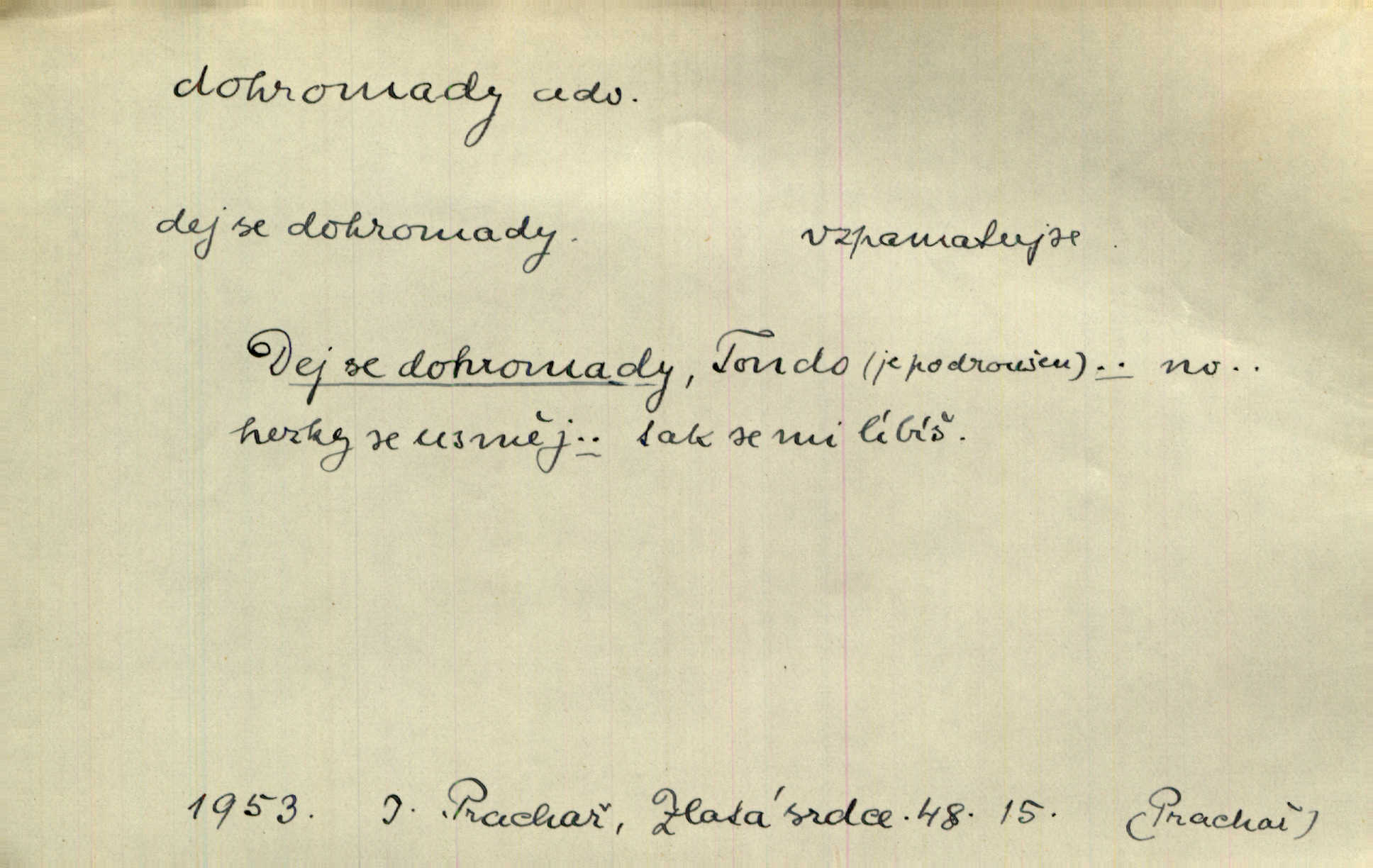 - dohromady adv. k sobě, v celek, společně, pospolu. Svažte ty otýpky dohromady otýpky, z nichž každá je svázána, svažte v hromadný celek. Hajný skládal pušku [rozebranou] dohromady. Svob. Úloha byla trudná: svésti všechny ty osoby na plese tak dohromady, aby po celý akt maškarní ples trval zajímavým. Durd. Pracovat s vámi dohromady je nebezpečno! Nejste spolehlivý! ve spolku s vámi. Čap. Ch. Oficírská šavle a naše břinkovka to nejde dohromady nesnáší se. Rais. S jedné strany má turkyň a soused žid s druhé strany řepu, to nehraje dohromady nehodí se k sobě. Herb. Trvalo jí chvilku, než si v hlavě dala dohromady, že to je „ten pravař“ uvědomila si. H. Dvoř. Již se [kramáři] dostali dohromady, klejí, nadávají si do hádky. Prav. Baby sedící v hospodě pod okny strkaly hlavy dohromady: Všimly ste si, tetko? šuškaly si. Herb. Namluvíš si fešnou holku… dáte se dohromady budete žíti spolu. Kronb. Dejte něco dohromady zaranžujte. Kronb. Seberte rozum dohromady uvažte dobře! Něm. Přišli dva sedláci, jeden měl hřebce, druhý kobylu. Oba koně ale měli dohromady v společném majetku. Něm. D celkem, úhrnem, vesměs. Zaznamenává dohromady 1558 čísel [valdštejské literatury]. Pekárek. Slova, lesklé věty a dohromady nic. Mach.