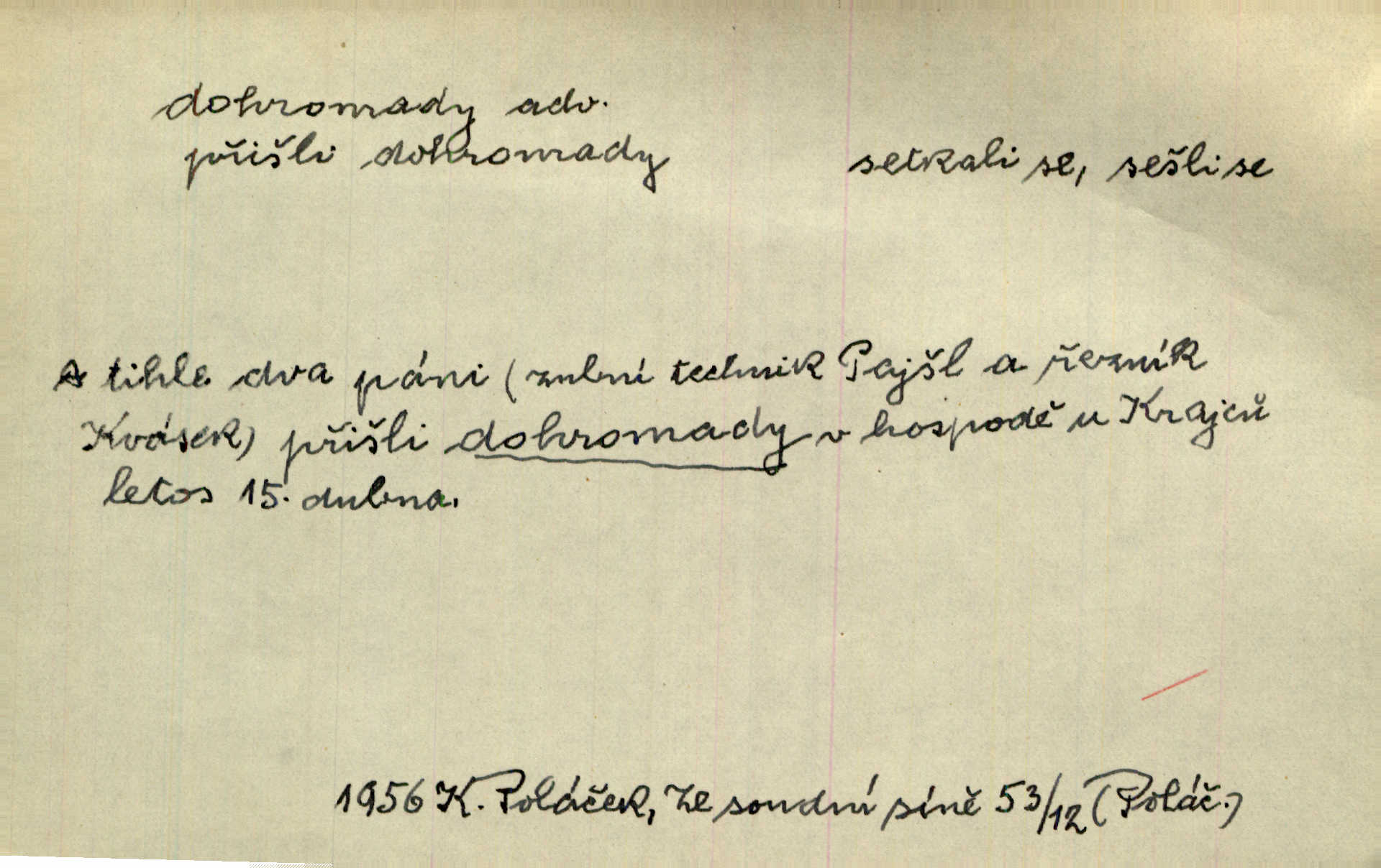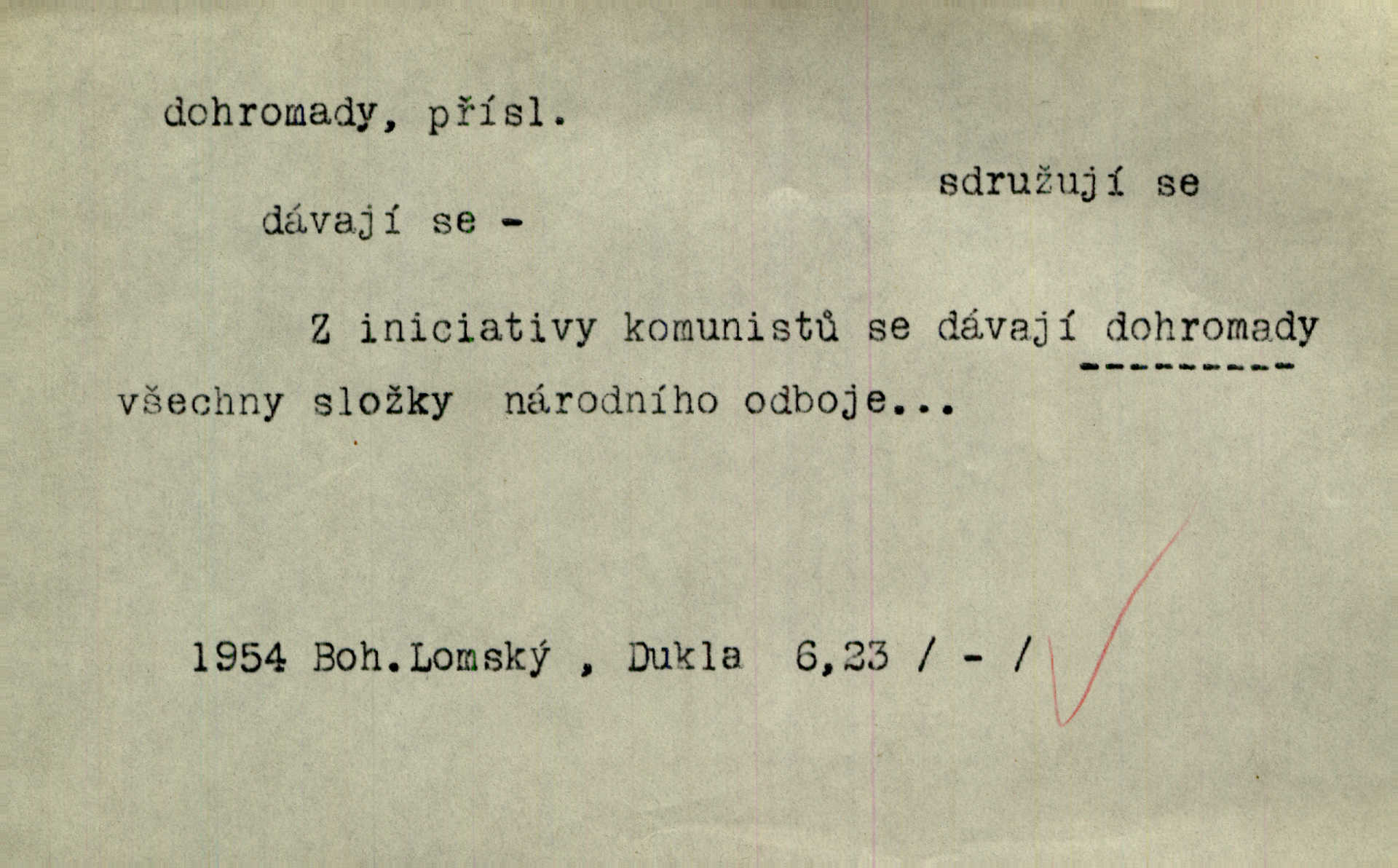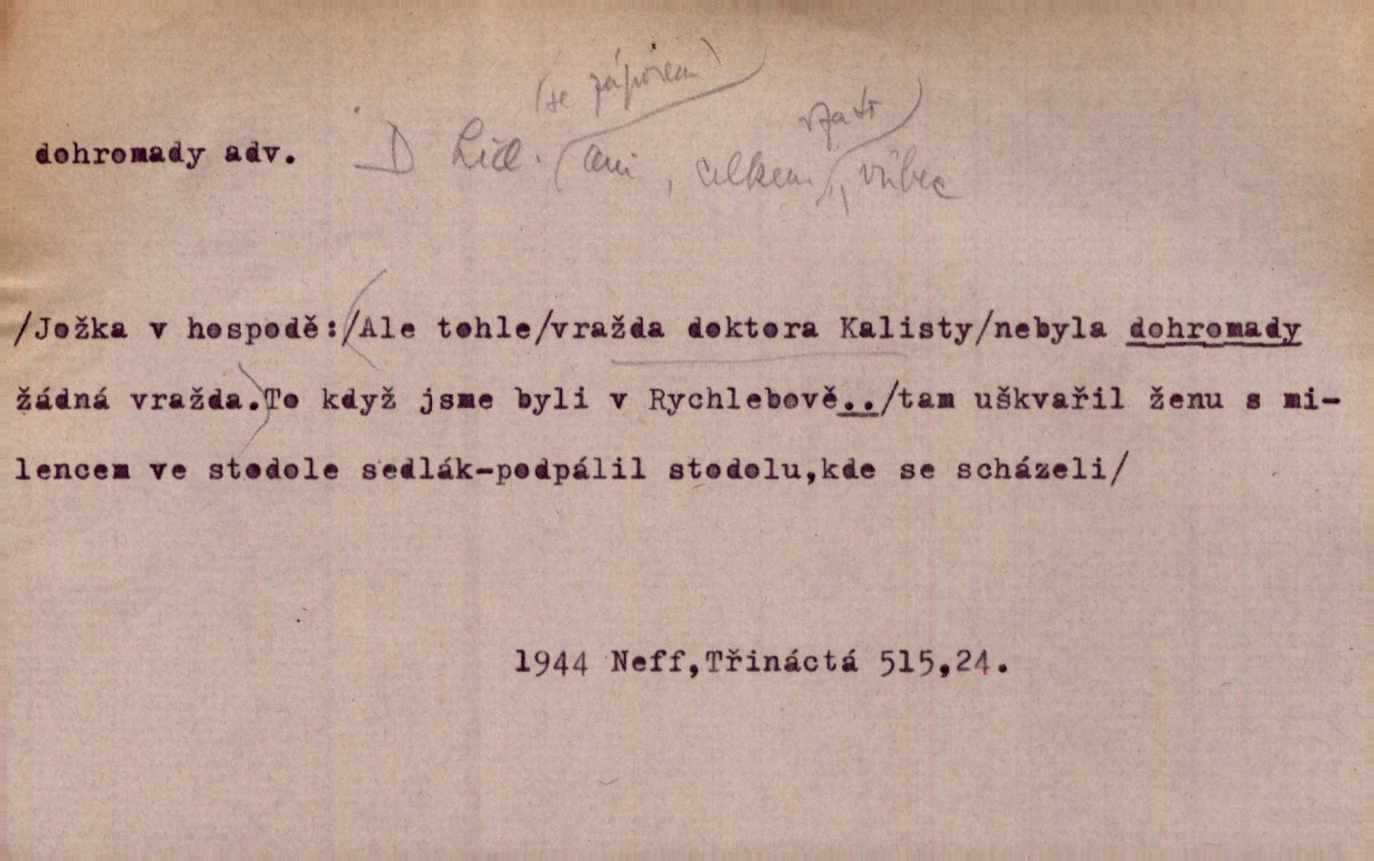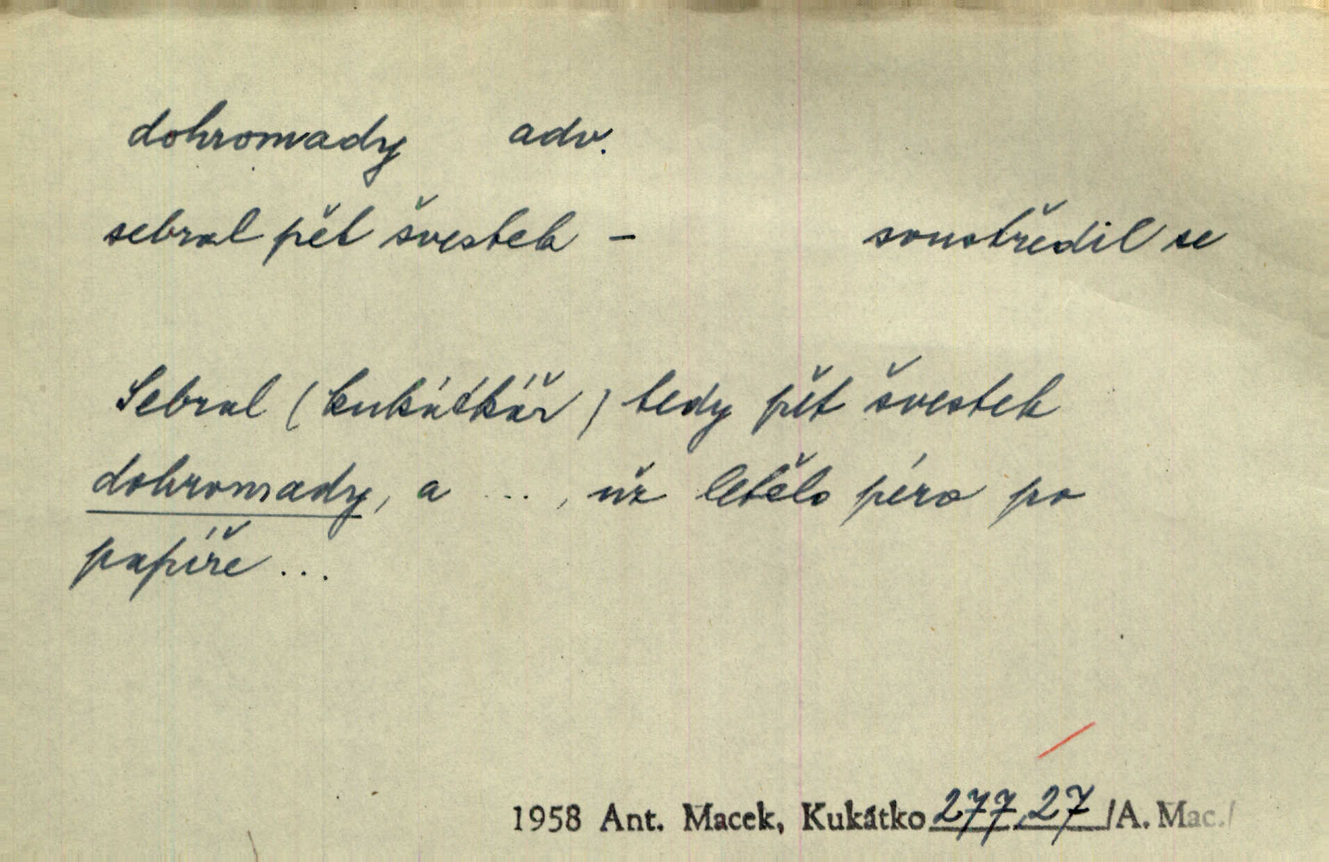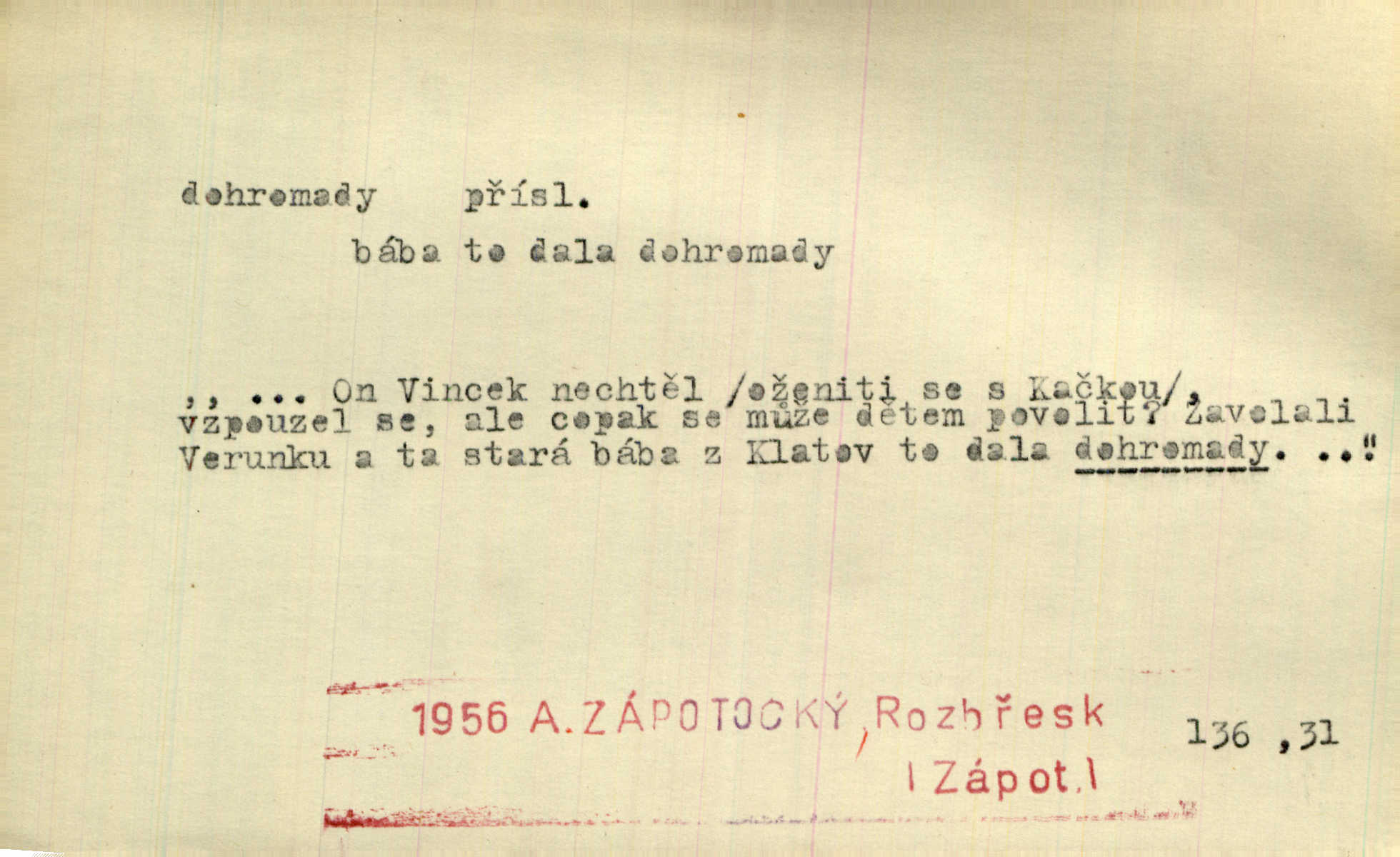- dohromady adv. k sobě, v celek, společně, pospolu. Svažte ty otýpky dohromady otýpky, z nichž každá je svázána, svažte v hromadný celek. Hajný skládal pušku [rozebranou] dohromady. Svob. Úloha byla trudná: svésti všechny ty osoby na plese tak dohromady, aby po celý akt maškarní ples trval zajímavým. Durd. Pracovat s vámi dohromady je nebezpečno! Nejste spolehlivý! ve spolku s vámi. Čap. Ch. Oficírská šavle a naše břinkovka to nejde dohromady nesnáší se. Rais. S jedné strany má turkyň a soused žid s druhé strany řepu, to nehraje dohromady nehodí se k sobě. Herb. Trvalo jí chvilku, než si v hlavě dala dohromady, že to je „ten pravař“ uvědomila si. H. Dvoř. Již se [kramáři] dostali dohromady, klejí, nadávají si do hádky. Prav. Baby sedící v hospodě pod okny strkaly hlavy dohromady: Všimly ste si, tetko? šuškaly si. Herb. Namluvíš si fešnou holku… dáte se dohromady budete žíti spolu. Kronb. Dejte něco dohromady zaranžujte. Kronb. Seberte rozum dohromady uvažte dobře! Něm. Přišli dva sedláci, jeden měl hřebce, druhý kobylu. Oba koně ale měli dohromady v společném majetku. Něm. D celkem, úhrnem, vesměs. Zaznamenává dohromady 1558 čísel [valdštejské literatury]. Pekárek. Slova, lesklé věty a dohromady nic. Mach.