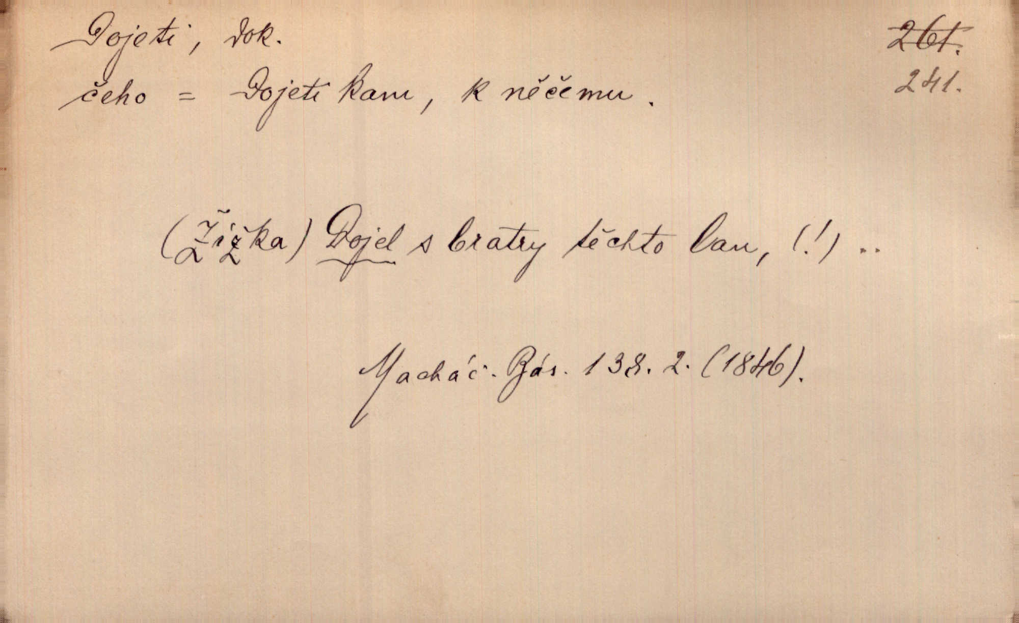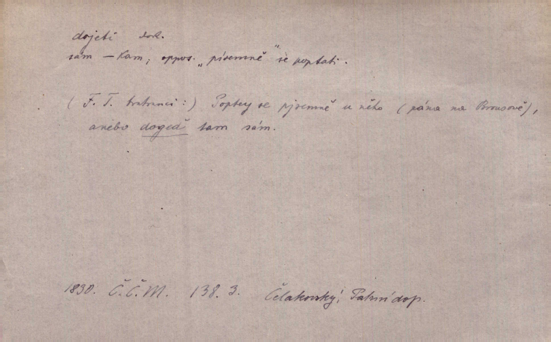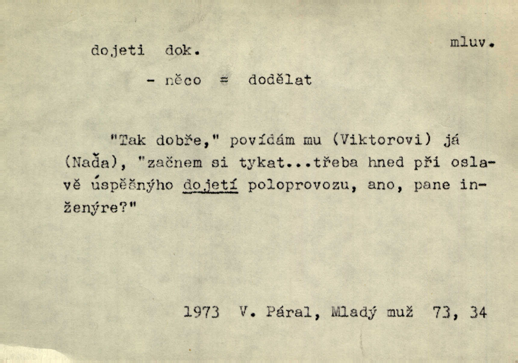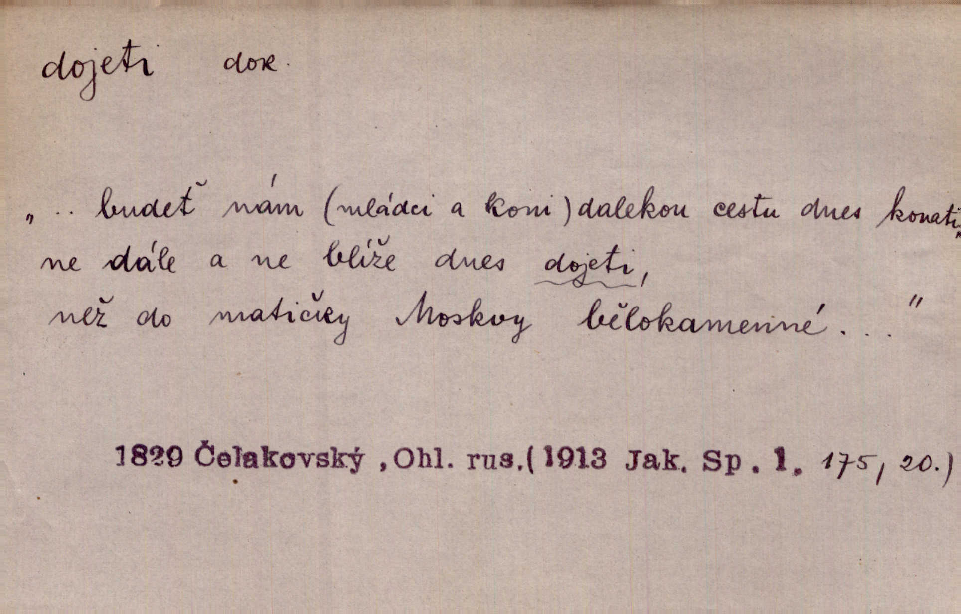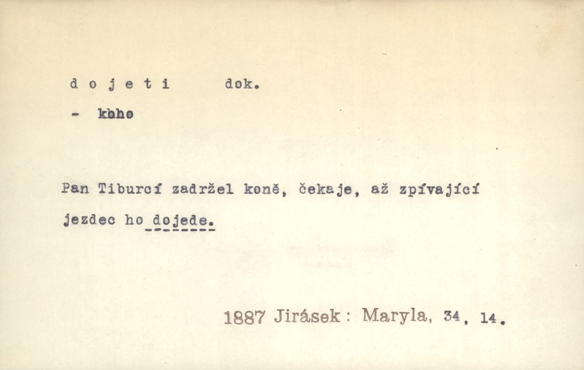 - dojeti dok. (kam) jízdou se dostati, doraziti, zajeti si. „Zdrávi dojeli“ přál kočímu. Baar. Před večerem dojeli do Prahy. Jir. D (čeho) jízdou dostihnouti. Než dojel dvora, umlkl zvon. Zey. Brzy pak dojeli jsme dědiny. Uh. Však dojede-li [loď] šťastně cíle? Heyd. Při předmětu osobním bývá častěji akus. než gen. jízdou dohoniti někoho. [Hájkovi] dojeli na cestě chudé pocestné nebo dokonce děti, které šly do Vídně na učení. Něm. Poručil Jankovi, aby jel zvolna, že on, panic, je dojede. Jir. Kavalíři jí [jezdkyně] dojeli, starostlivě ji obklopujíce, zdali nepřišla k úrazu. Svět.
