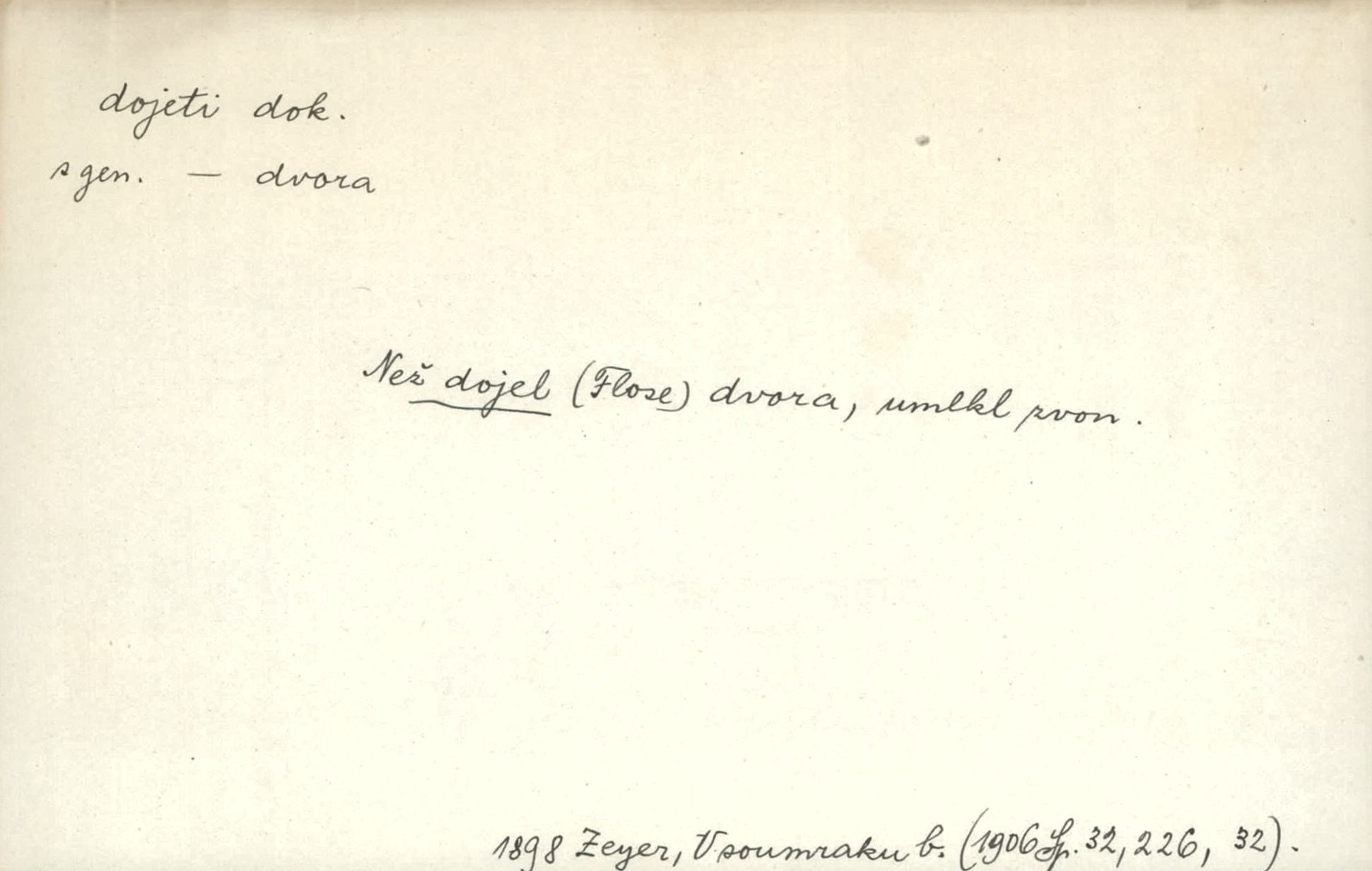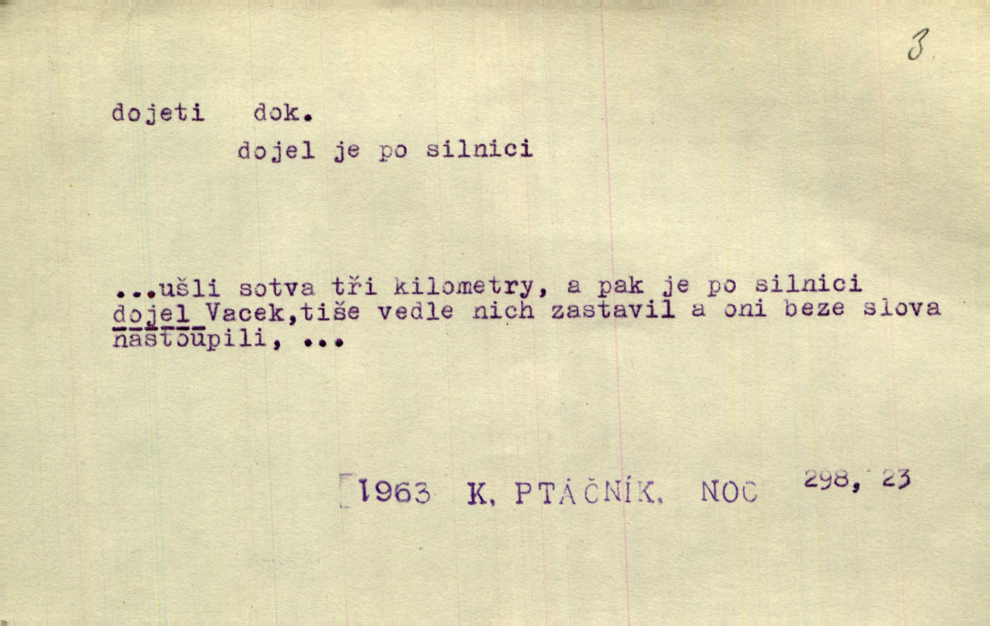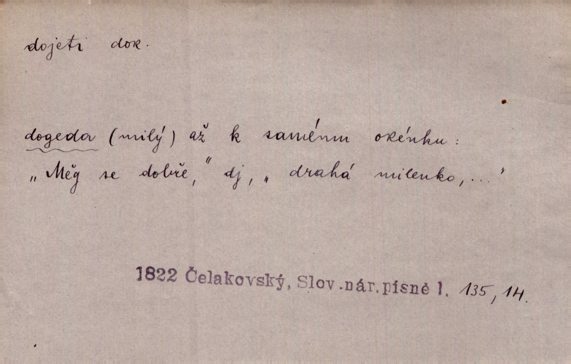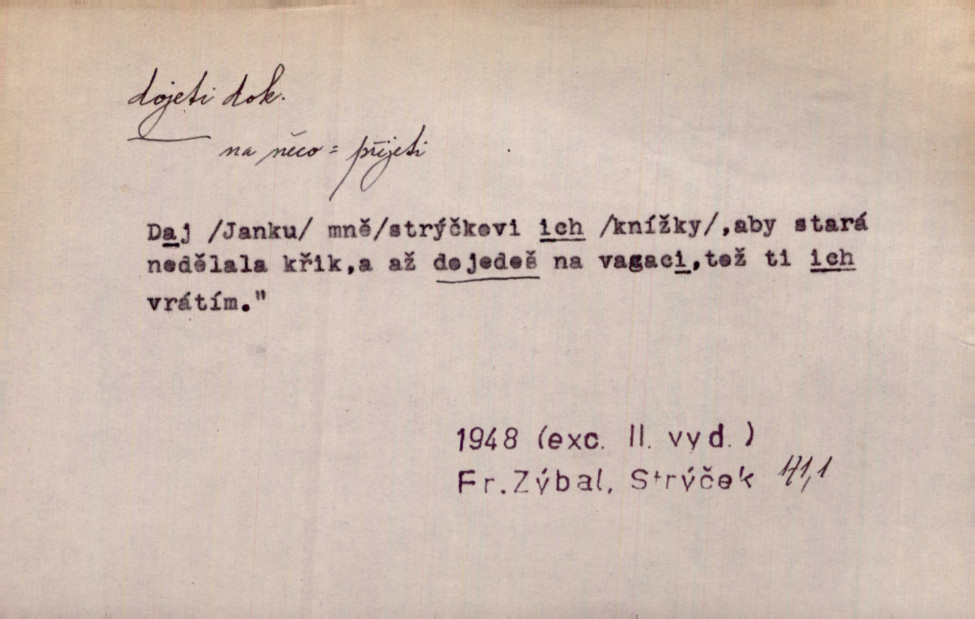 - dojeti dok. (kam) jízdou se dostati, doraziti, zajeti si. „Zdrávi dojeli“ přál kočímu. Baar. Před večerem dojeli do Prahy. Jir. D (čeho) jízdou dostihnouti. Než dojel dvora, umlkl zvon. Zey. Brzy pak dojeli jsme dědiny. Uh. Však dojede-li [loď] šťastně cíle? Heyd. Při předmětu osobním bývá častěji akus. než gen. jízdou dohoniti někoho. [Hájkovi] dojeli na cestě chudé pocestné nebo dokonce děti, které šly do Vídně na učení. Něm. Poručil Jankovi, aby jel zvolna, že on, panic, je dojede. Jir. Kavalíři jí [jezdkyně] dojeli, starostlivě ji obklopujíce, zdali nepřišla k úrazu. Svět.