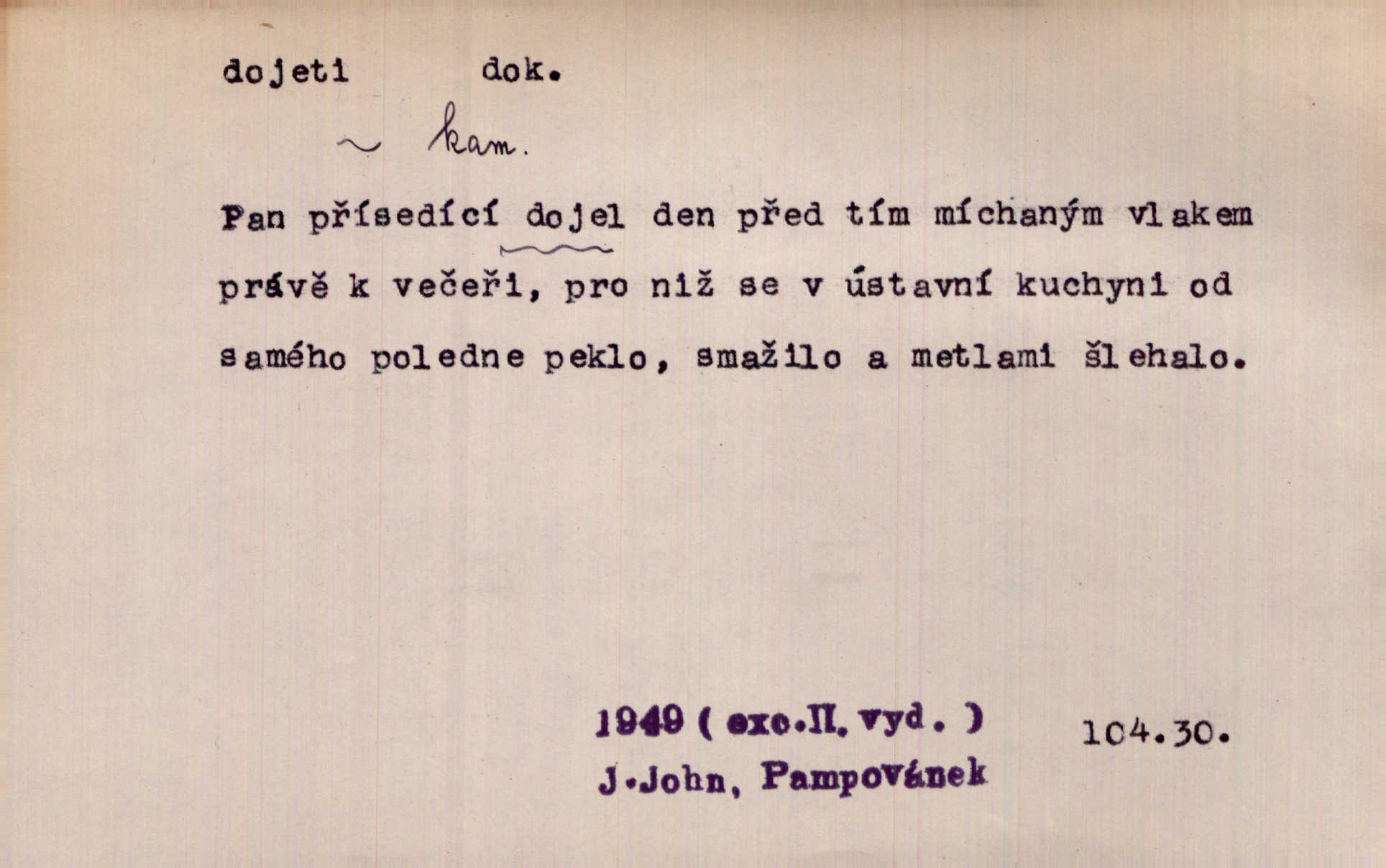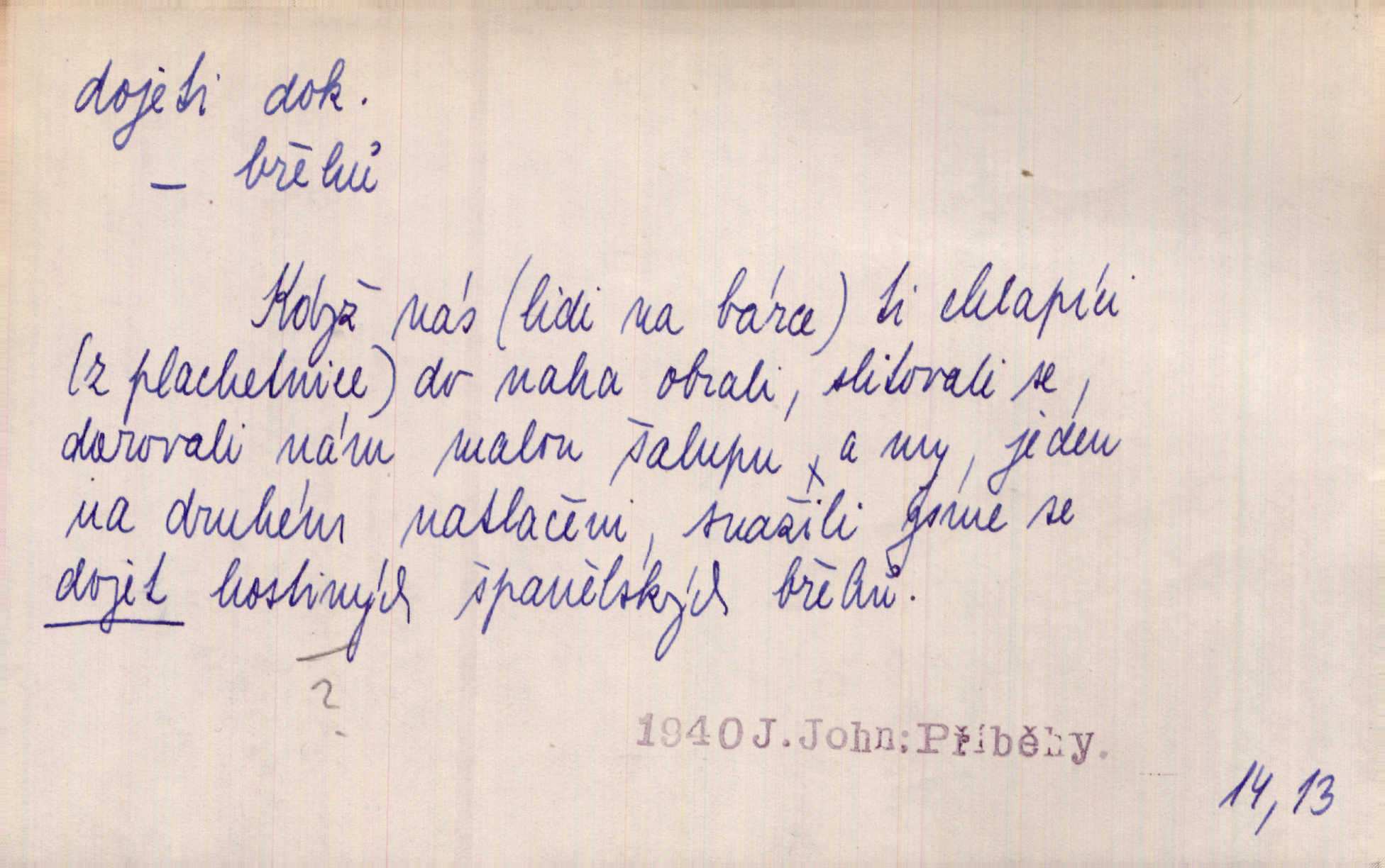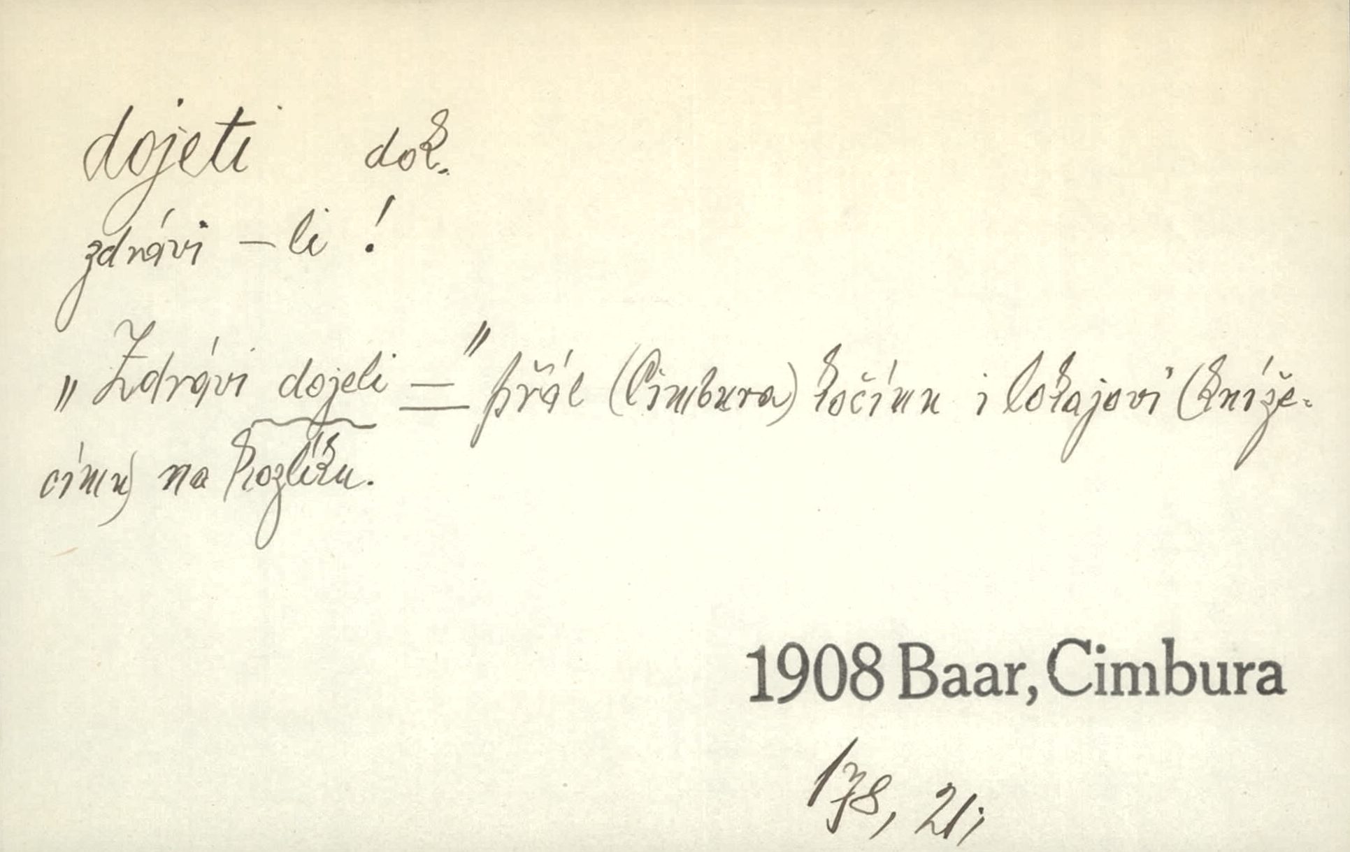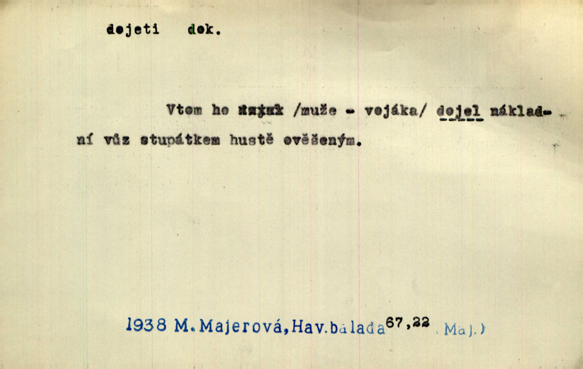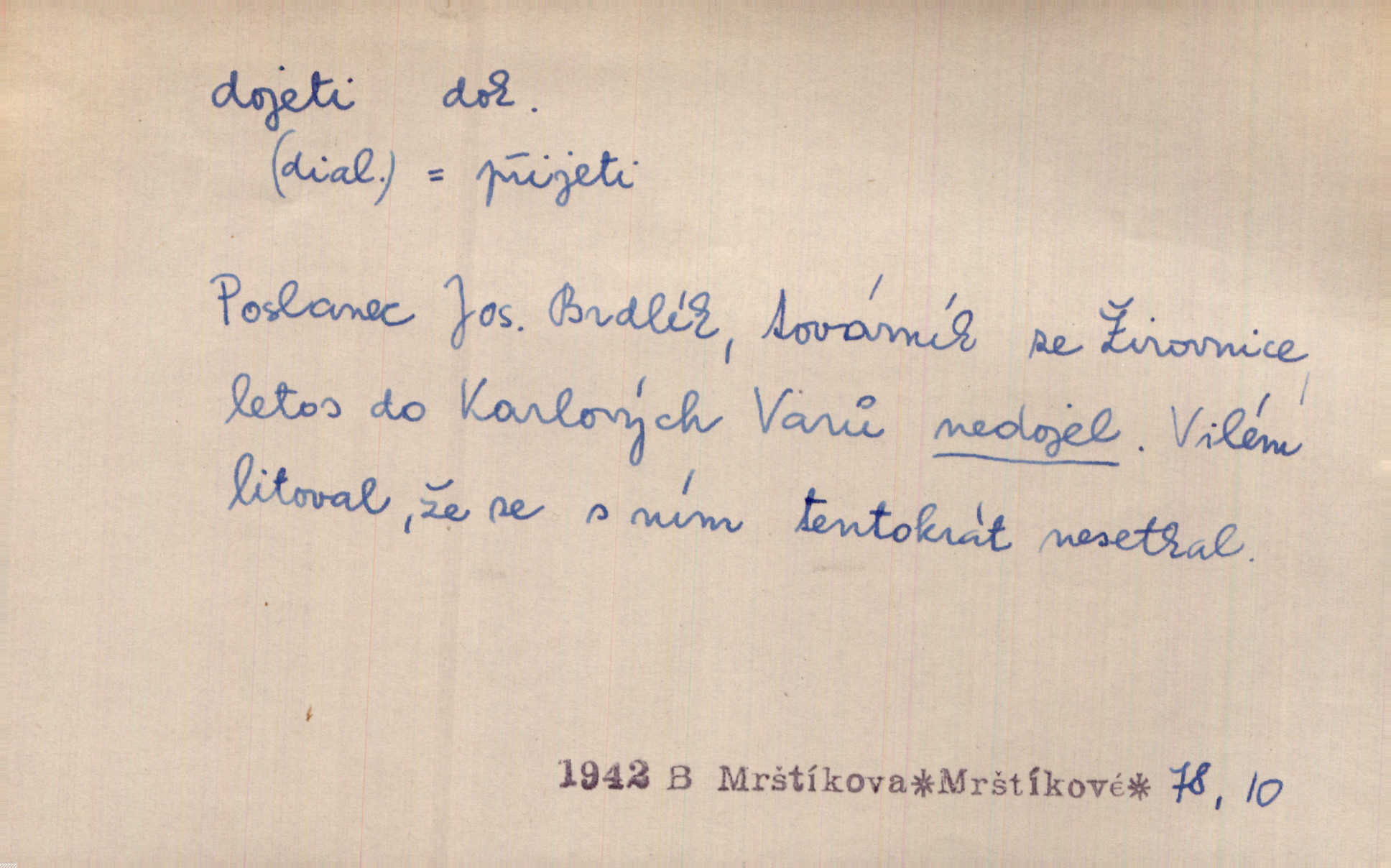 - dojeti dok. (kam) jízdou se dostati, doraziti, zajeti si. „Zdrávi dojeli“ přál kočímu. Baar. Před večerem dojeli do Prahy. Jir. D (čeho) jízdou dostihnouti. Než dojel dvora, umlkl zvon. Zey. Brzy pak dojeli jsme dědiny. Uh. Však dojede-li [loď] šťastně cíle? Heyd. Při předmětu osobním bývá častěji akus. než gen. jízdou dohoniti někoho. [Hájkovi] dojeli na cestě chudé pocestné nebo dokonce děti, které šly do Vídně na učení. Něm. Poručil Jankovi, aby jel zvolna, že on, panic, je dojede. Jir. Kavalíři jí [jezdkyně] dojeli, starostlivě ji obklopujíce, zdali nepřišla k úrazu. Svět.