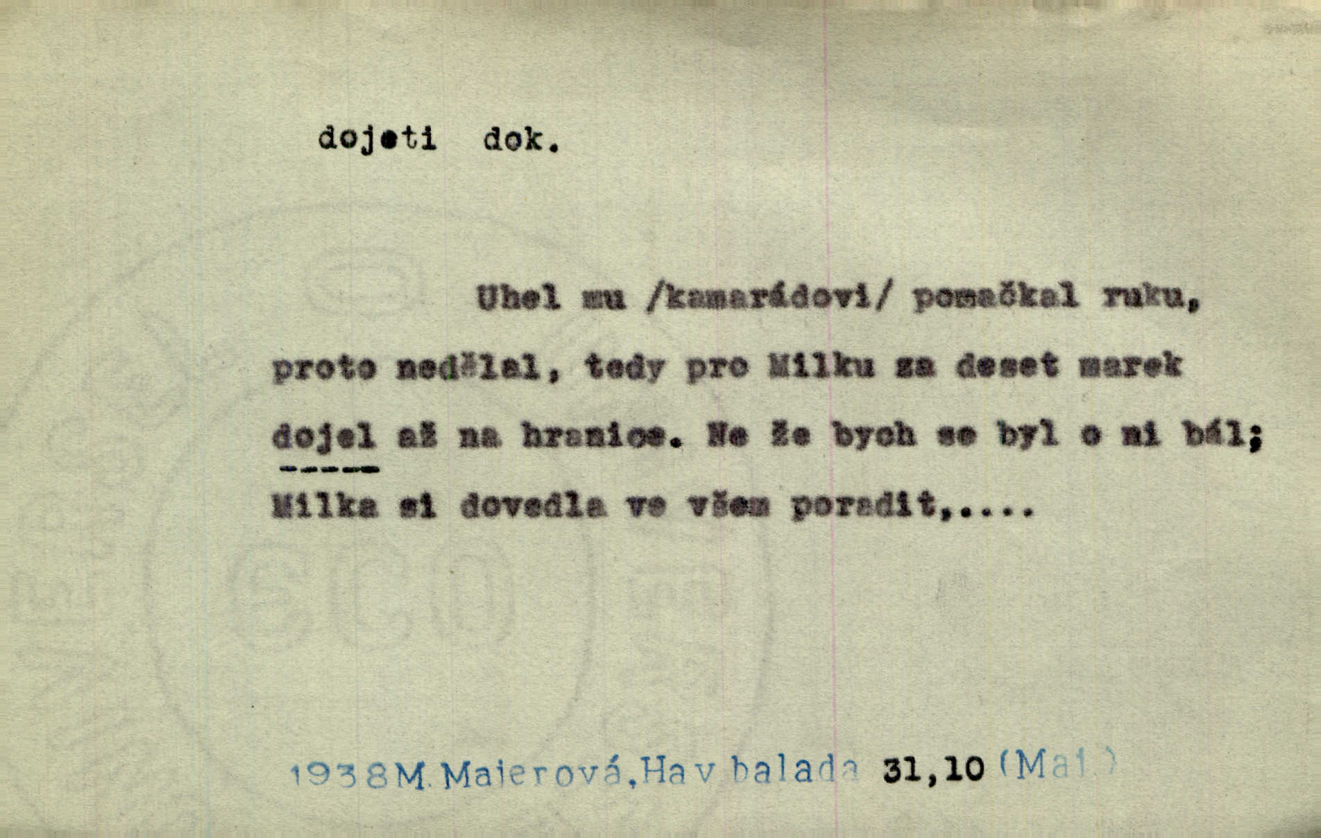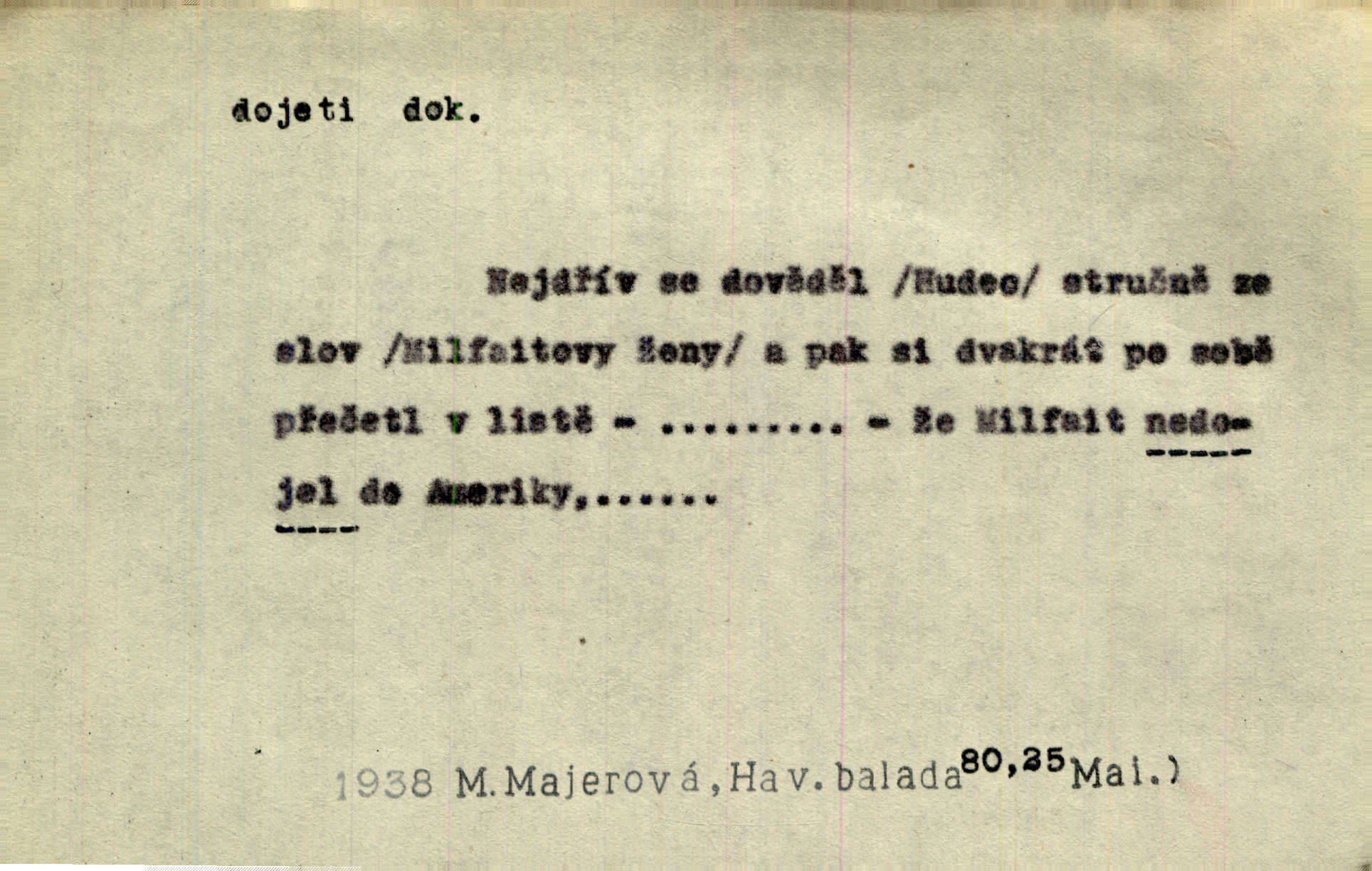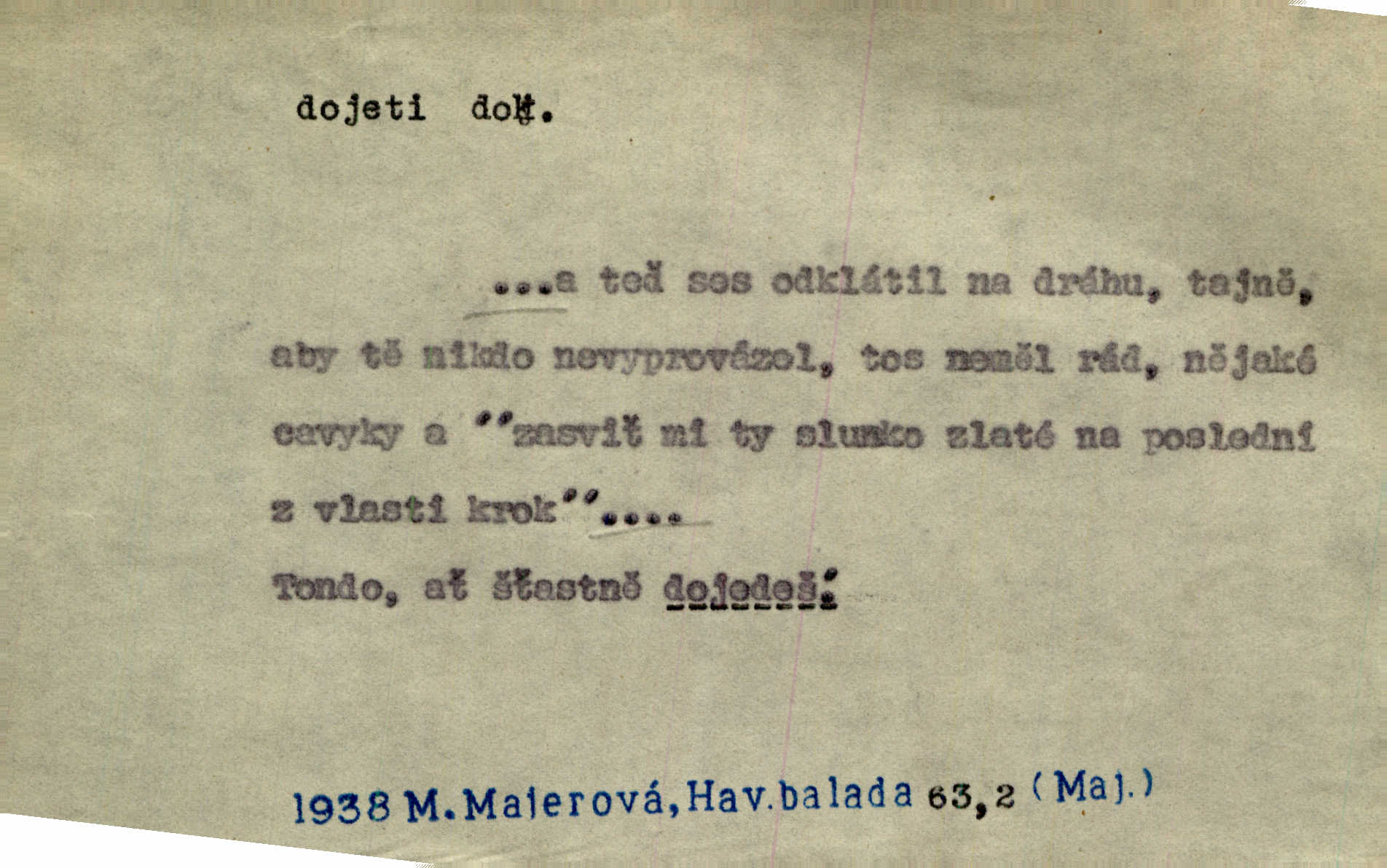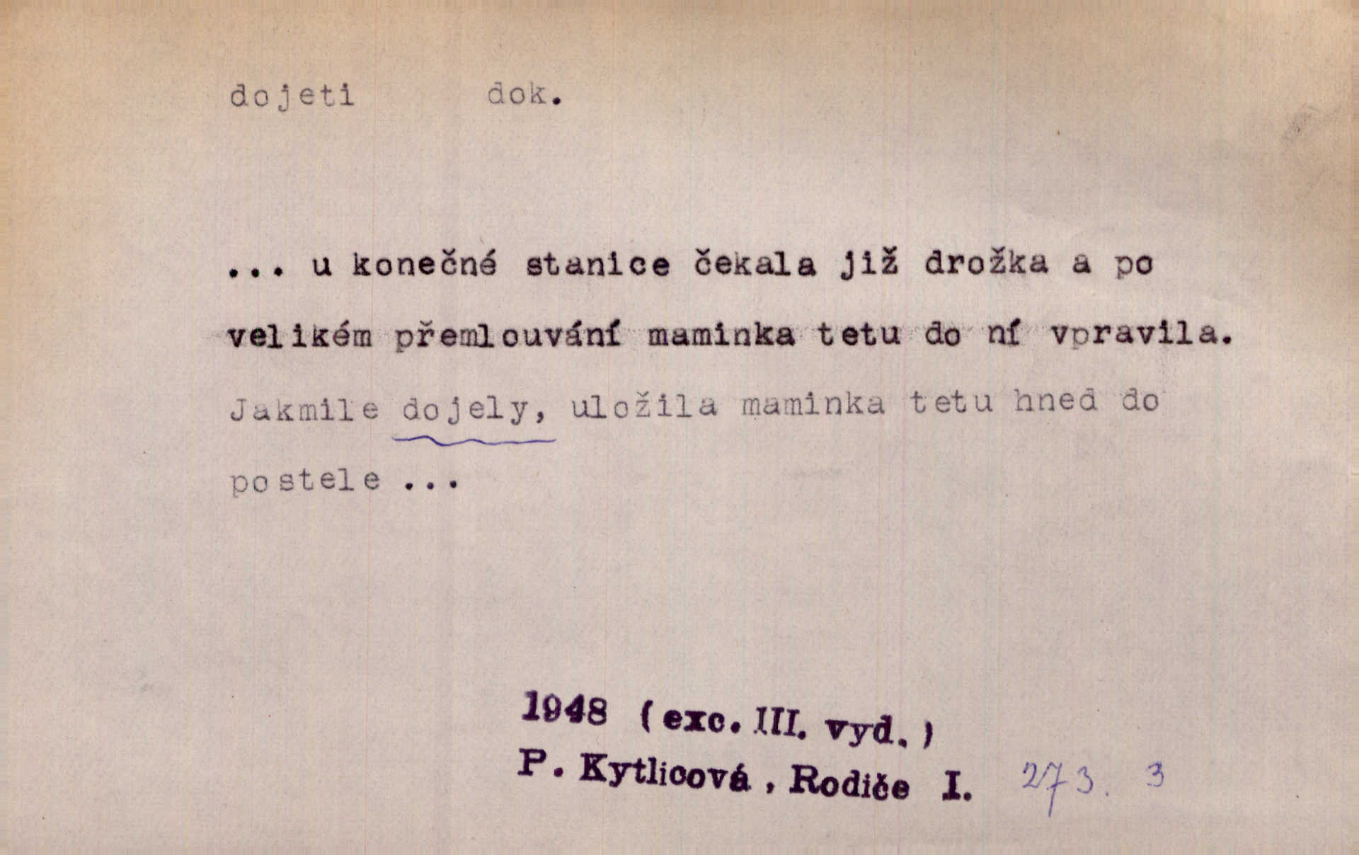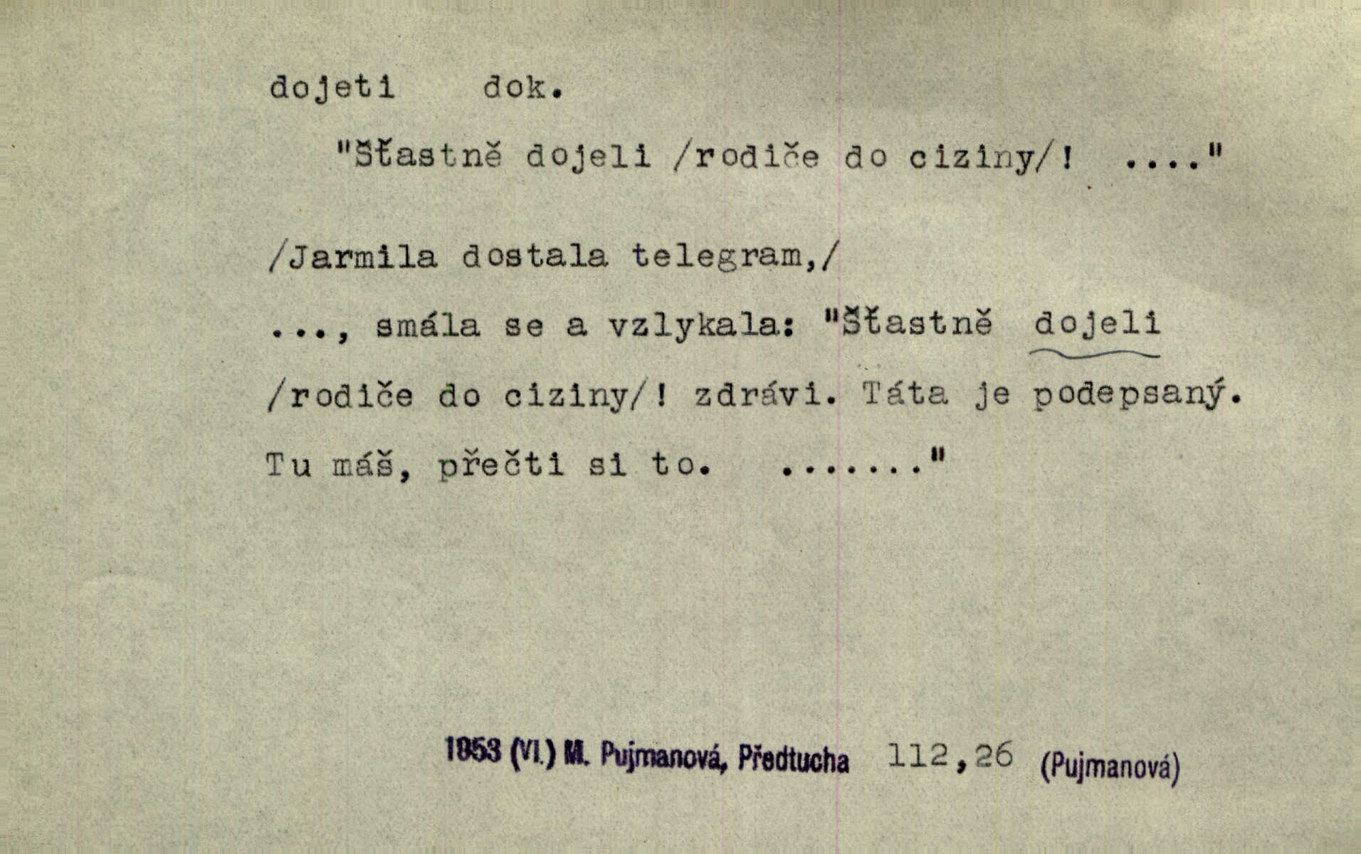 - dojeti dok. (kam) jízdou se dostati, doraziti, zajeti si. „Zdrávi dojeli“ přál kočímu. Baar. Před večerem dojeli do Prahy. Jir. D (čeho) jízdou dostihnouti. Než dojel dvora, umlkl zvon. Zey. Brzy pak dojeli jsme dědiny. Uh. Však dojede-li [loď] šťastně cíle? Heyd. Při předmětu osobním bývá častěji akus. než gen. jízdou dohoniti někoho. [Hájkovi] dojeli na cestě chudé pocestné nebo dokonce děti, které šly do Vídně na učení. Něm. Poručil Jankovi, aby jel zvolna, že on, panic, je dojede. Jir. Kavalíři jí [jezdkyně] dojeli, starostlivě ji obklopujíce, zdali nepřišla k úrazu. Svět.