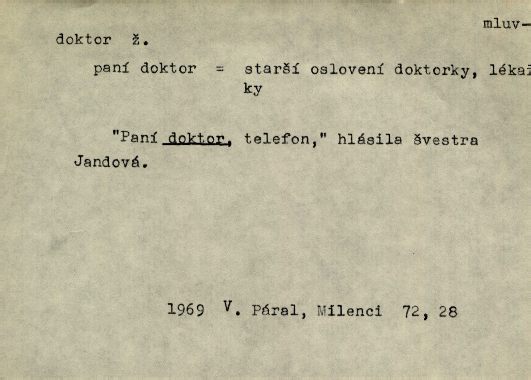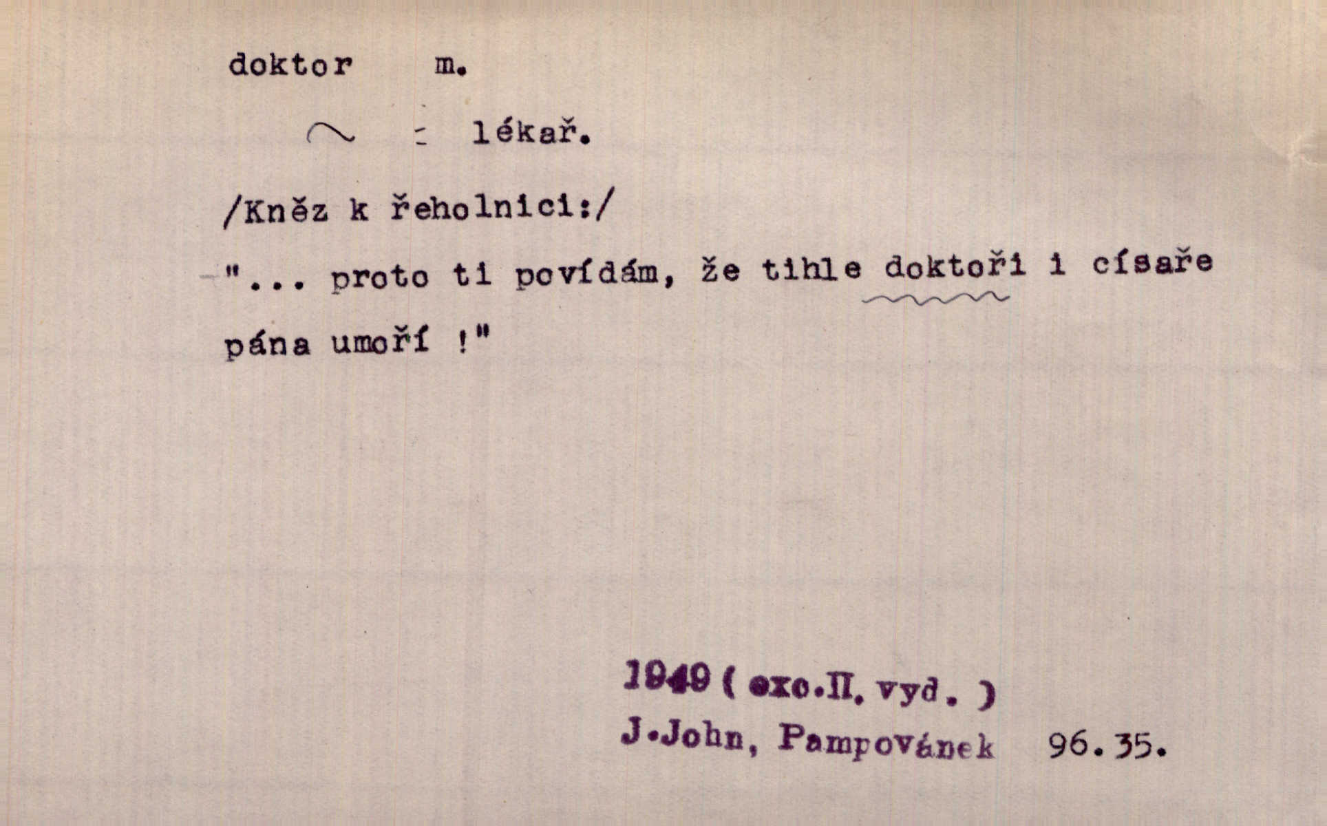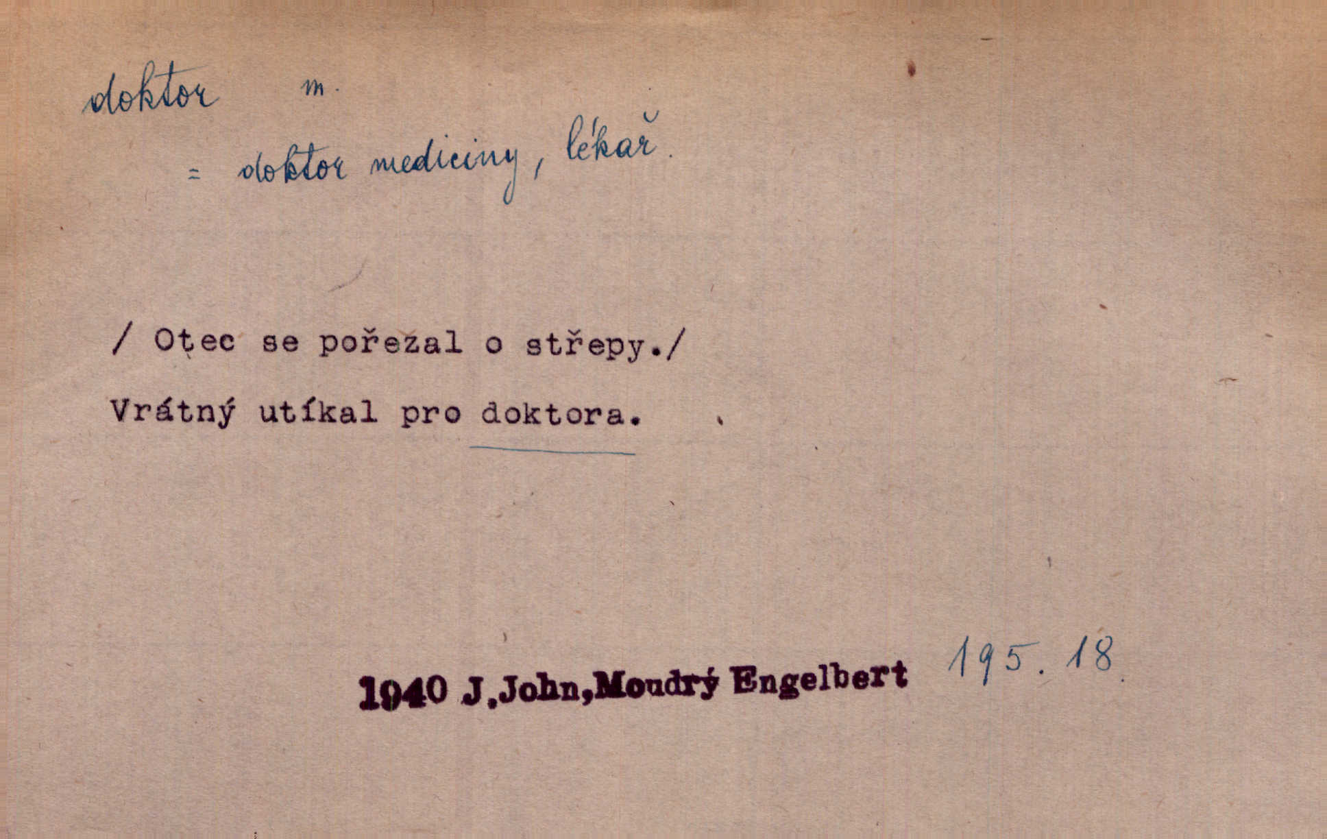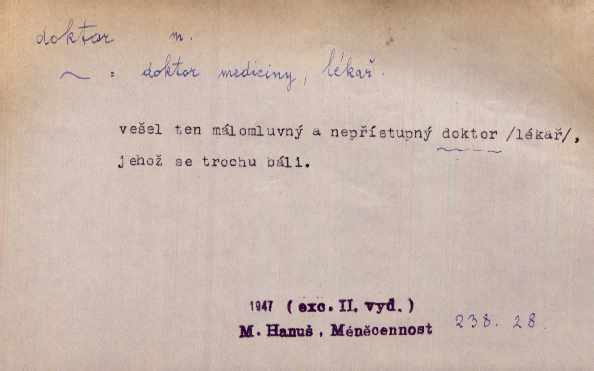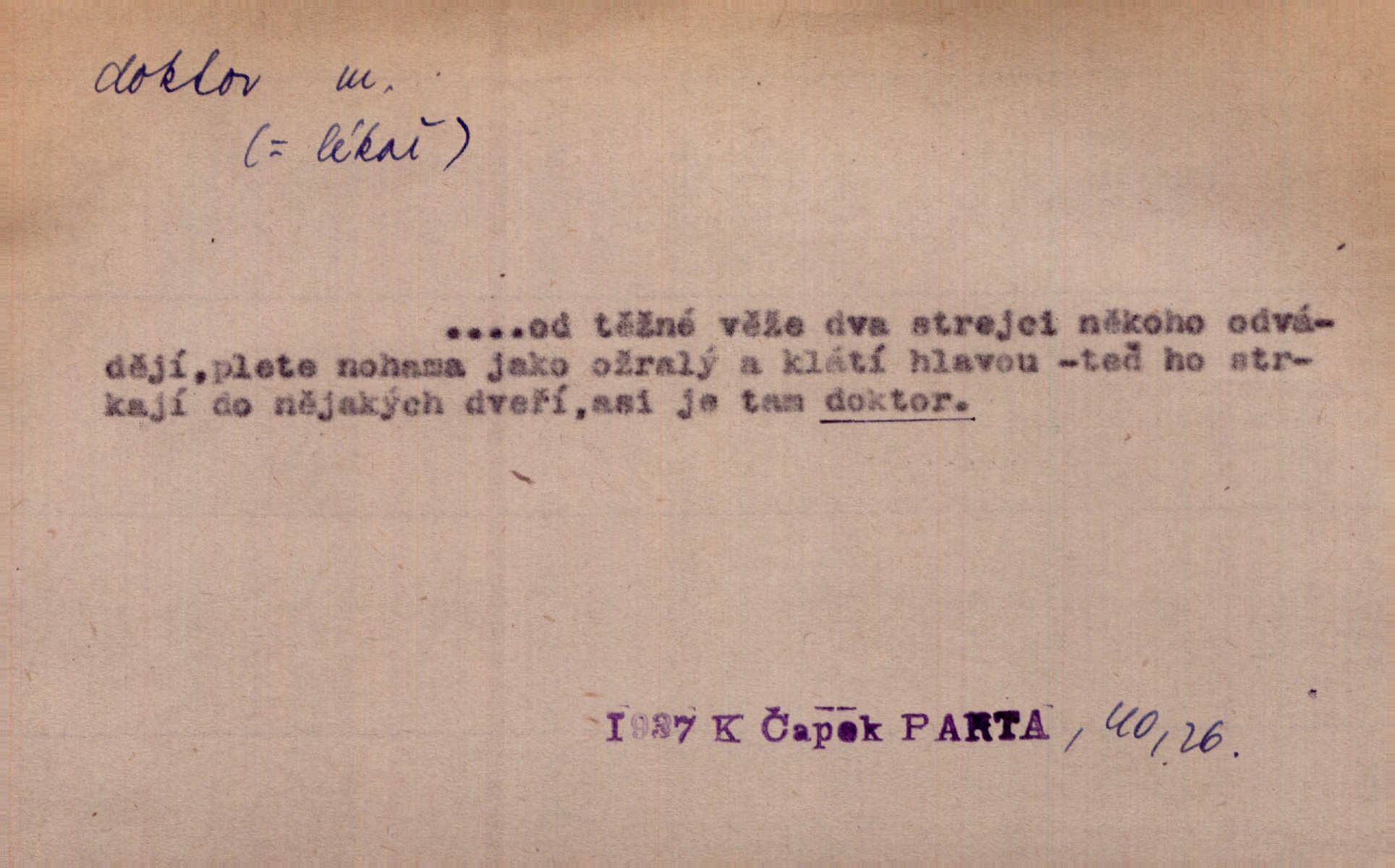 - doktor, -a (vok. doktore, pl. doktoři) m. titul dosažený přísnými zkouškami na vysoké škole. Doktor theologie, práv, veškerého lékařství, filosofie, přírodních věd, zvěrolékařství, věd technických, báňských. Čestný doktor majitel titulu, jímž vysoké školy poctívají jedince zasloužilé o vědu, umění n. stát. Lid. Moudrostí hází každej a učeností, jako by byl ňákej dochtor nebo profesor. Klost. Někomu dělati doktora hájiti někoho. D Lid. lékař. Rozuměla nemocem jako doktor. Rais. Nebyly některé rady té babičky s tolika pověrami smíšené, jakých obyčejně takoví doktoři užívají. Něm.
