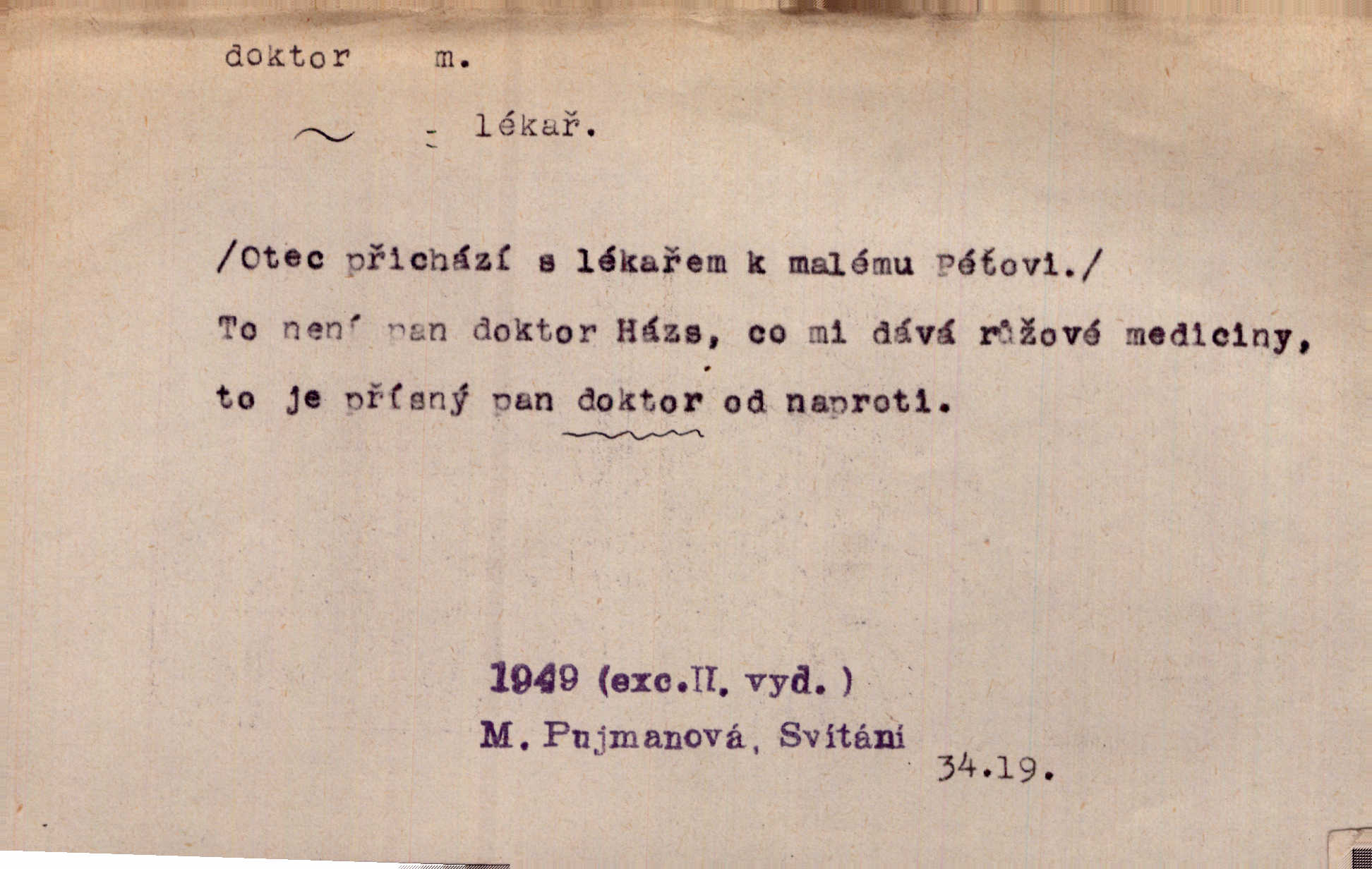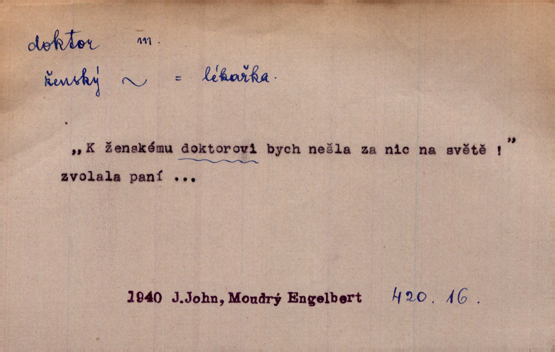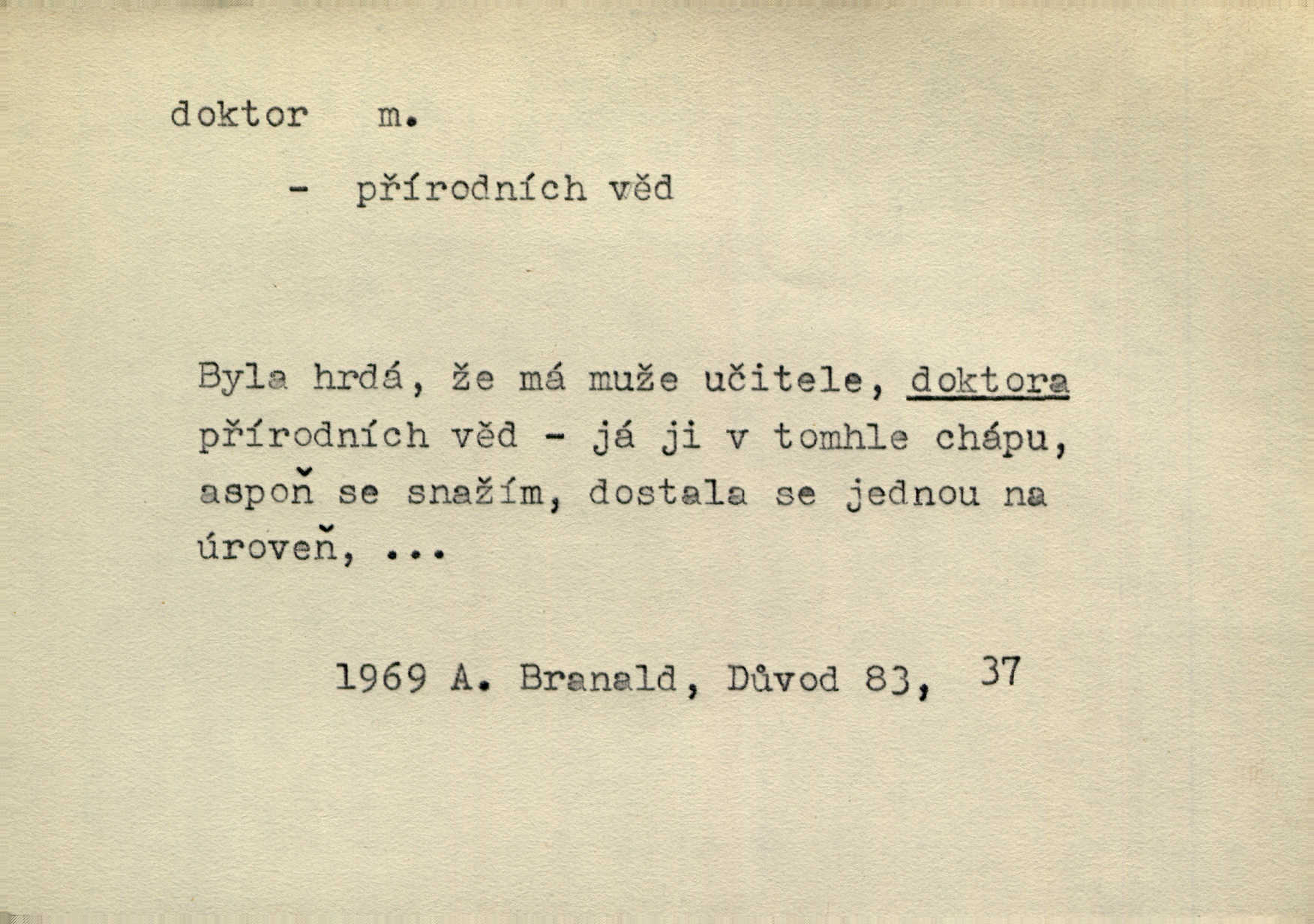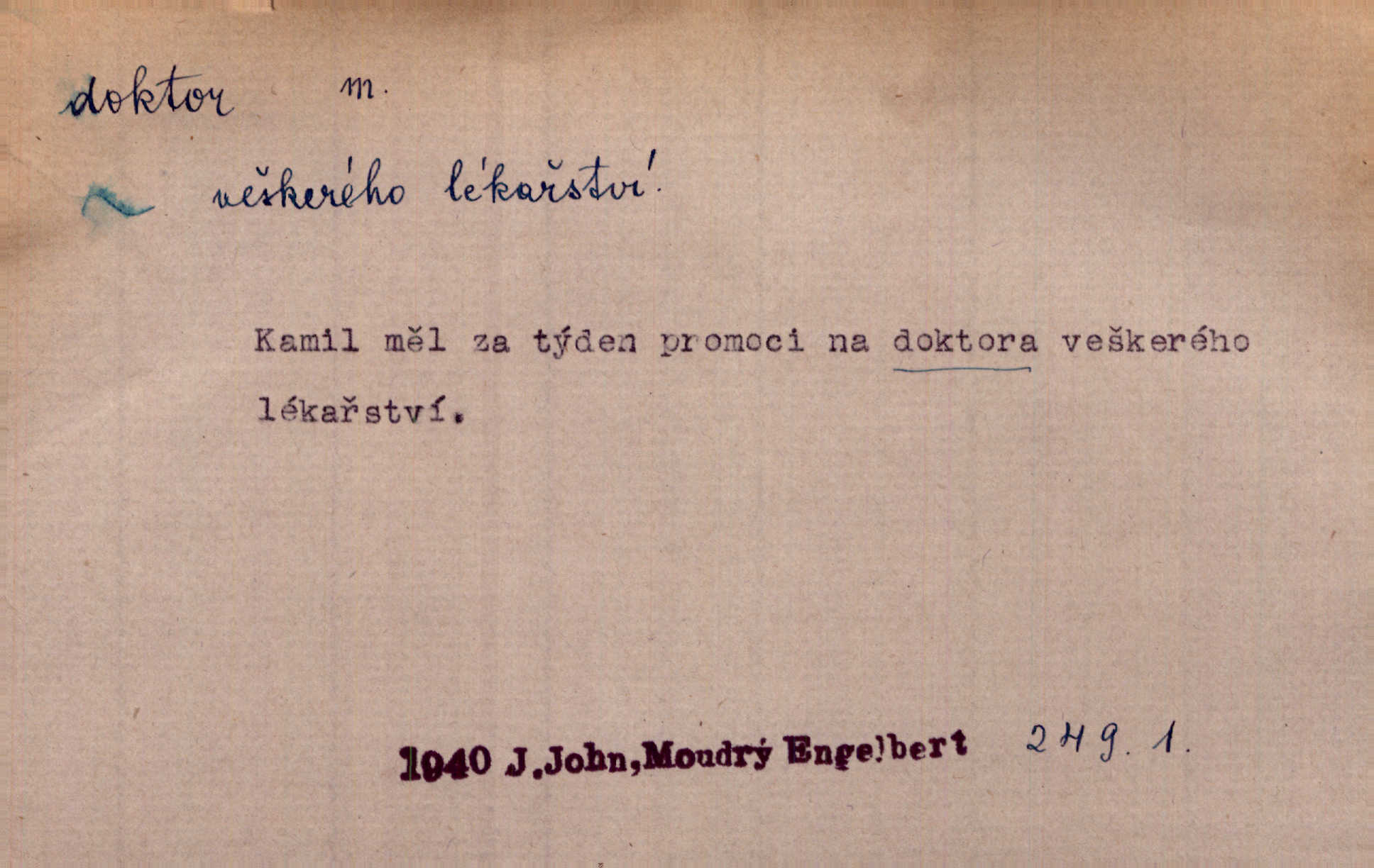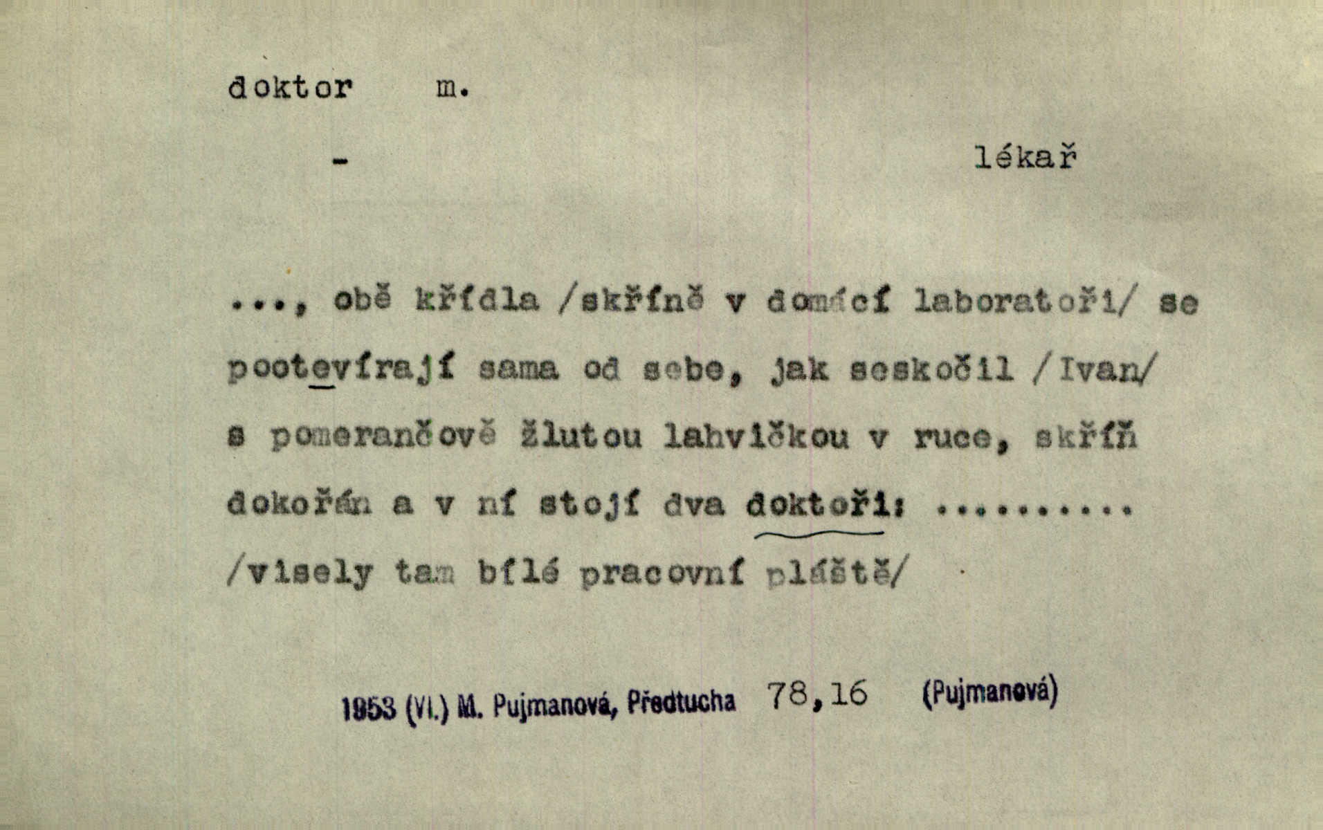 - doktor, -a (vok. doktore, pl. doktoři) m. titul dosažený přísnými zkouškami na vysoké škole. Doktor theologie, práv, veškerého lékařství, filosofie, přírodních věd, zvěrolékařství, věd technických, báňských. Čestný doktor majitel titulu, jímž vysoké školy poctívají jedince zasloužilé o vědu, umění n. stát. Lid. Moudrostí hází každej a učeností, jako by byl ňákej dochtor nebo profesor. Klost. Někomu dělati doktora hájiti někoho. D Lid. lékař. Rozuměla nemocem jako doktor. Rais. Nebyly některé rady té babičky s tolika pověrami smíšené, jakých obyčejně takoví doktoři užívají. Něm.