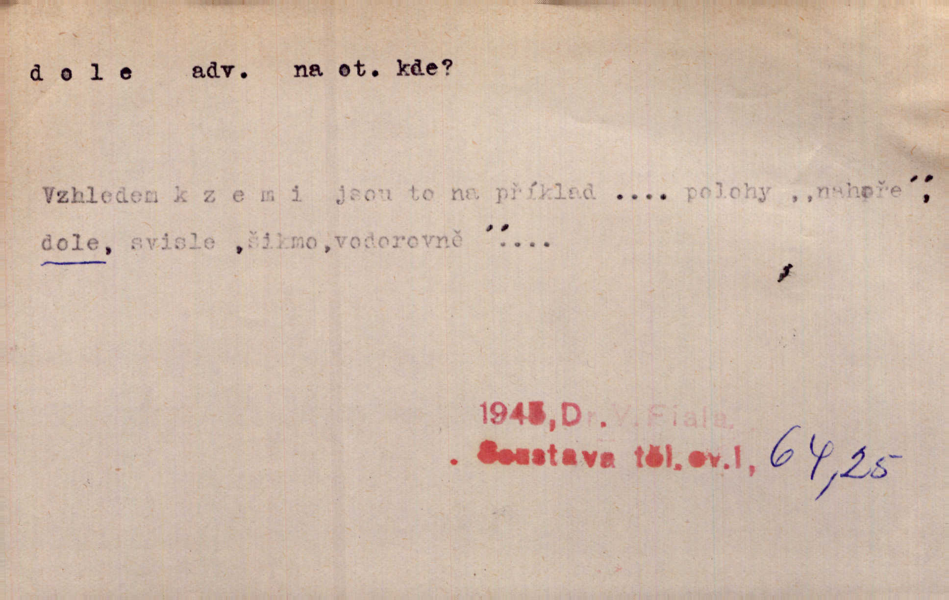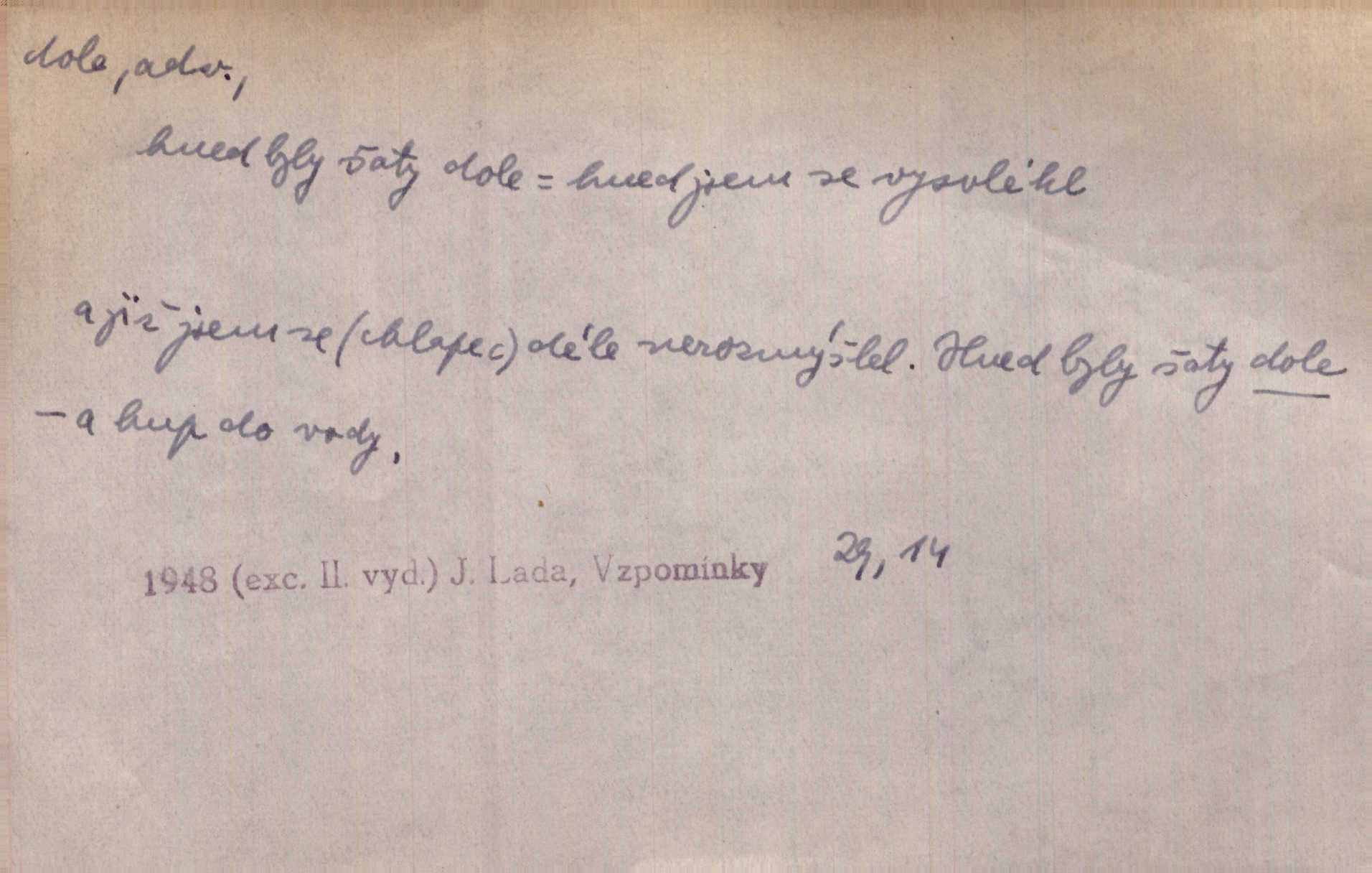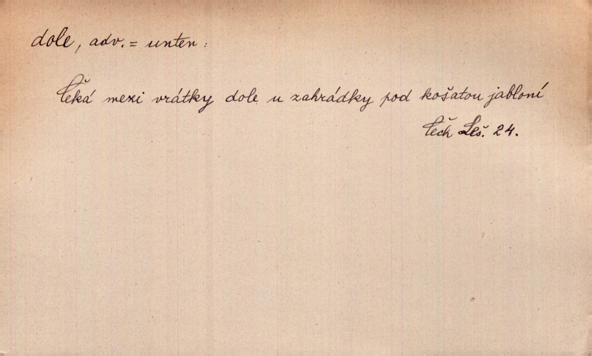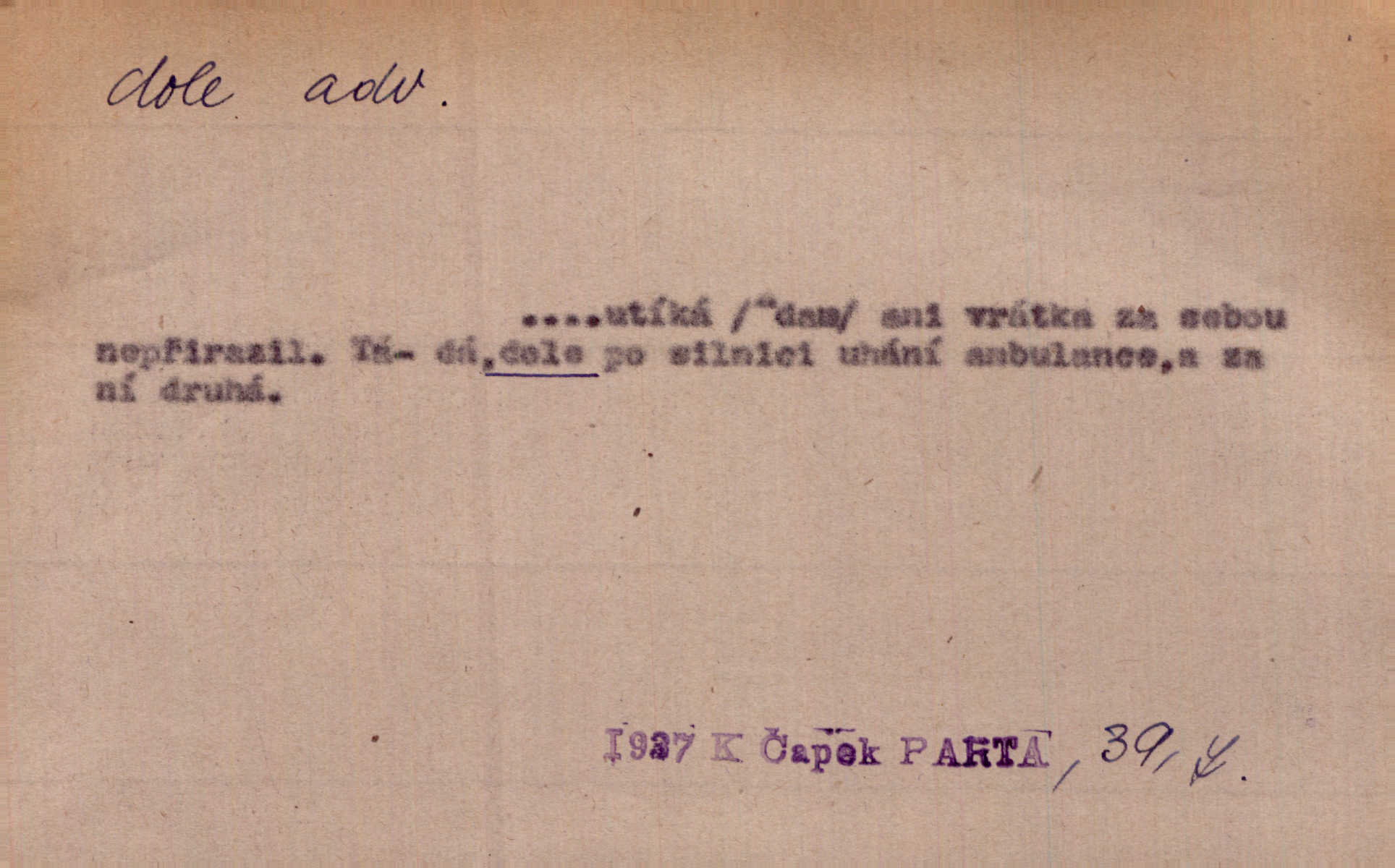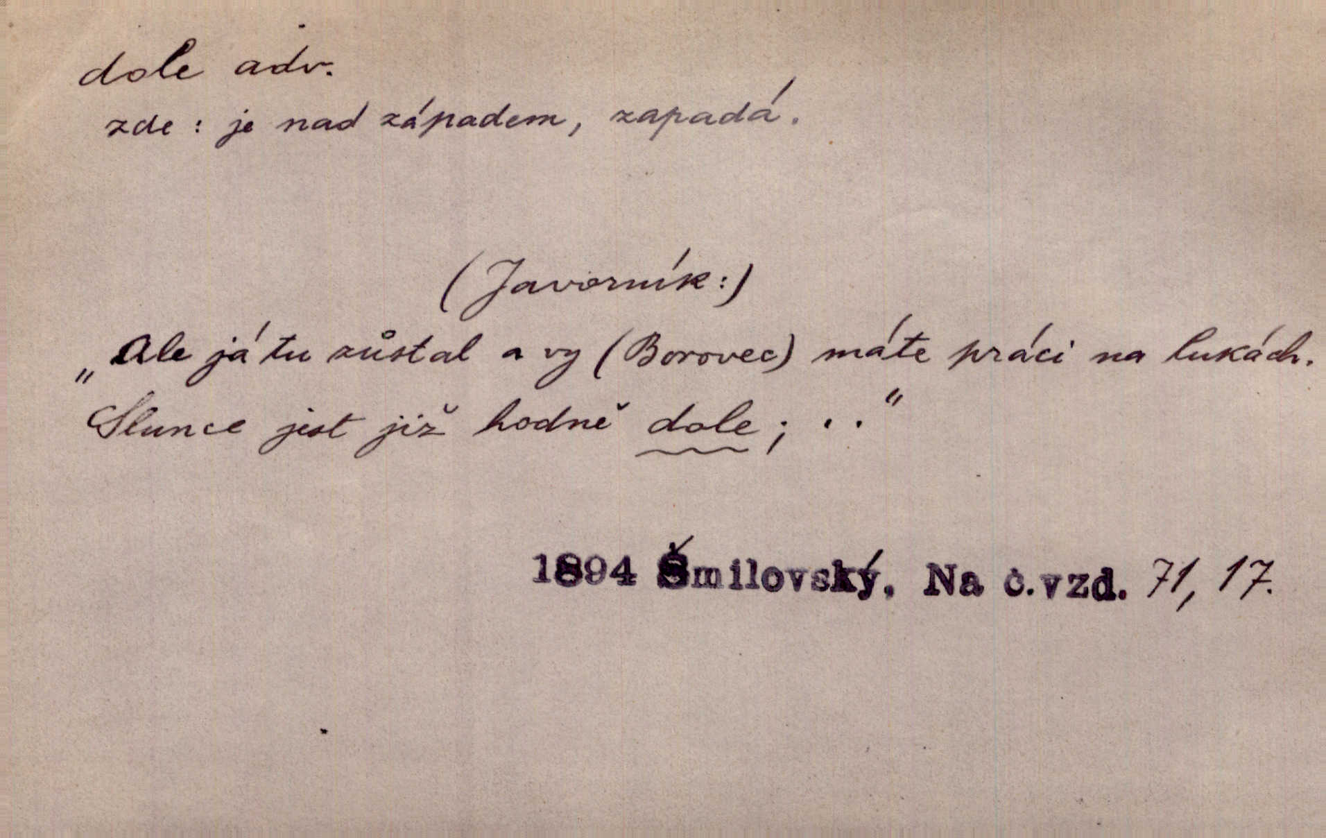 - dole adv. (komp. doleji) na nízkém (nižším) místě, nízko (op. nahoře, navrchu). Těžká sukovitá hůl, dole železem kovaná. Jan. Dole v truhle leželo babiččino prádlo a šatstvo vespod, naspodu. Něm. Dole je krám pod námi. Bydlíte dole v přízemí, v nižším patře. Toužil po smrti a žádal si klidu tam dole ve věčném šeru v hrobě. Zey. Vám, myslivci, tu dole je hej v údolí, v rovině (op. v horách). Něm. Vážnější dvořané soudili o záletnosti biskupově vytýkajíce, jak že má pak dole jasno býti, když s temene nesvítí světlo dobrých příkladů v nižších vrstvách kněžských i laických. Jir. Dole u stolu na „dolním“ konci, na místě nejméně význačném. D býti dole s vedl. význ. býti pryč a p. [Listy akátové] s prvním větrem jsou dole! Mach. Já mám boty do roboty přes brázdy a pole — zvednu jednu, zvednu druhou, a jsou s nohou dole. F. S. Proch. Pozdě z jara, když už všechen sníh byl dole. Rais. Dům starý bourají; už místy je střecha dole. Vrch. D býti dole býti zničen. Chvast nám jazyk skálel, podvod oře pole, a krb Bída strhla. Všecko, vše je dole. Heyd. Je tak dole, že mu už níž nelze, než s mostu do řeky. Čap. Ch. D Lid. Už jsou dole s kazatelny mají po ohláškách. Slang. To je „dole“, aby někdo dostával peníze za to, že nic nedělá to je proti tradici, to není spravedlivé. Přít. D v jižní krajině, na jihu. Zanotoval píseň, jak ji slýchal tam dole ve Veroně. Jir. Jedu za obchodem; mám něco dole, na jihu, nějaký průmysl. K. Čap. D Lit. pod čarou. O tom viz dole. Ostatek následuje doleji dále.