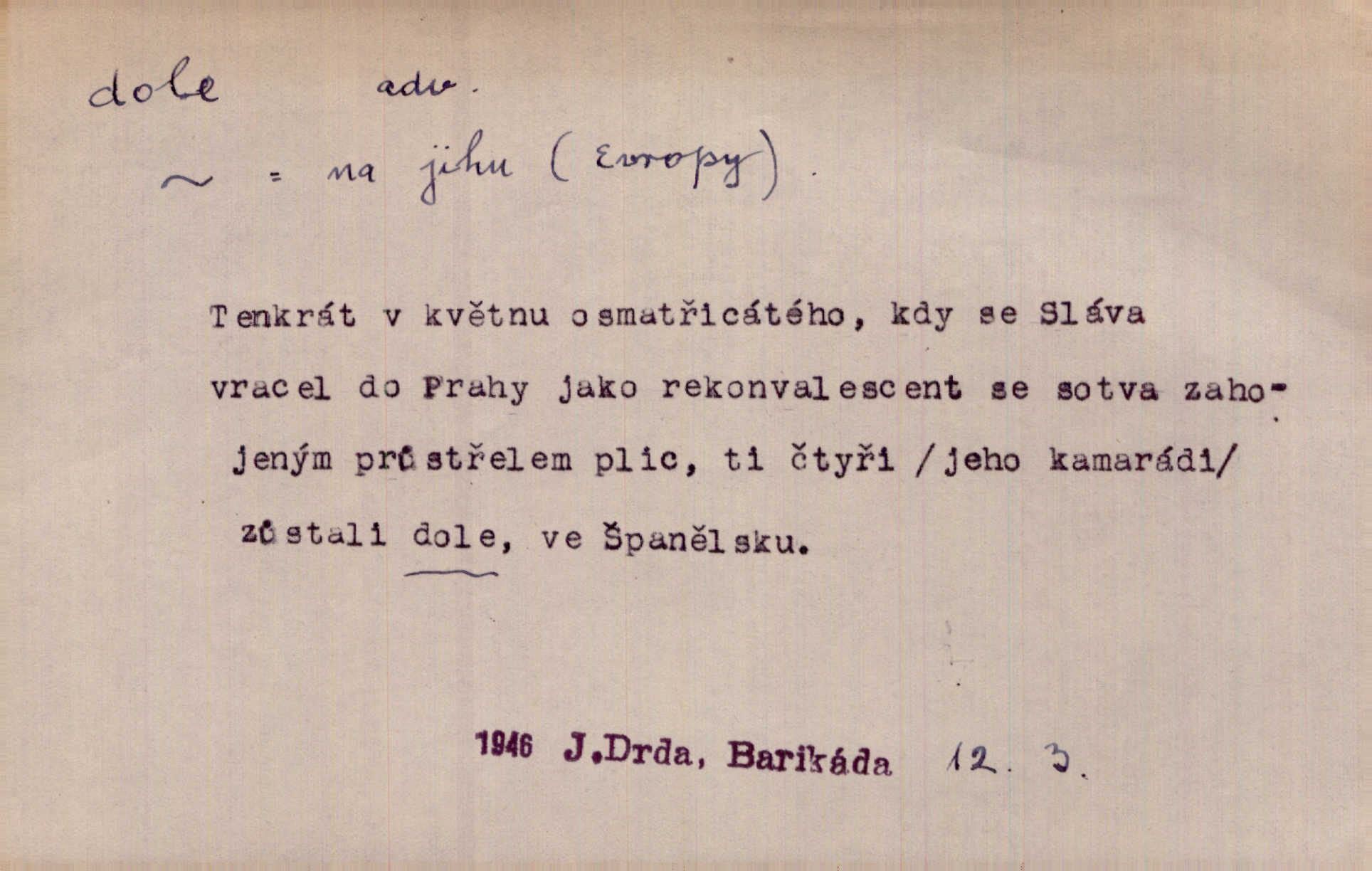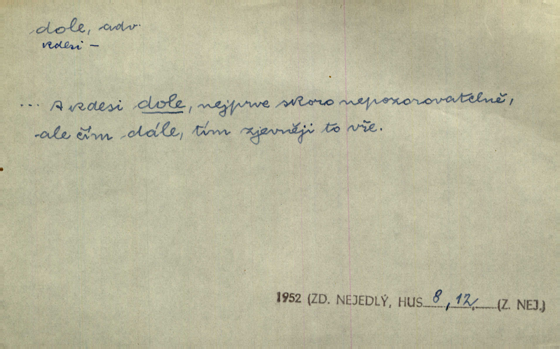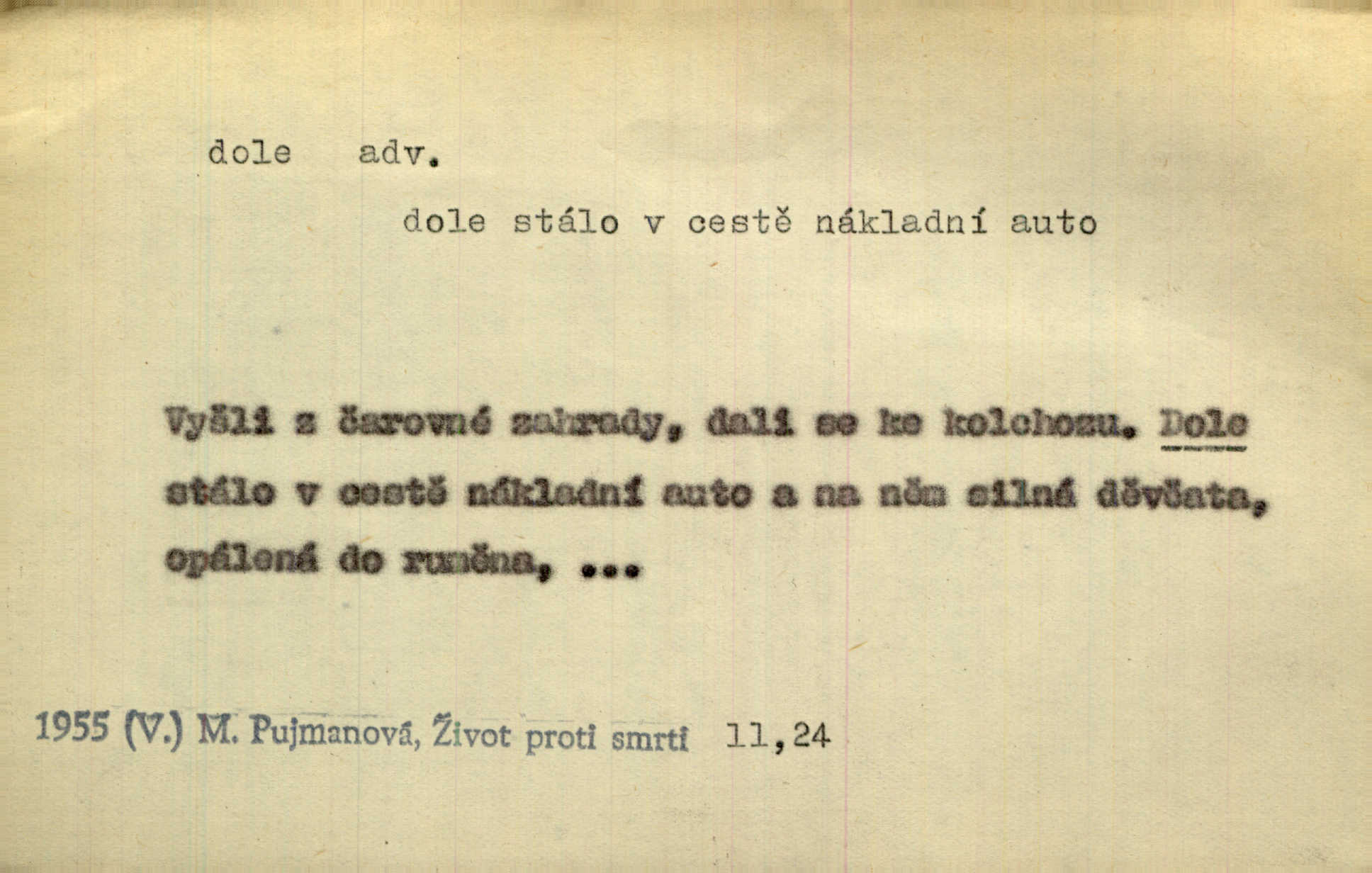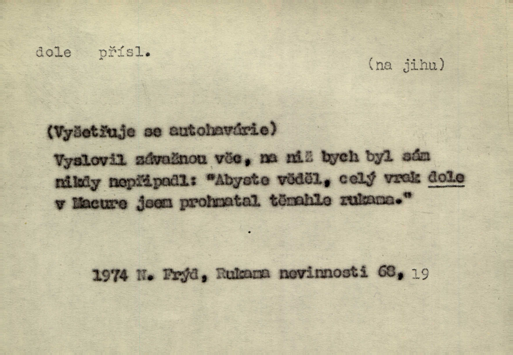 - dole adv. (komp. doleji) na nízkém (nižším) místě, nízko (op. nahoře, navrchu). Těžká sukovitá hůl, dole železem kovaná. Jan. Dole v truhle leželo babiččino prádlo a šatstvo vespod, naspodu. Něm. Dole je krám pod námi. Bydlíte dole v přízemí, v nižším patře. Toužil po smrti a žádal si klidu tam dole ve věčném šeru v hrobě. Zey. Vám, myslivci, tu dole je hej v údolí, v rovině (op. v horách). Něm. Vážnější dvořané soudili o záletnosti biskupově vytýkajíce, jak že má pak dole jasno býti, když s temene nesvítí světlo dobrých příkladů v nižších vrstvách kněžských i laických. Jir. Dole u stolu na „dolním“ konci, na místě nejméně význačném. D býti dole s vedl. význ. býti pryč a p. [Listy akátové] s prvním větrem jsou dole! Mach. Já mám boty do roboty přes brázdy a pole — zvednu jednu, zvednu druhou, a jsou s nohou dole. F. S. Proch. Pozdě z jara, když už všechen sníh byl dole. Rais. Dům starý bourají; už místy je střecha dole. Vrch. D býti dole býti zničen. Chvast nám jazyk skálel, podvod oře pole, a krb Bída strhla. Všecko, vše je dole. Heyd. Je tak dole, že mu už níž nelze, než s mostu do řeky. Čap. Ch. D Lid. Už jsou dole s kazatelny mají po ohláškách. Slang. To je „dole“, aby někdo dostával peníze za to, že nic nedělá to je proti tradici, to není spravedlivé. Přít. D v jižní krajině, na jihu. Zanotoval píseň, jak ji slýchal tam dole ve Veroně. Jir. Jedu za obchodem; mám něco dole, na jihu, nějaký průmysl. K. Čap. D Lit. pod čarou. O tom viz dole. Ostatek následuje doleji dále.